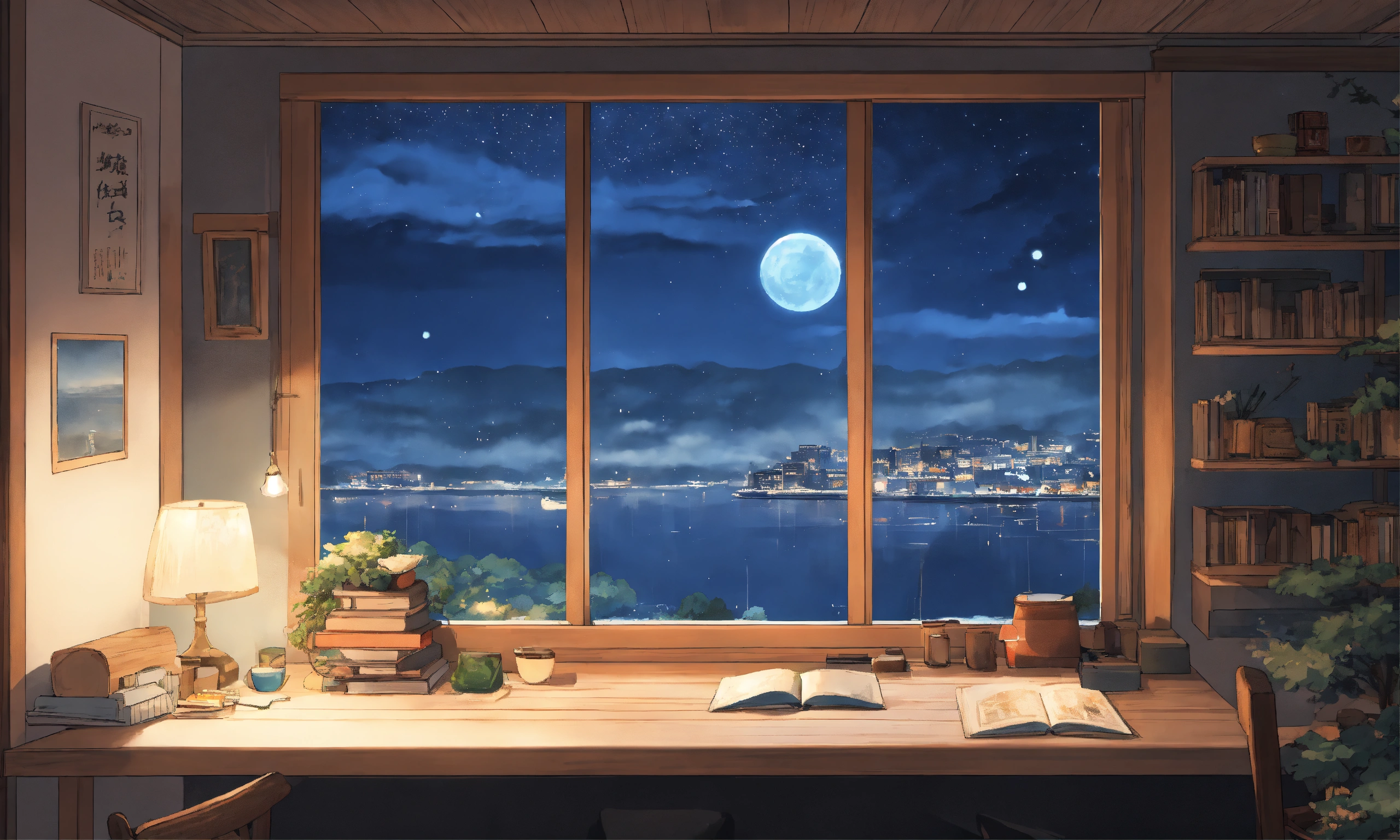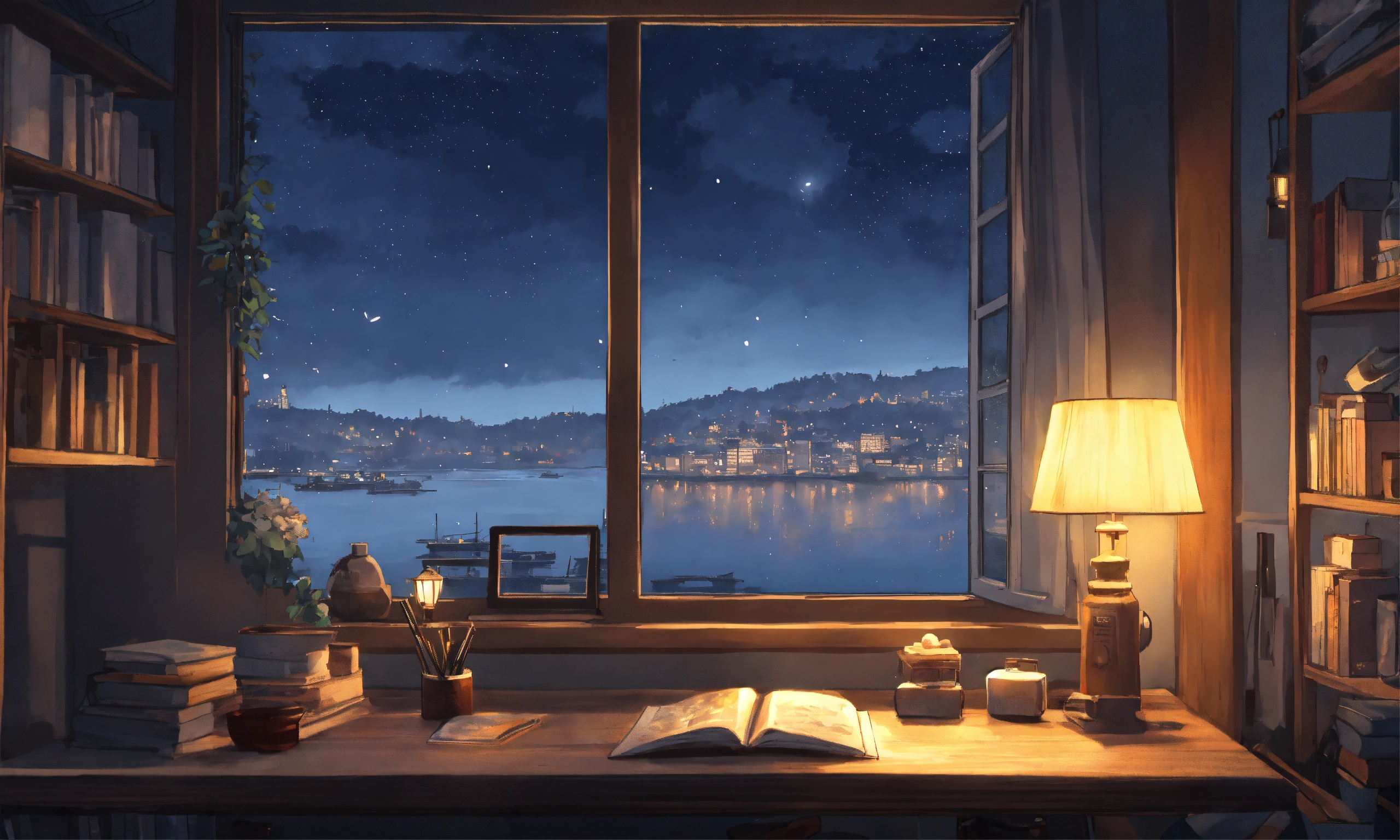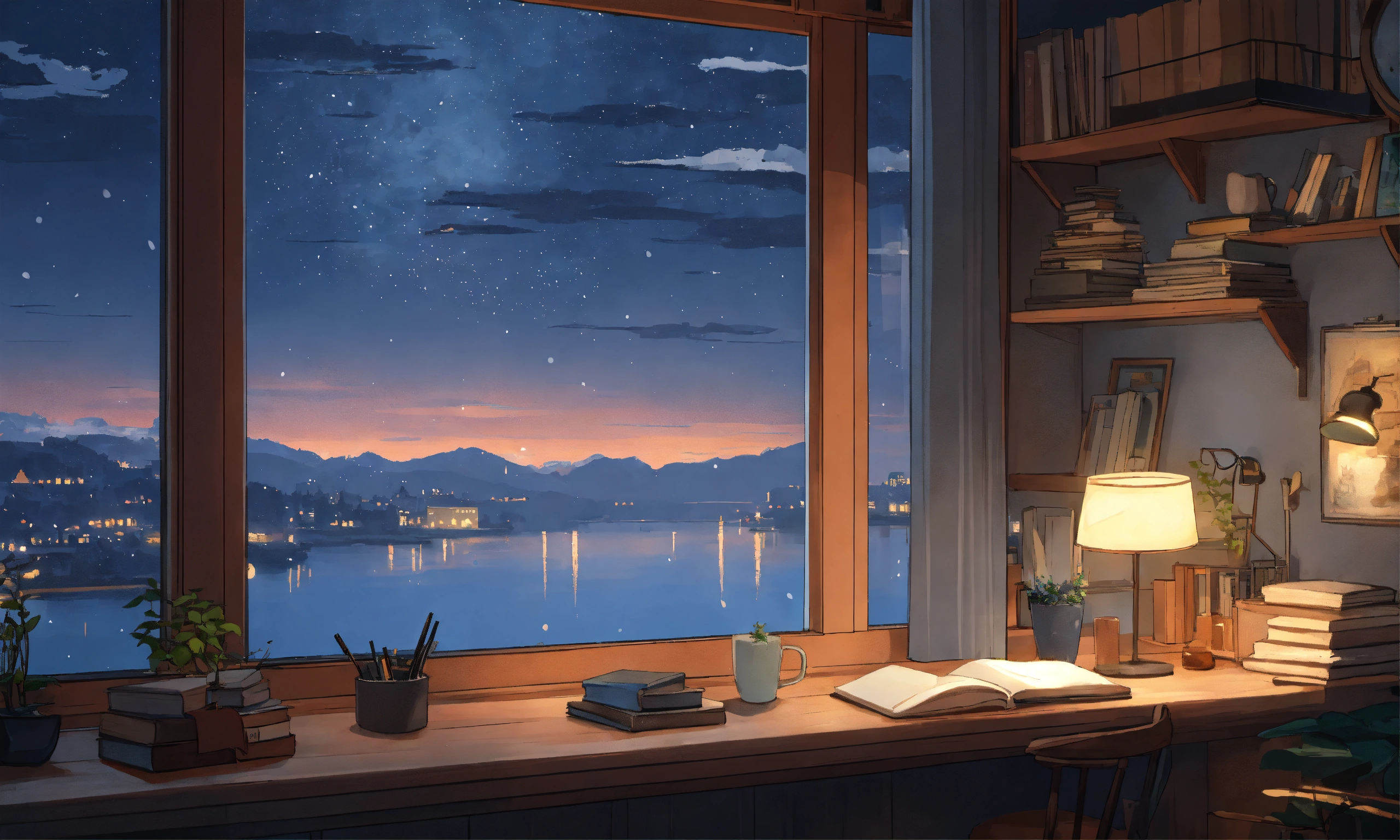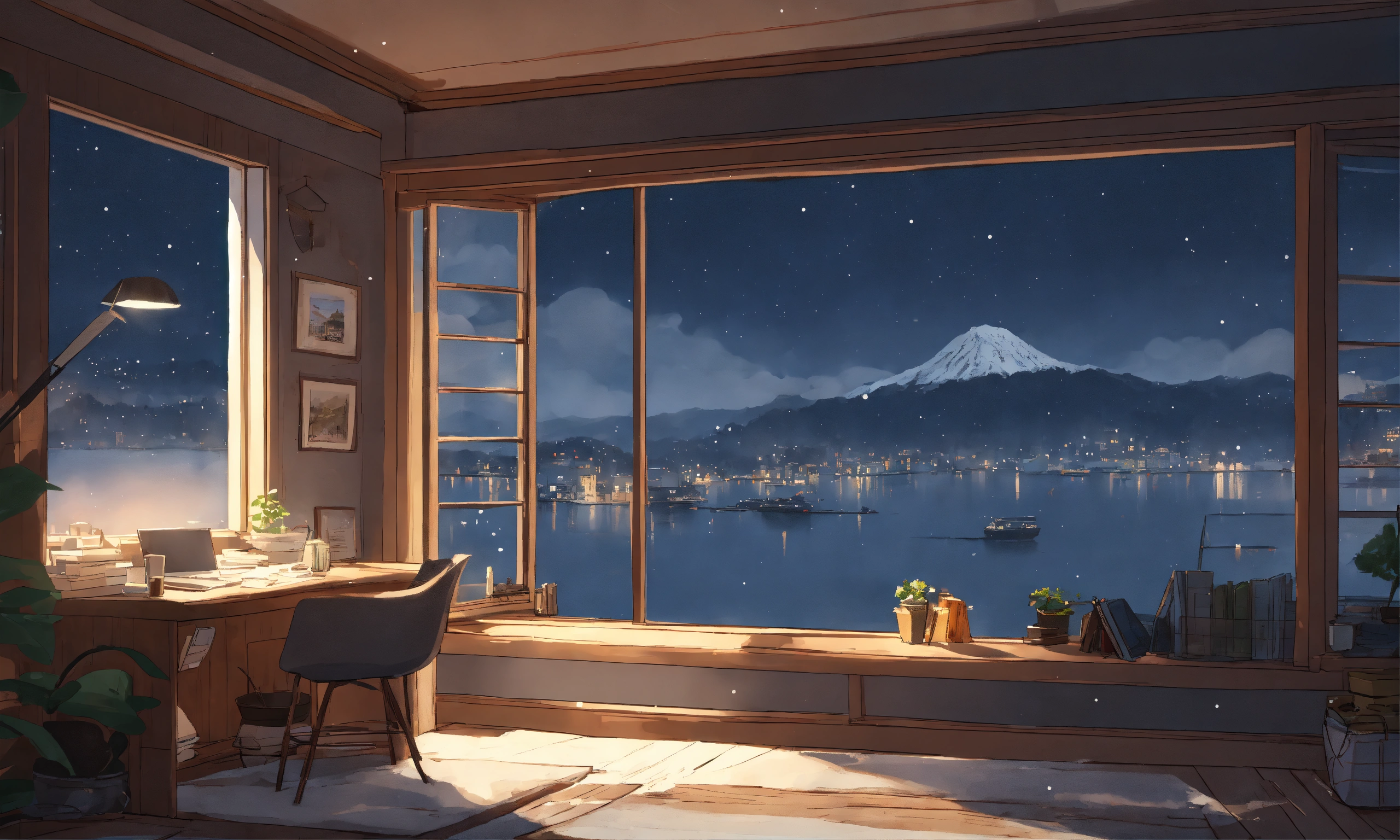 Cozy study room, studio ghibli, minimalistic, grey washed wooden colors, clearn night sky, big centered window with view of harbour and lake with city buildings, snowing outside, winter night, anime/lofi style, minimalistic design