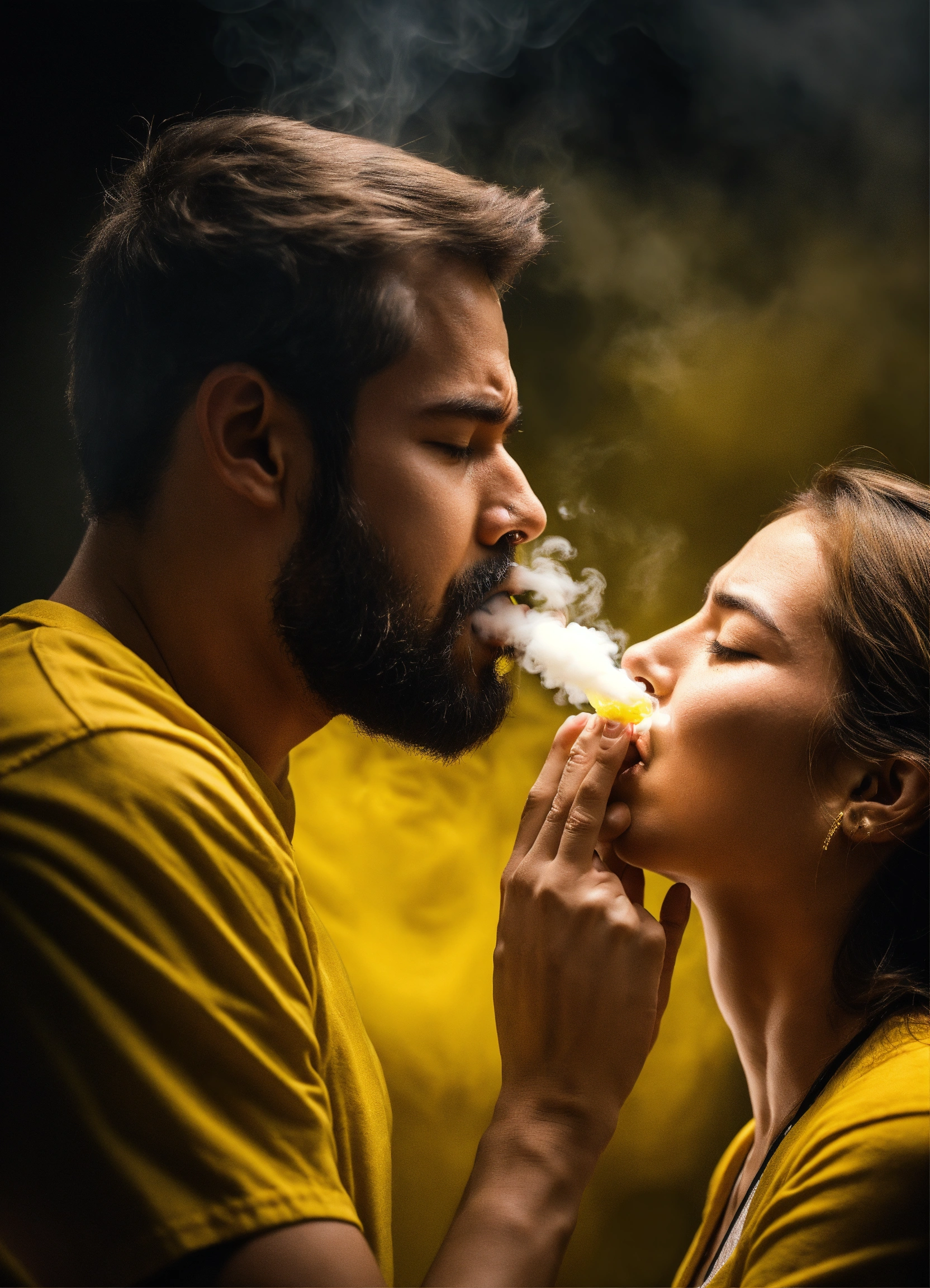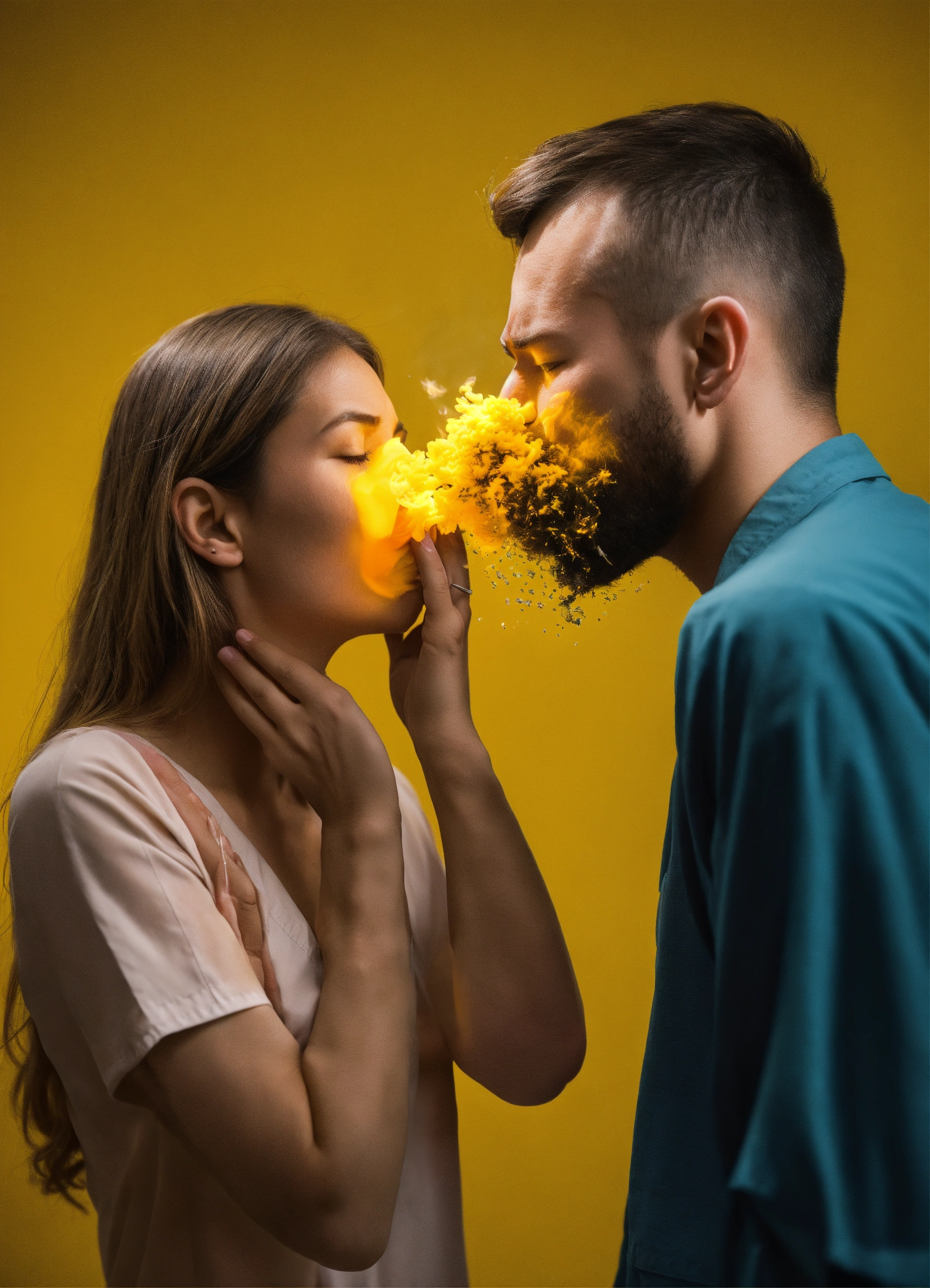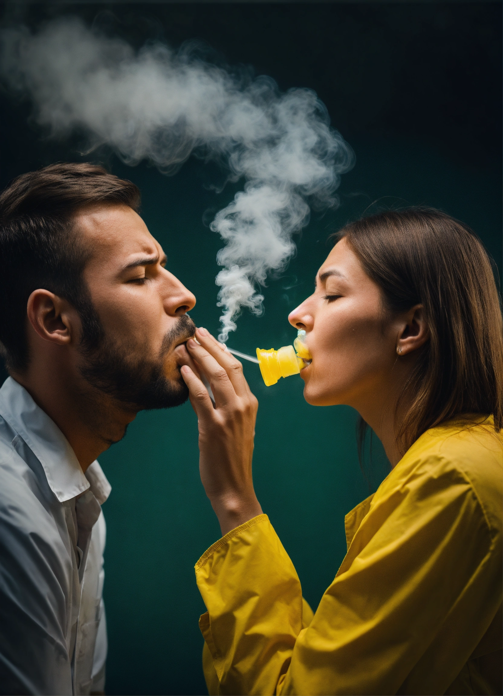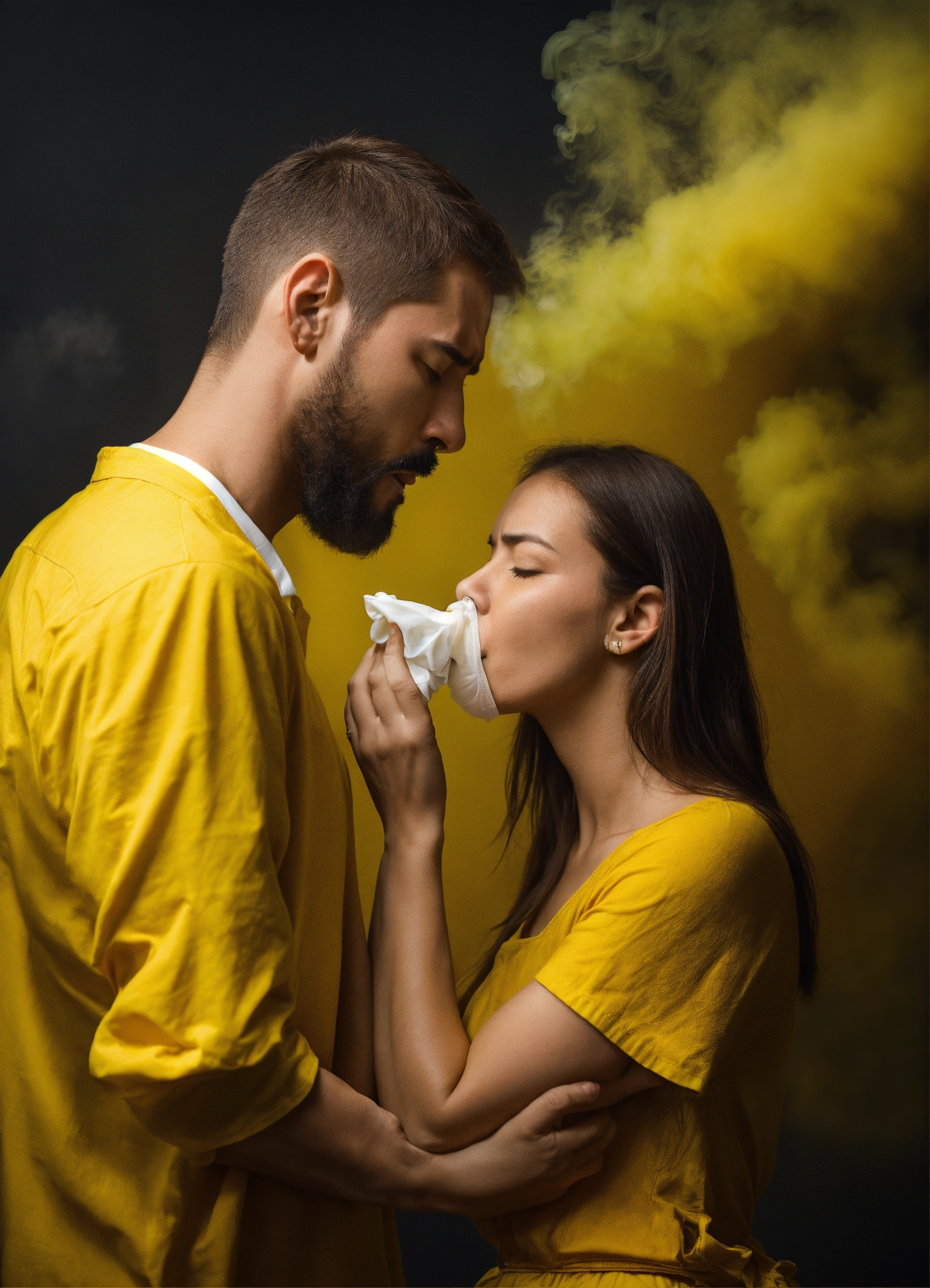 A realistic photo of a man exhaling yellow foul vapor from his mouth, and a woman covering her nose with her hands against the foul odor and looking questioningly. medical theme of bad breath odor.