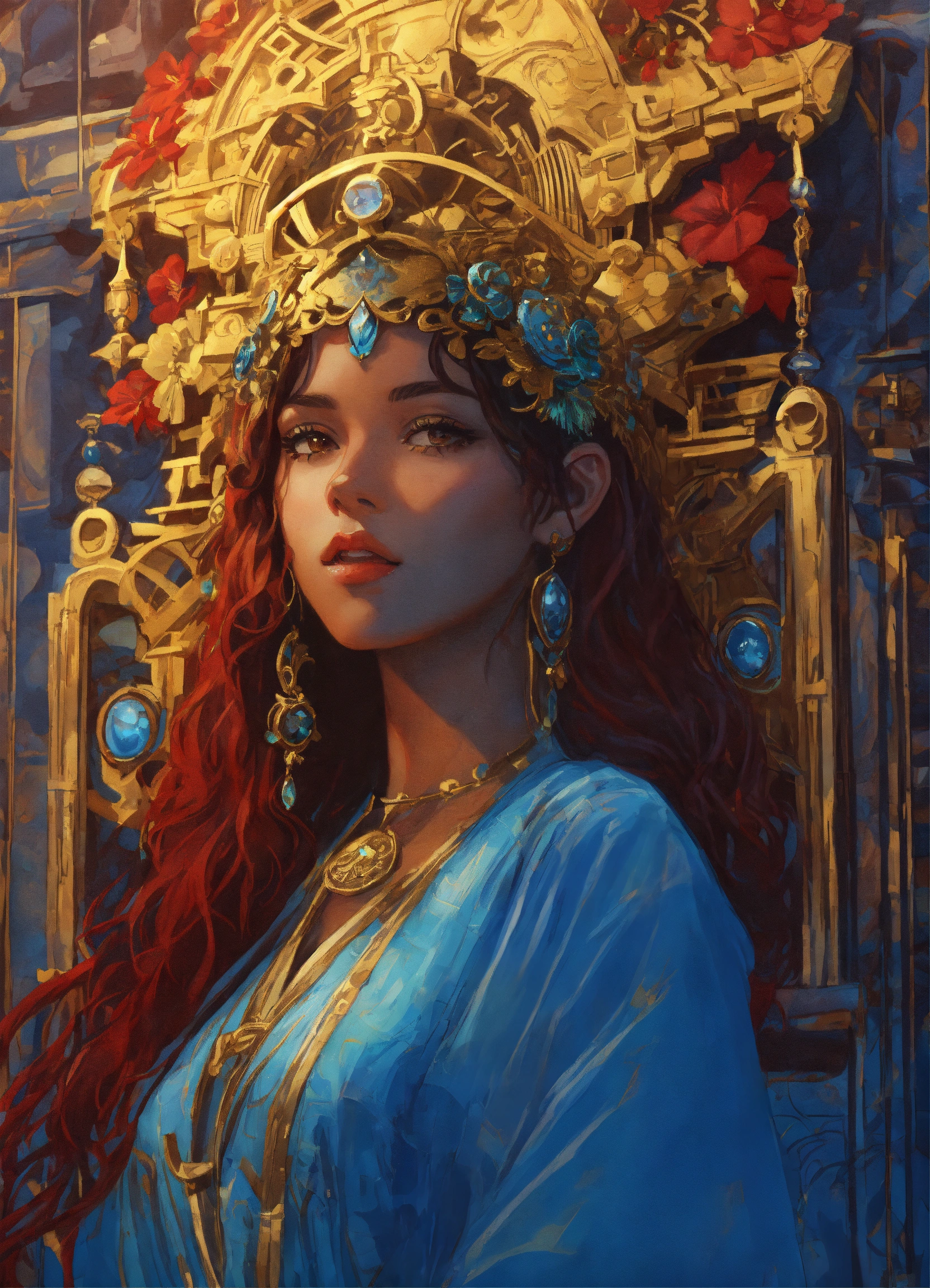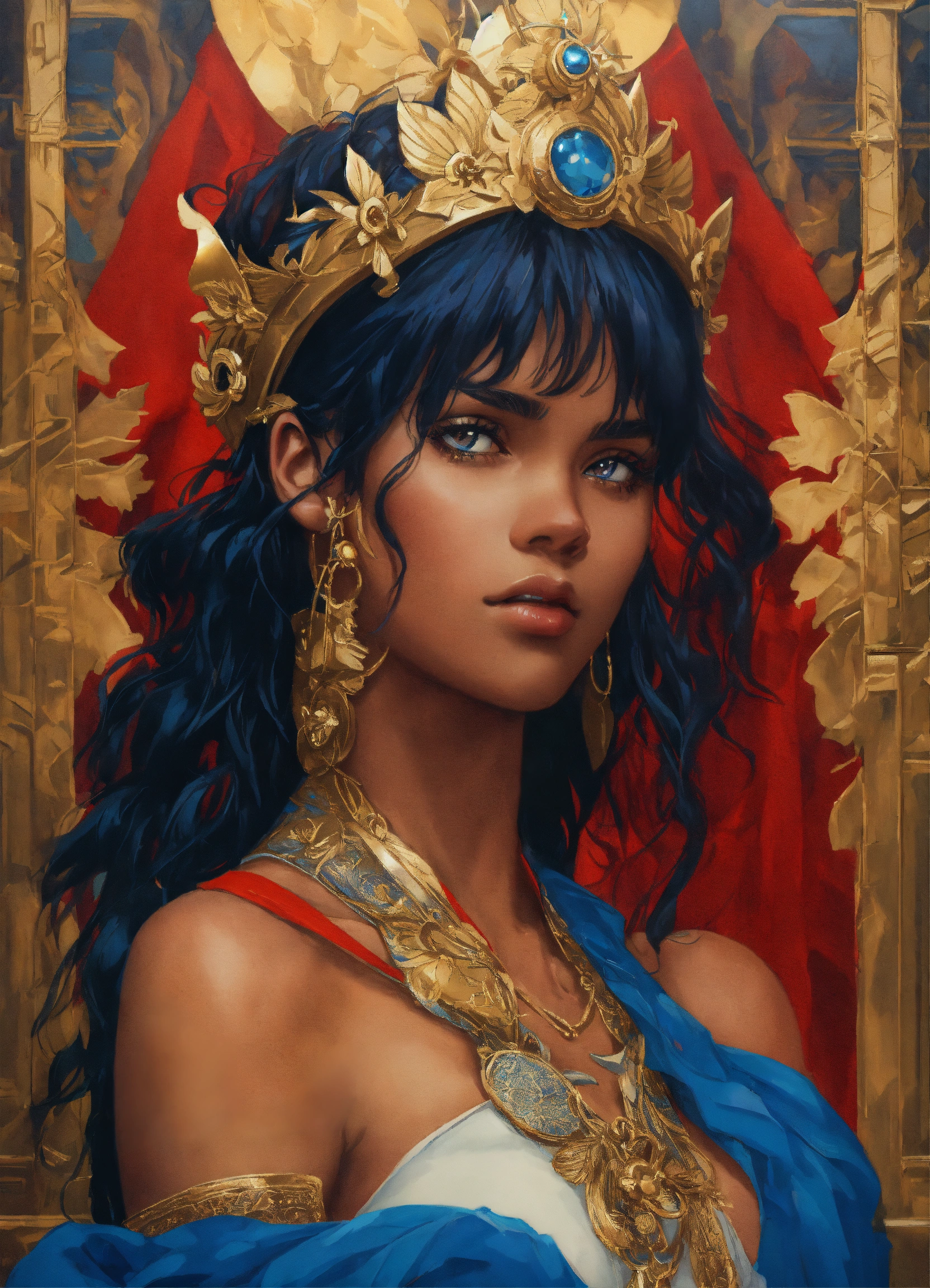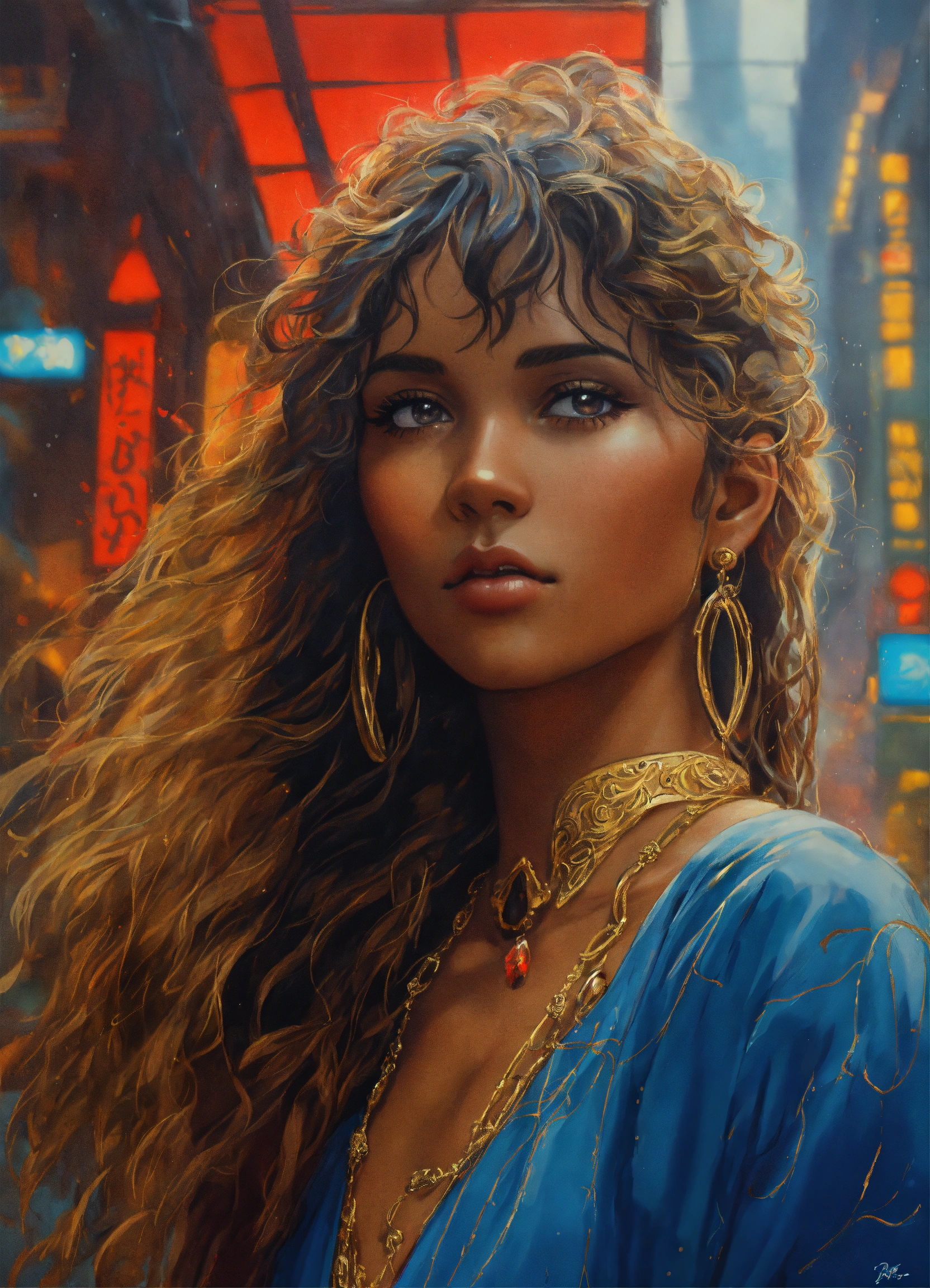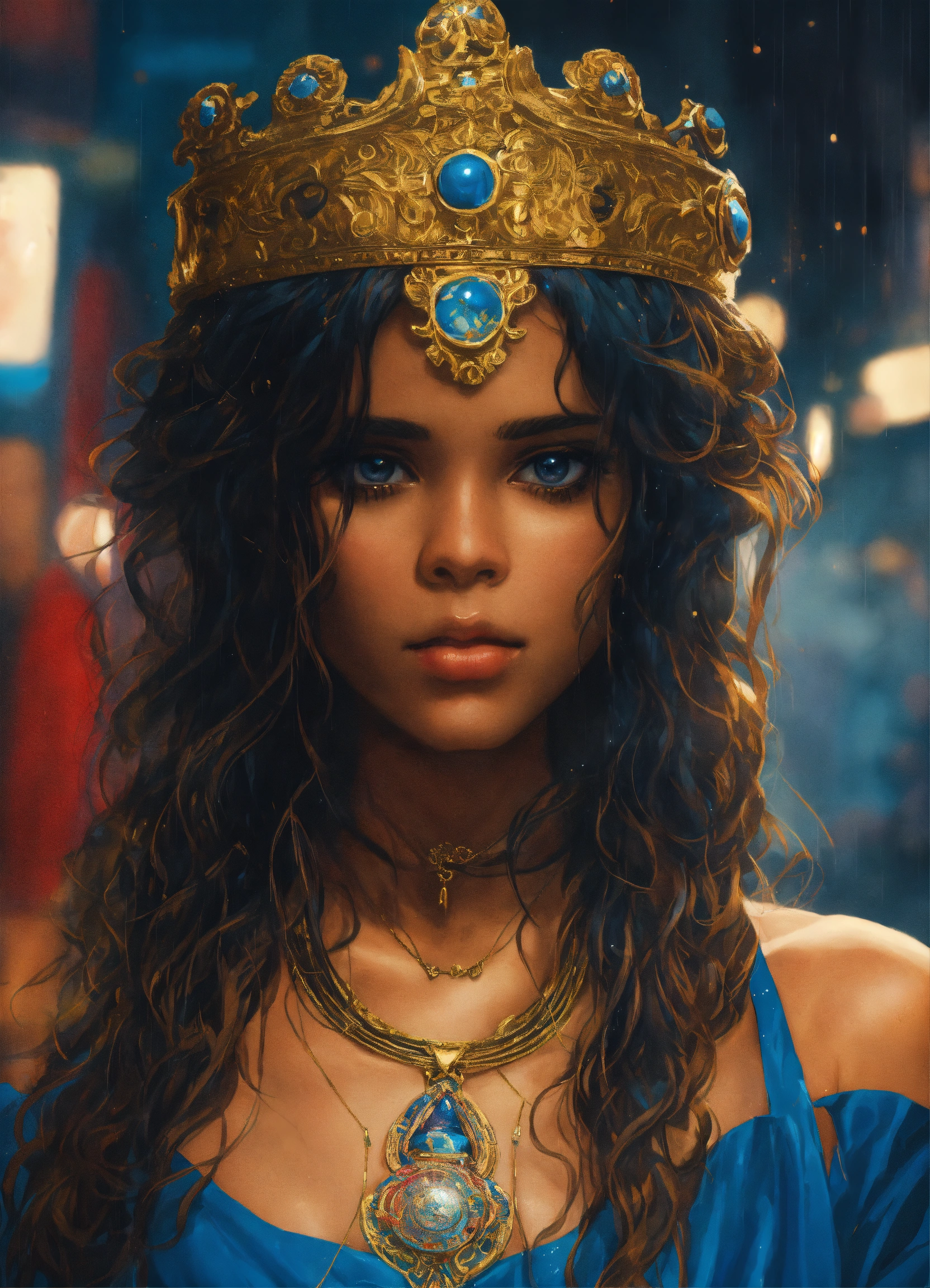 Vintage 90's anime artwork. beautiful revealed metis girl with long wavy hair, far perspective intricate, sharp focus, fantasy, soft natural lighting, other worldy, surreal 8k photo, blue dress, gold crown, gold head ornament, long hair with cute face of halle berry with long hair, anime art of ghost in the shell, detailed scene, red, perfect face, intricately detailed photorealism, trending on artstation, rainy day.