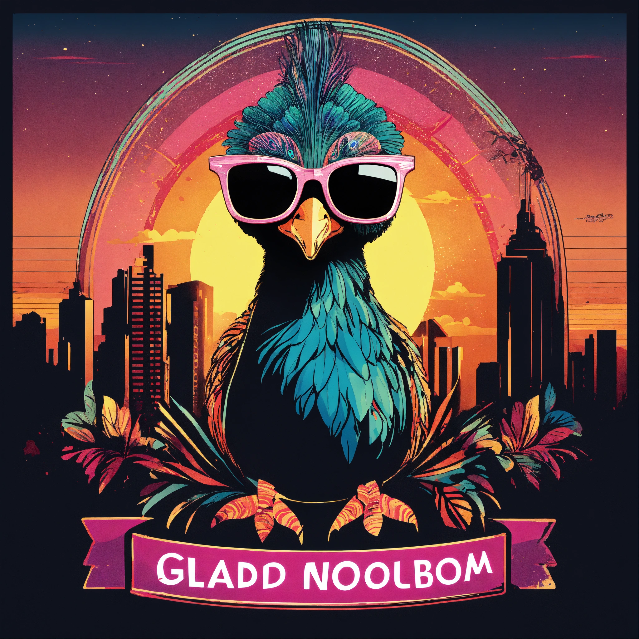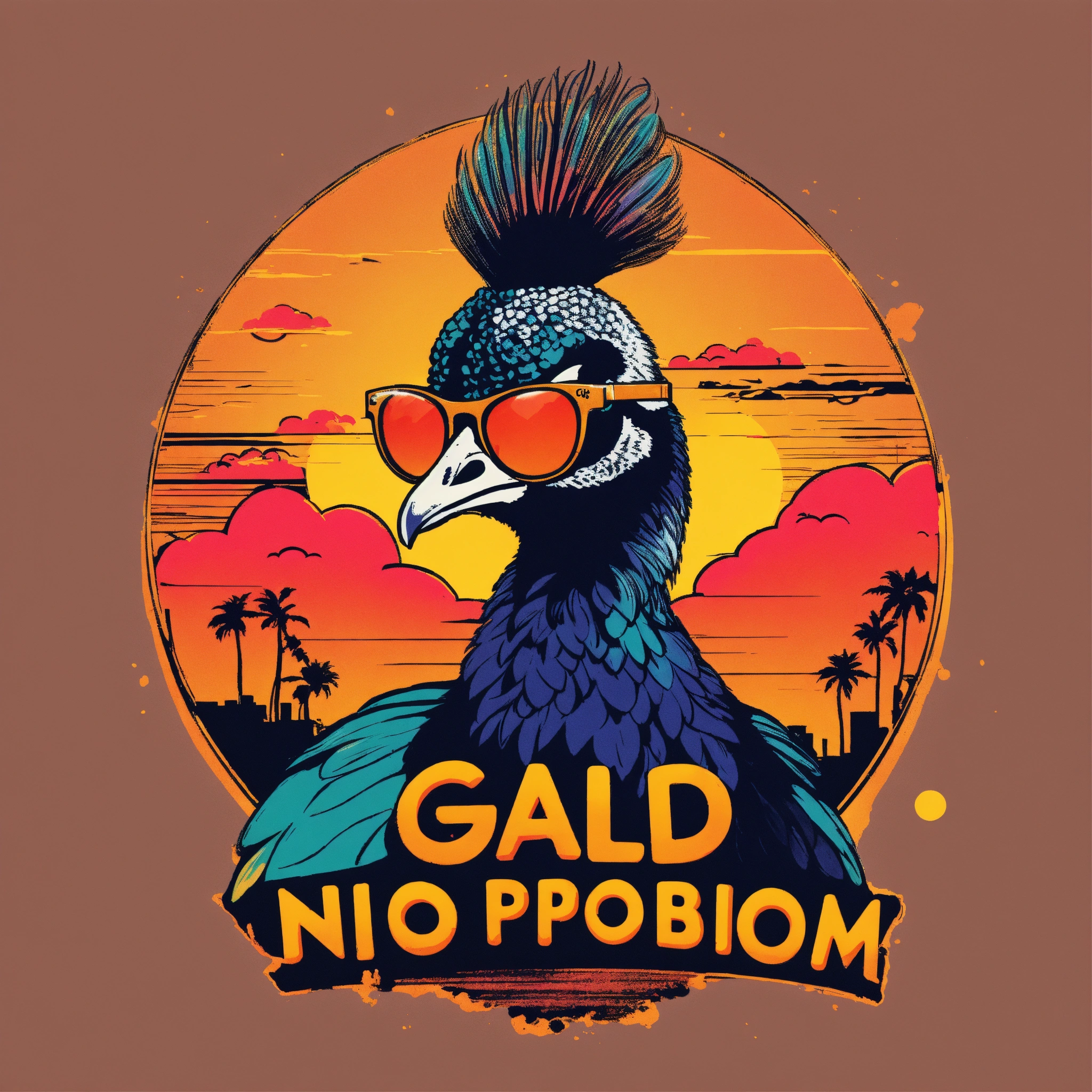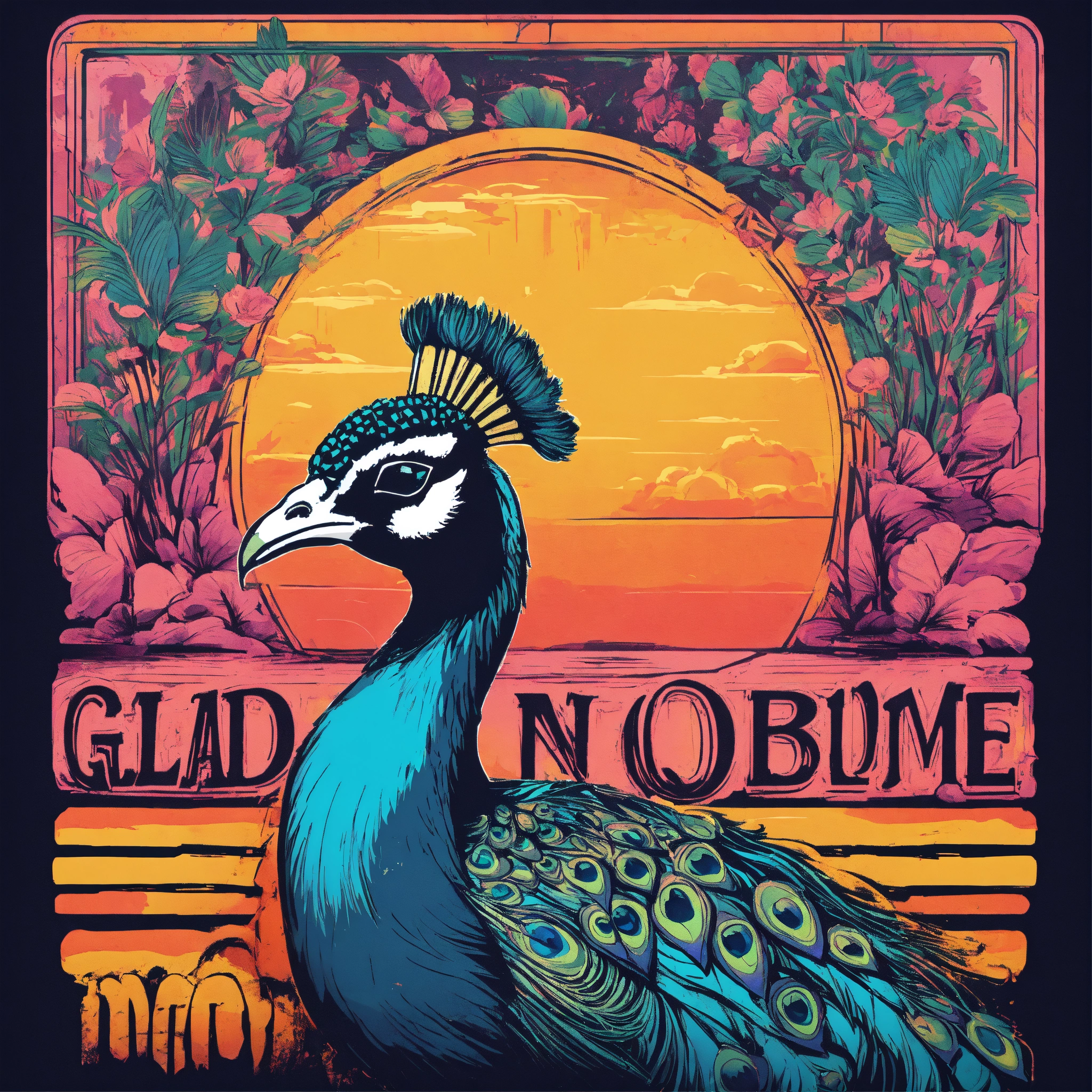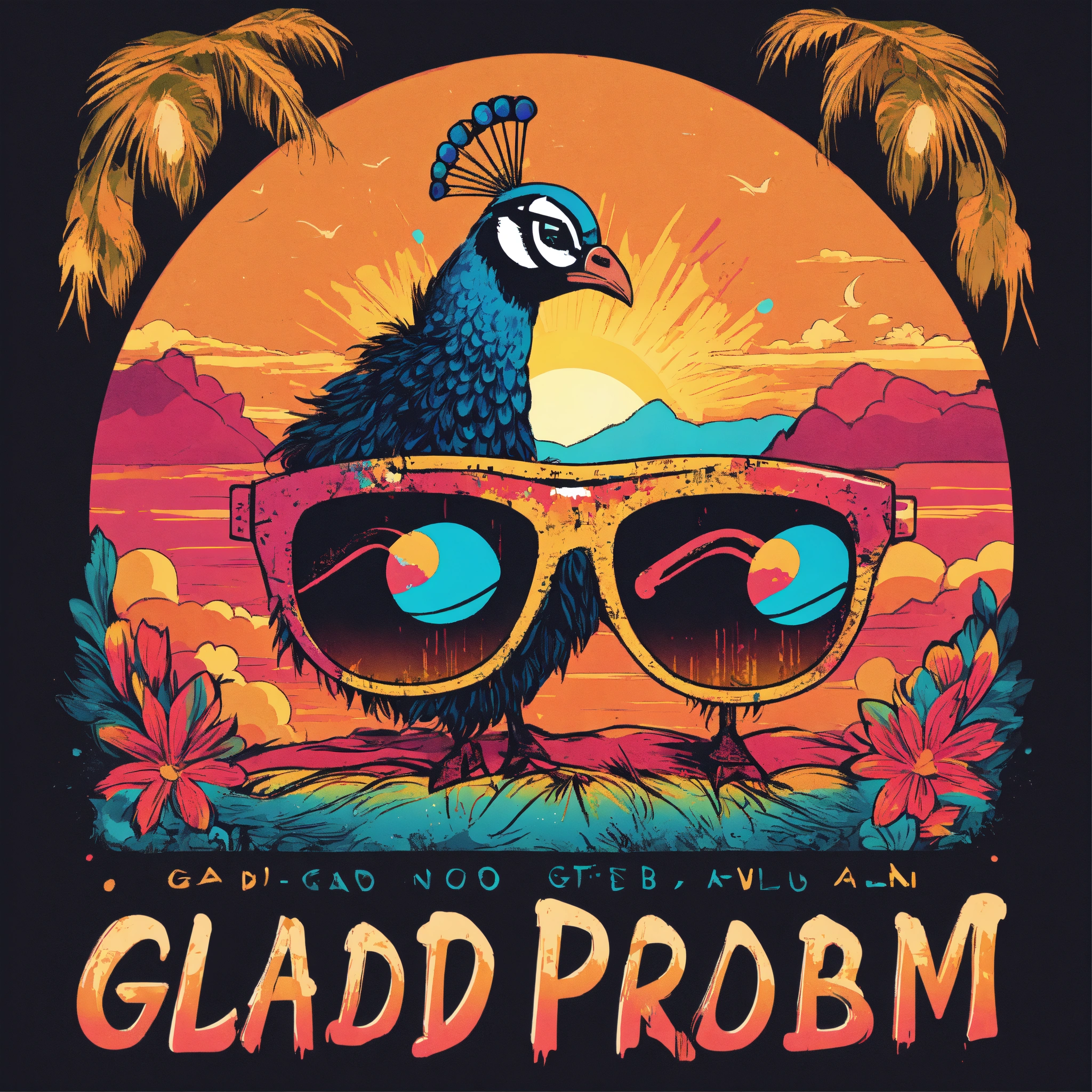 Vector t-shirt design vintage retro sunset distressed black style design, a cute peacock baby wearing sunglasses, with text (“glad, no problem”), typography, graffiti, 3d render 4k, 4k, poster, 3d render