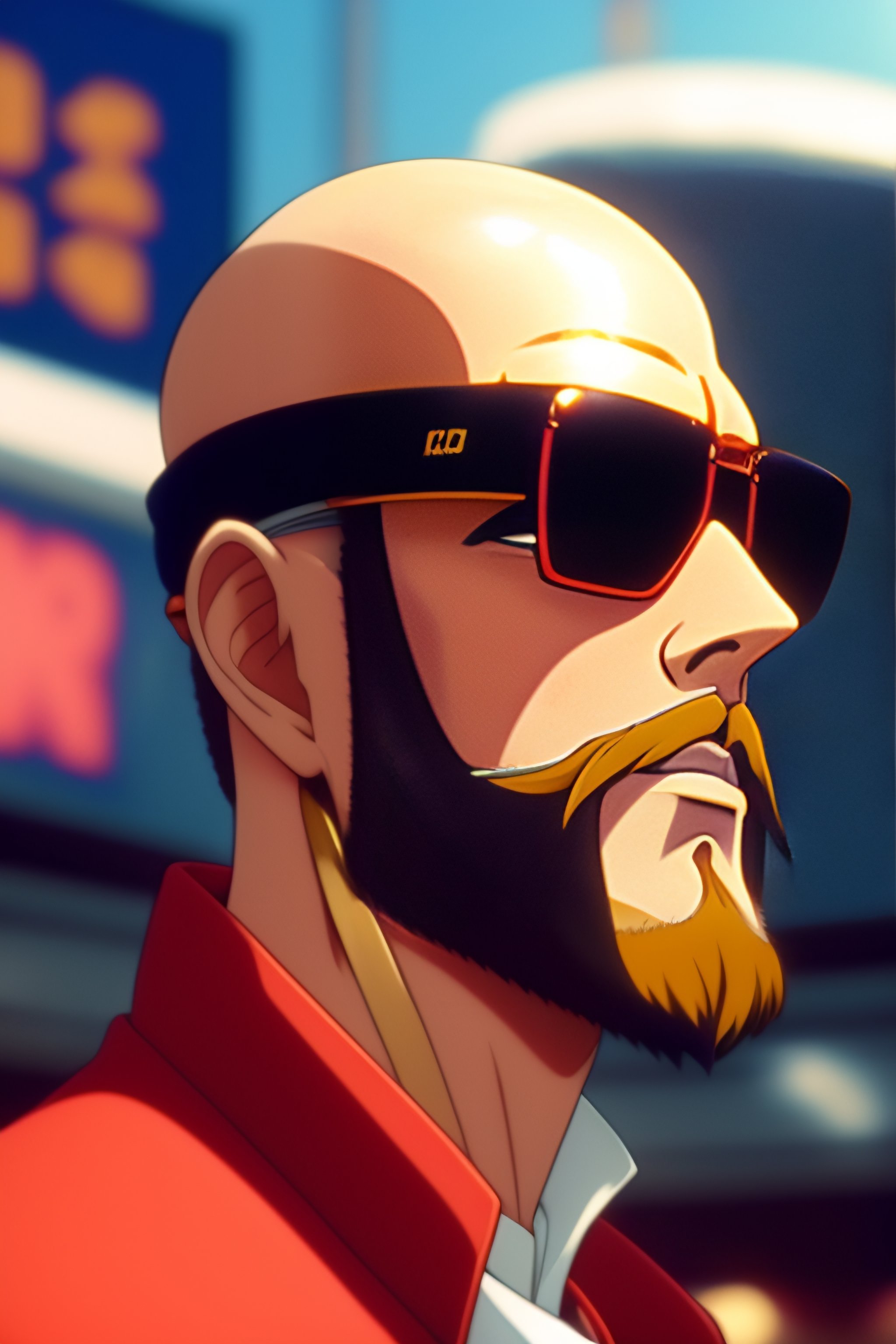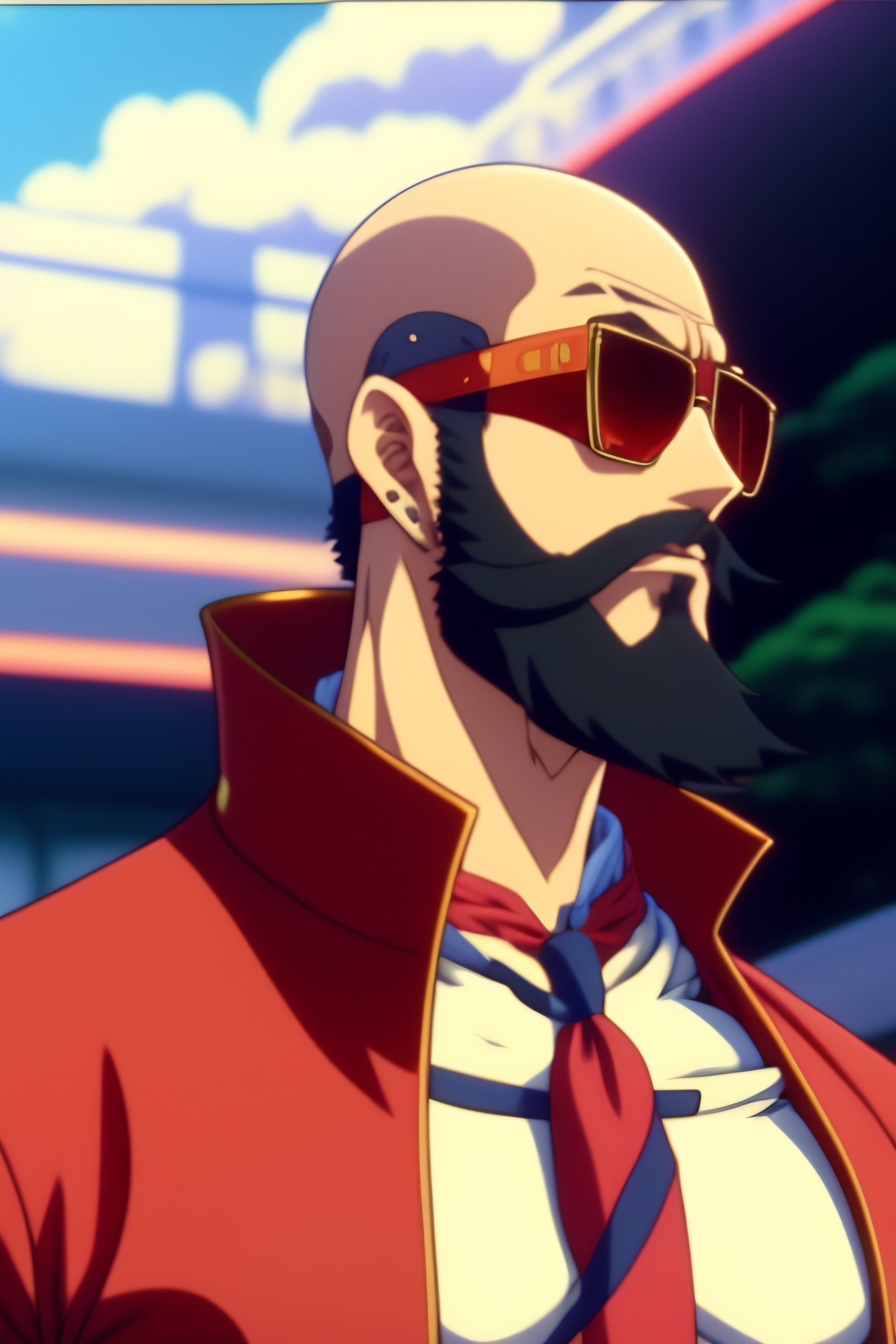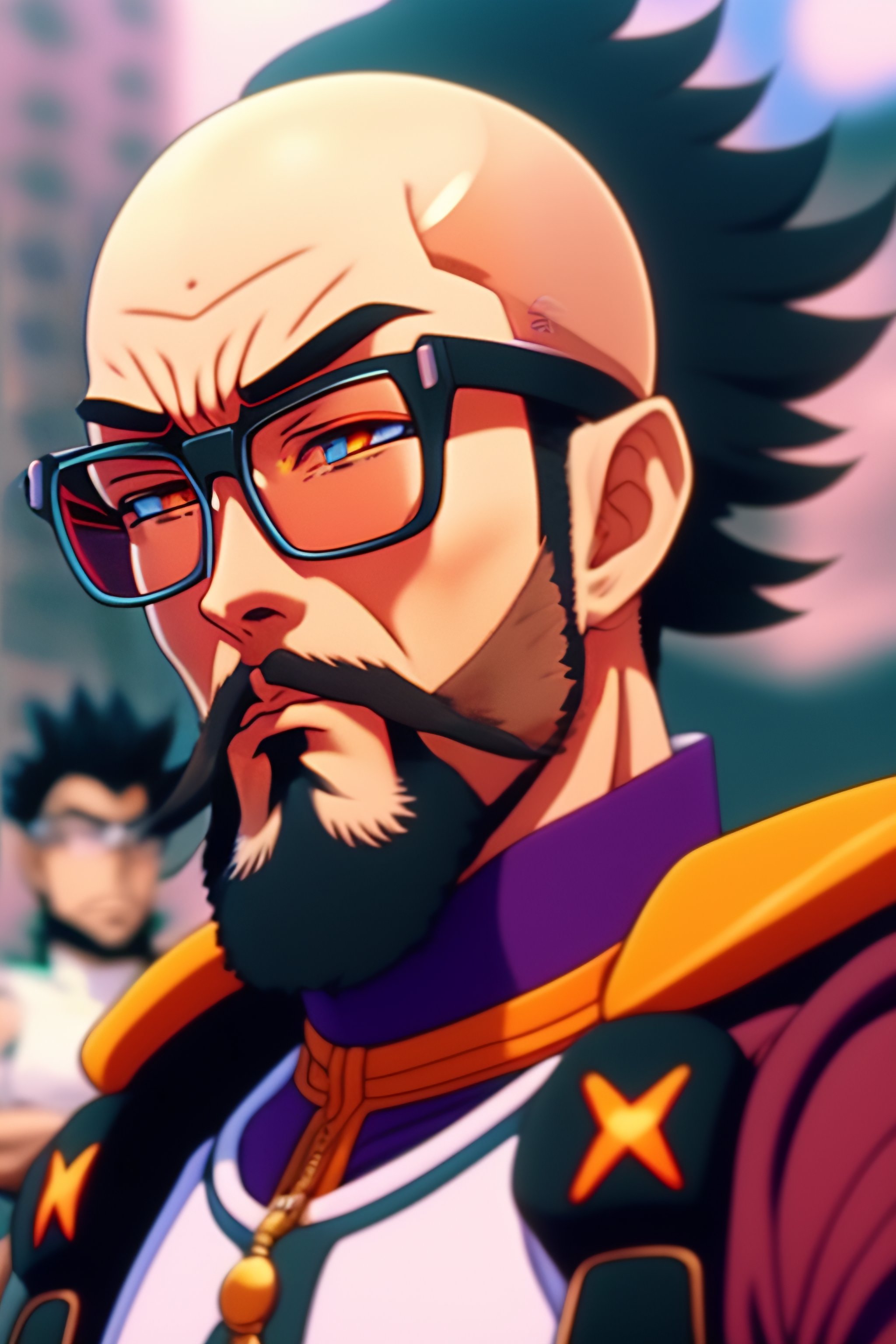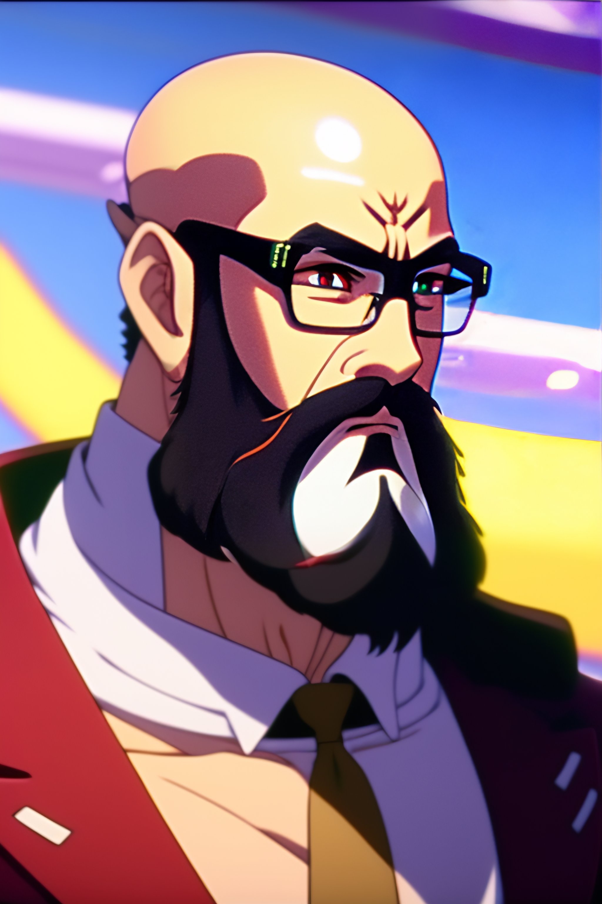 Bald guy with glasses and beard, vintage anime screenshot, 90’s anime aesthetic. maximalist action shot from the plot twist.