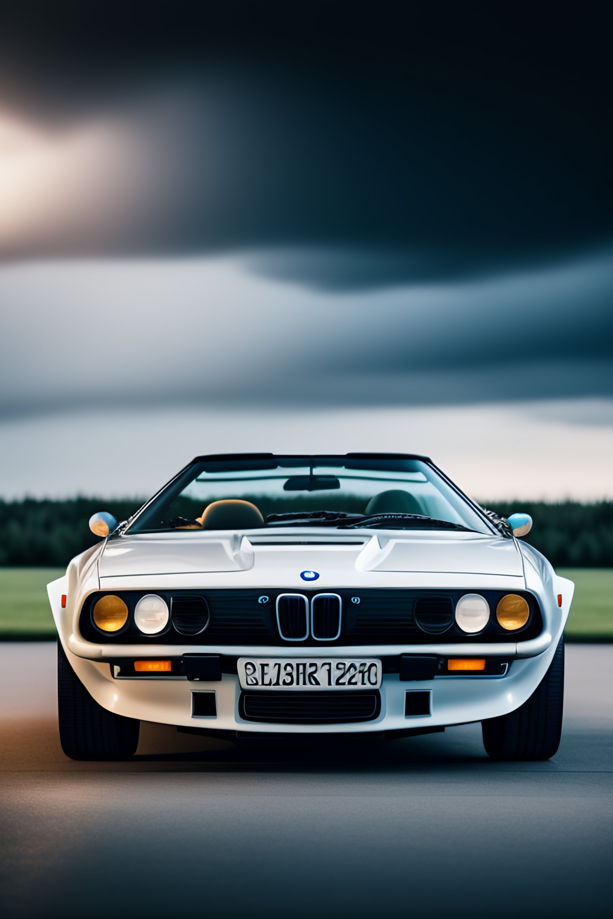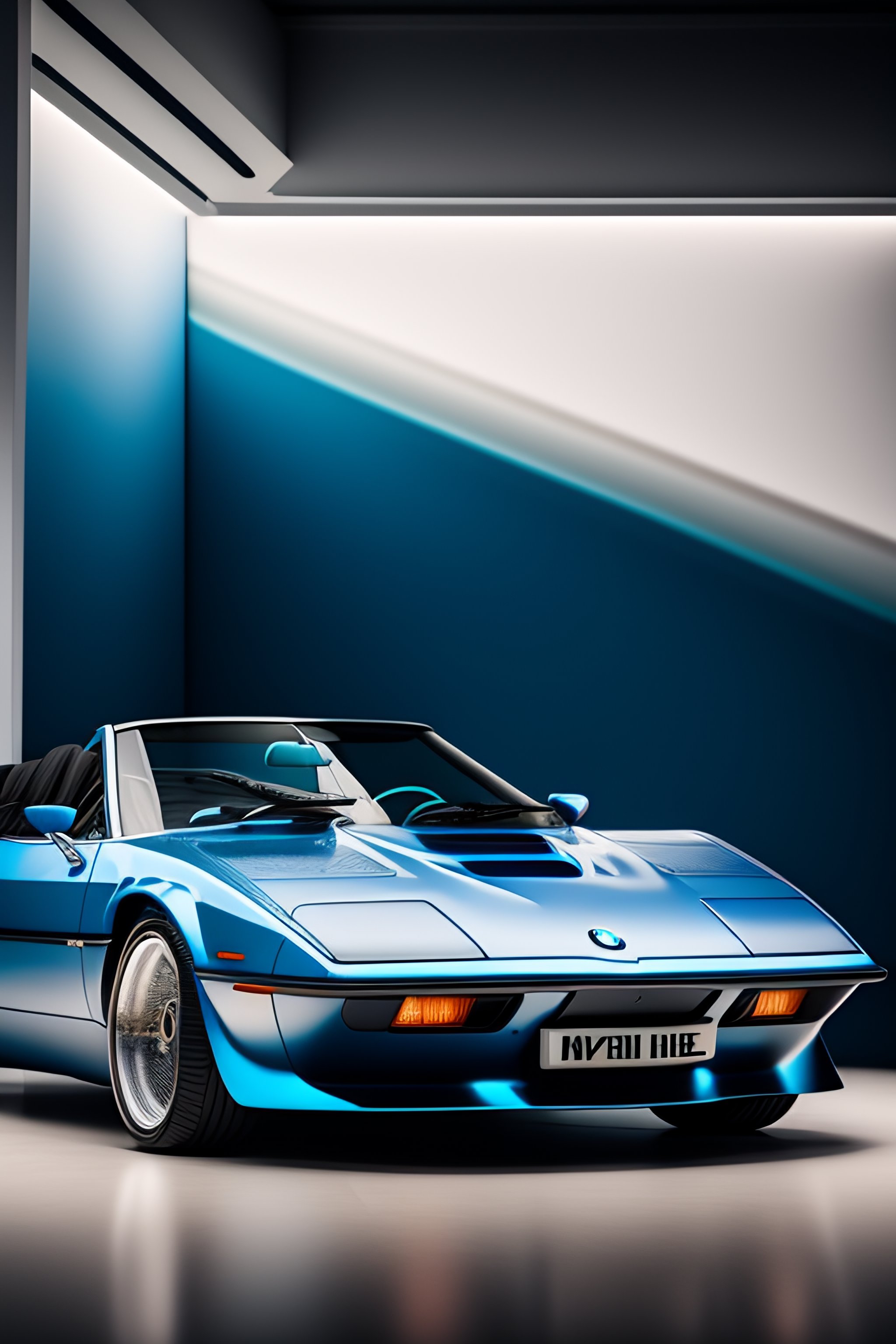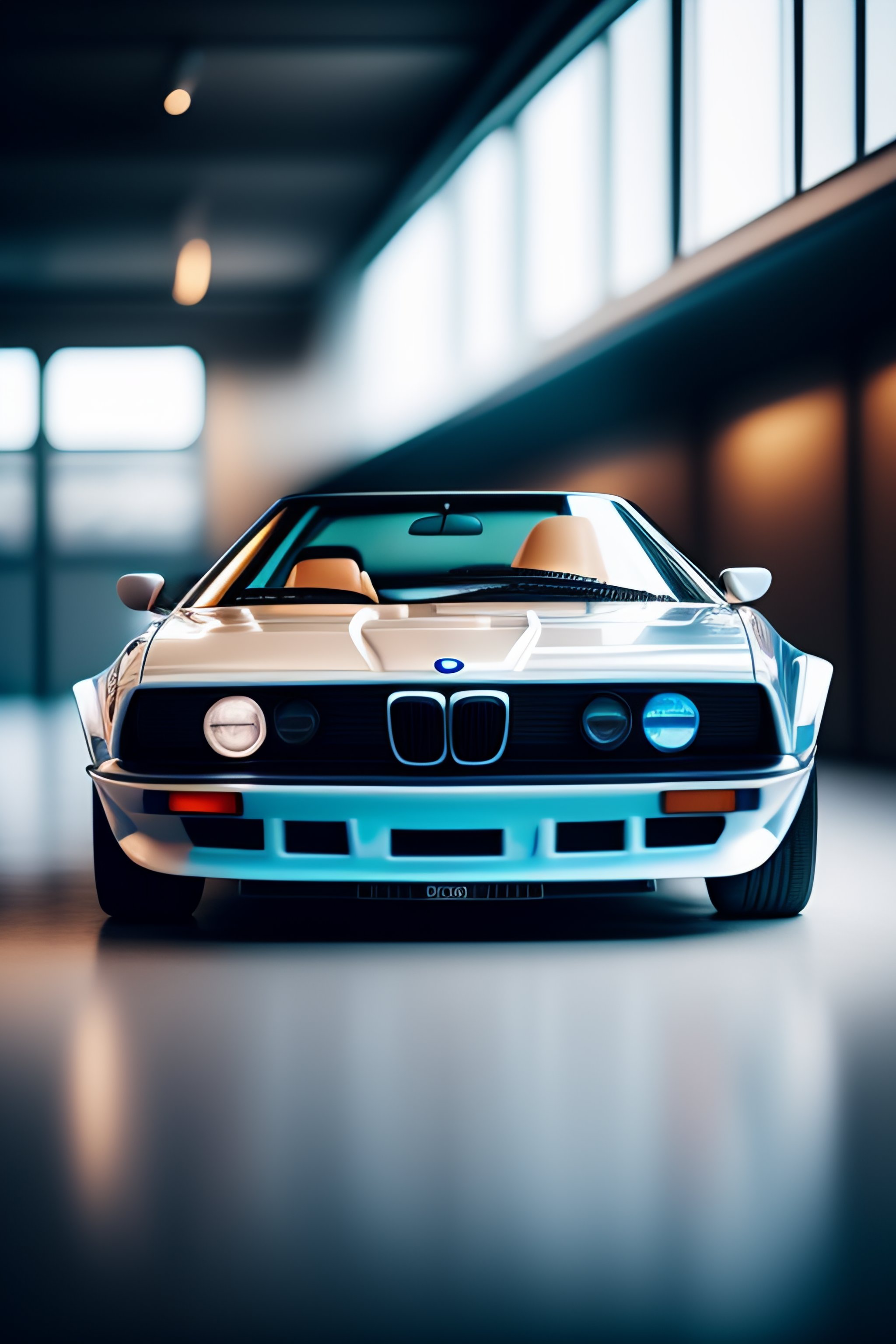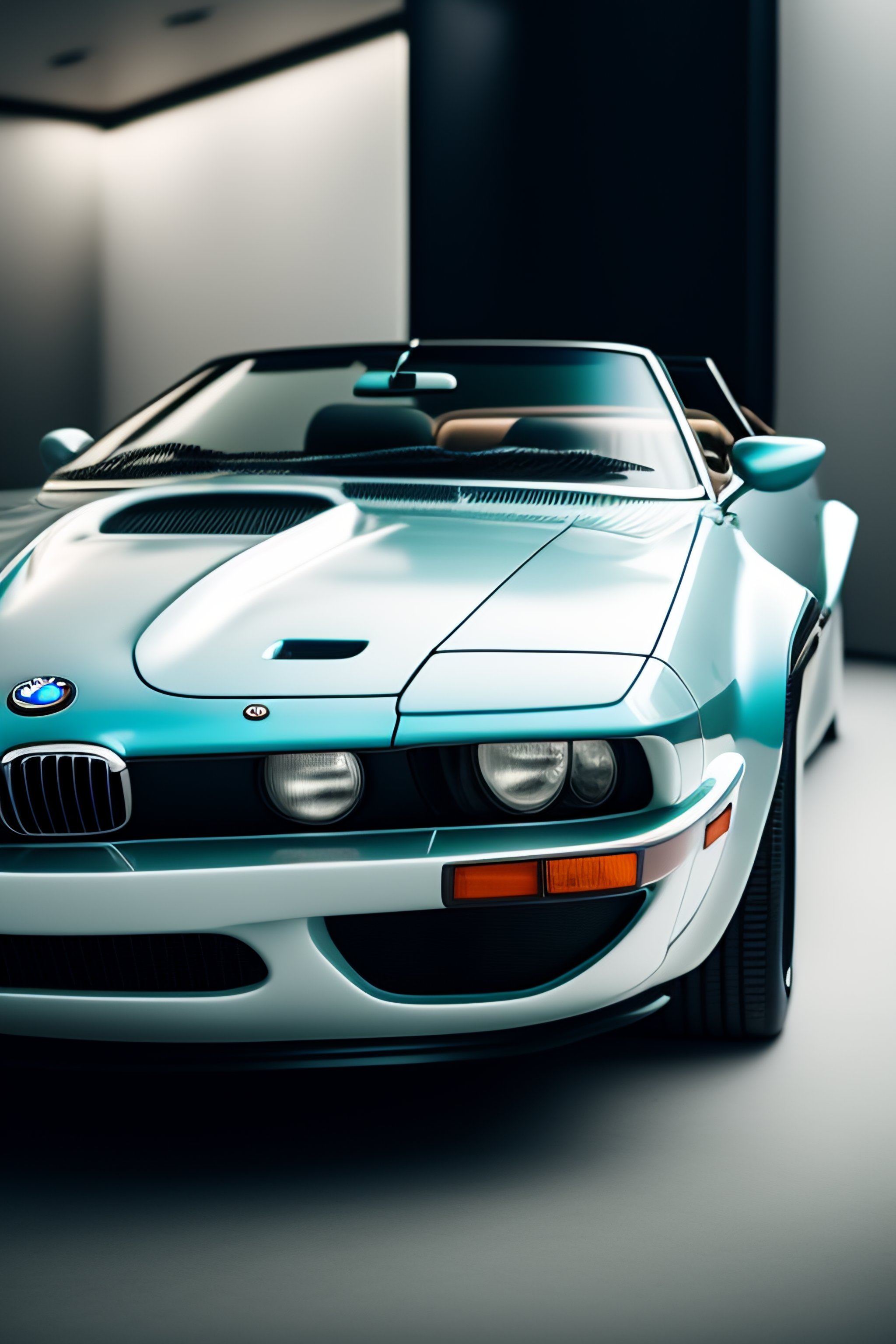 Ultra hd! editorial, ivory and chrome blue iso 400, surrealistic, 8k, on display bmw m1 cabriolet, in museum, simon stalenhag