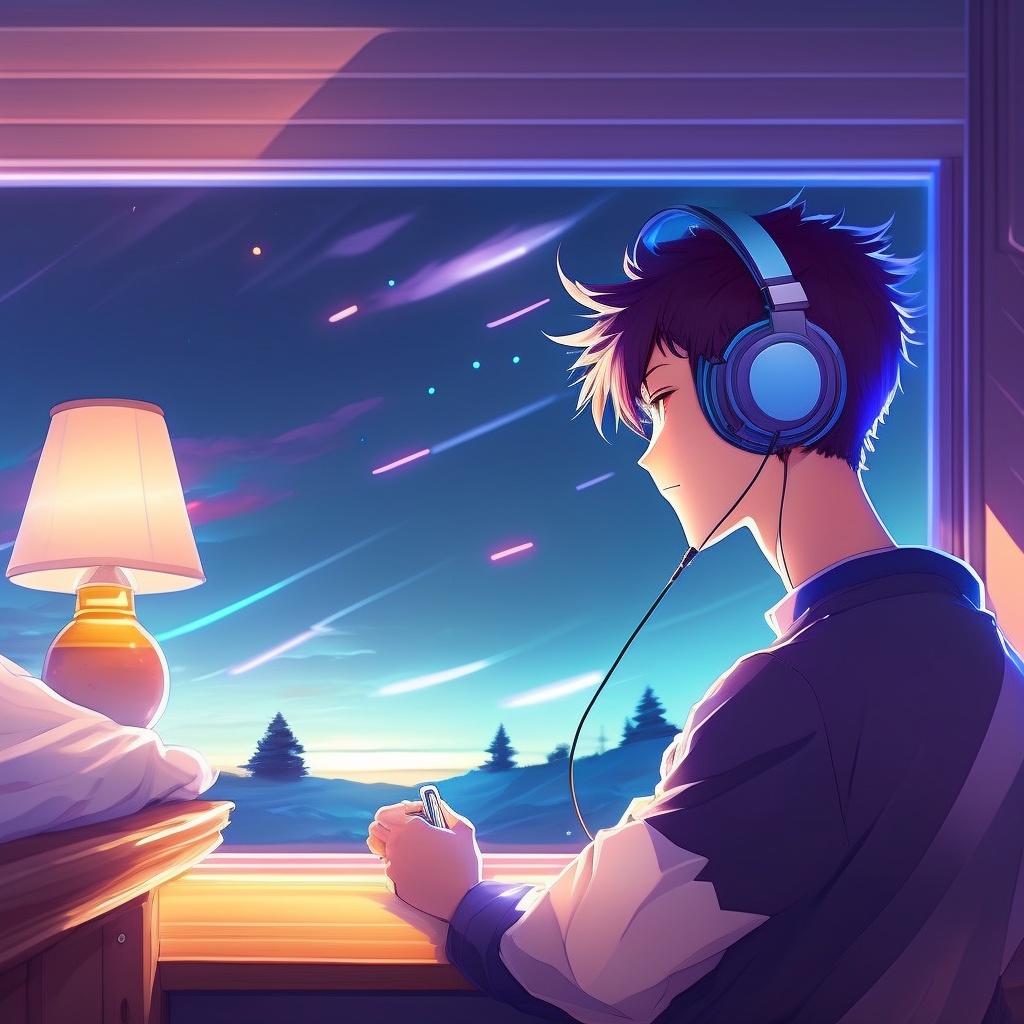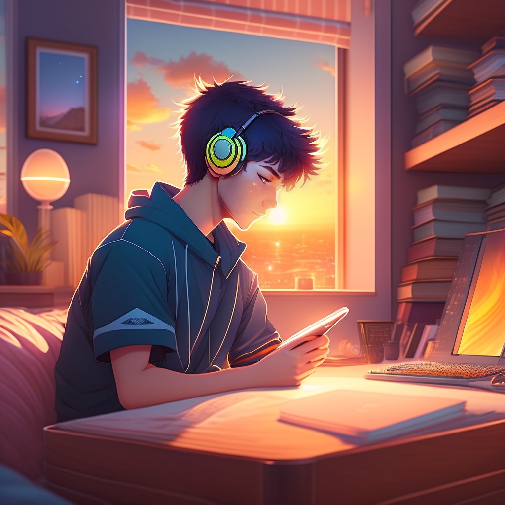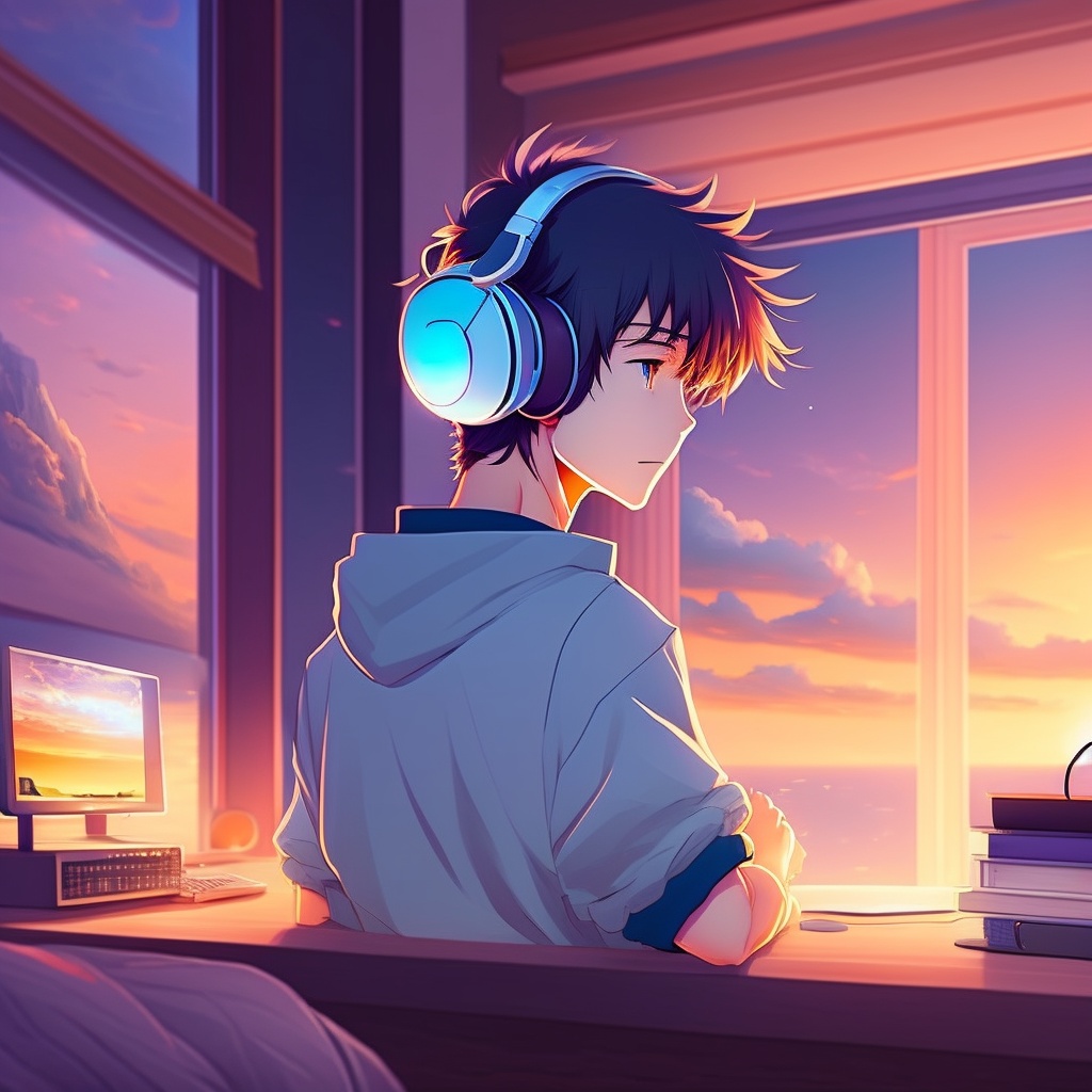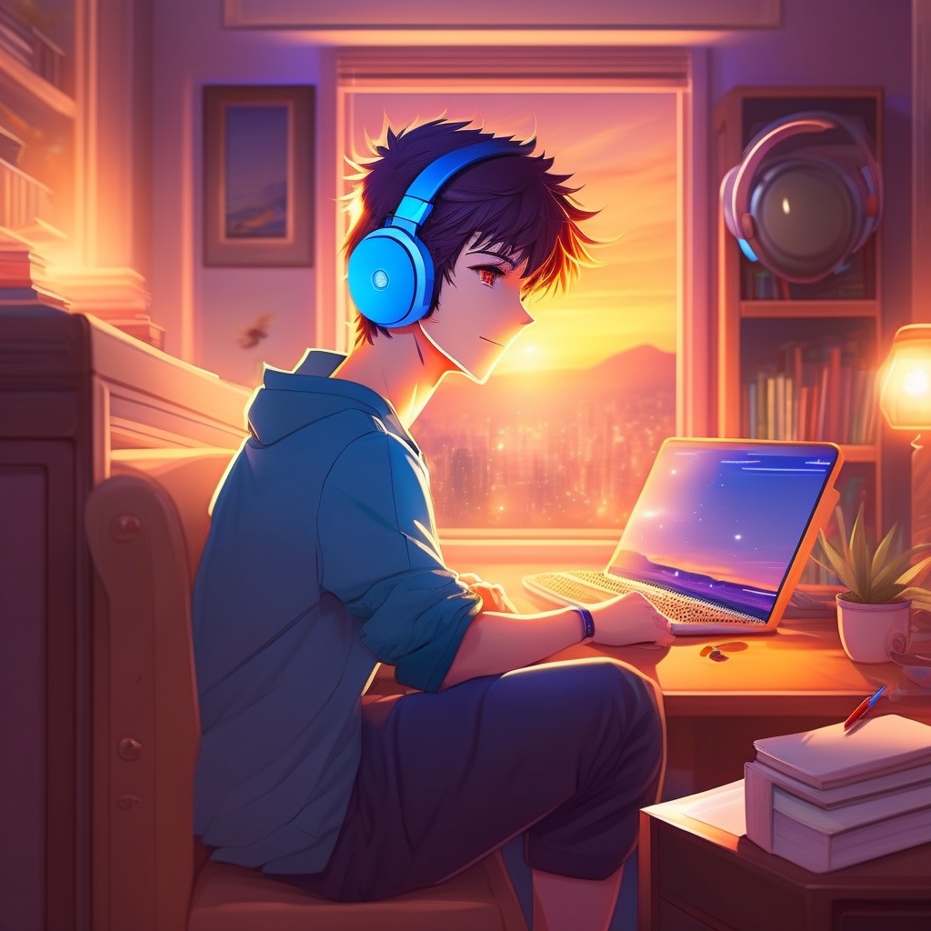 Anime young man, listening to music with headphone and studys in his room, wide angle, anime boy, sunset, relaxed, starts, soft light