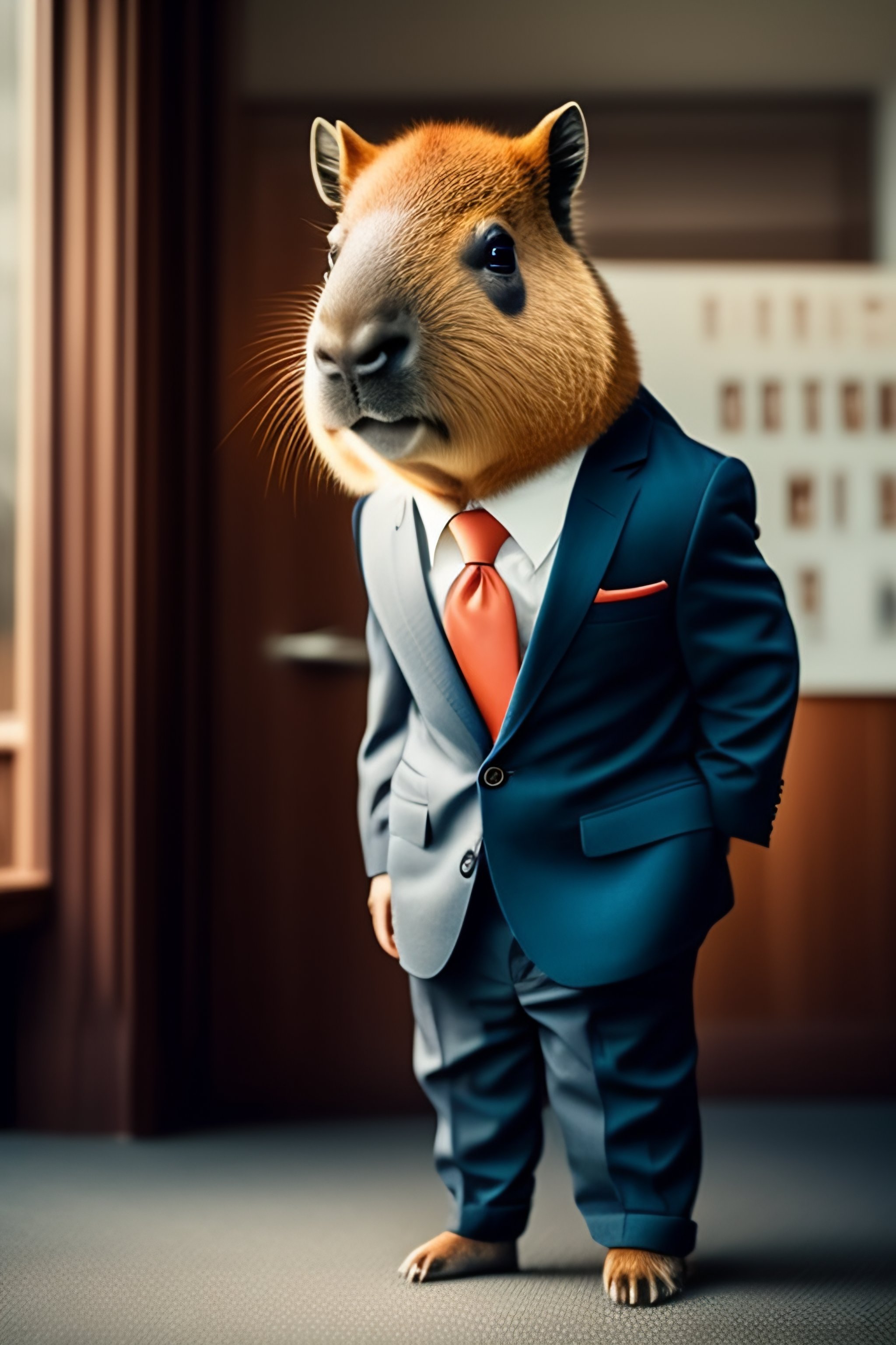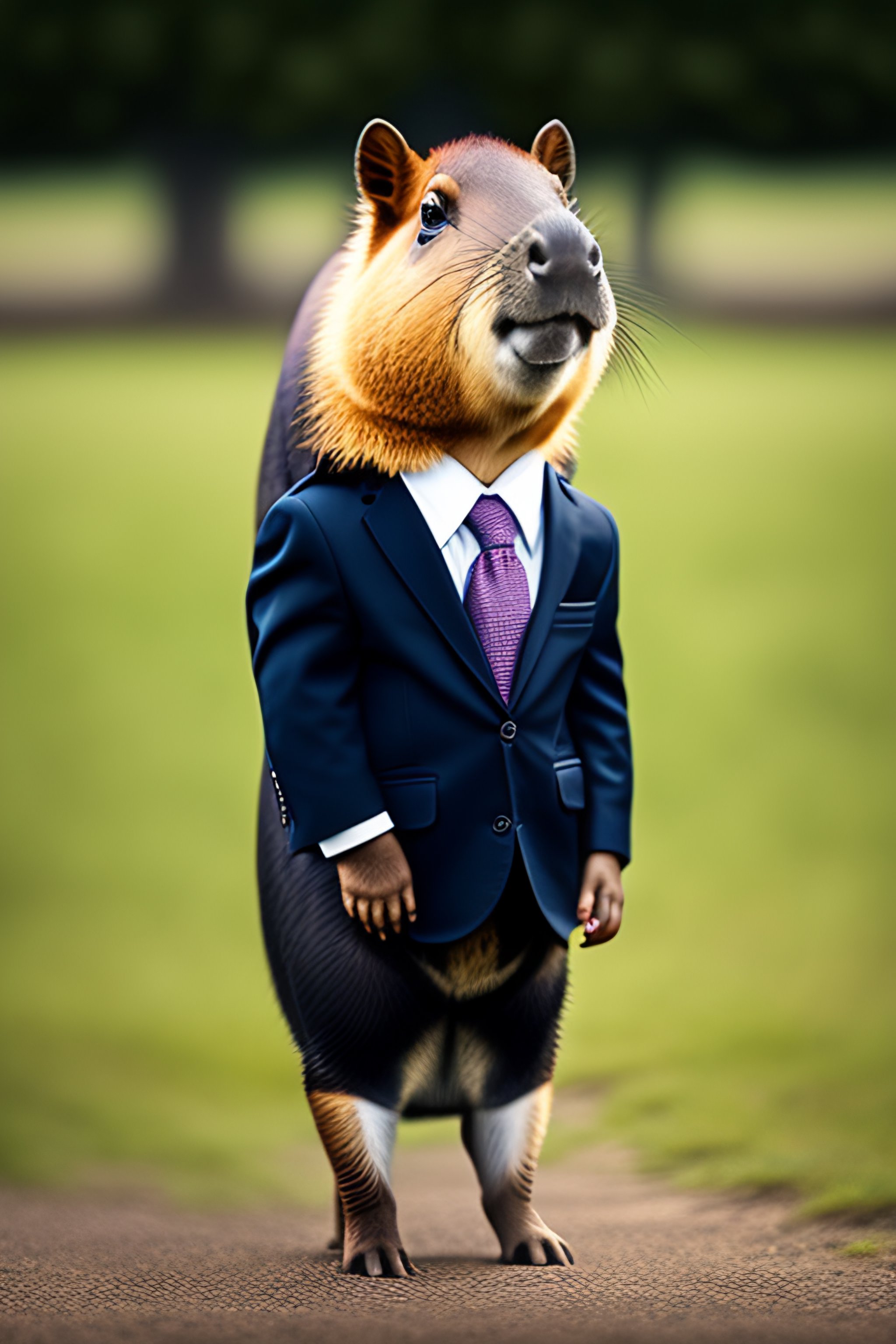 A cute capybara standing up on its hind legs and wearing a suit an tie, getting ready for a job interview