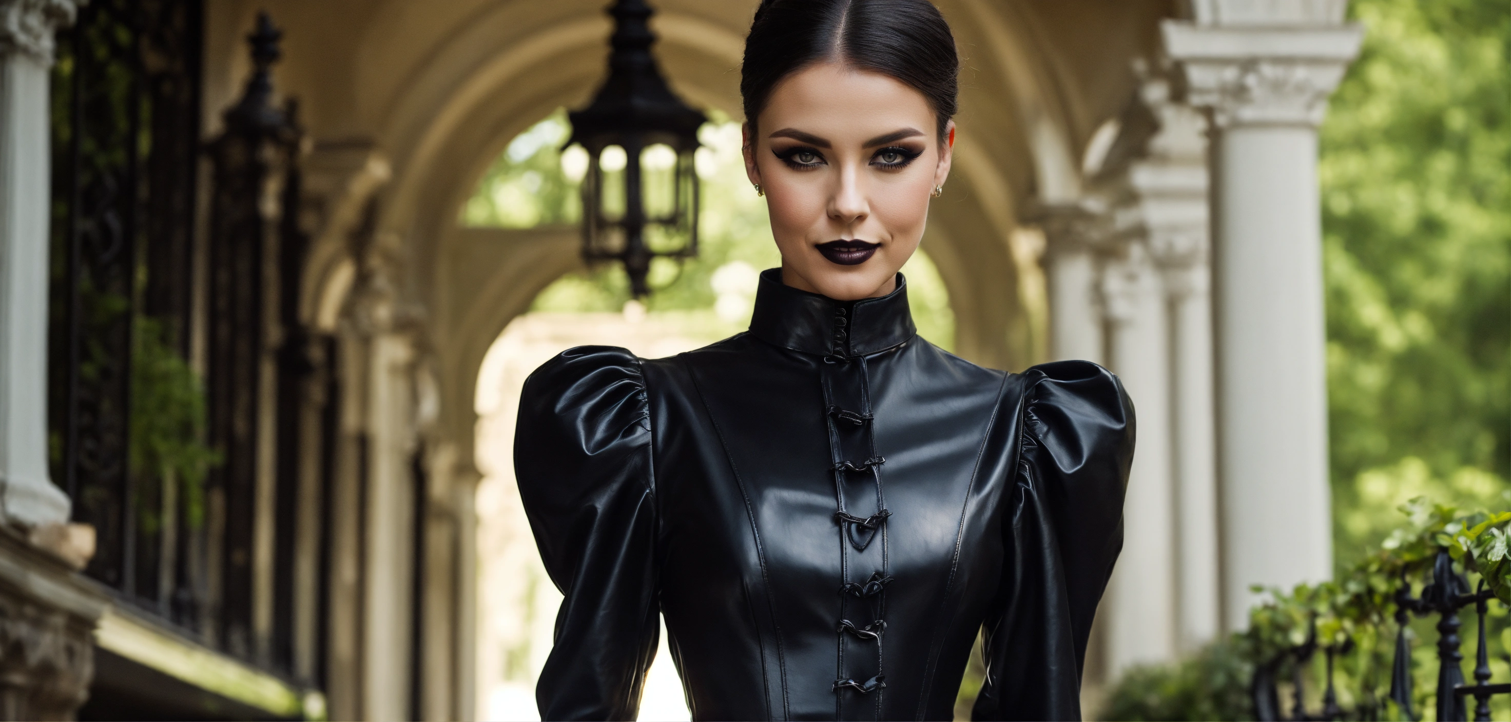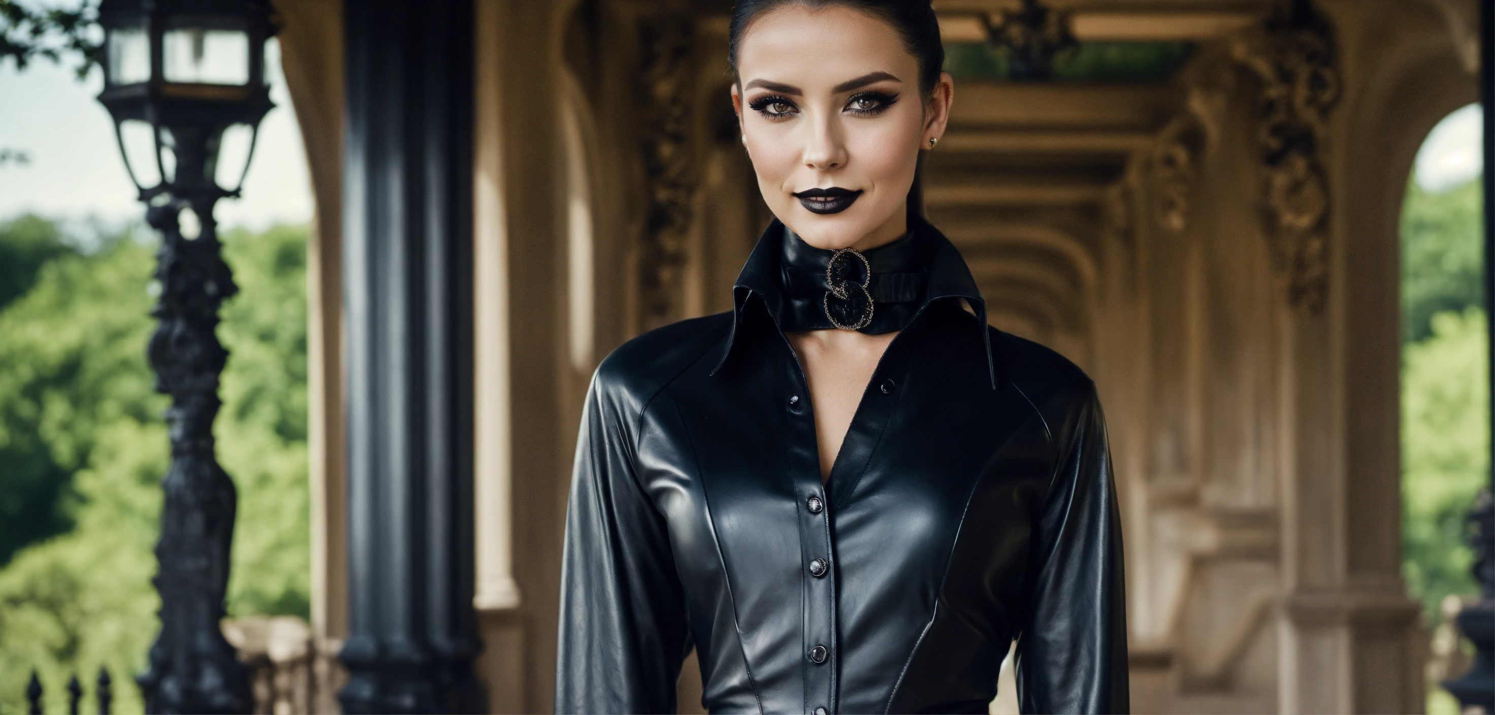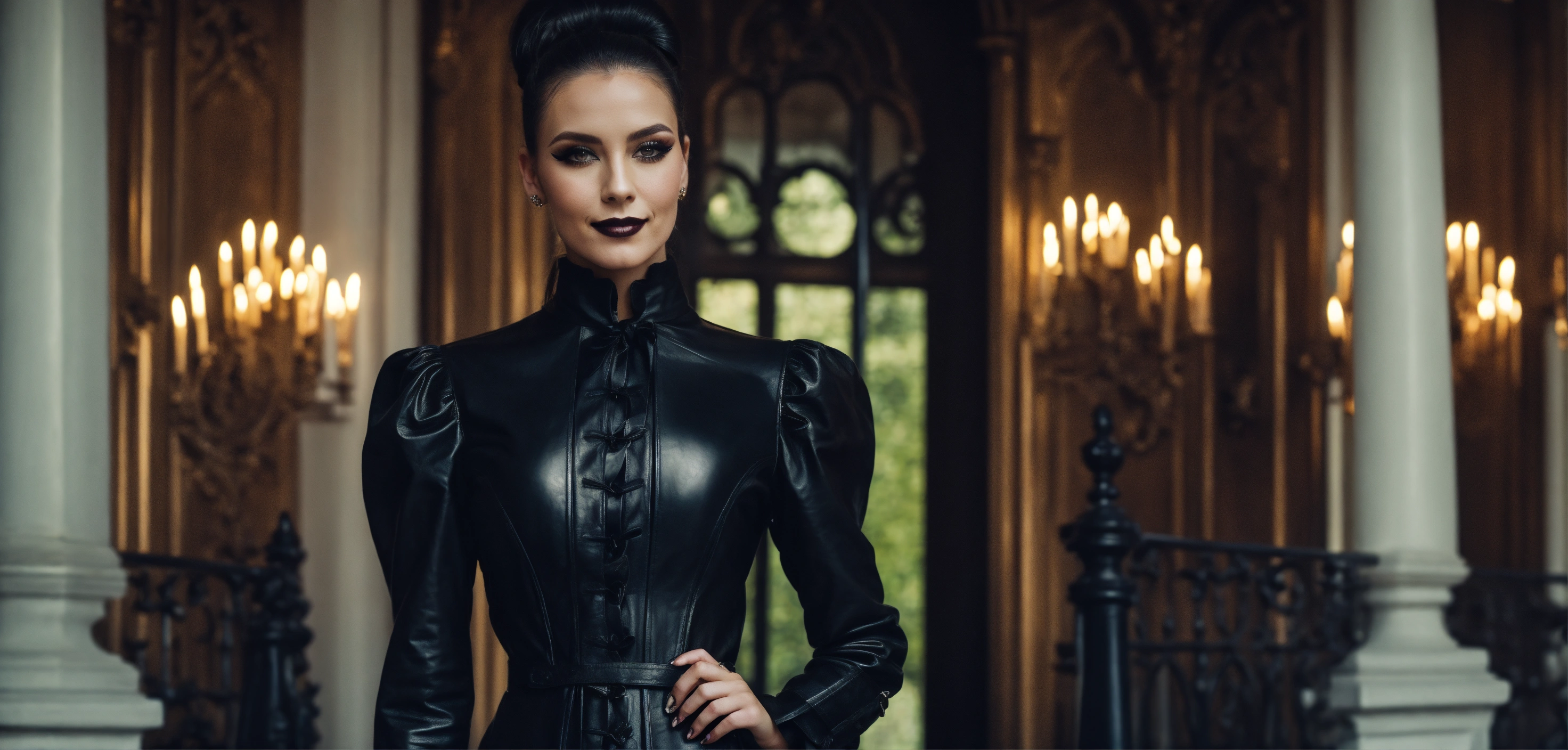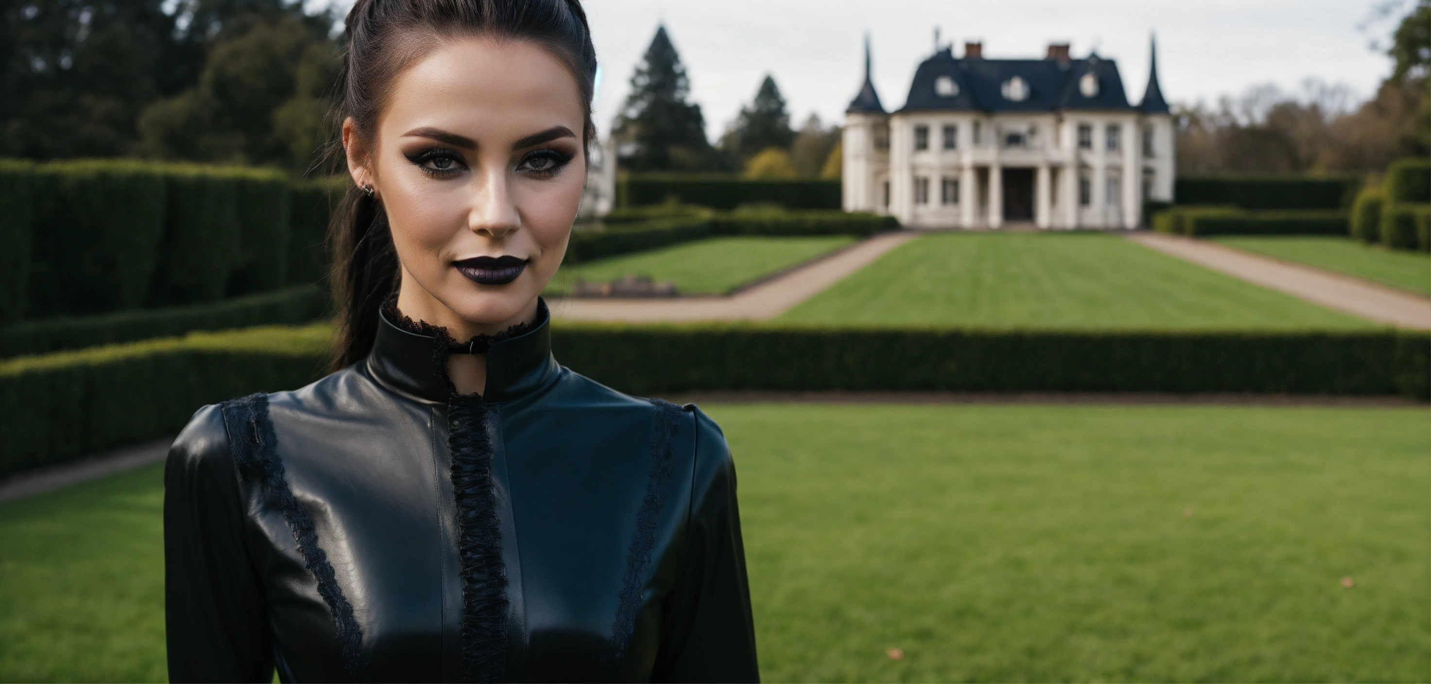 Stunning arrogant woman fashion model, evil smile, strict victorian black leather governess shirt dress, black straight high ponytail, dark eyeliner makeup, mansion park