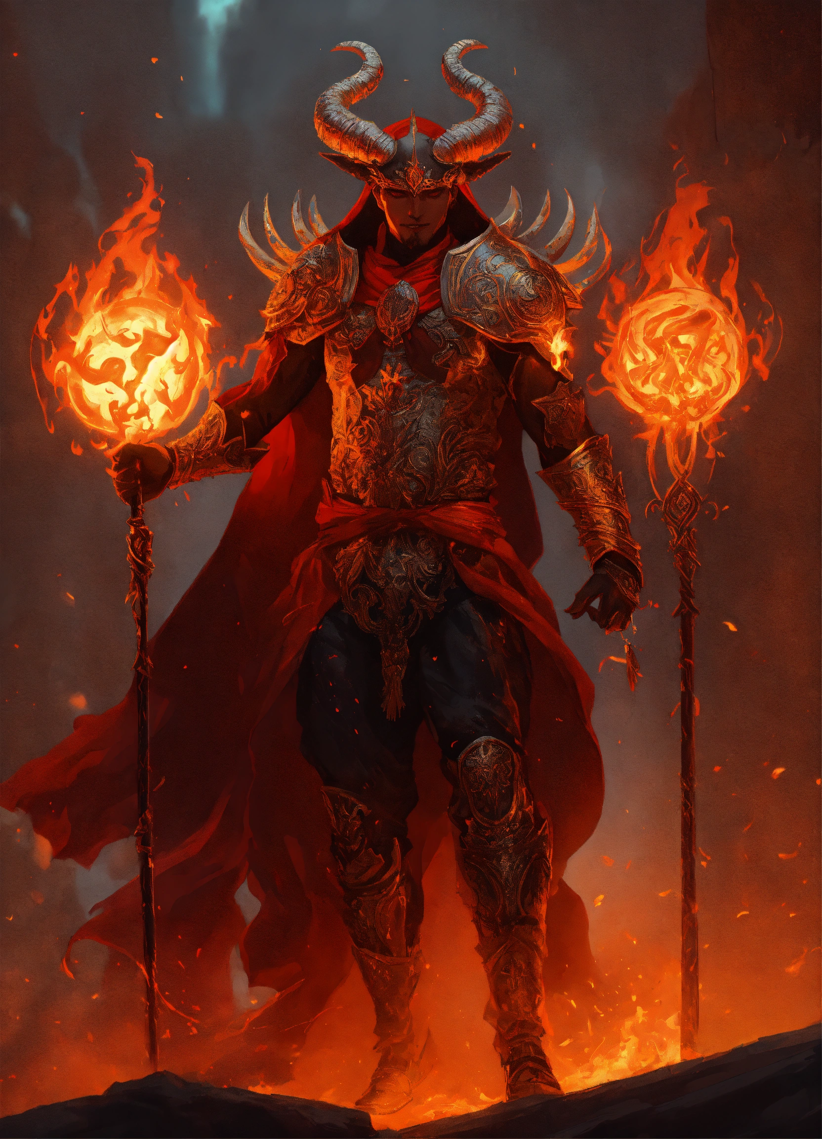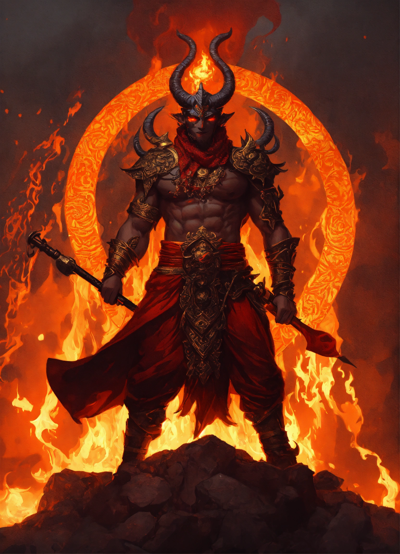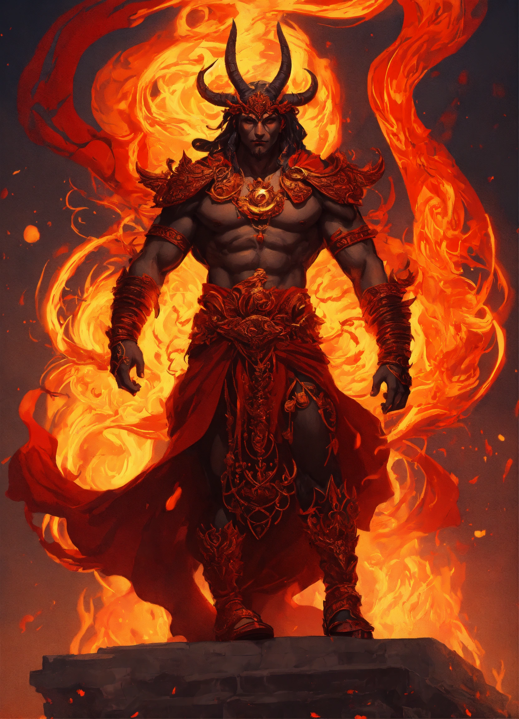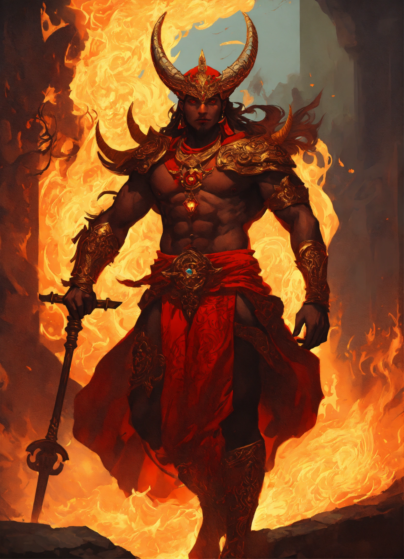 Fantastic male fire jinn 5 + eshu exú guardian of the paths greek mythology with pitchfork symbol, statue wrapped in red cloth + fire uplight eyes + demon + fire elements around + demonic symbols + demons on artstation + black paper + red + orange + gold + neon + brazilian + white + ink + playing card with ornate border + marc simonetti, paul pope, peter mohrbacher, dane brennand detailed, intricate ink illustration olga dreba detailed high definition 8k photography glowing
