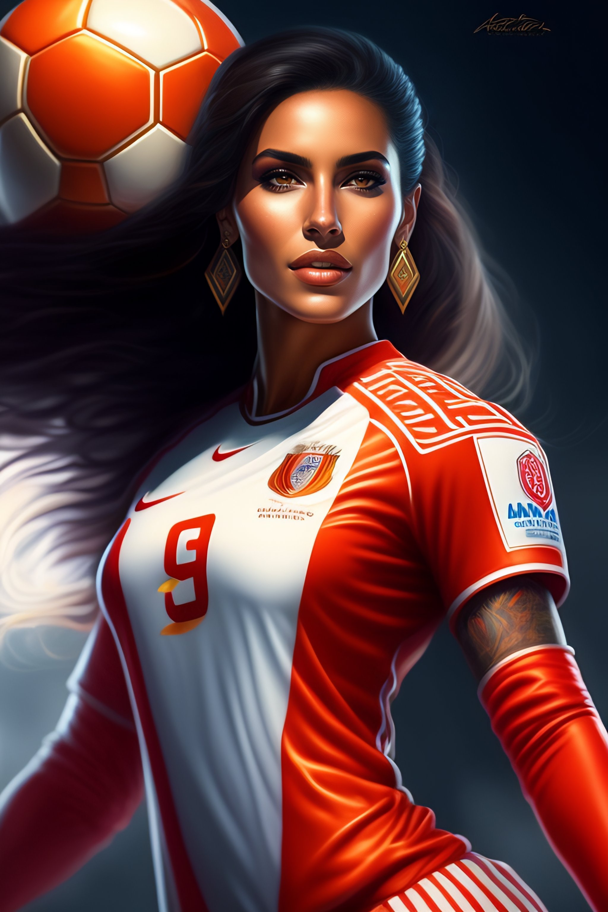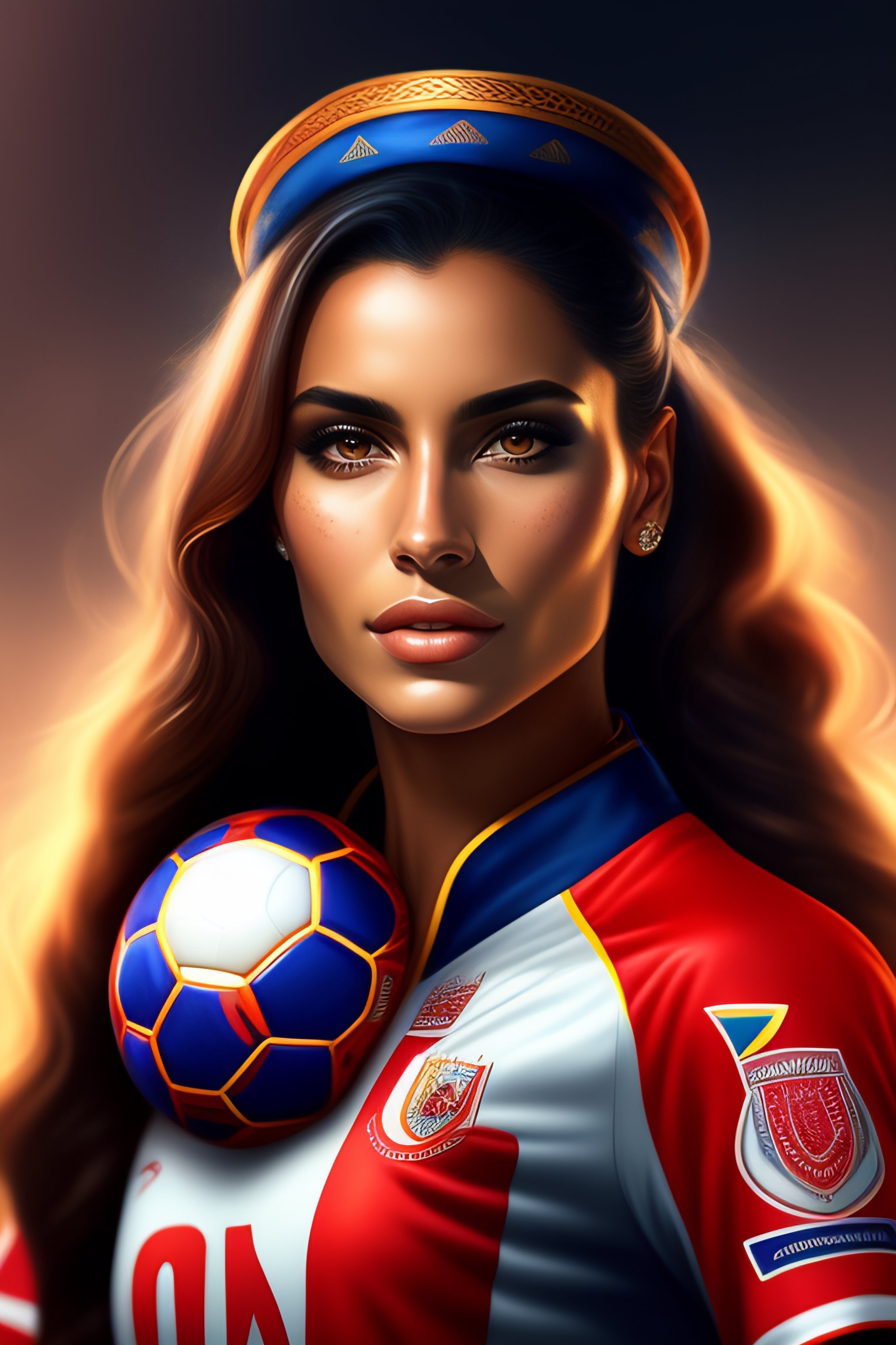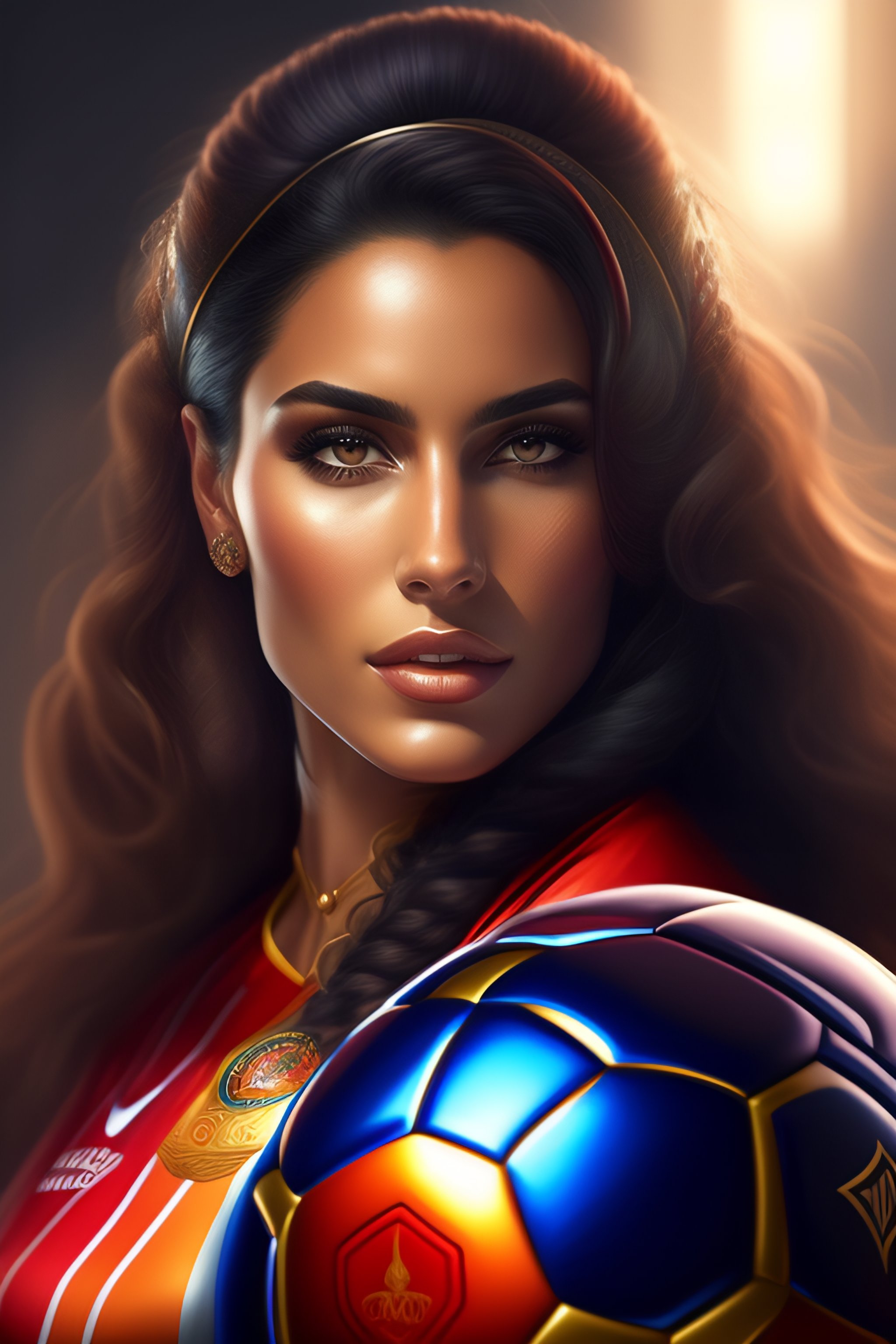 A portrait of a woman that is a personification of moroccan football team wearing moroco and holding a soccer ball, latino american, intricate, highly detailed, digital painting, artstation, concept art, smooth, sharp focus, illustration, art by artgerm and mark arian, matte painting