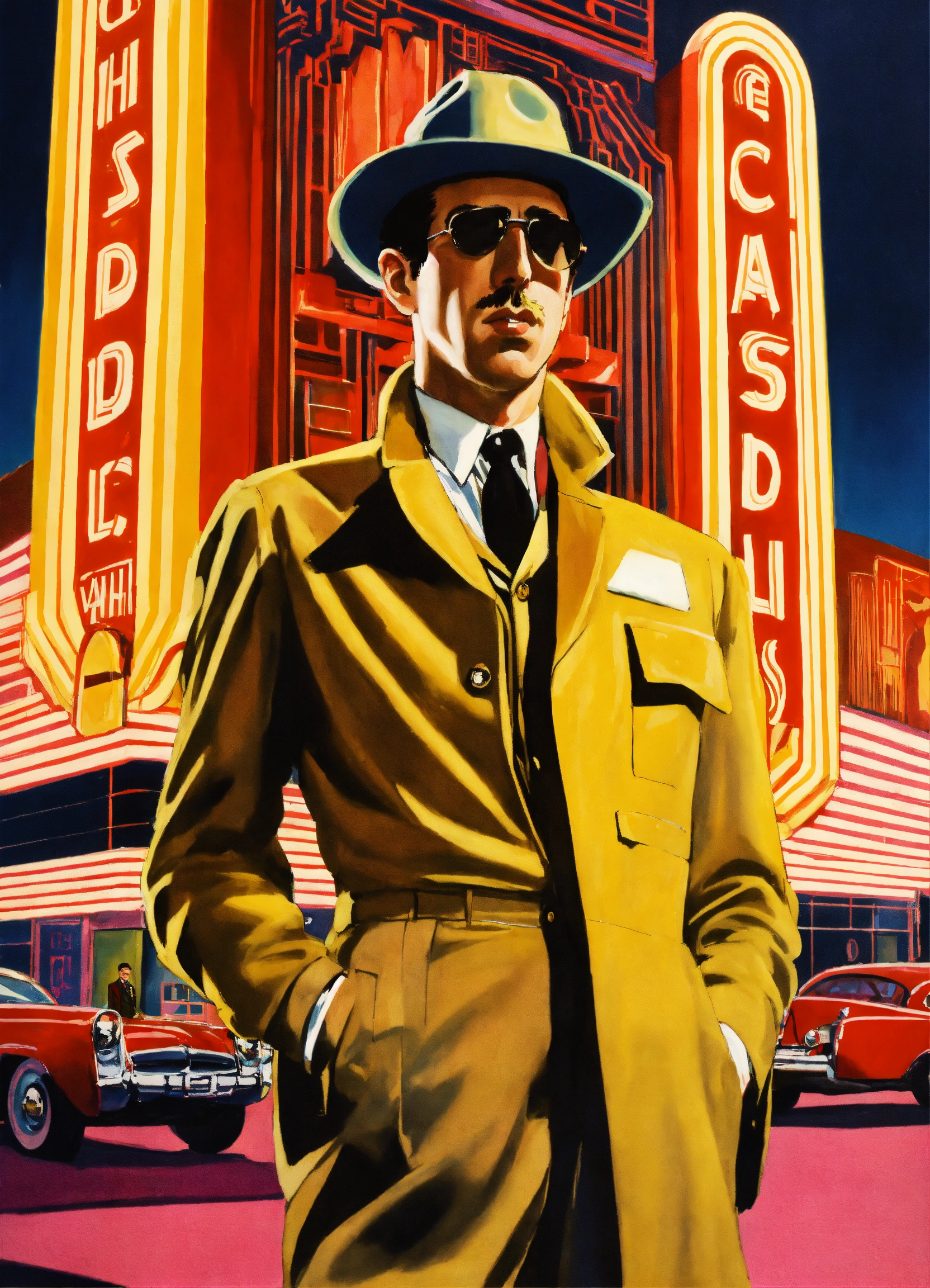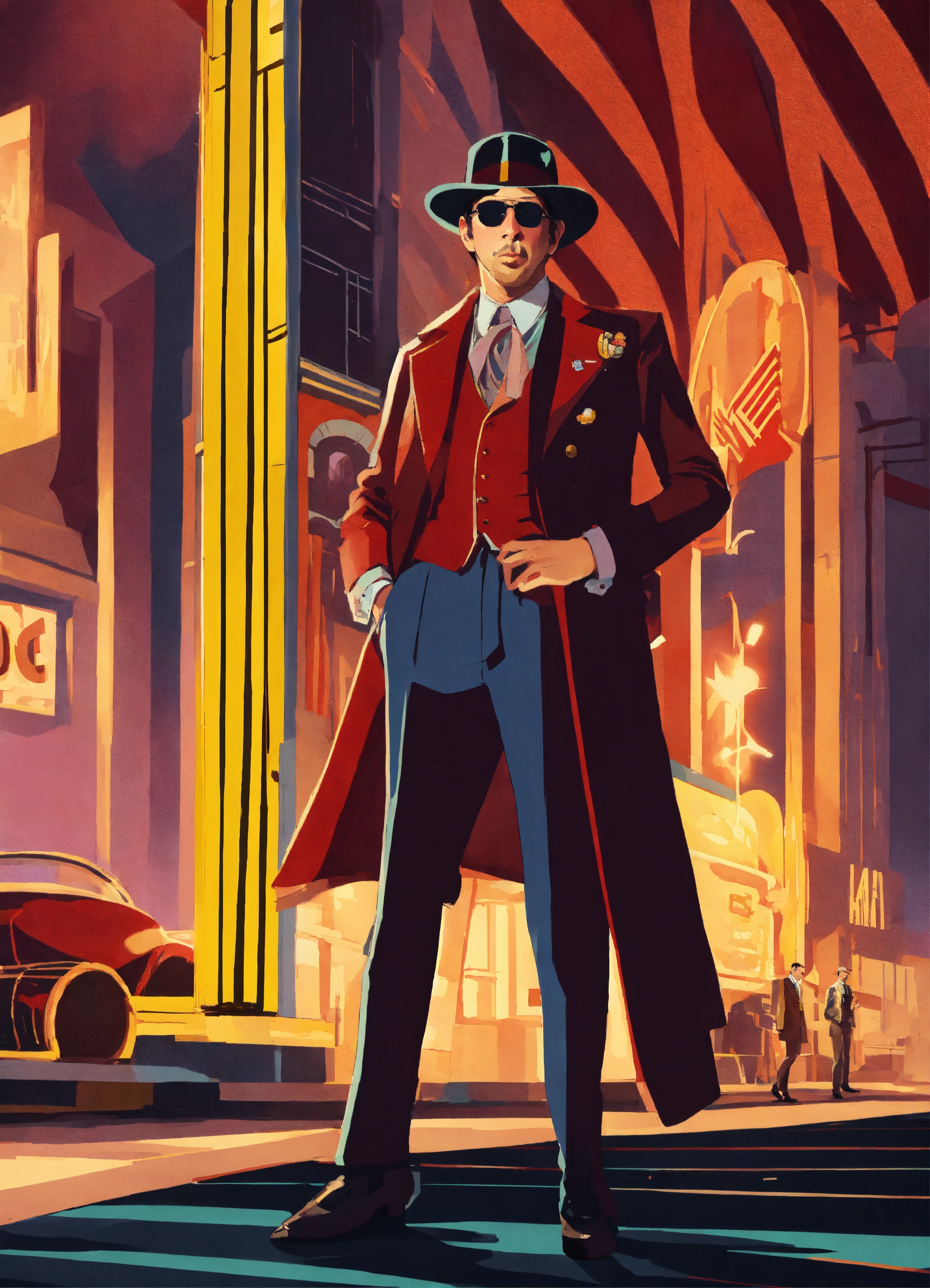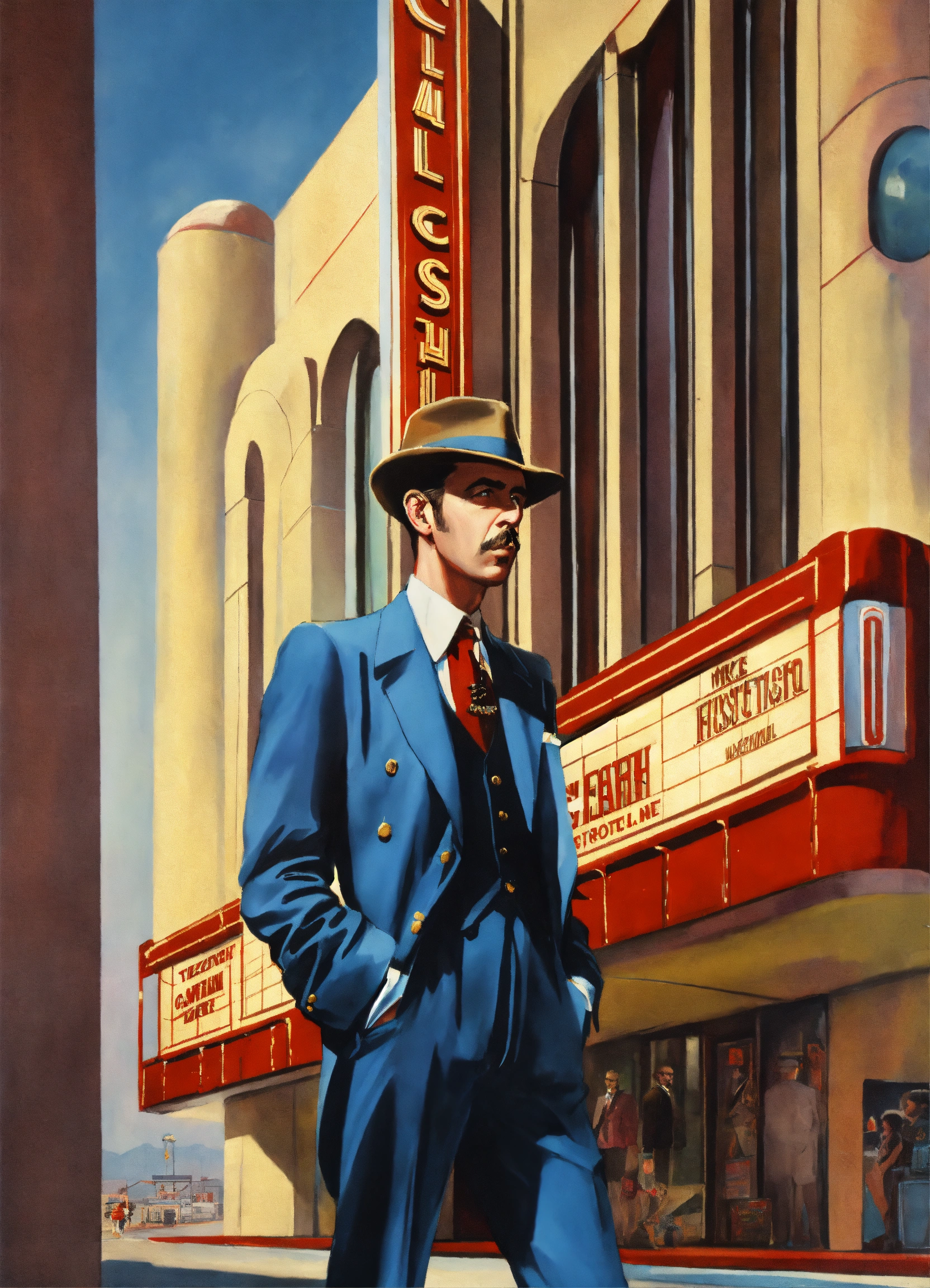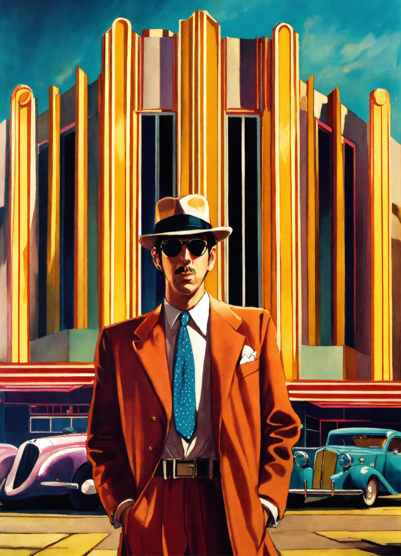 Mick jones from the clash, zoot suit, thin moustache, stood in front of art deco cinema building, futuristic concept art