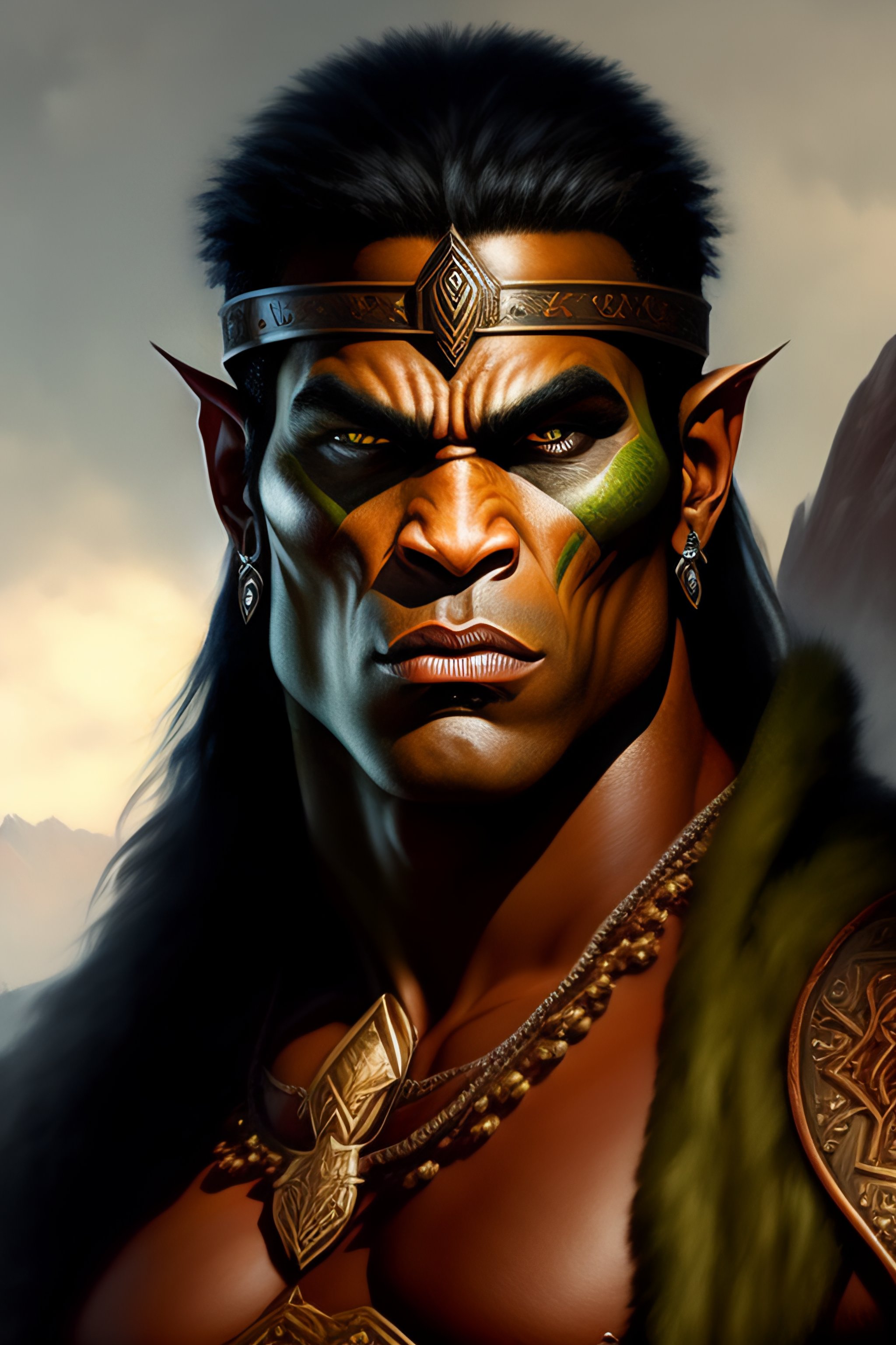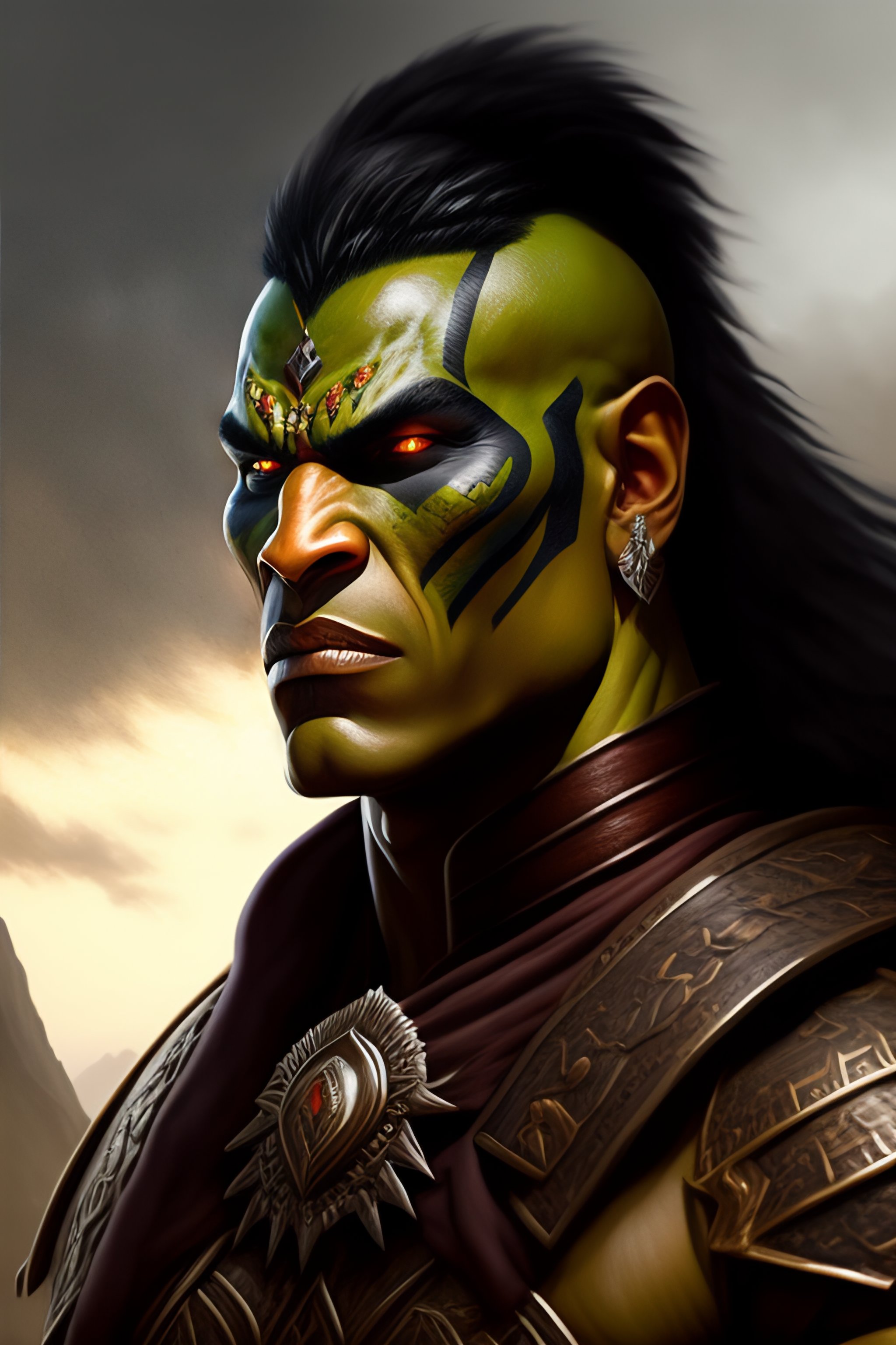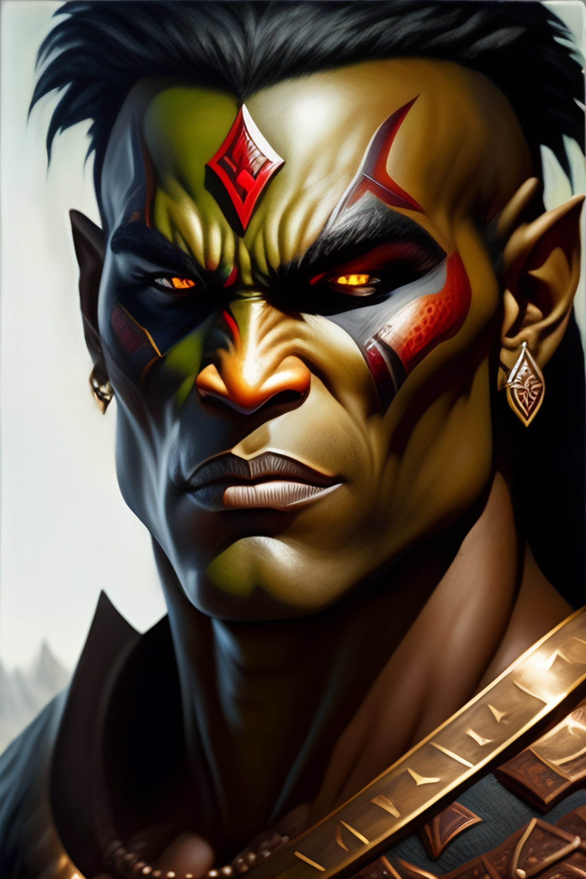 Half orc half human berserker oil painting with orcish face and olive skin d&d full body portrait, highly detailed wearing civil clothes