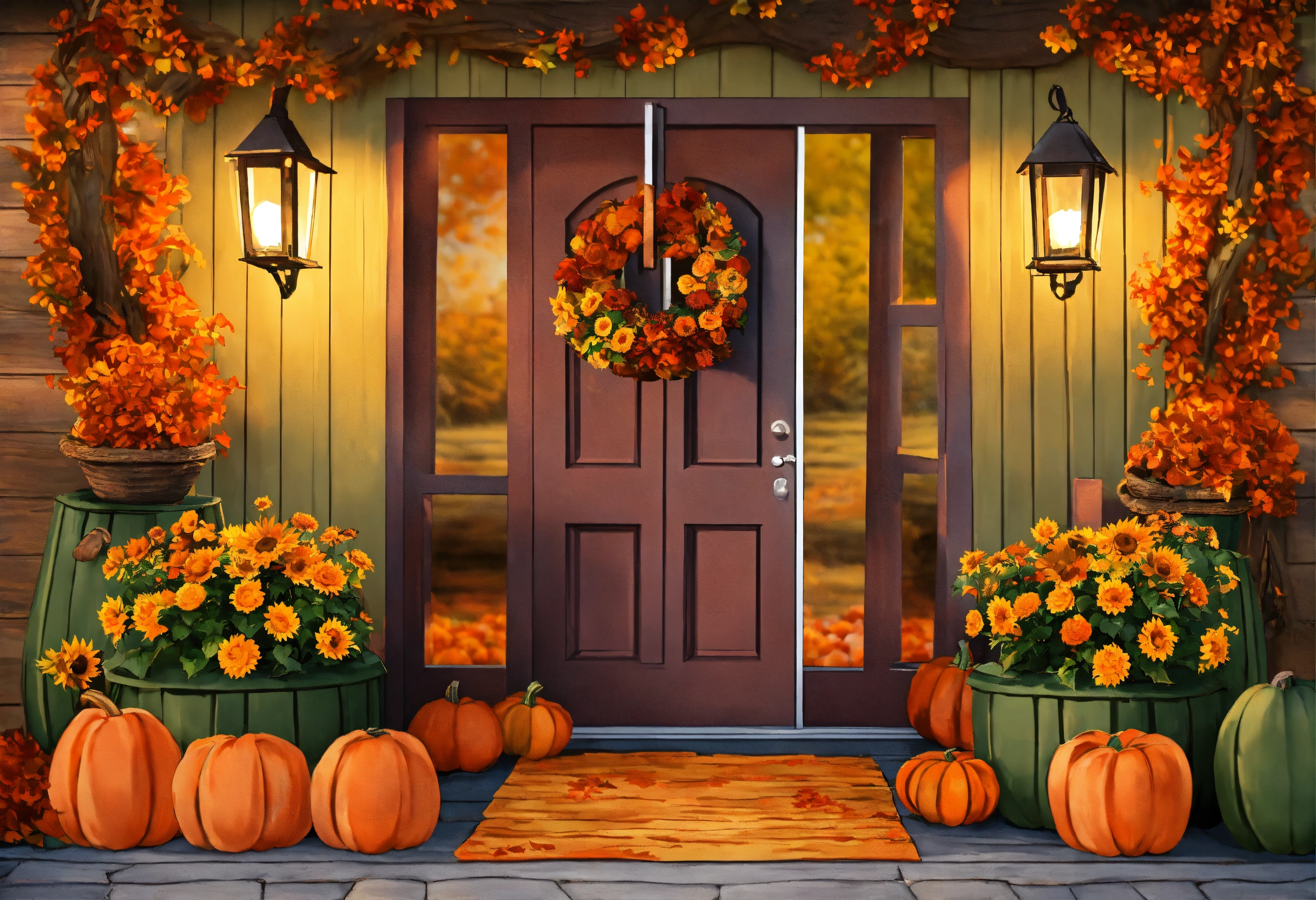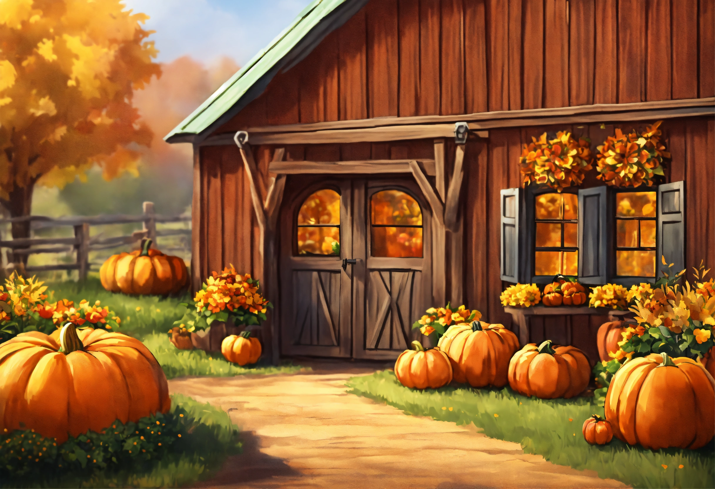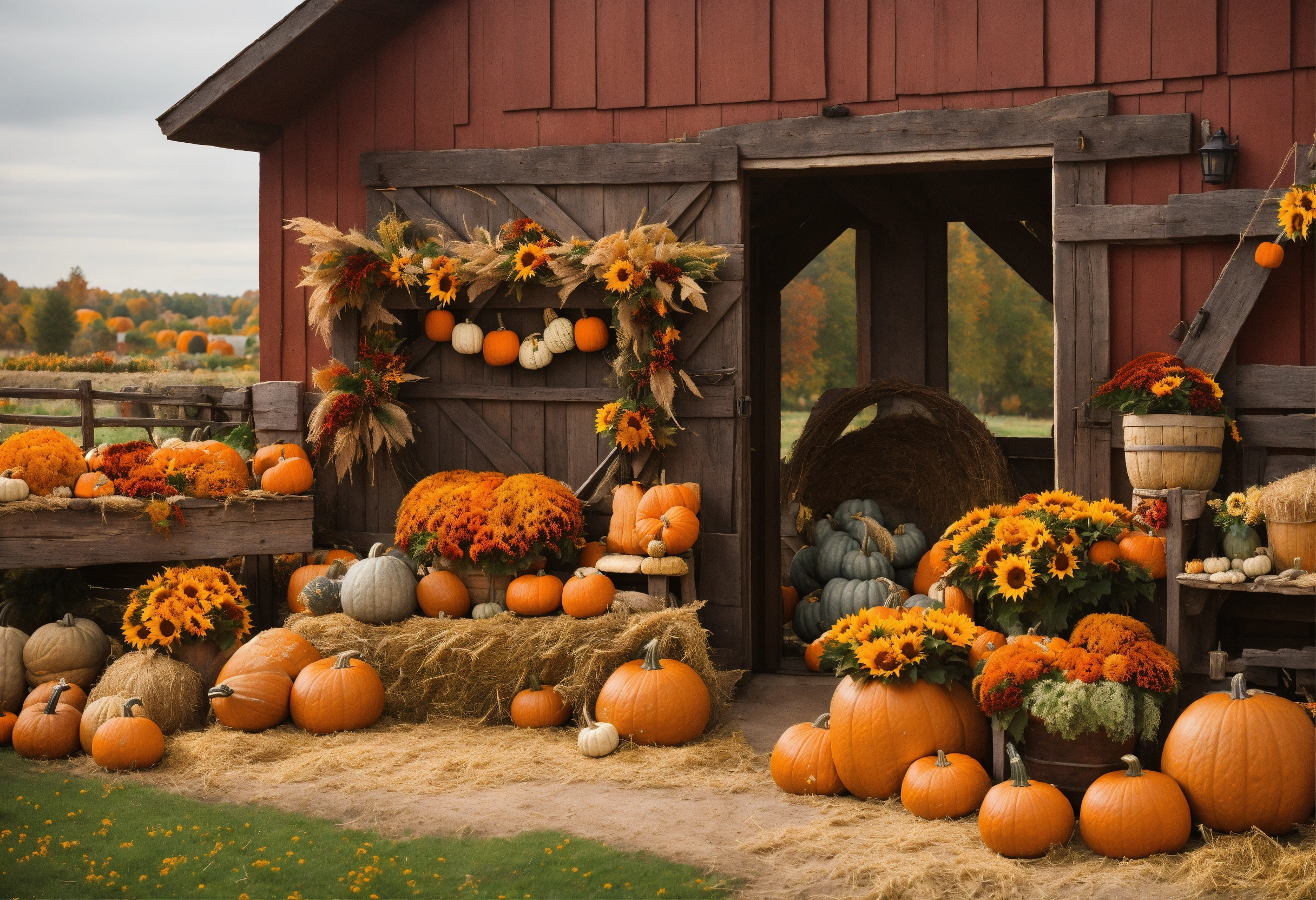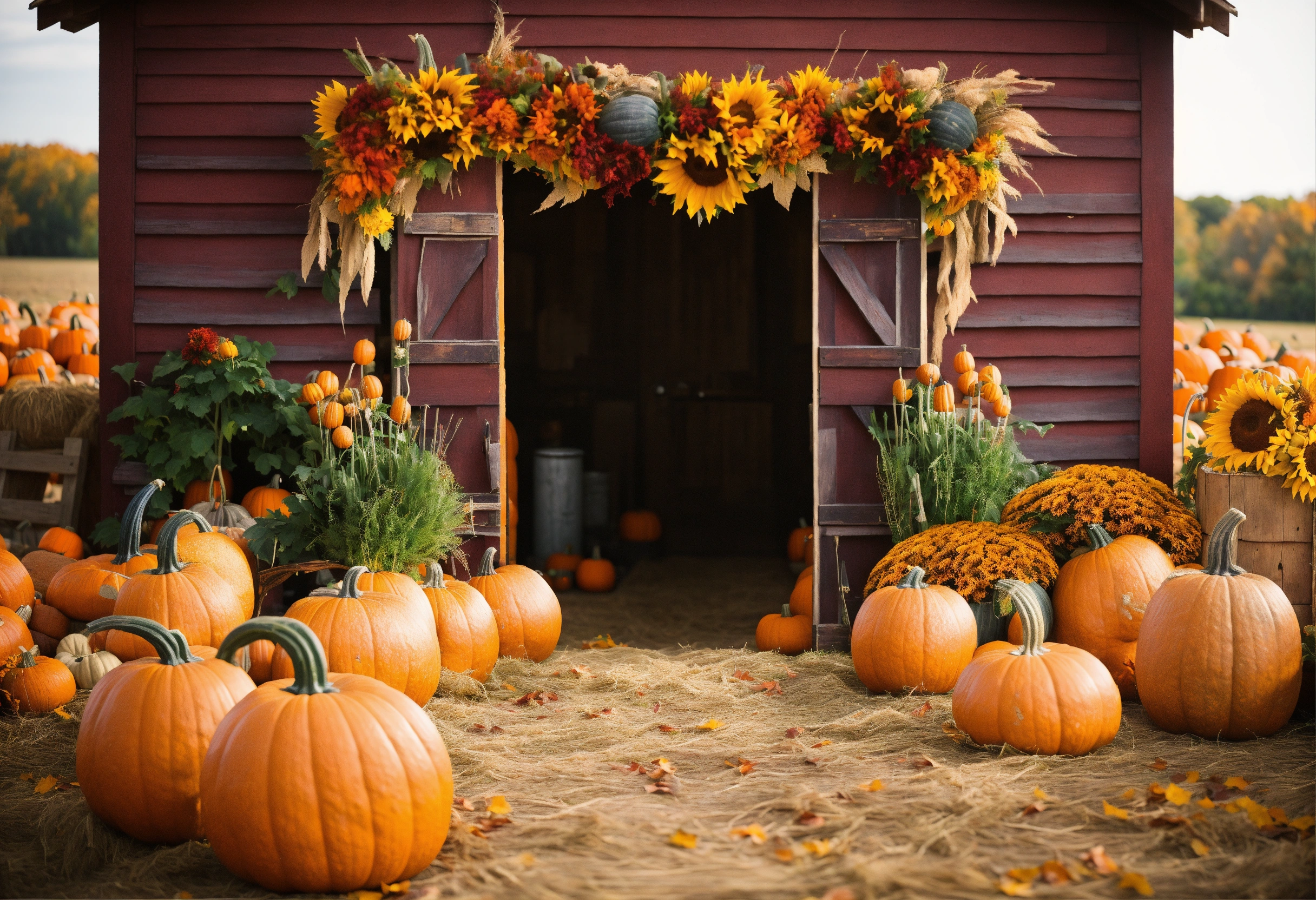 Create a festive autumn scene with a wooden doorway, featuring a pumpkin patch, hay bales, and a variety of pumpkins and gourds. the doorway should be adorned with autumn flowers and plants, such as sunflowers, mums, and autumn foliage. the scene should be set in a rustic barn or farmhouse setting, with a cozy and warm atmosphere.