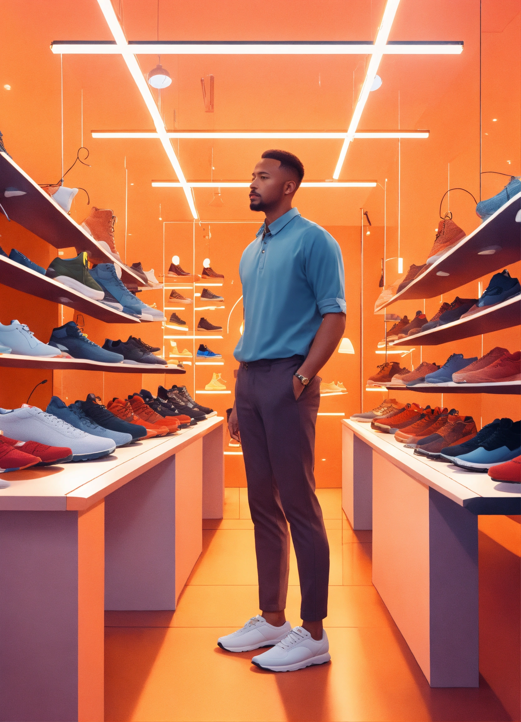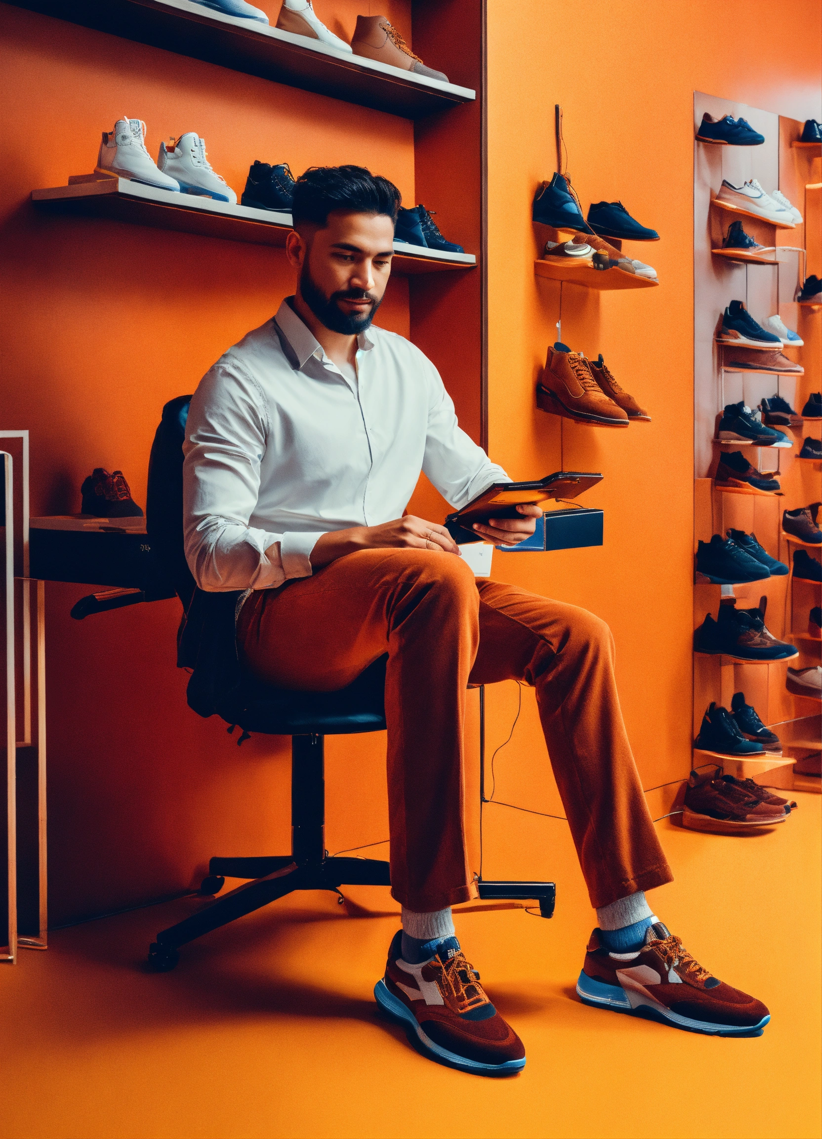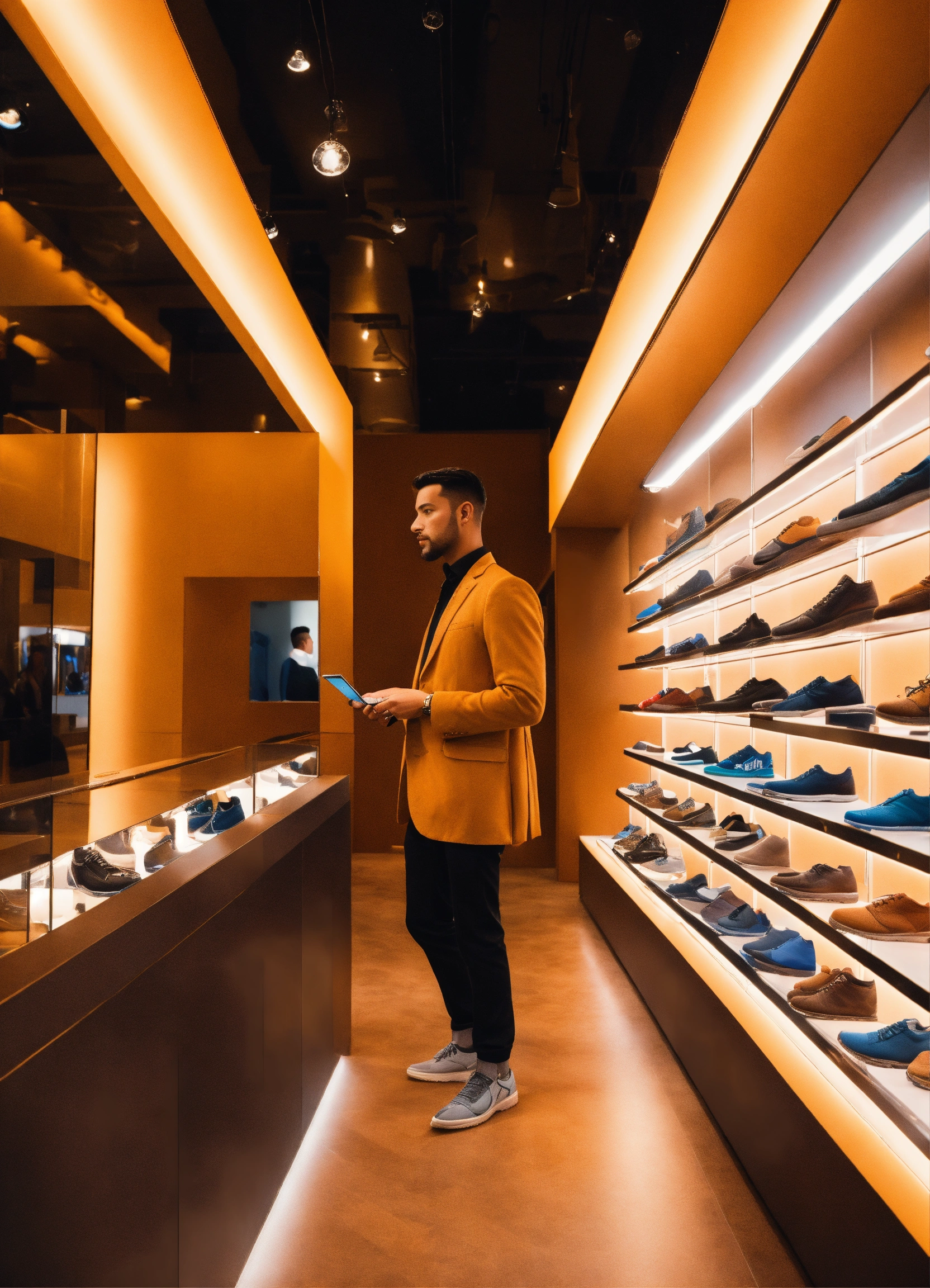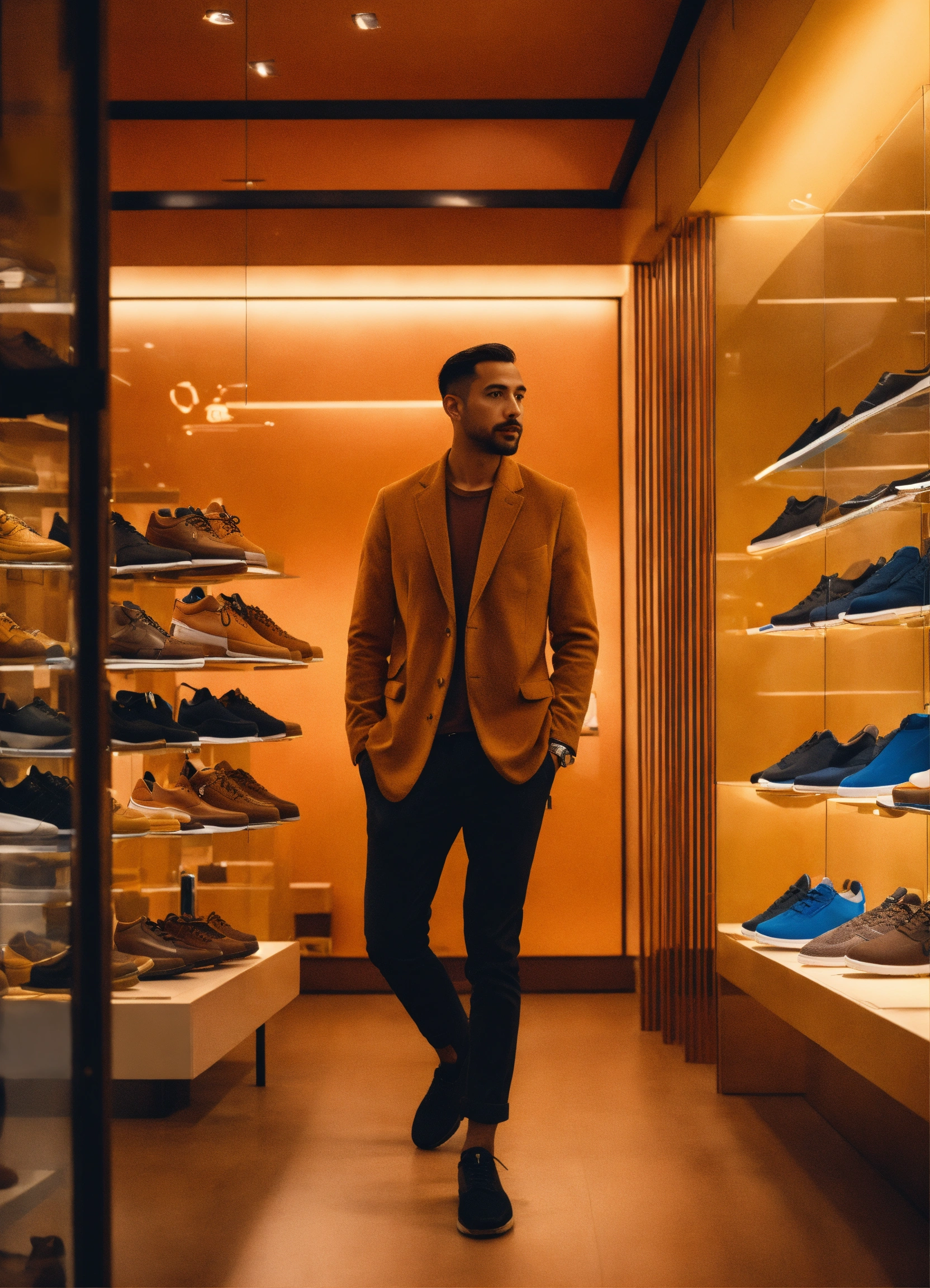Portrait of a man in a cutting-edge shoe shop with intelligent ai helpers assisting customers, amber hue, the shop offers complete product explanations to help customers make informed decisions