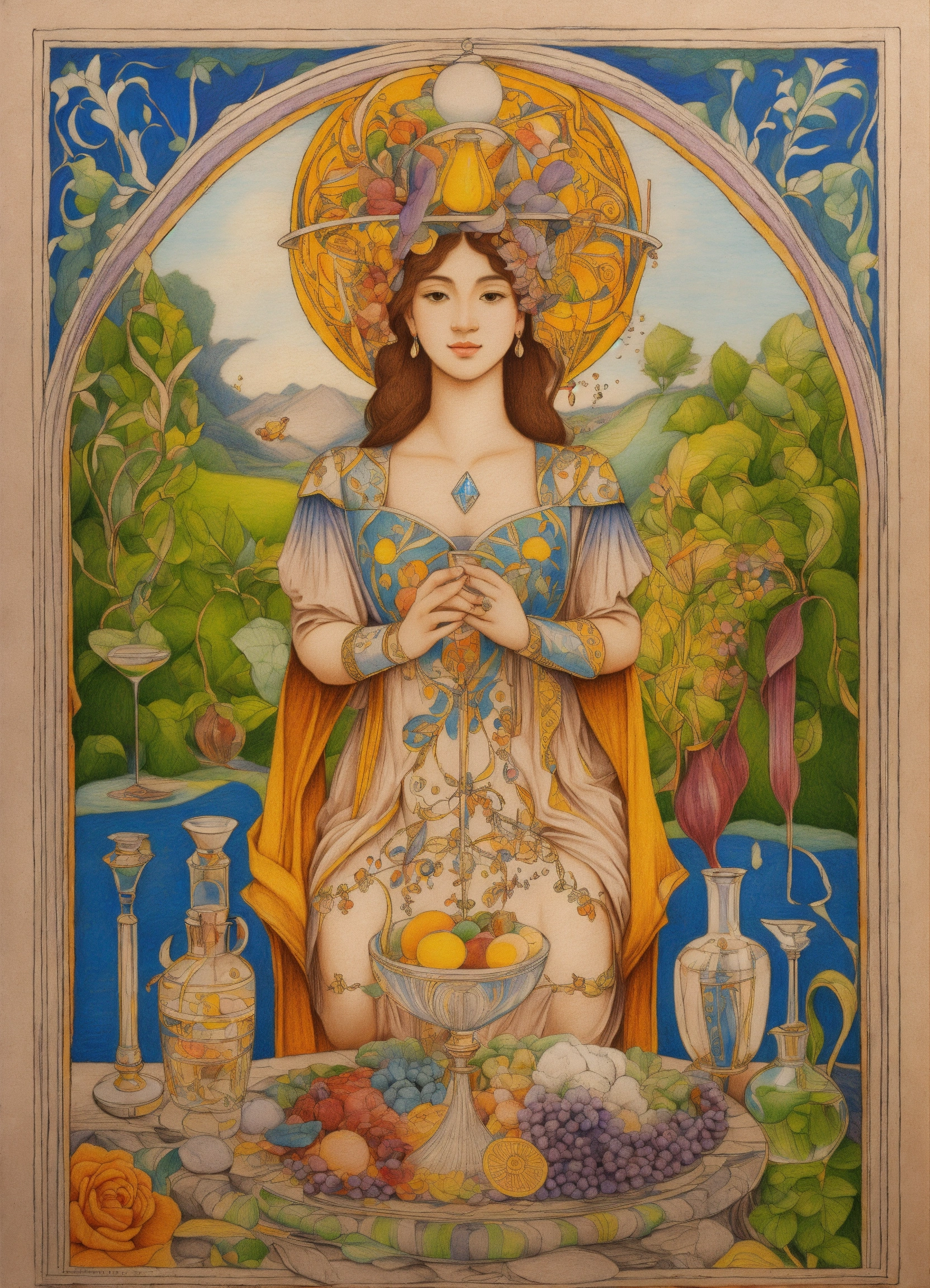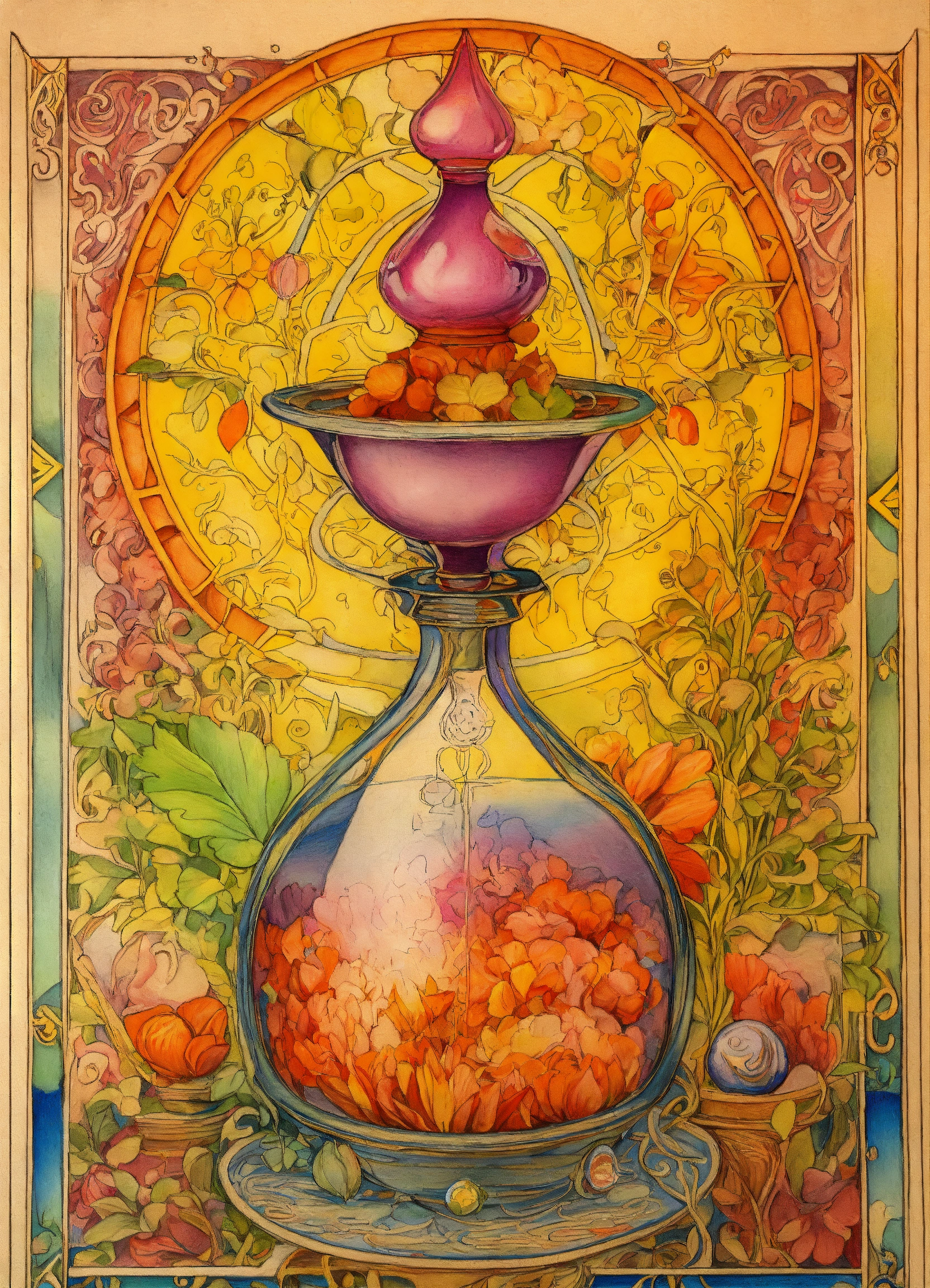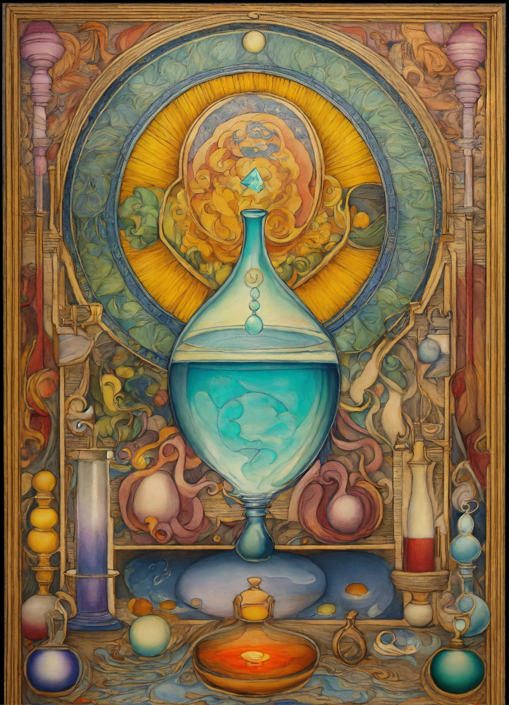 Elexir of life drawing imitation of a 15th century alchemical engraving representing the elixir of life. crystal clear, line drawing, clean clear lines, coloring book style, bright colors, intricate details, elegant, discreete, vibrant, serene, peaceful, harmonious, fine details, pastel pencils