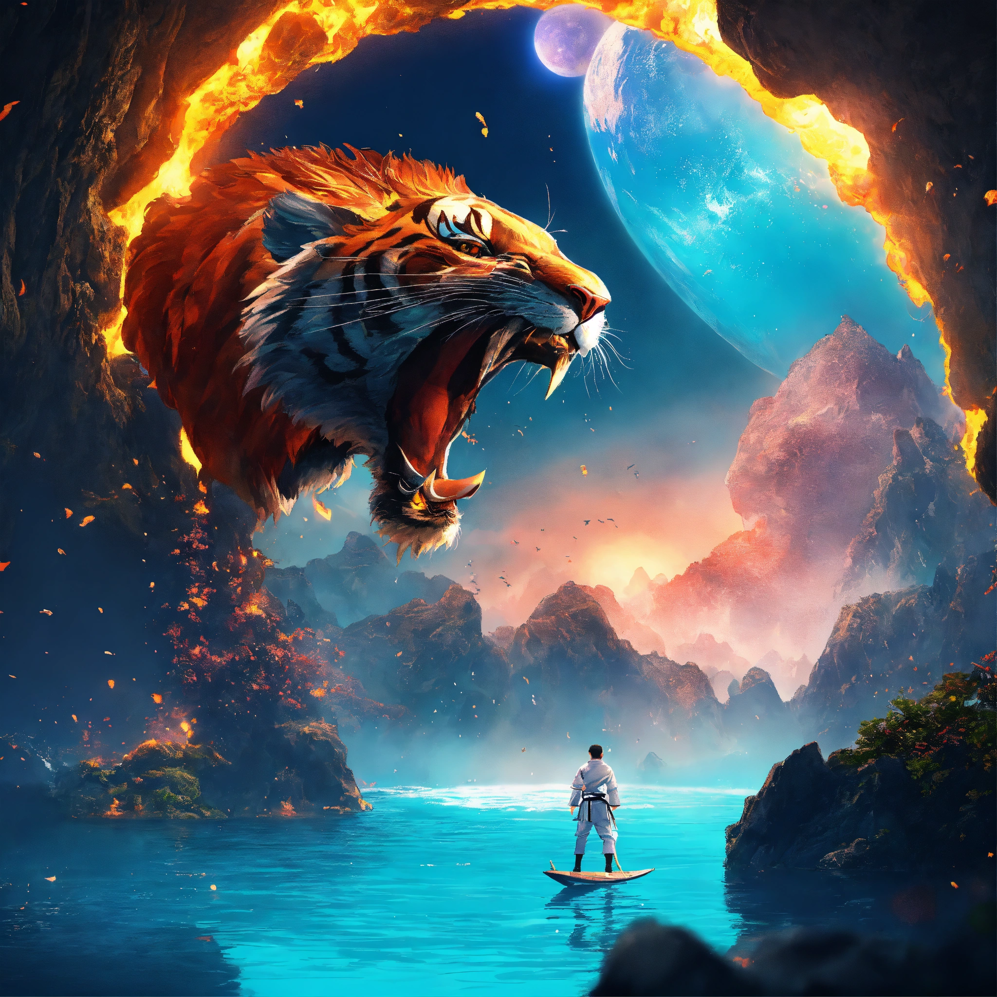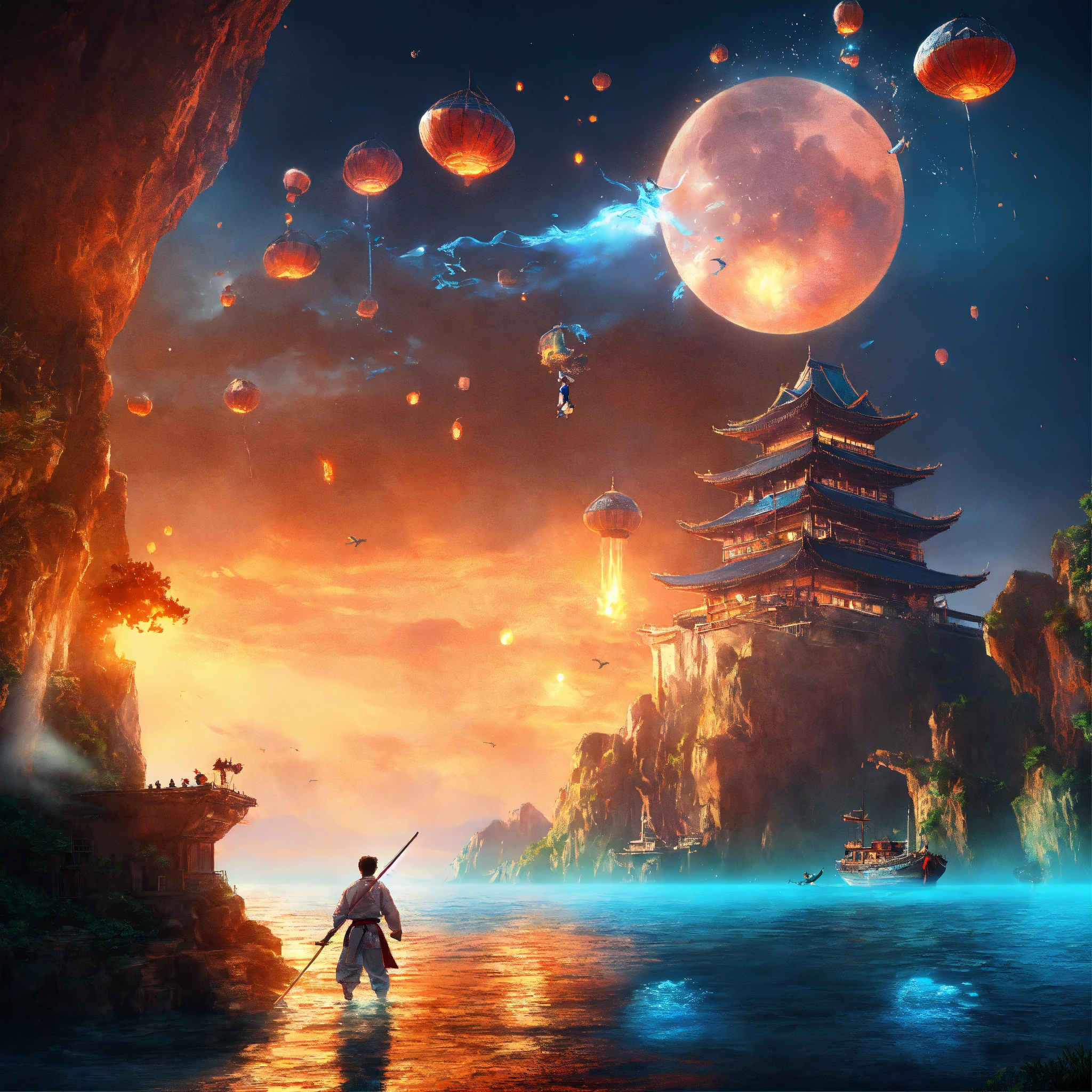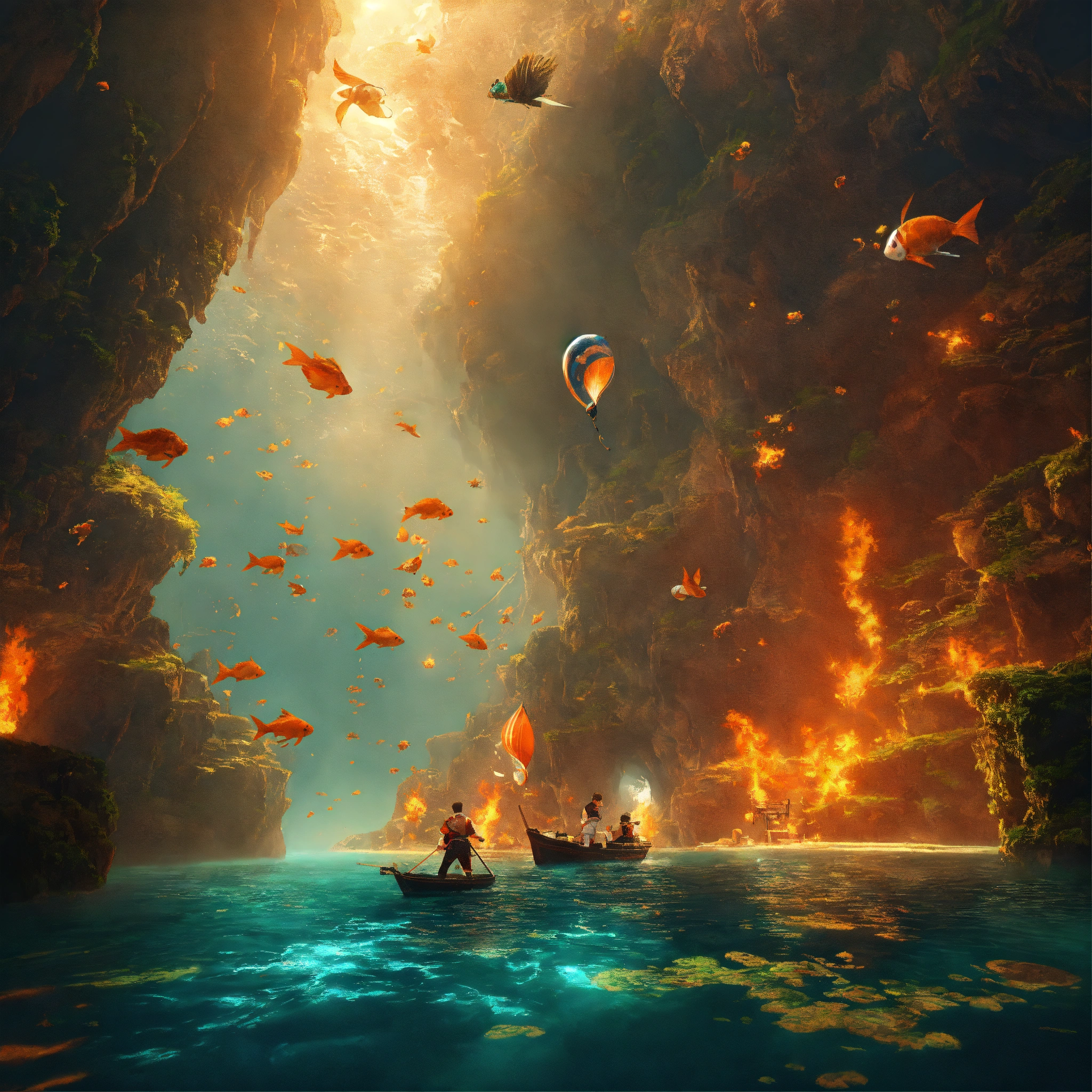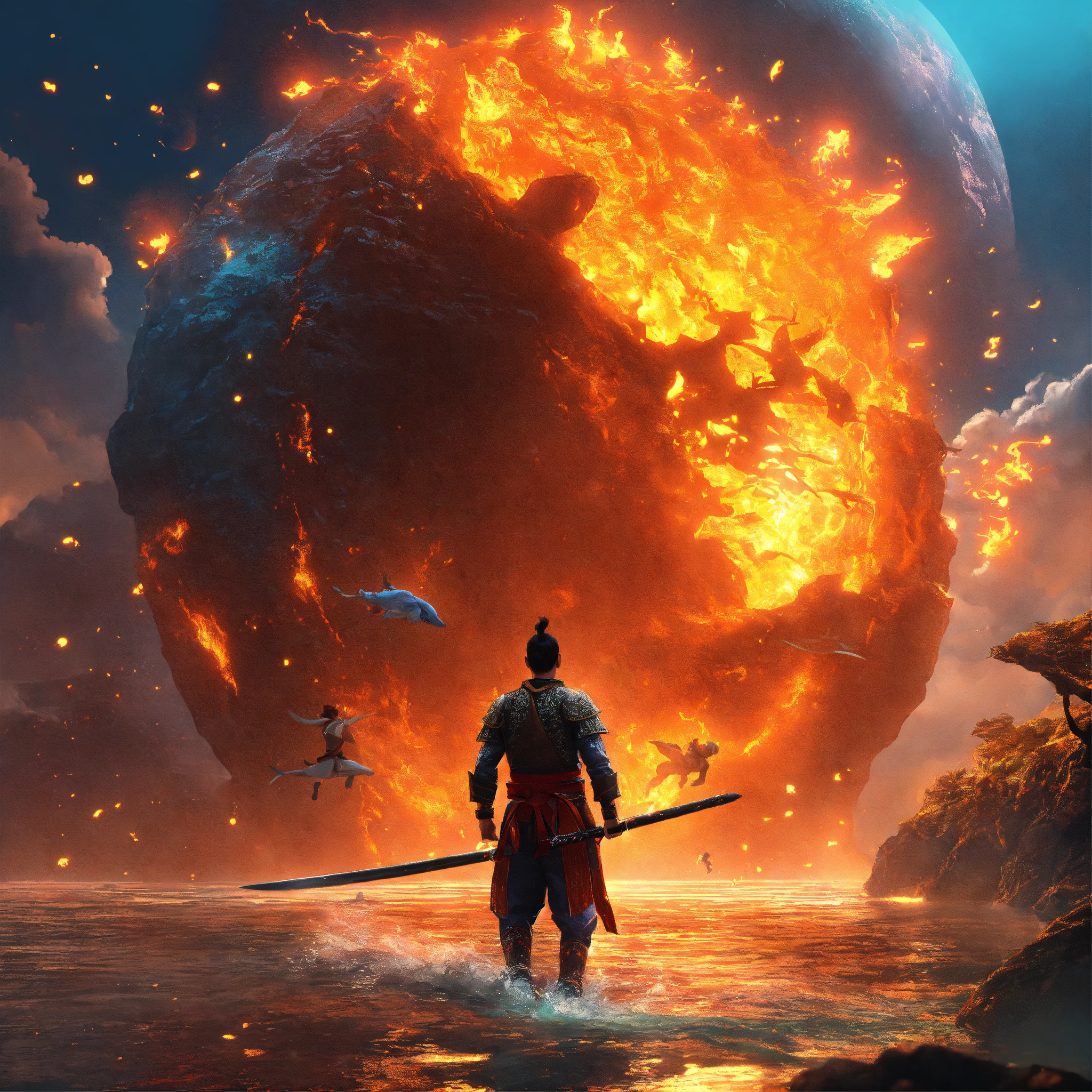 Dream-like animation, martial artists in sight, ready for war, 2moons, ships sailing with martial artists jumping in an underwater cavern., 35888, animal water fire 🔥