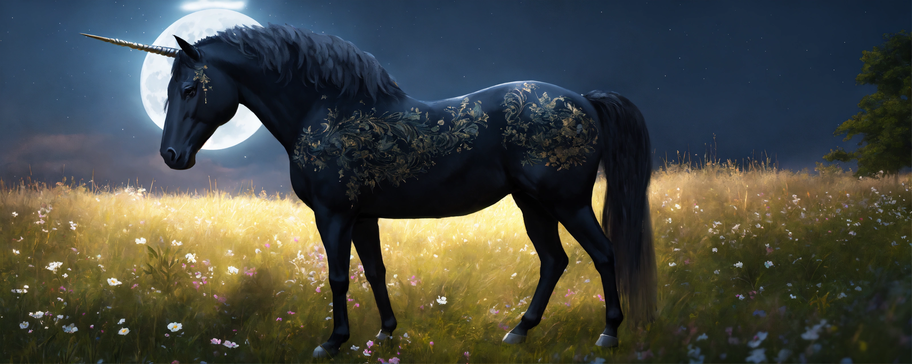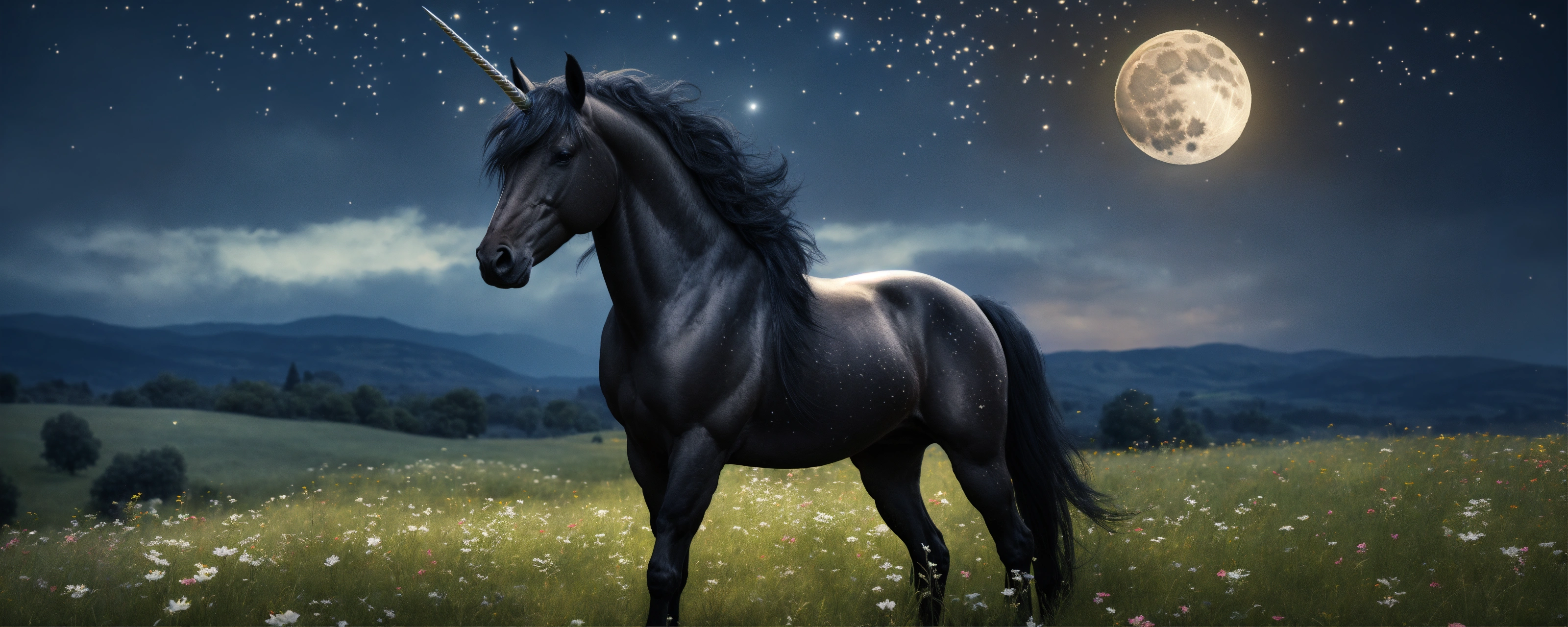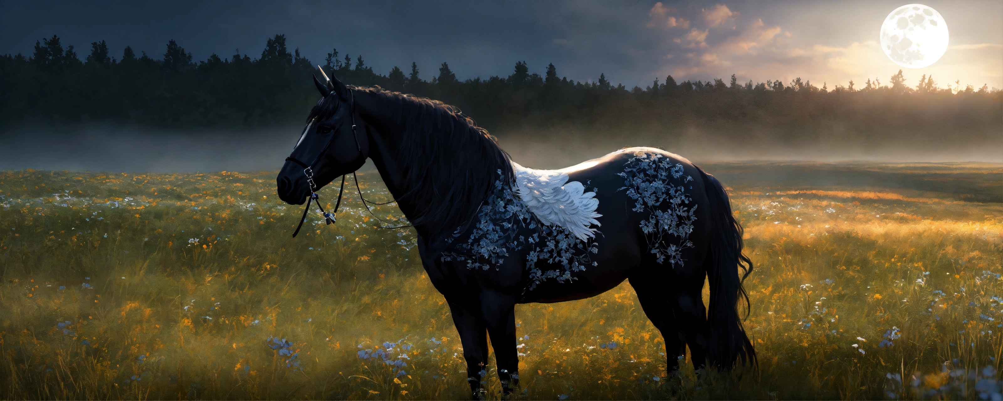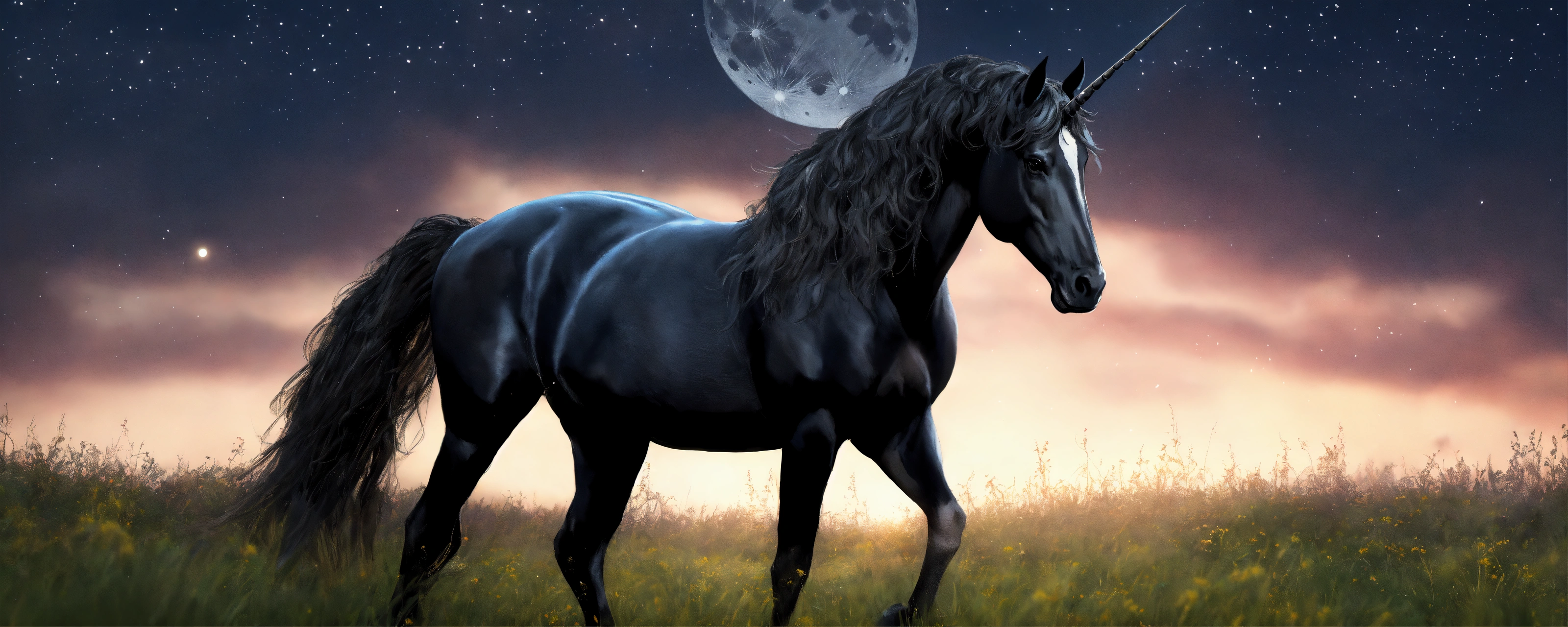 A black unicorn with white wings standing in a meadow, a moonlit sky, highly detailed, high quality, 8 k, soft lighting, realistic face, path traced, trending on artstation, sharp focus, studio photo, intricate details, highly detailed