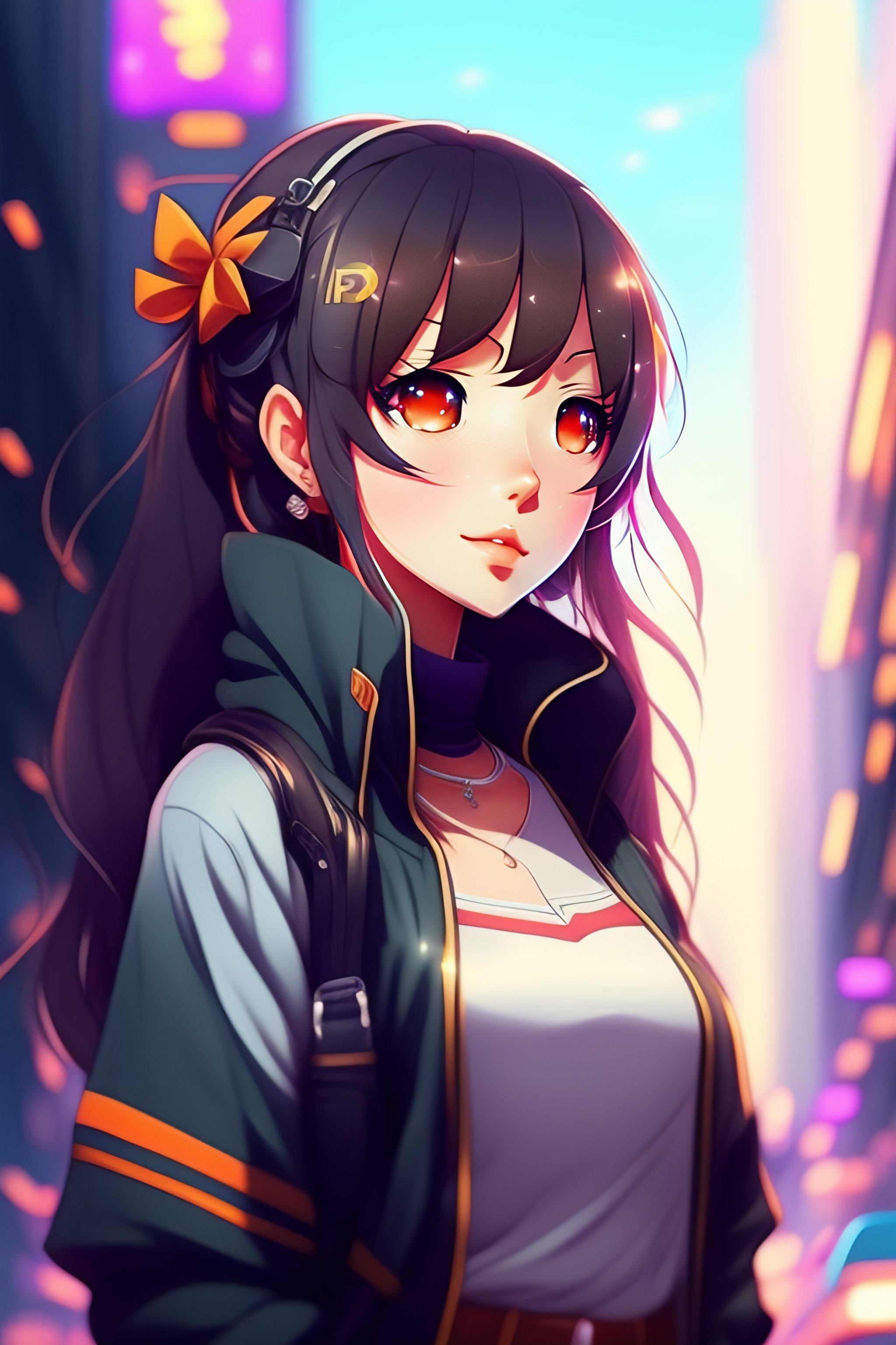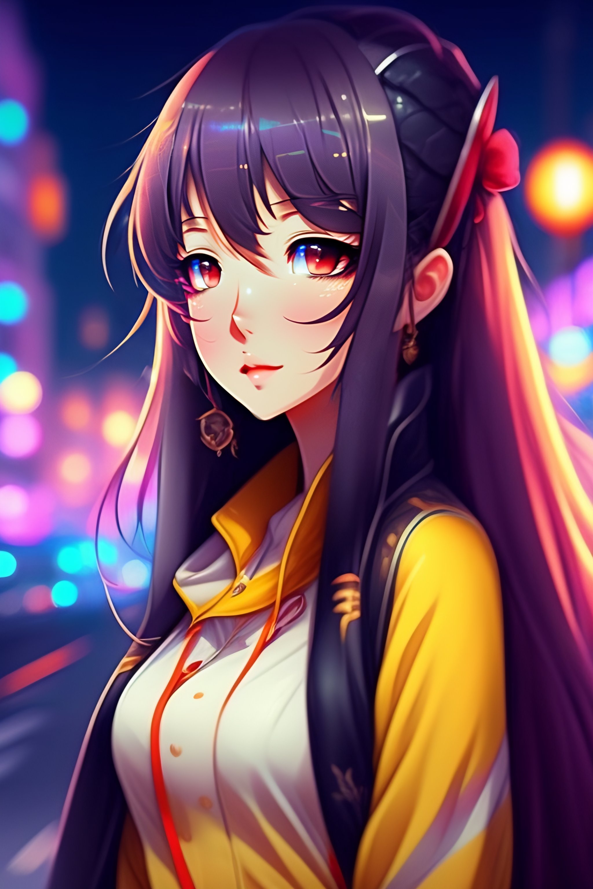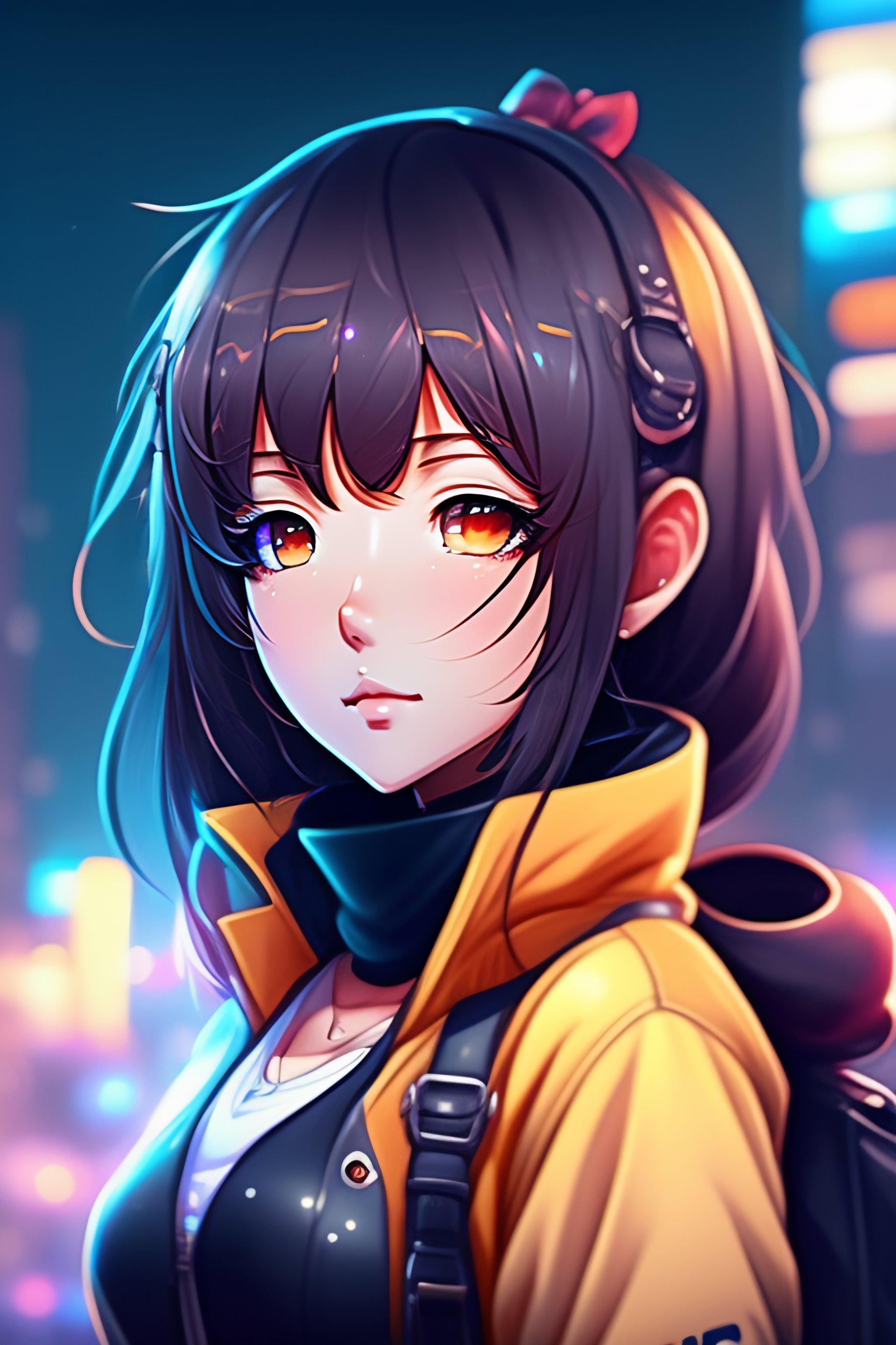 Portrait of cute anime girl, night city background illustration concept art, fanbox pixiv trends, artstation, kawaii pinterest