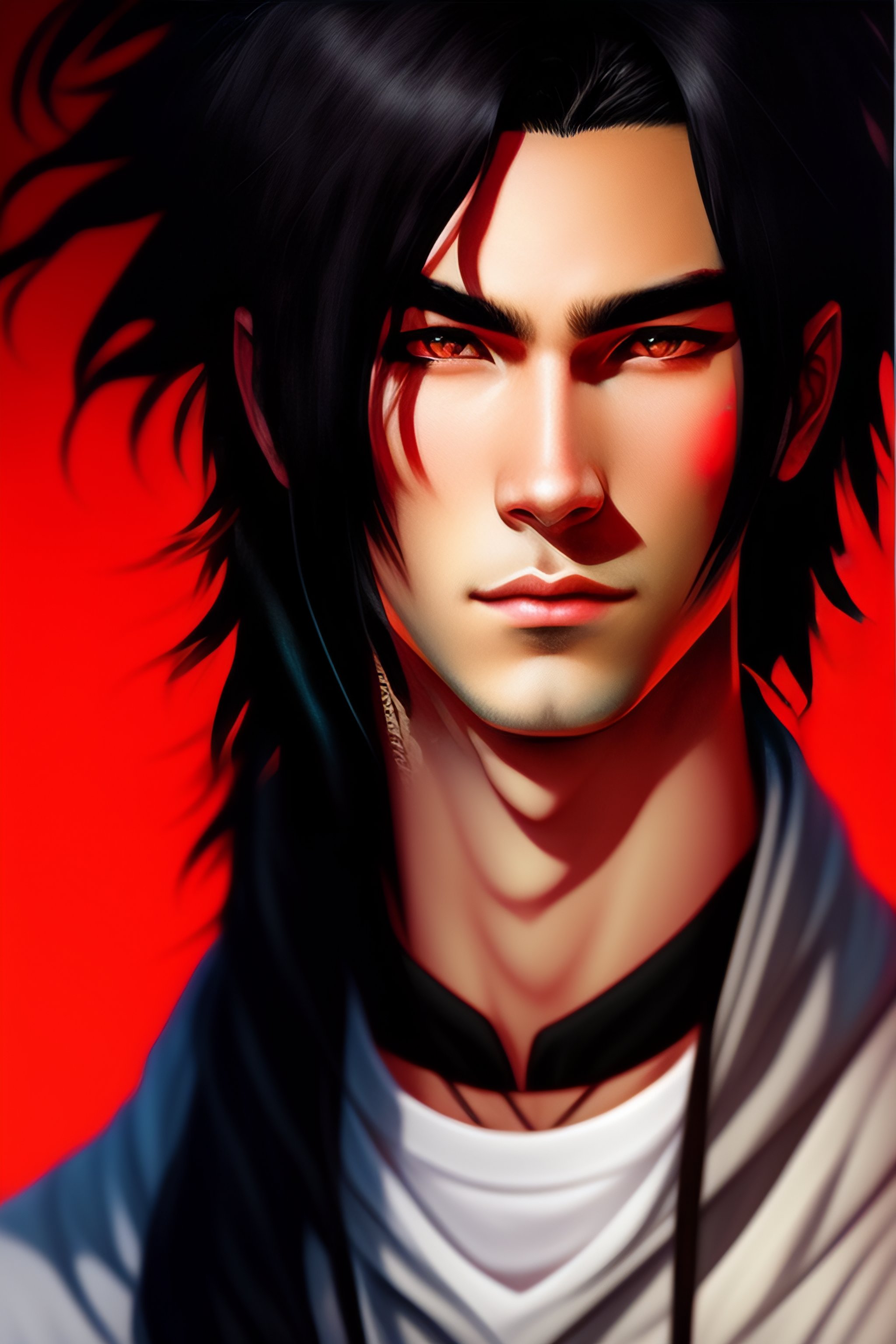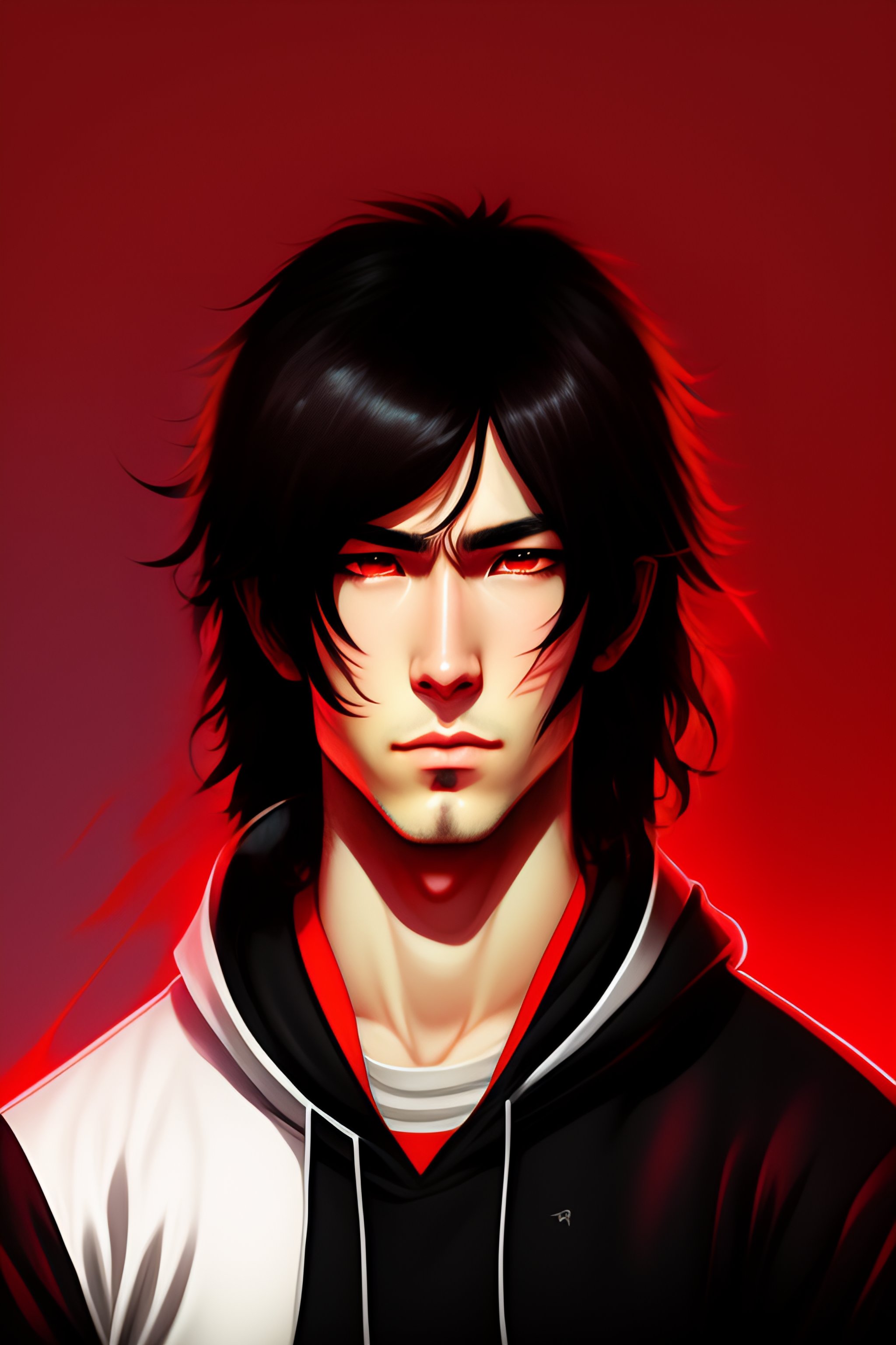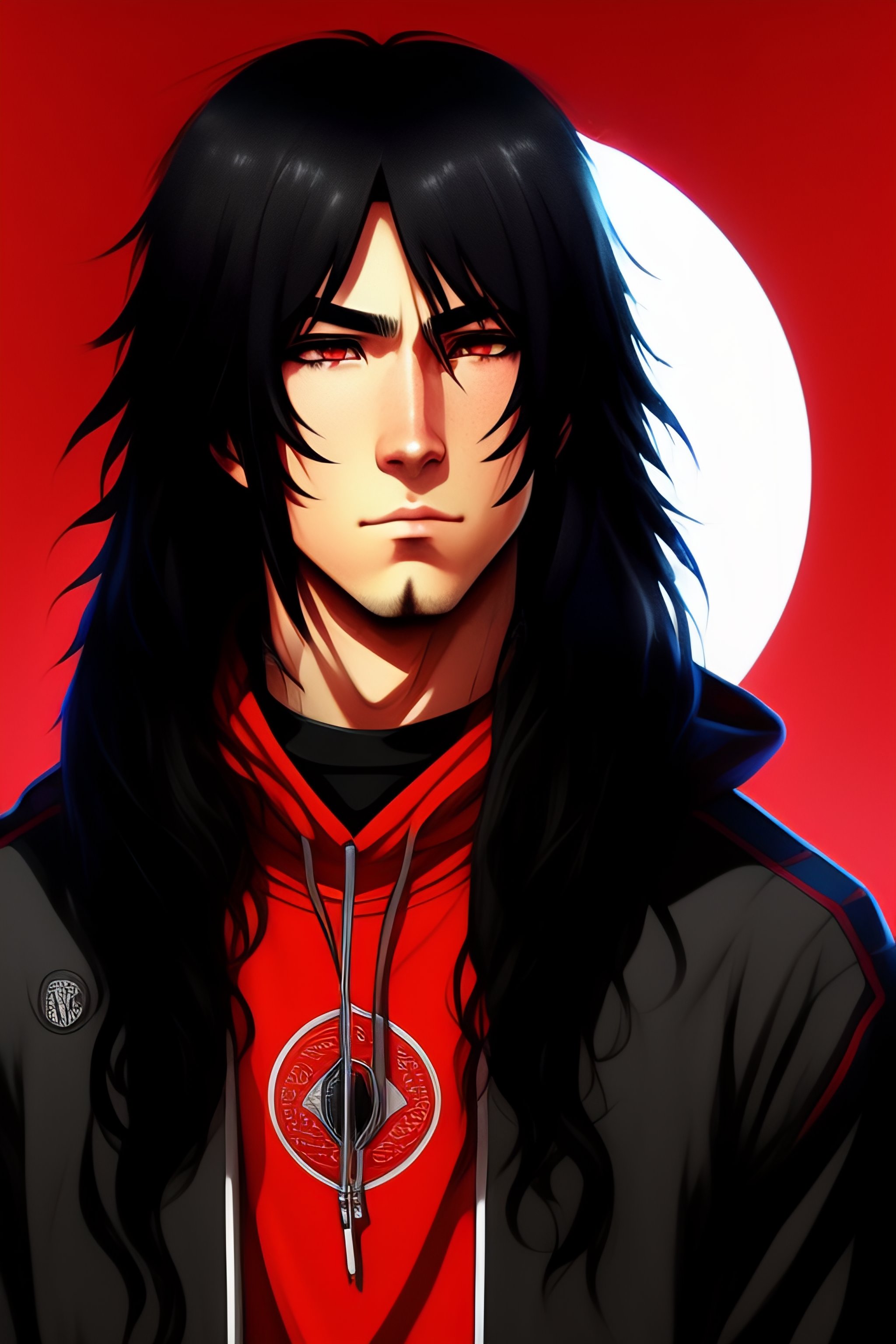 Anime young adult boy with really long black hair, red eyes and red tattoos under eyes, sad face, black hoodie, digital art