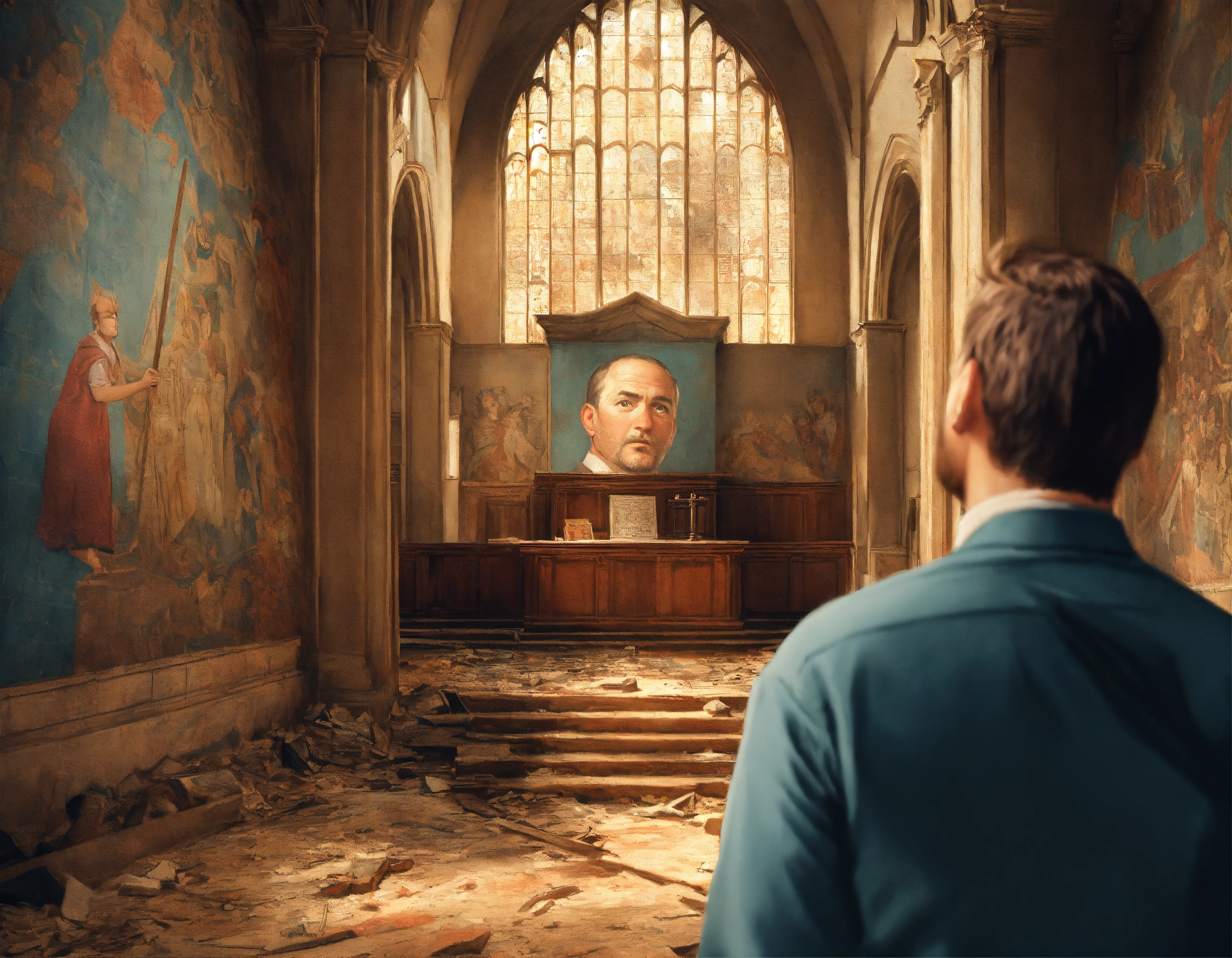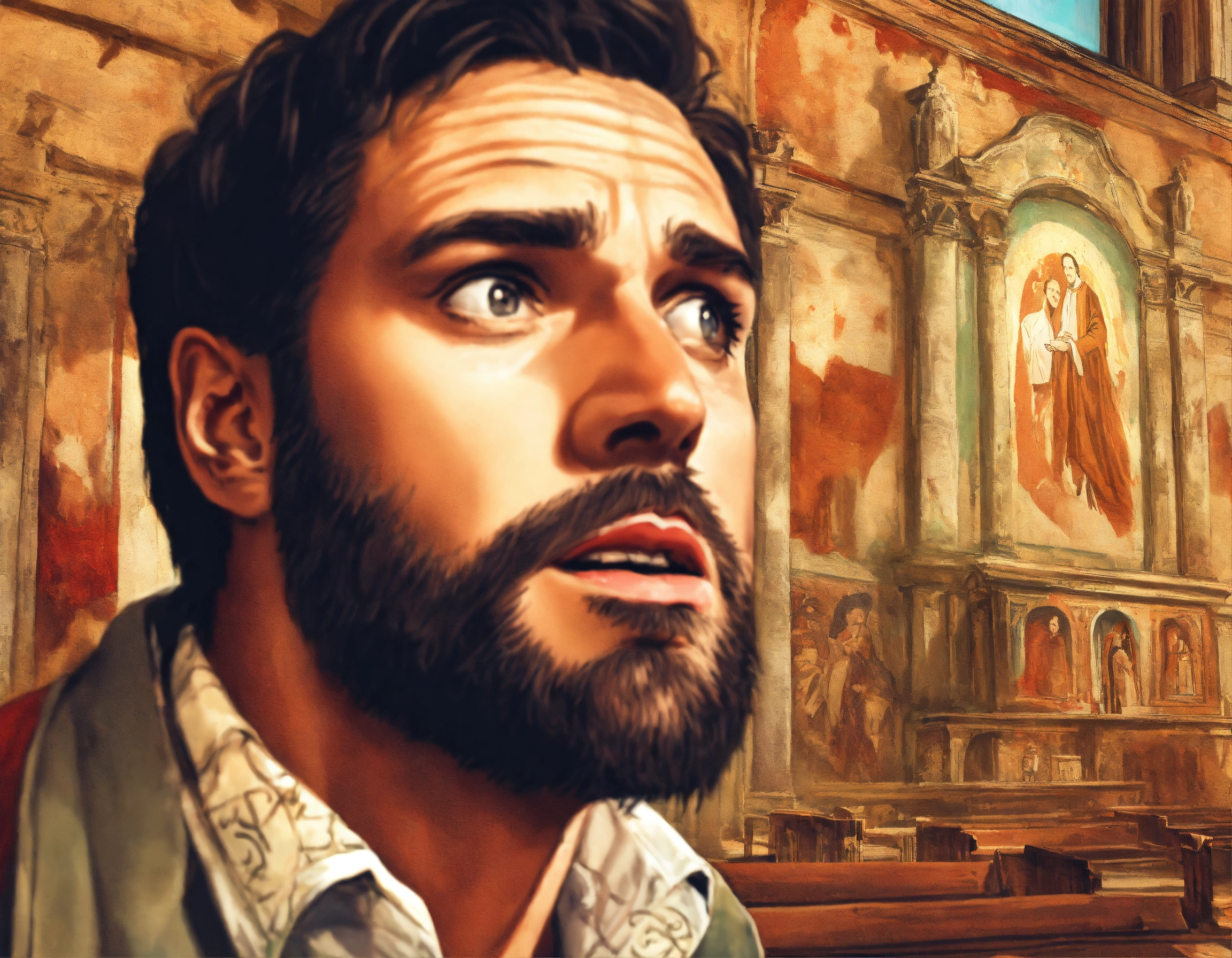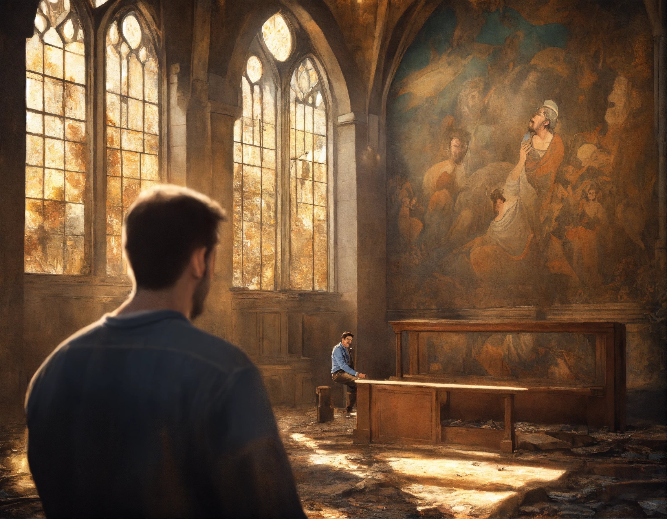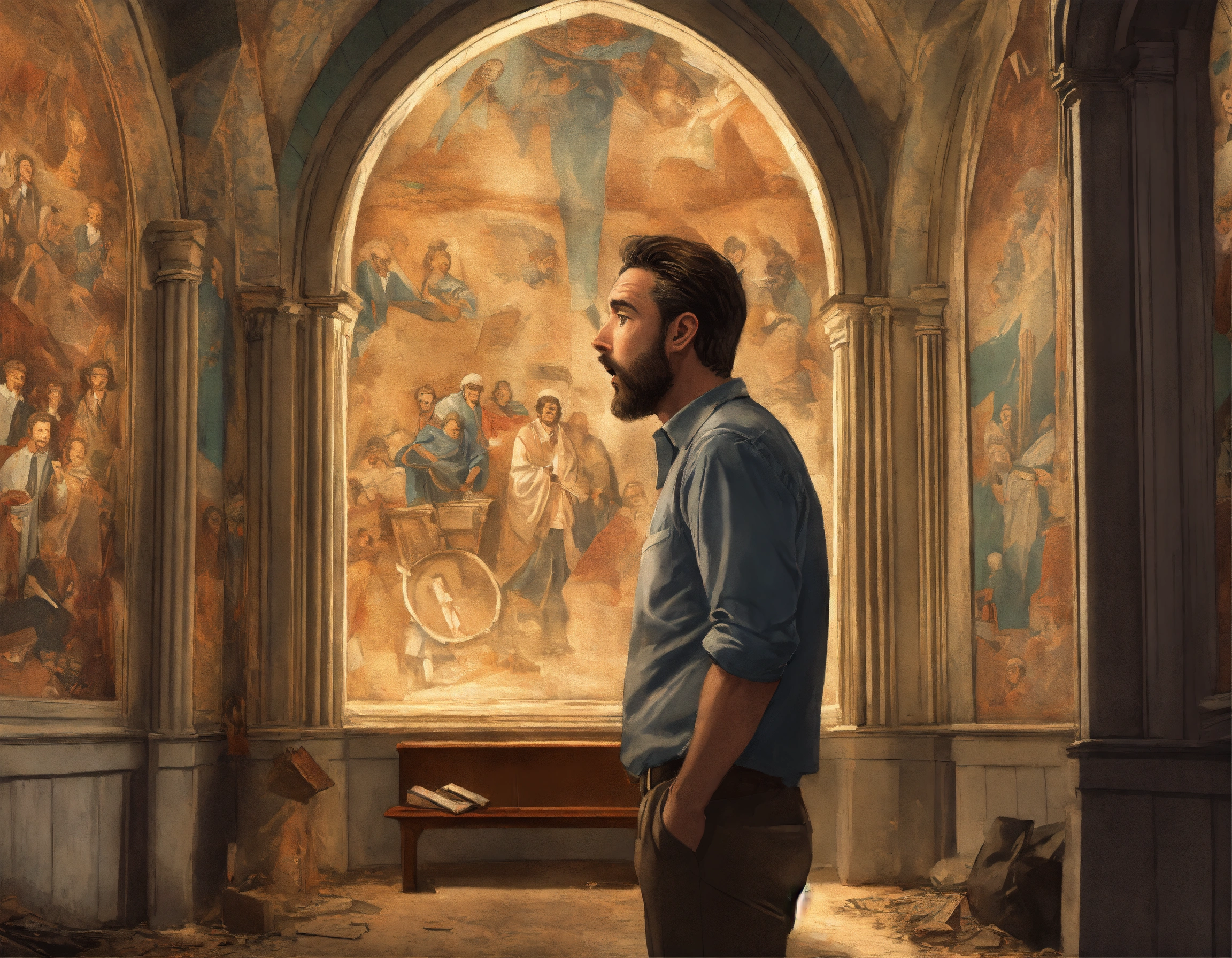 Illustration of an abandoned church where adult man discovering the ancient mural showing his face, and on more close up his surprised look.