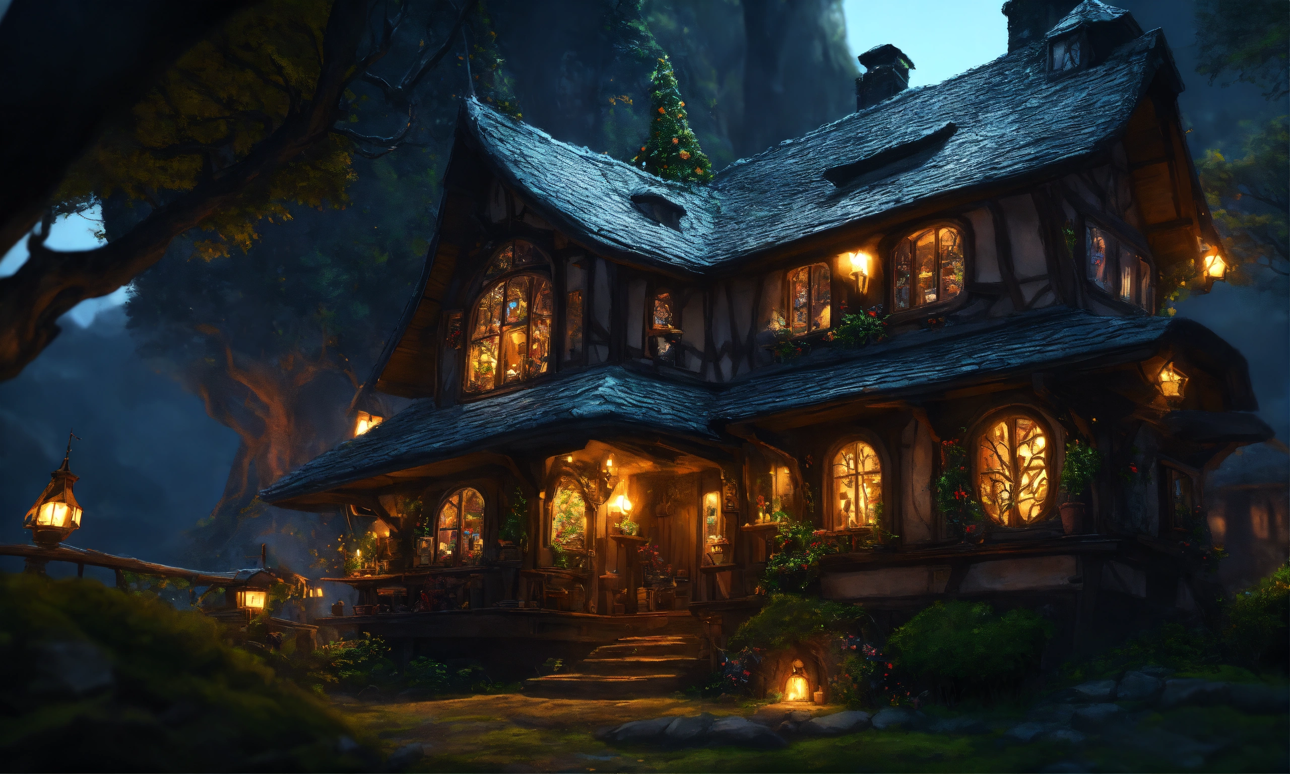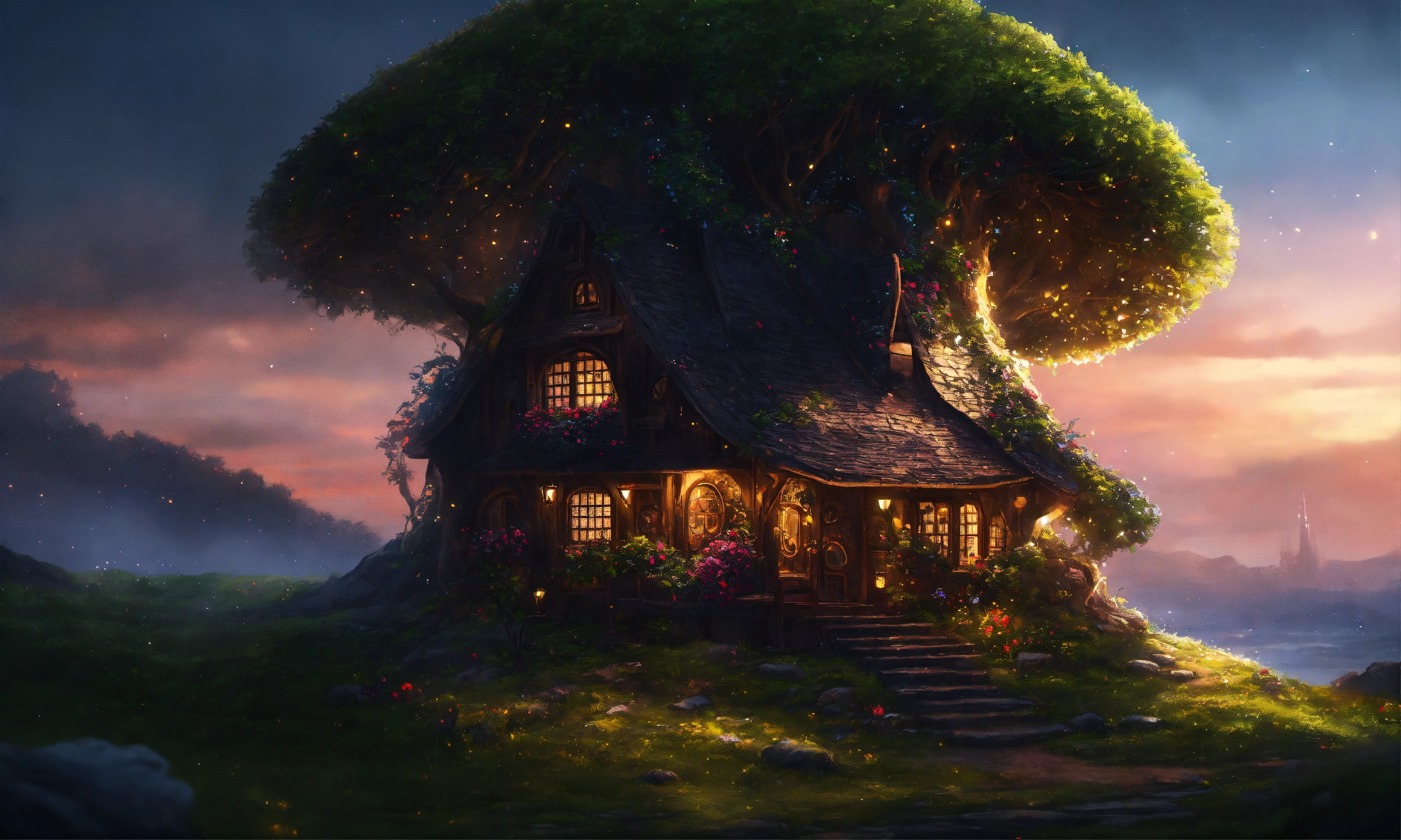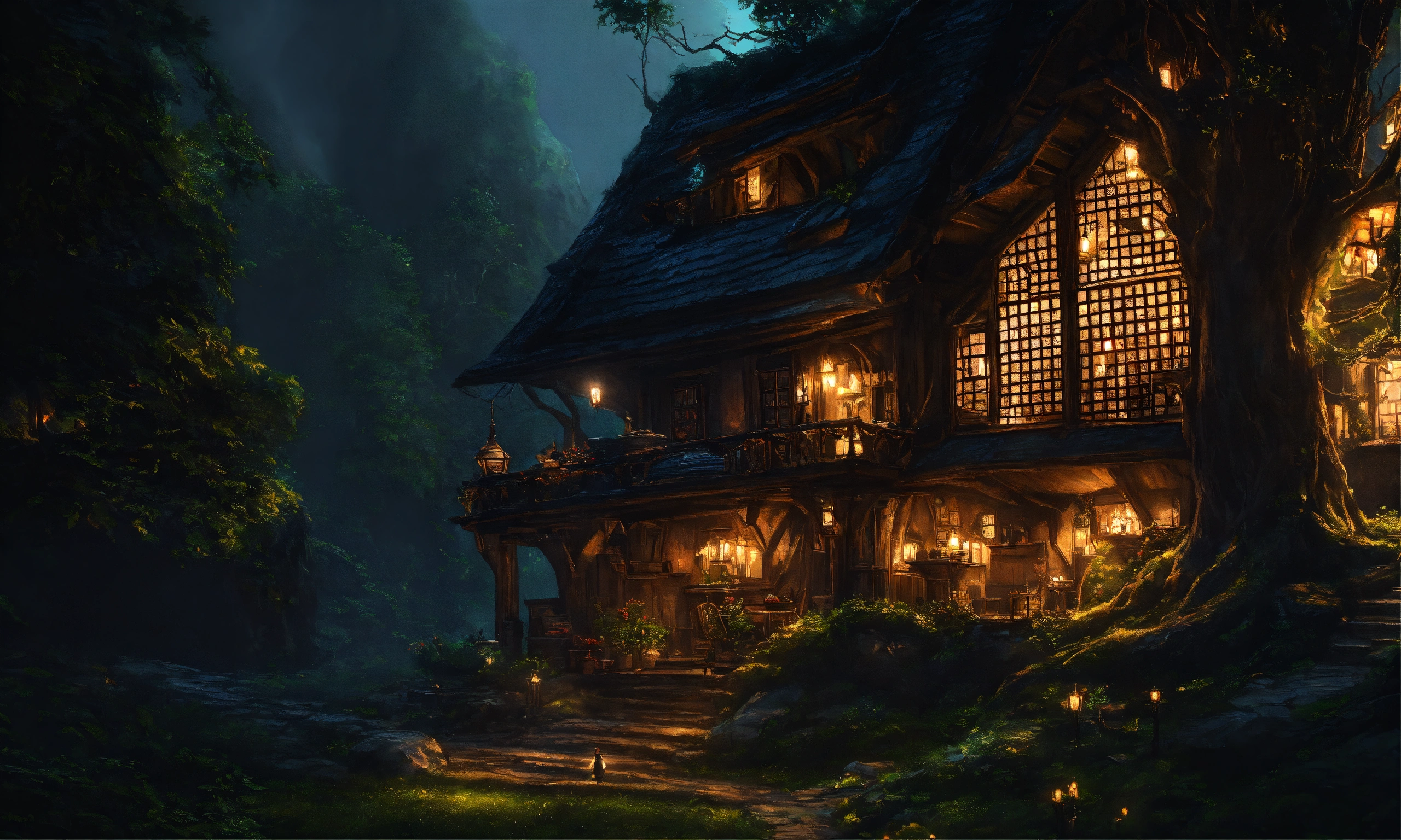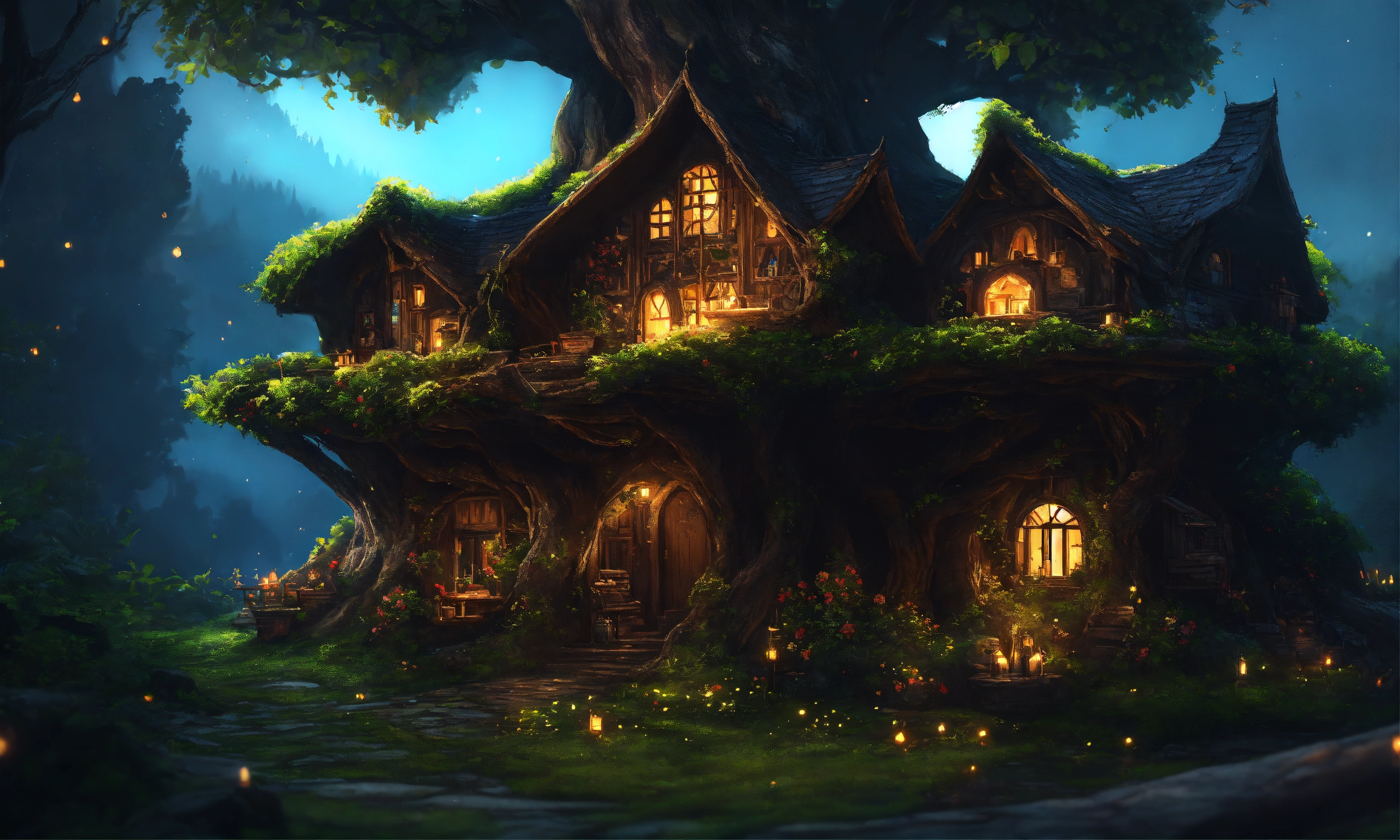 Epic beautiful shot of a ultra detailed ultra cozy house of elves in a tree on the right side of the shot, luminous, black or dark background, digital painting, little photorealistic, sharp focus, ultra cozy and inviting, wish to be there. very detailed, arty, should rank high on youtube for a dream trip.