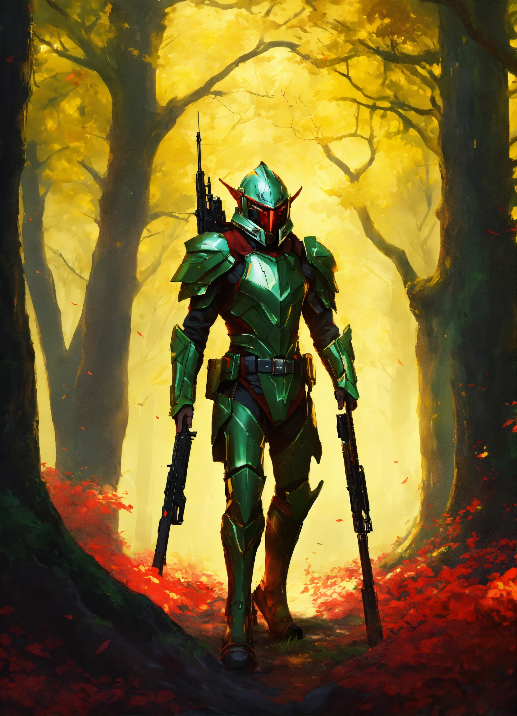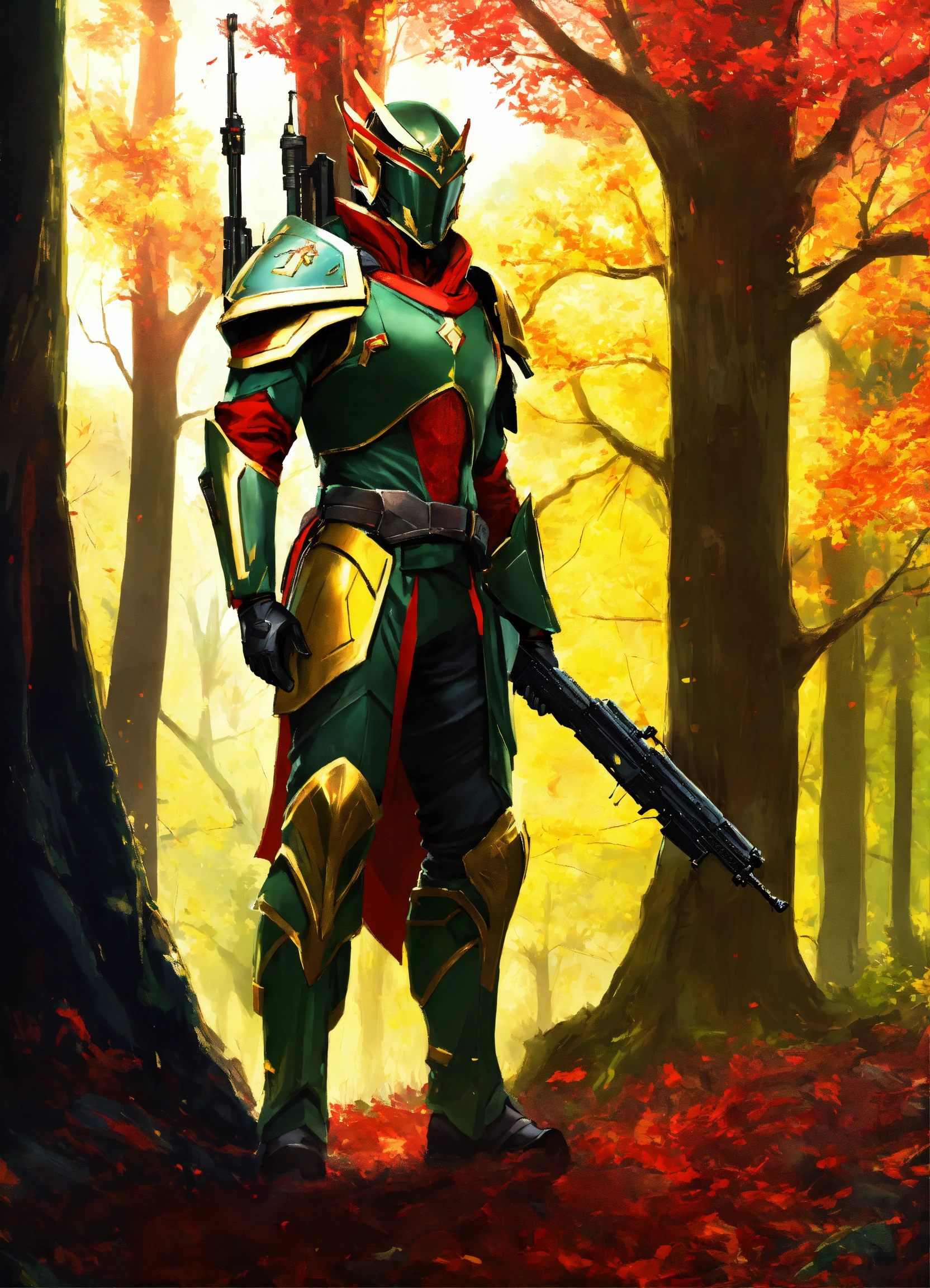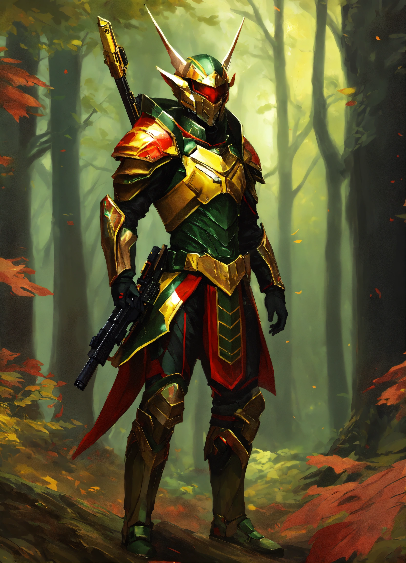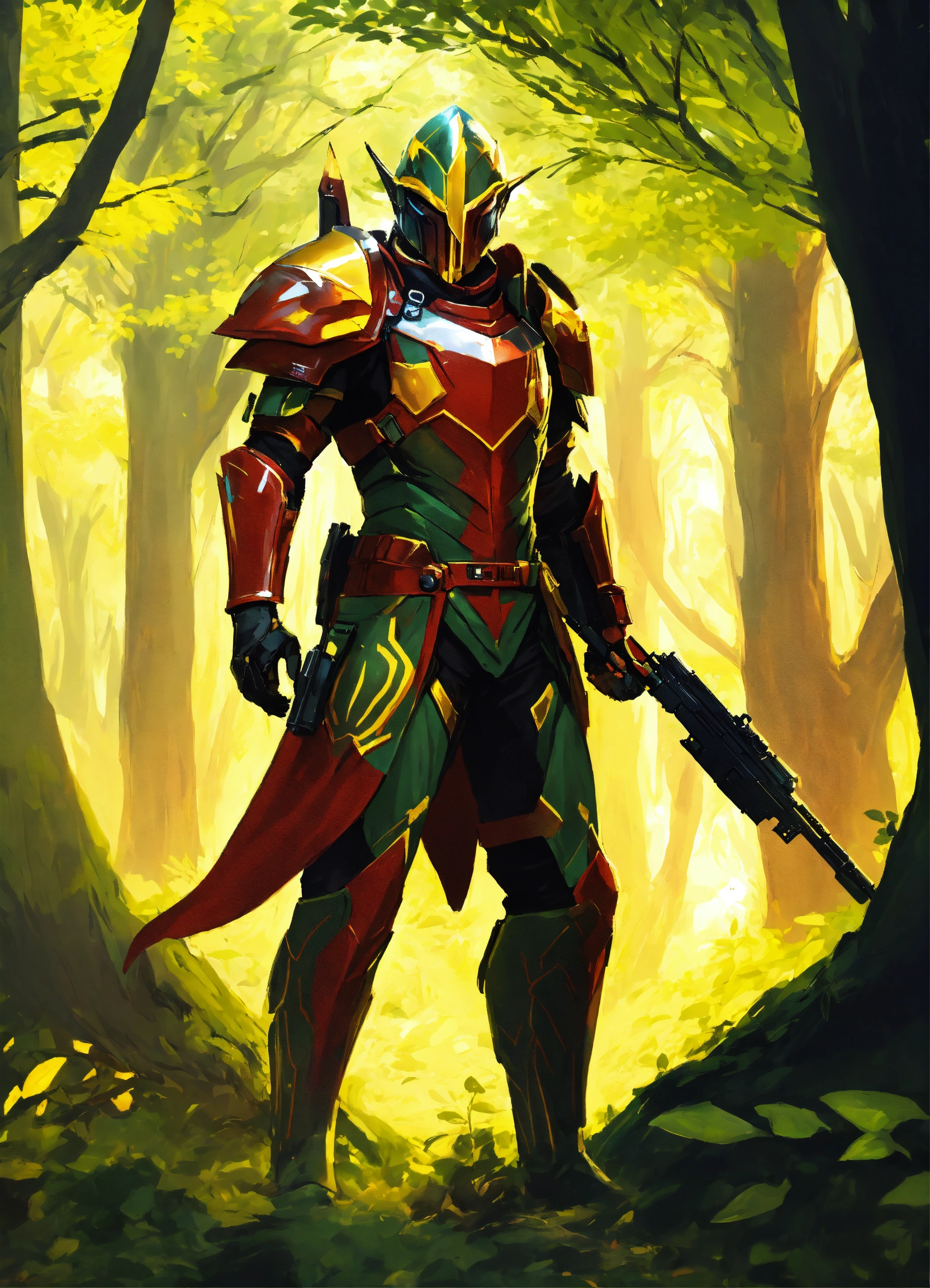 High elf sci fi soldier wearing sleek sci fi armor, dark green and red and yellow armor, male, holding an assault rifle, full body, standing in an oak forest, hd