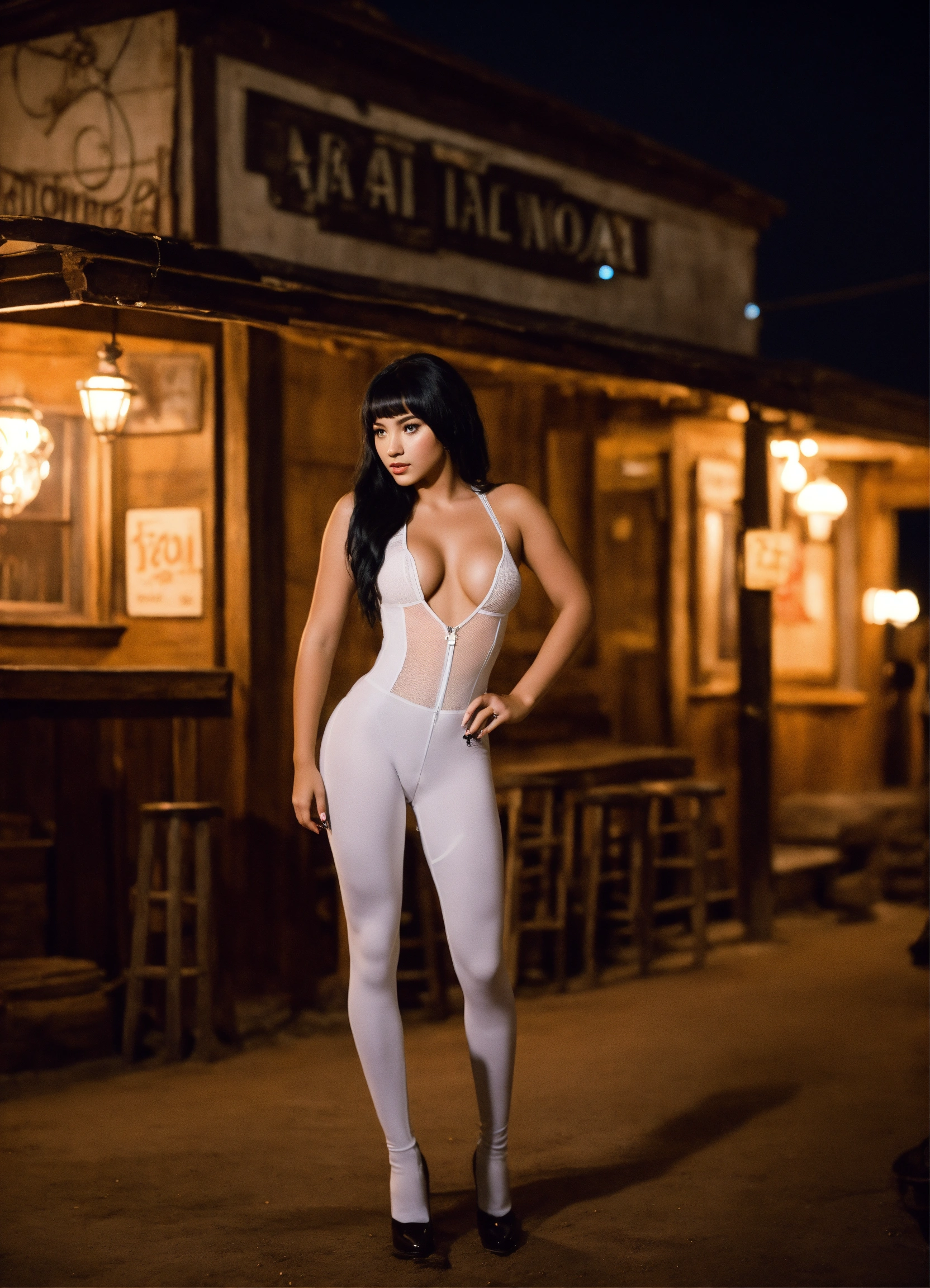 A real photo of a hot 19 year old girl with black hair, looks like an wanda. she is wearing a very tight white catsuit with a fishnet. she stands at night in an old saloon in an old western town.