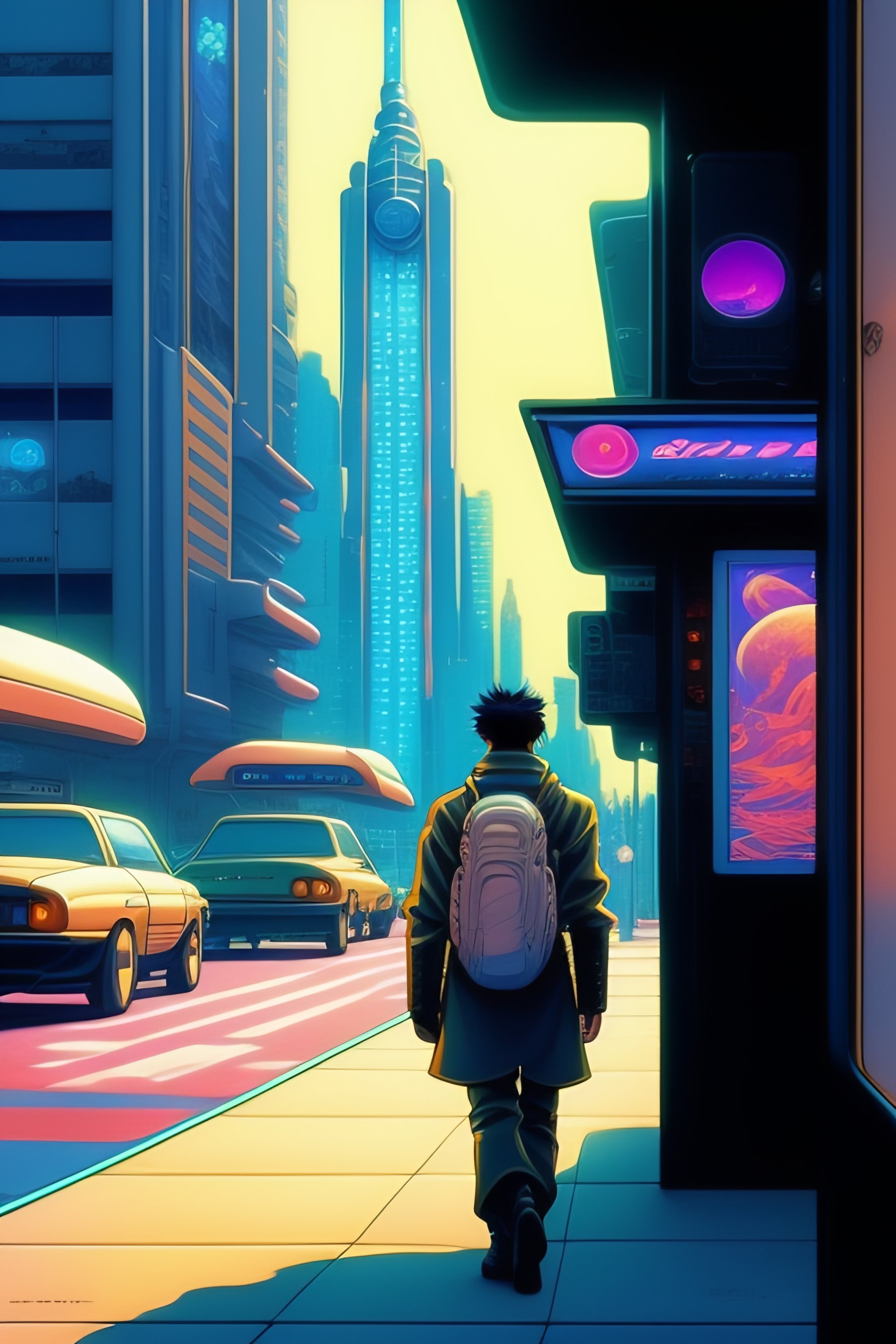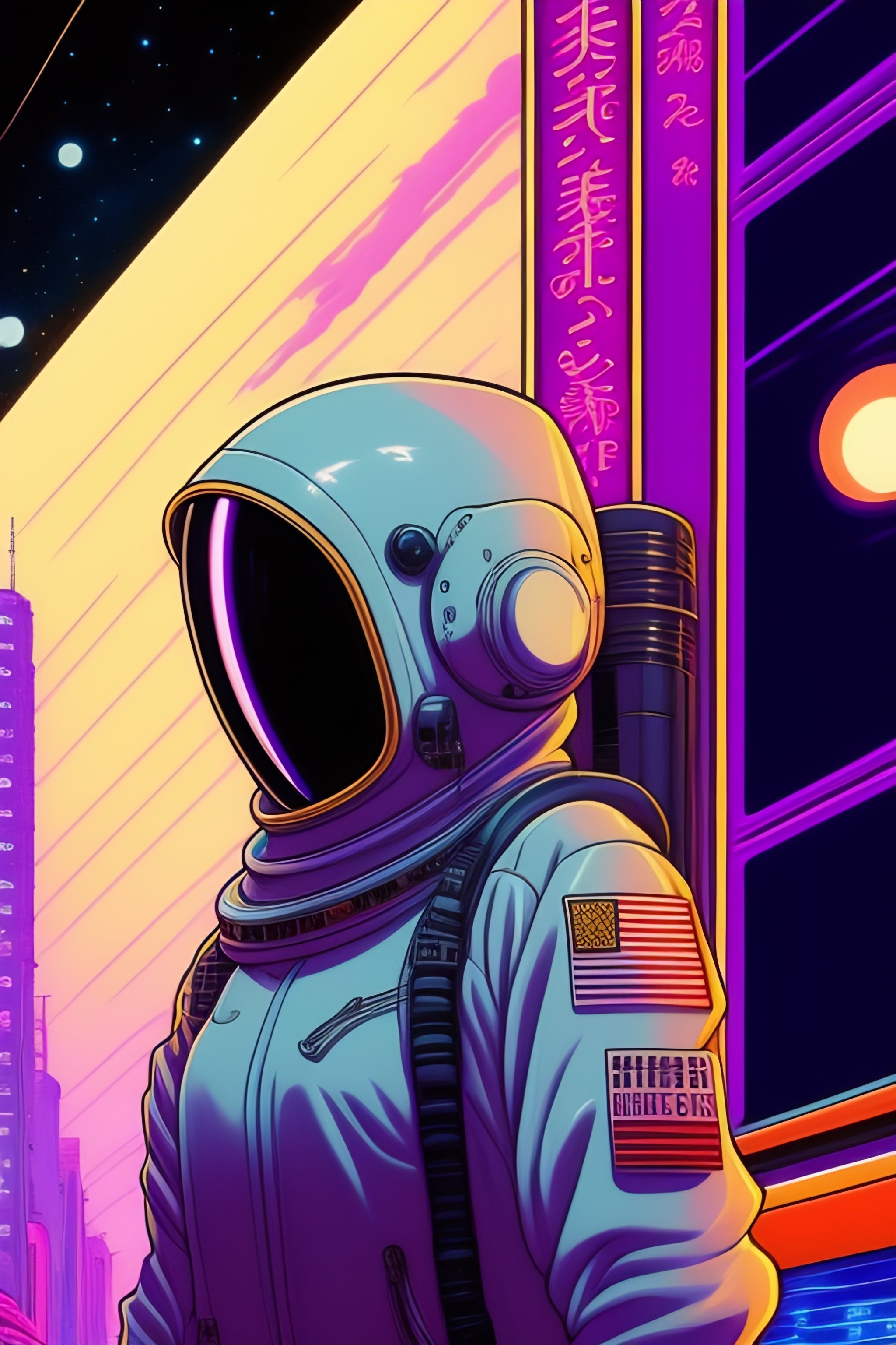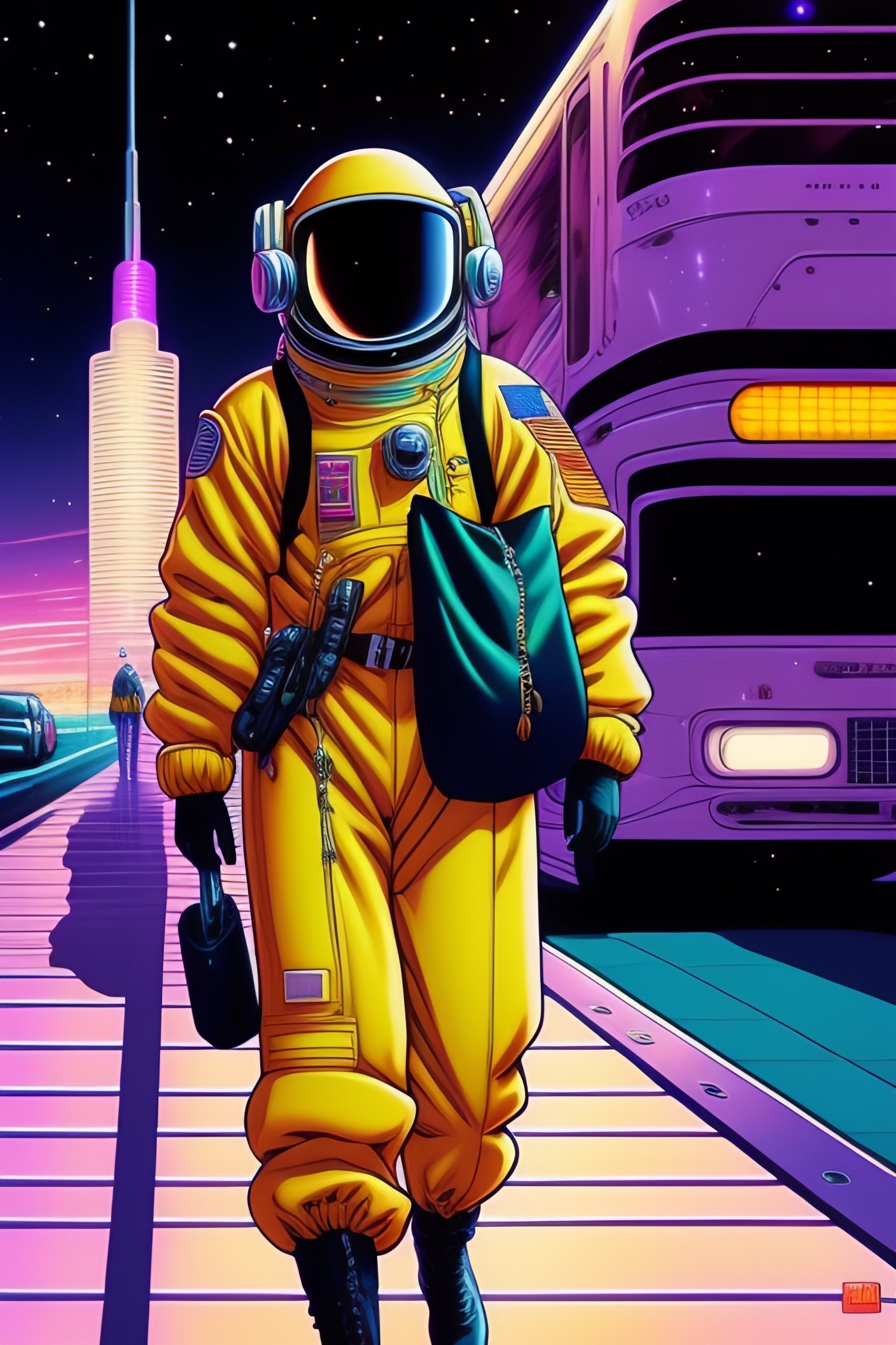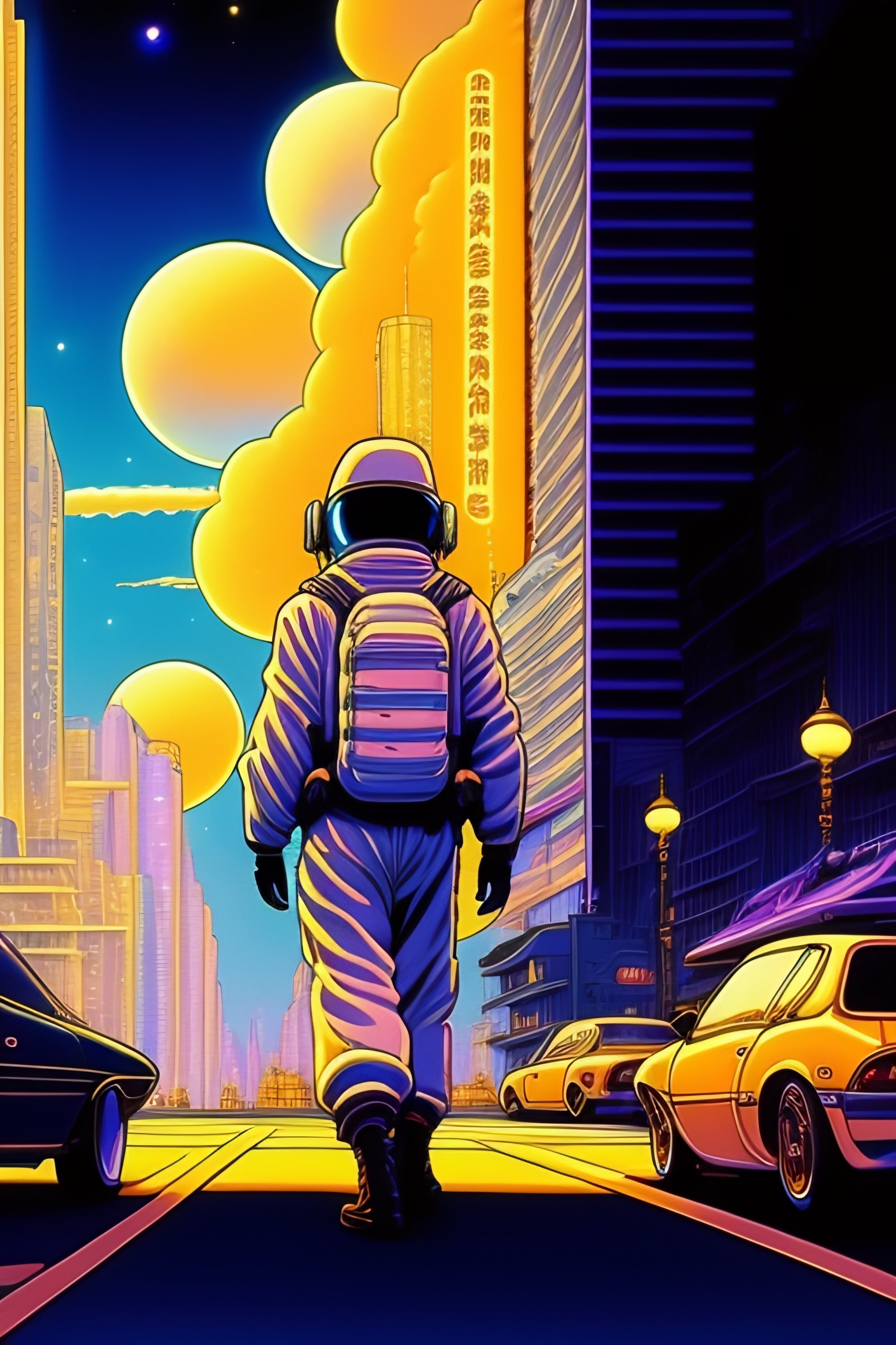 Vintage 90's anime style. a lonely astronaut walking down the street; by hajime sorayama, greg tocchini, virgil finlay, sci-fi. line art. environmental arcade art.