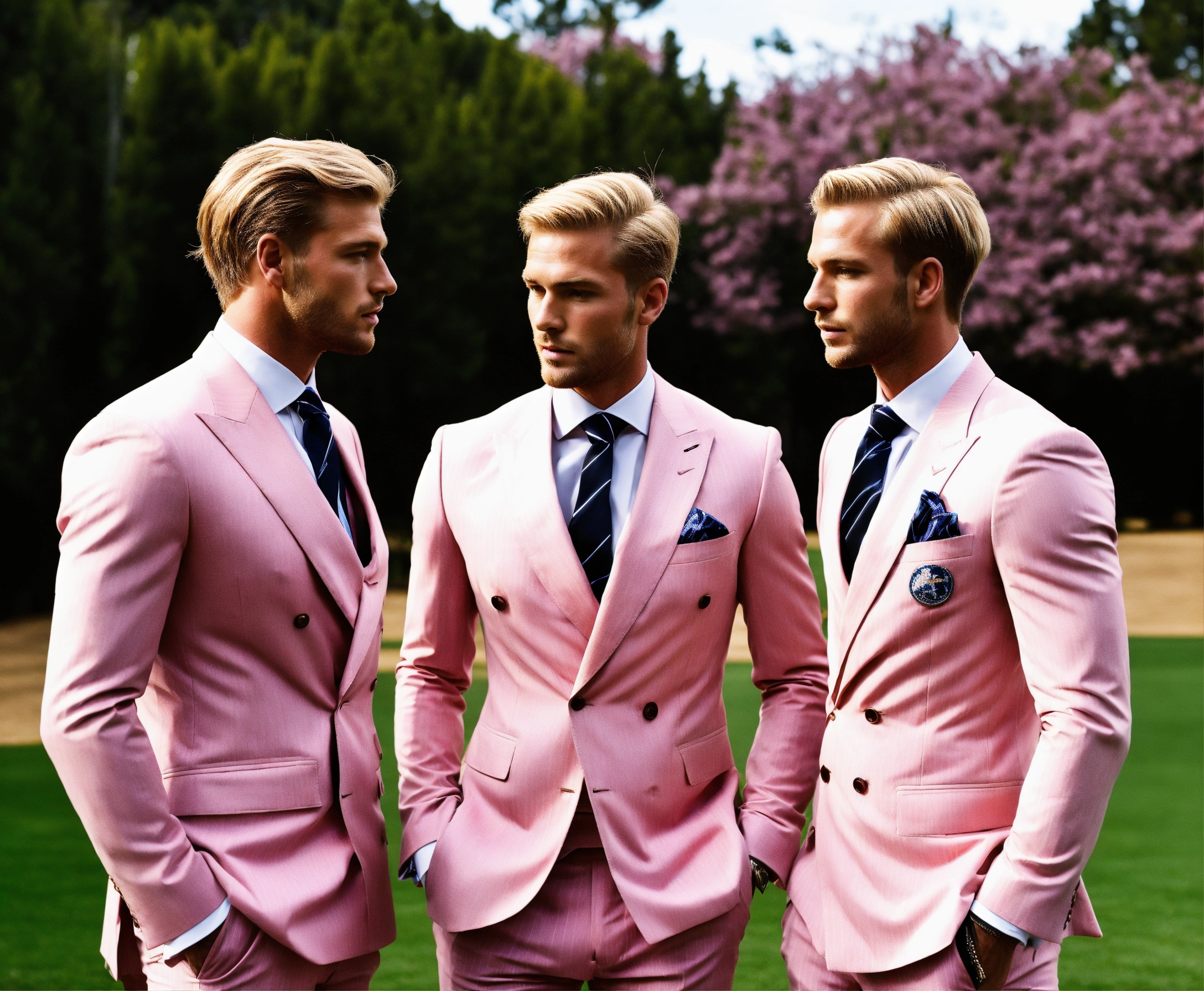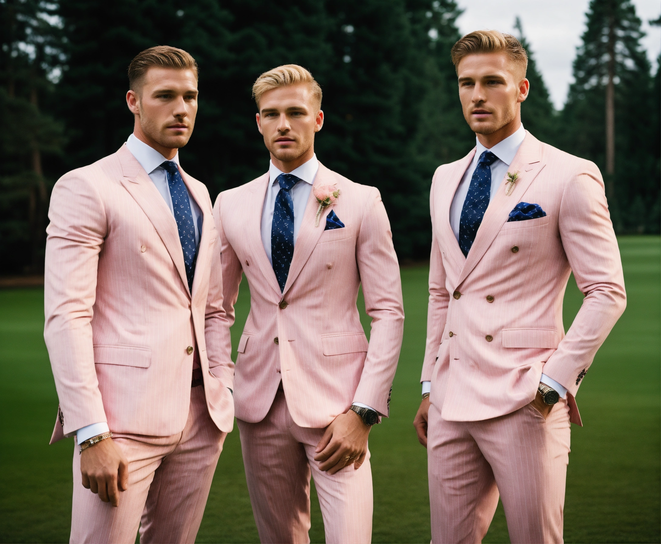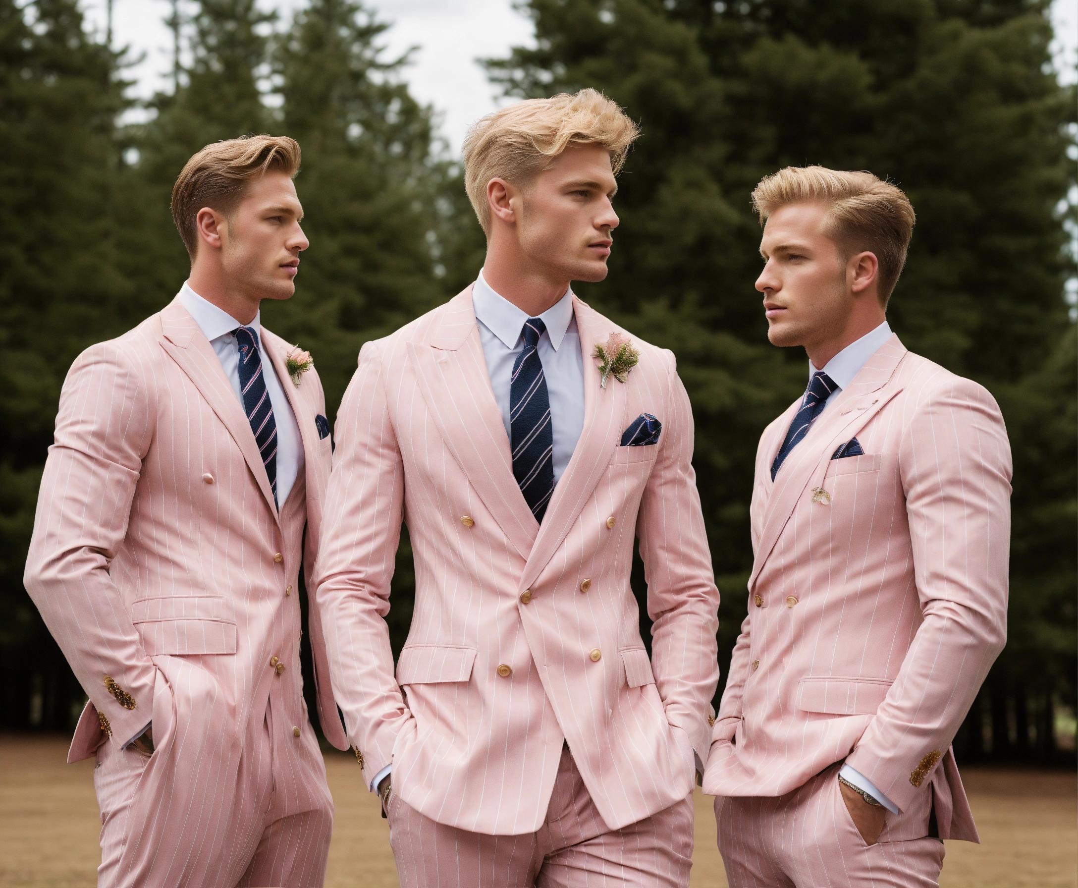Three blonde male sportsmen in pale pink pinstripe double breasted suit and club striped tie, meeting in a pine park