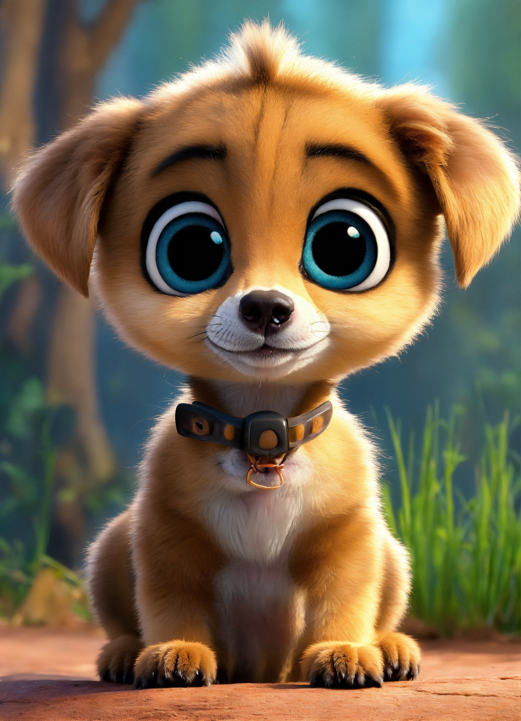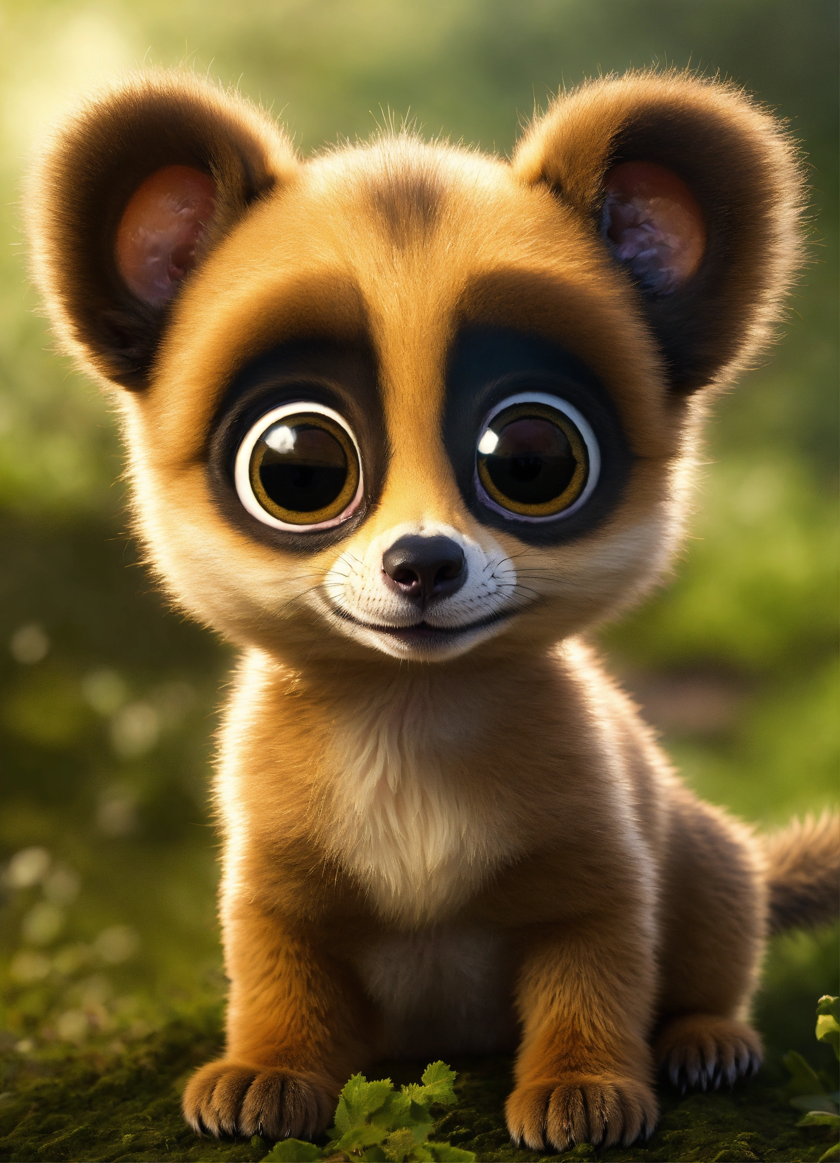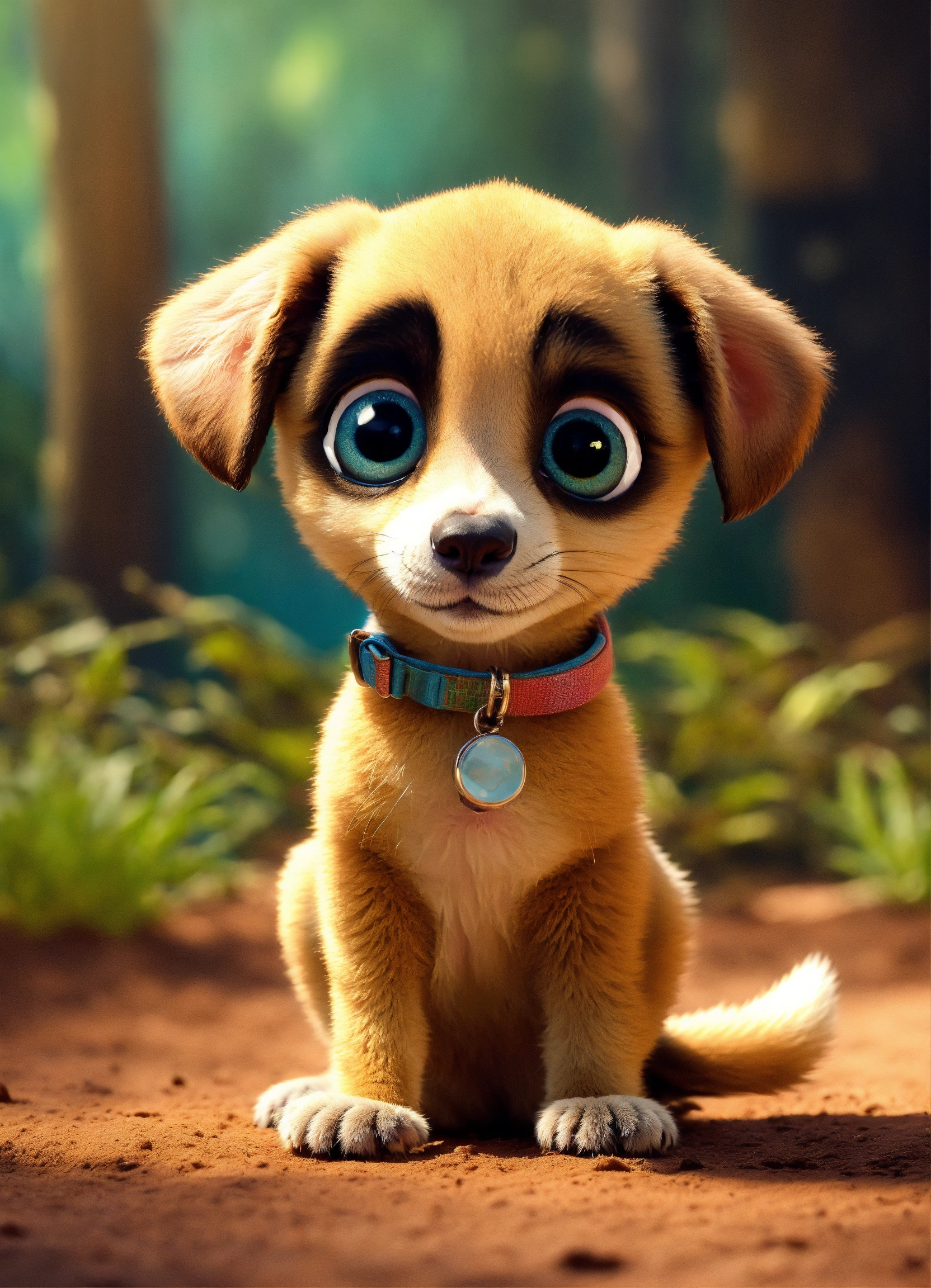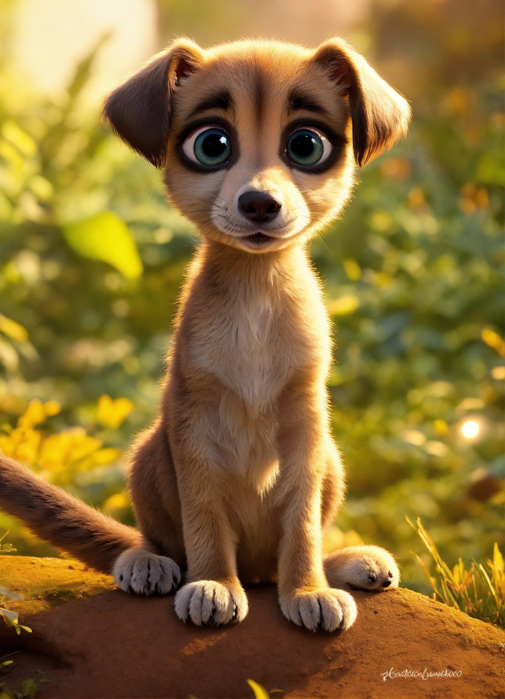 Diminuto adorable suricata cub puppy, big eyes cartoon puppy, dulce cara puppy, fondo selva desenfocado, cuerpo de suricata puppy completo, miniatura, centrado, luces de cine, by pixar, postura suricata cub, sombras suaves, rasgos dulces, ojos grandes puppy adorables, rasgos infantiles, pelo suave terciopelo, fantasia