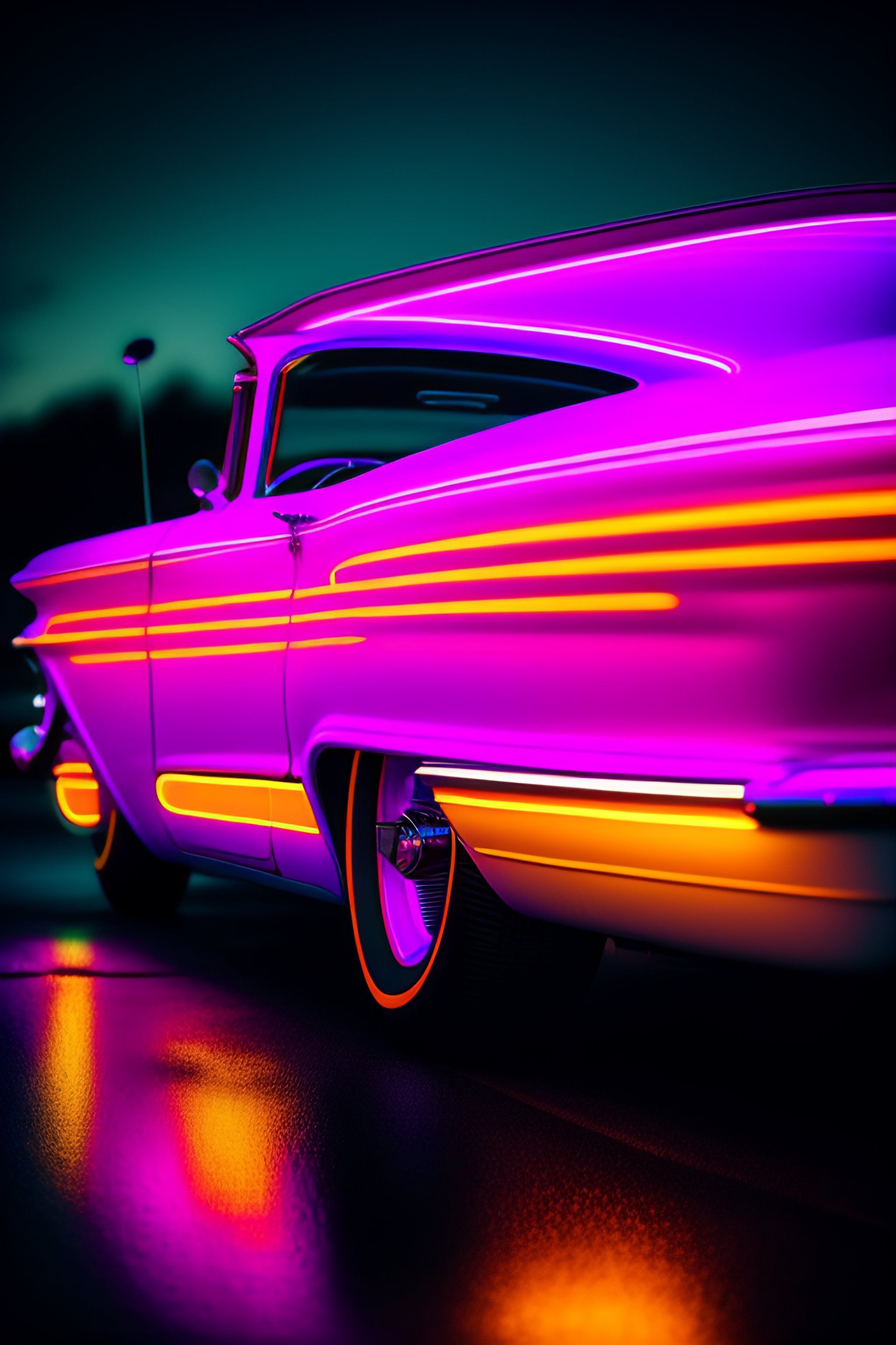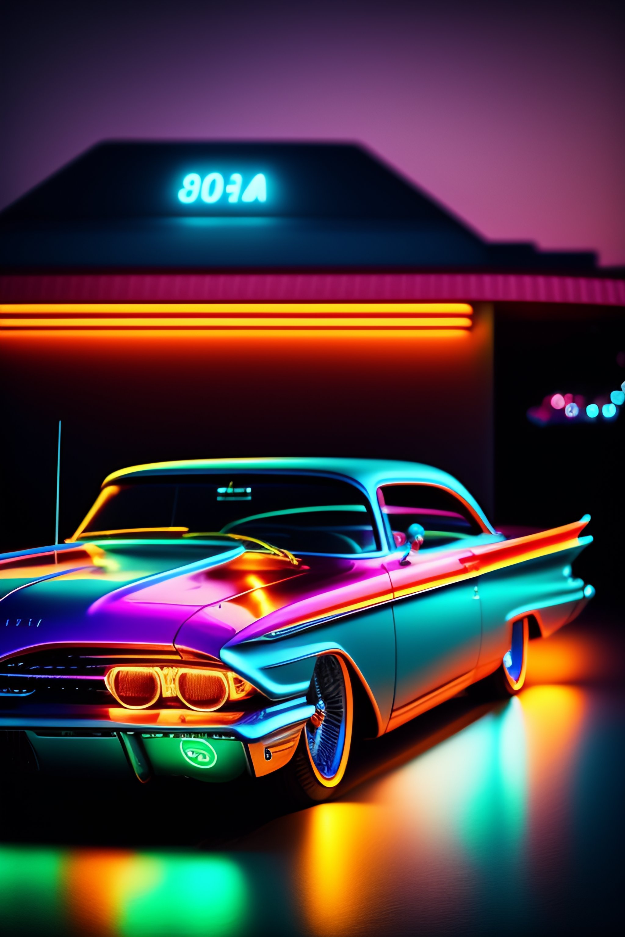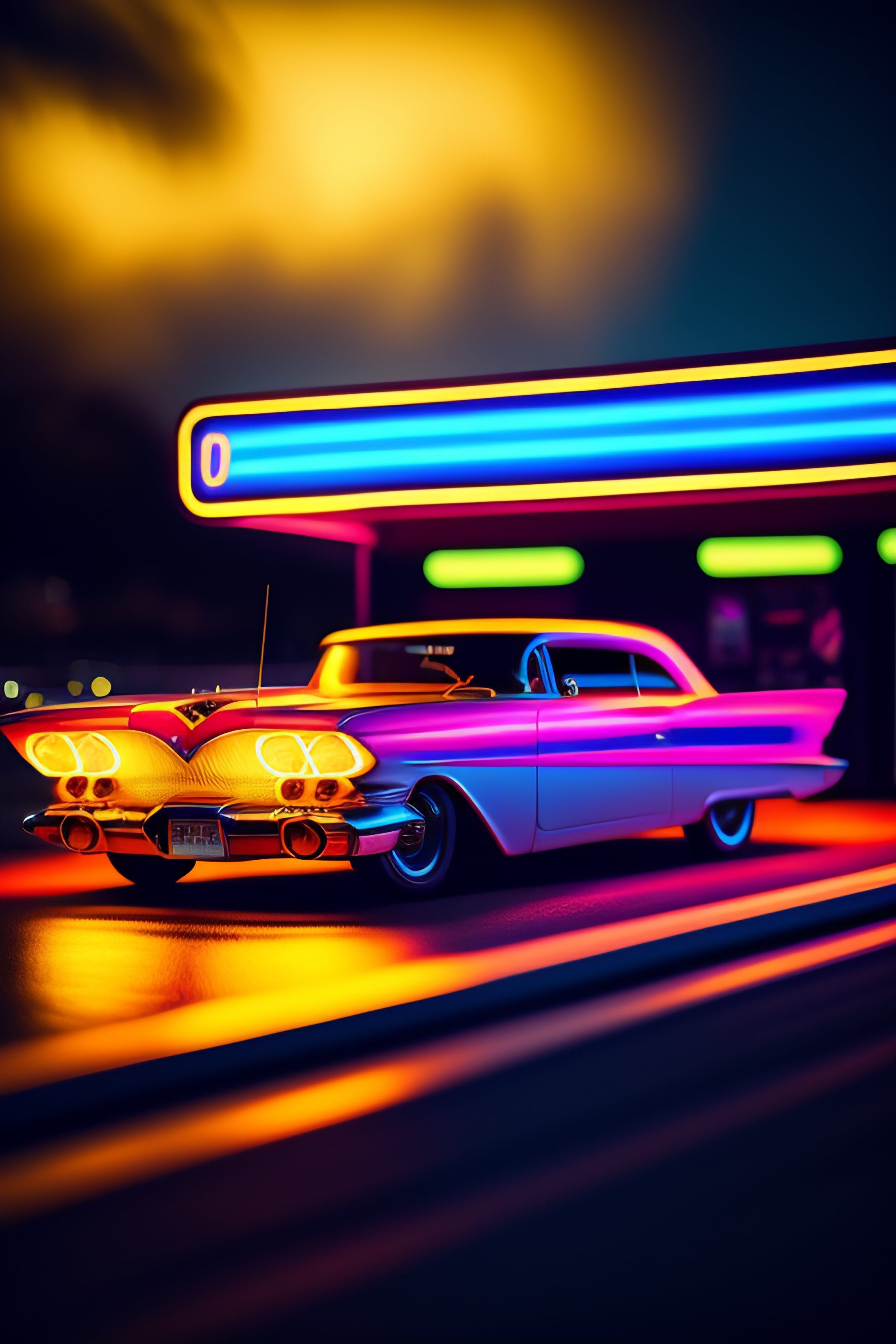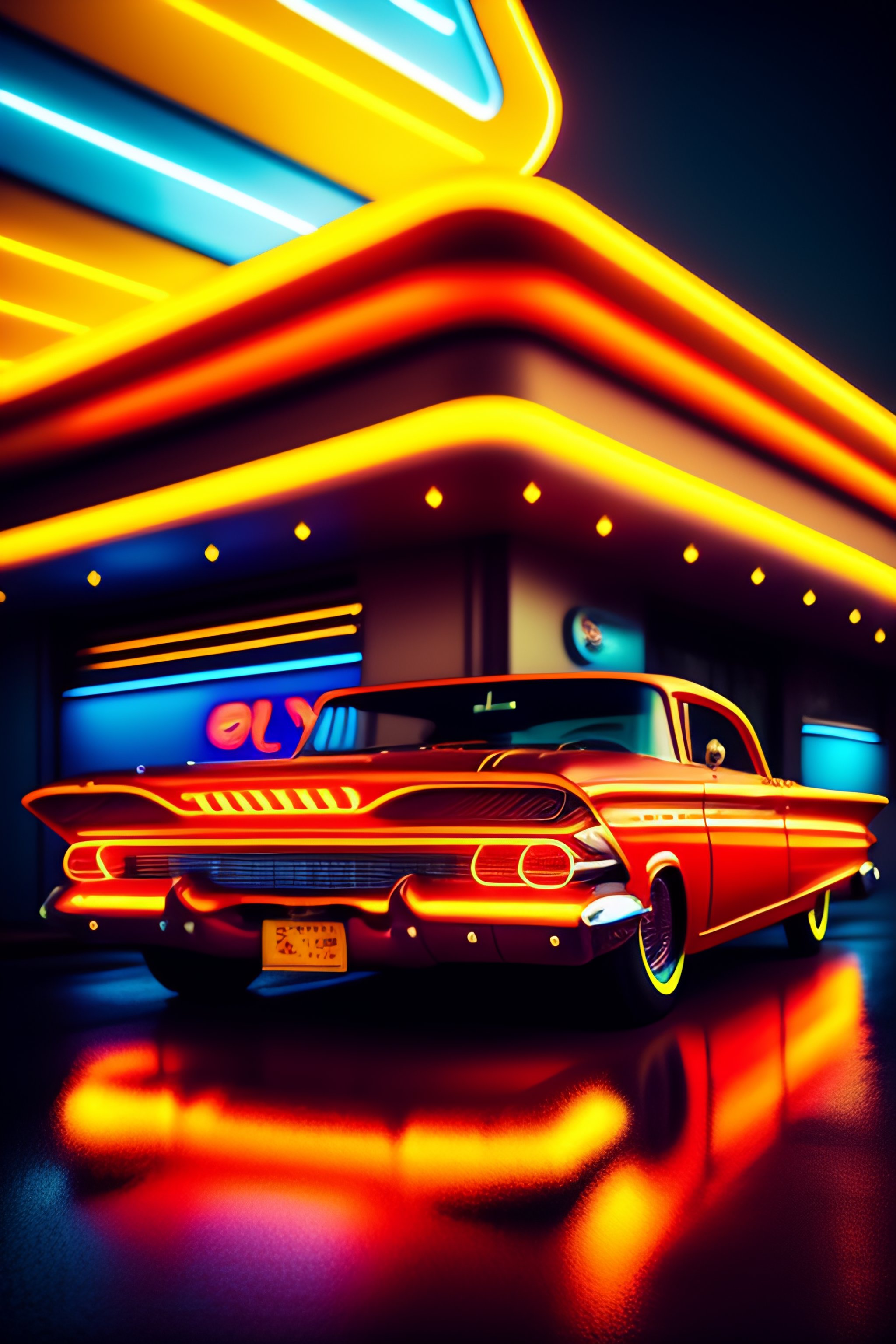 Neon, carhop, hamburger, night, light, funny, water on road, american car from the 1960s, realistic, high resolution, 8k, definition, detailed, ray tracing, photo, extreme real, photography, real life, octane engine, sharp focus, ultra wide shot, panorama --v 4 --q 2 --uplight --ar 3:2