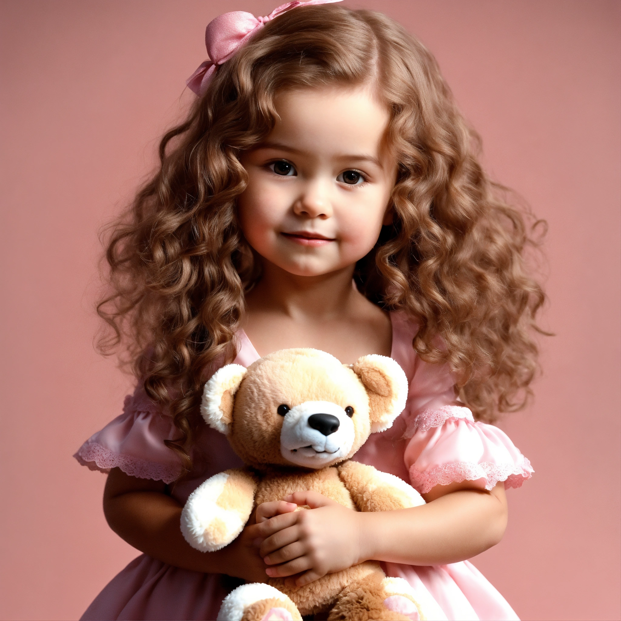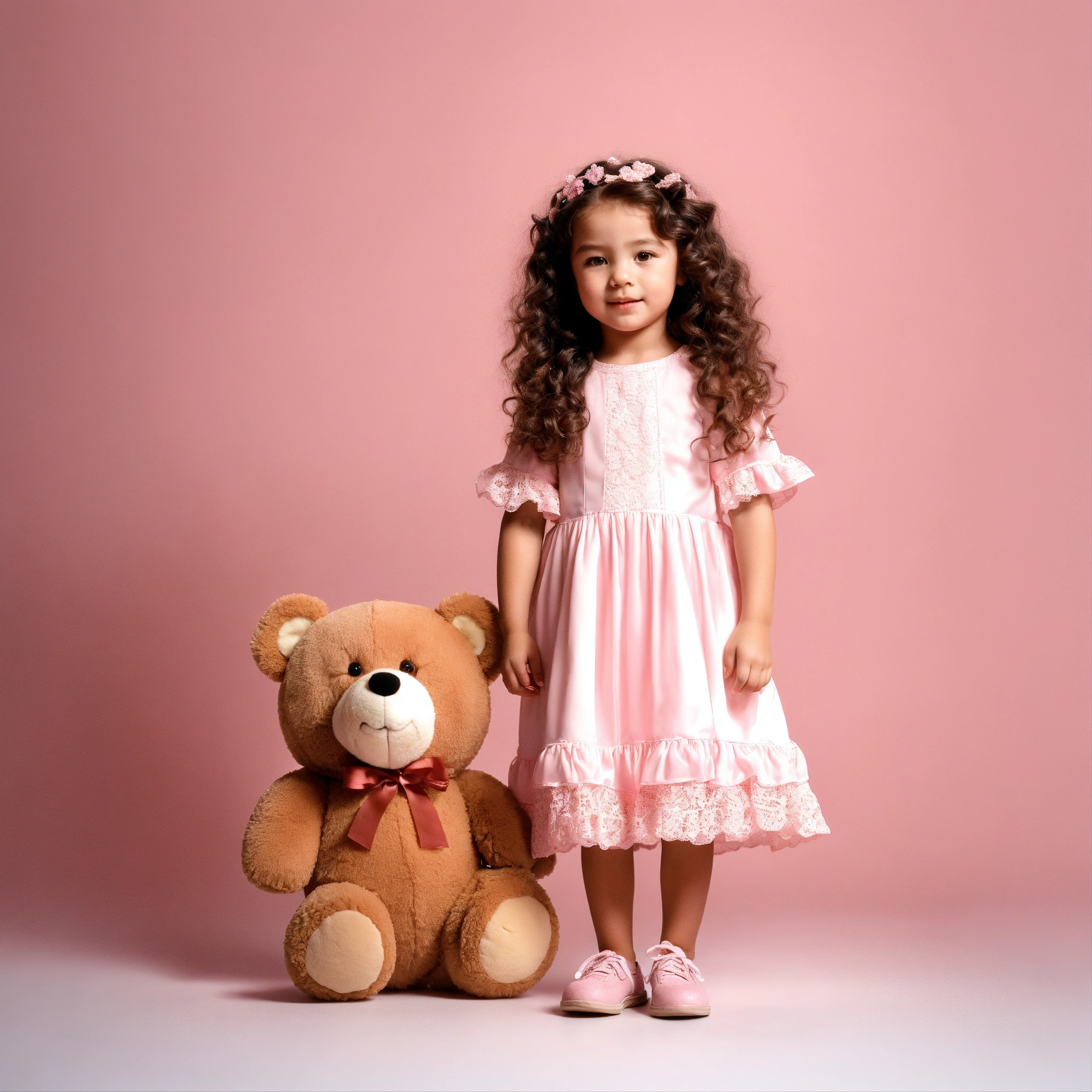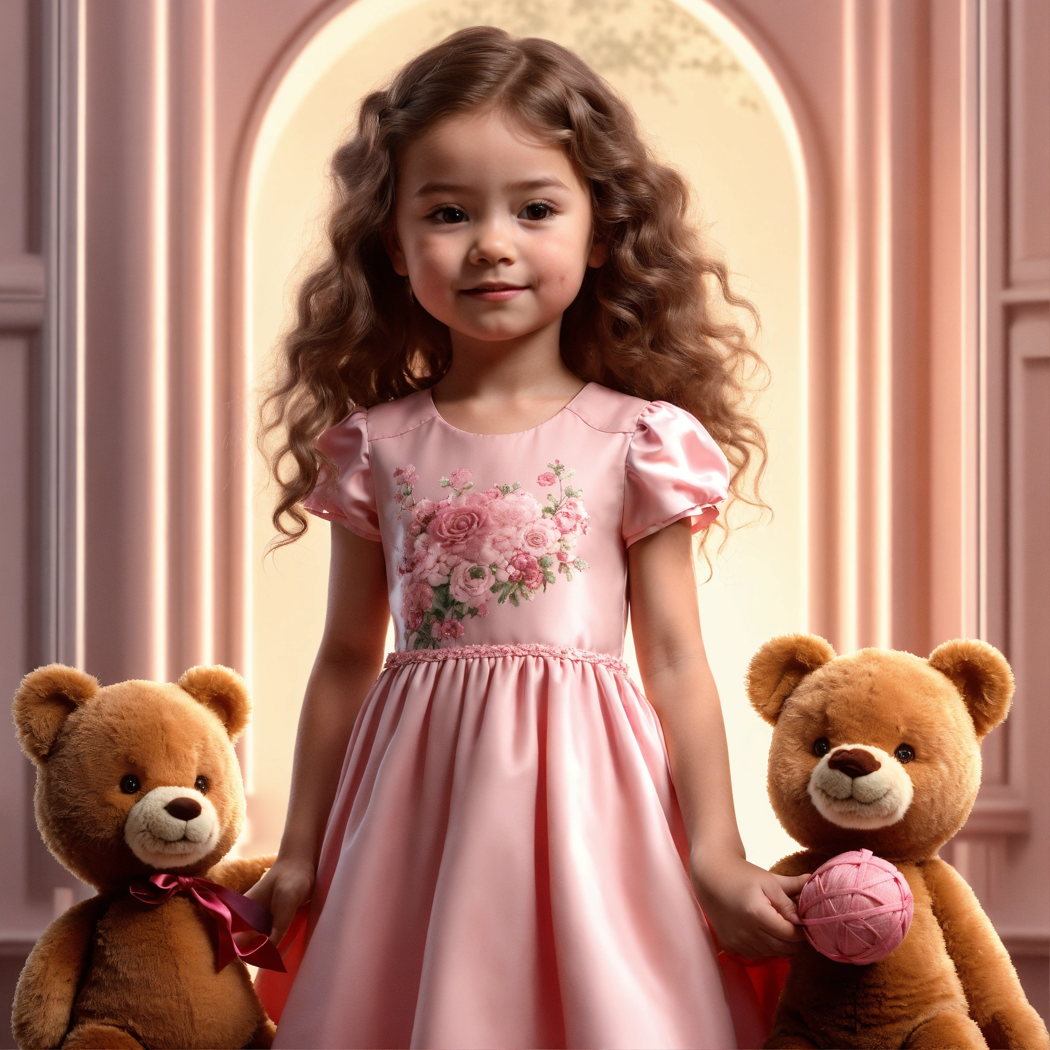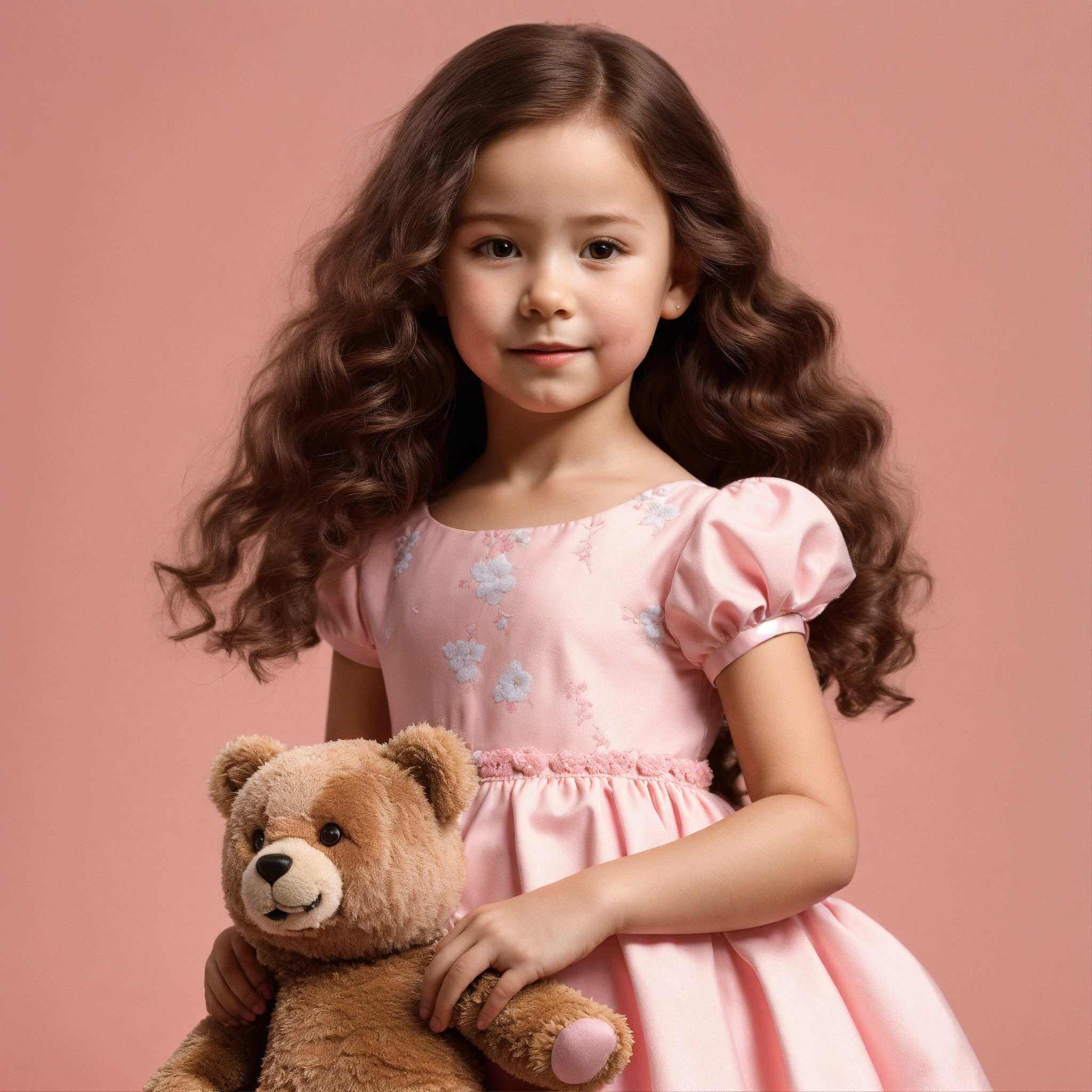 Girl, 5 years old european appearance, with long curly brown hair, standing with a toy spotted bear in her hands, wearing a beautiful pale pink dress, background white background, beautiful cinematic 32k realistic 3d