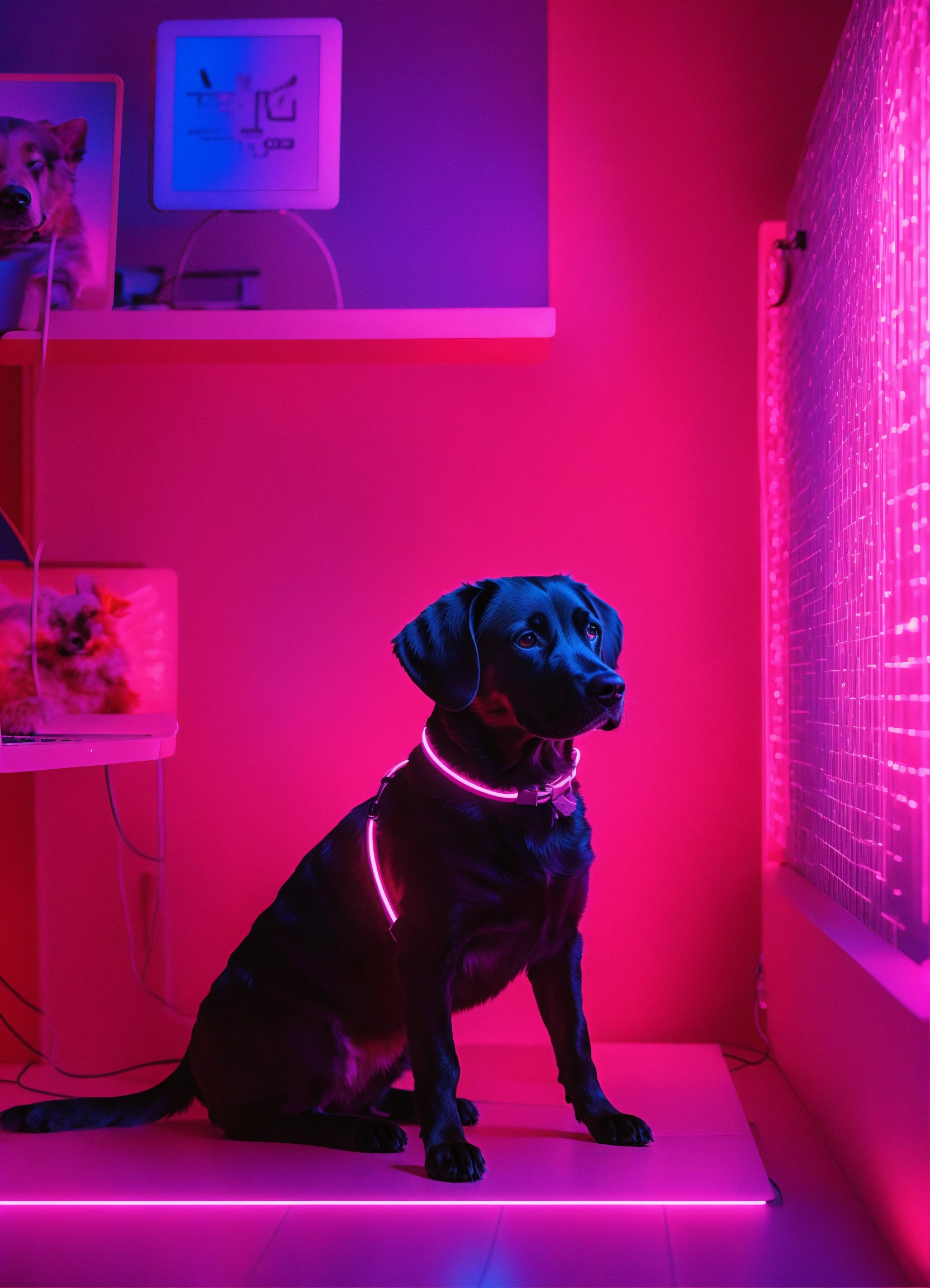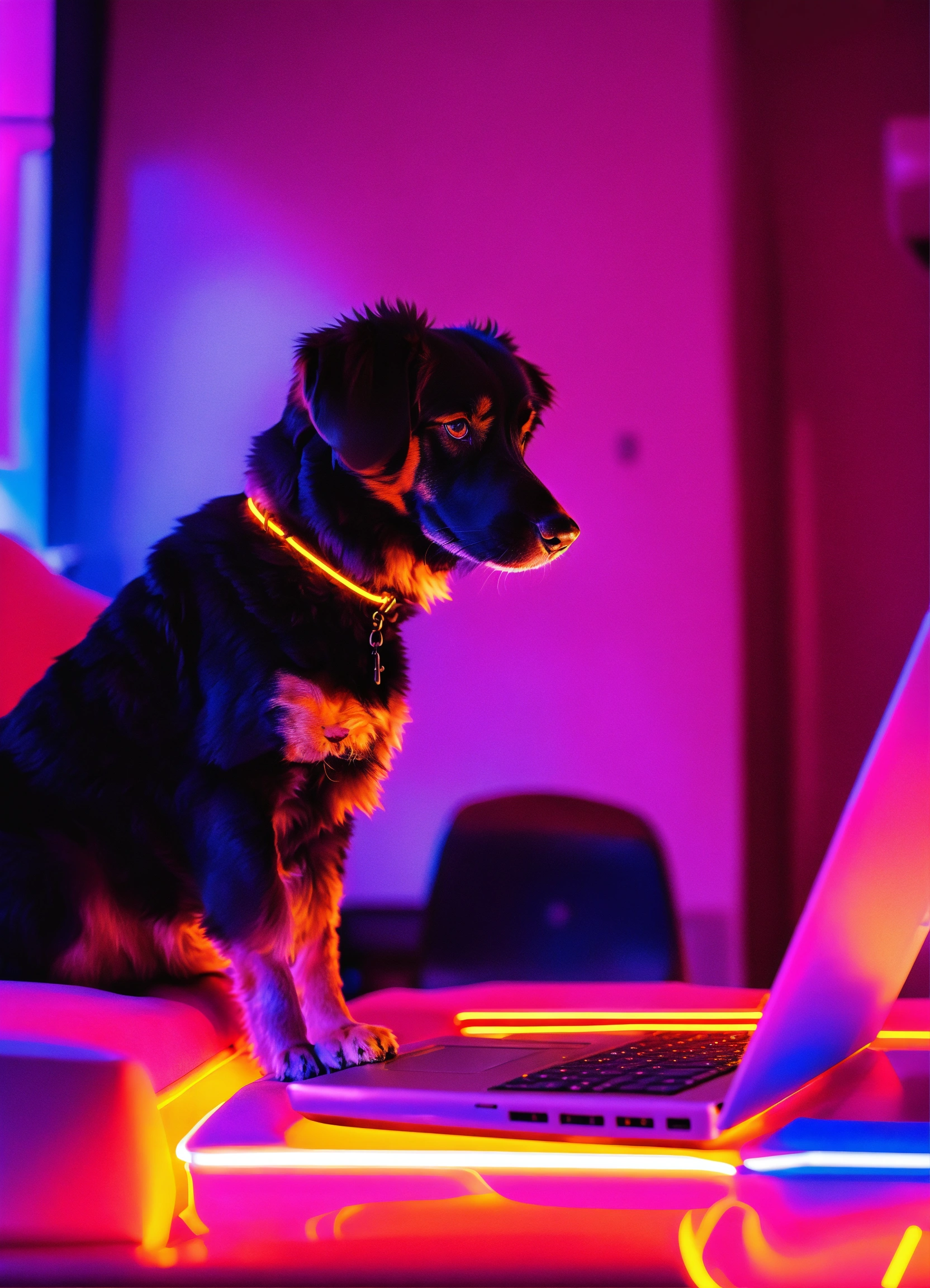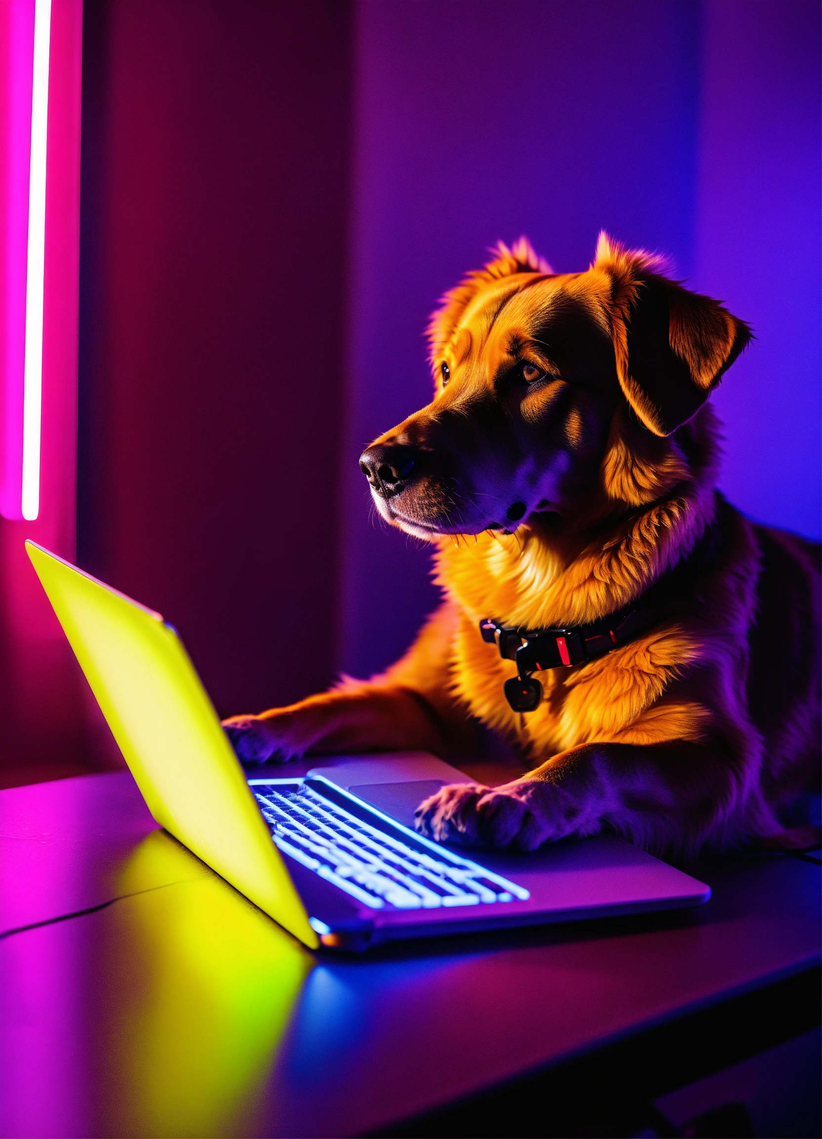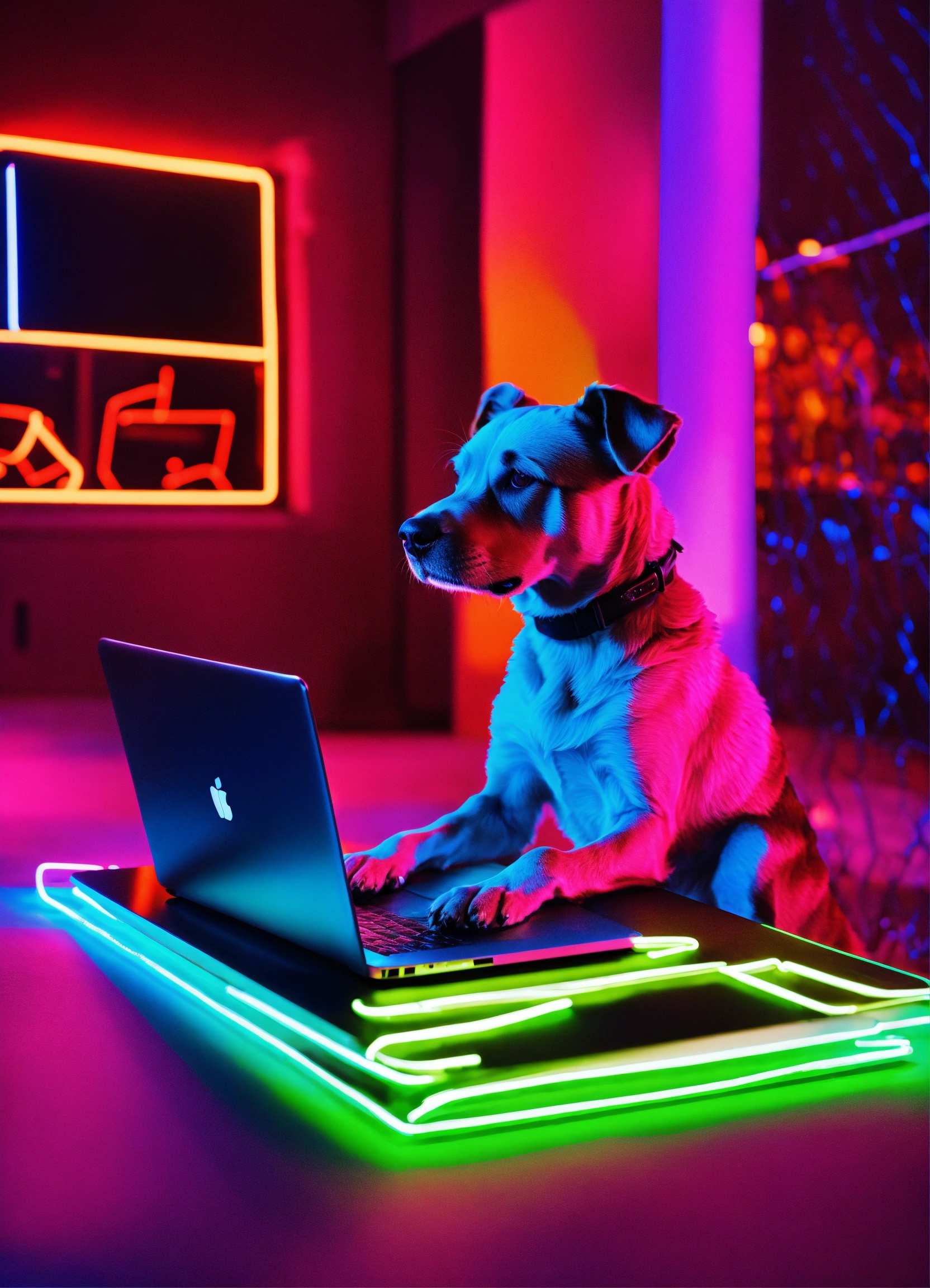 A dog using a laptop in a neon environment