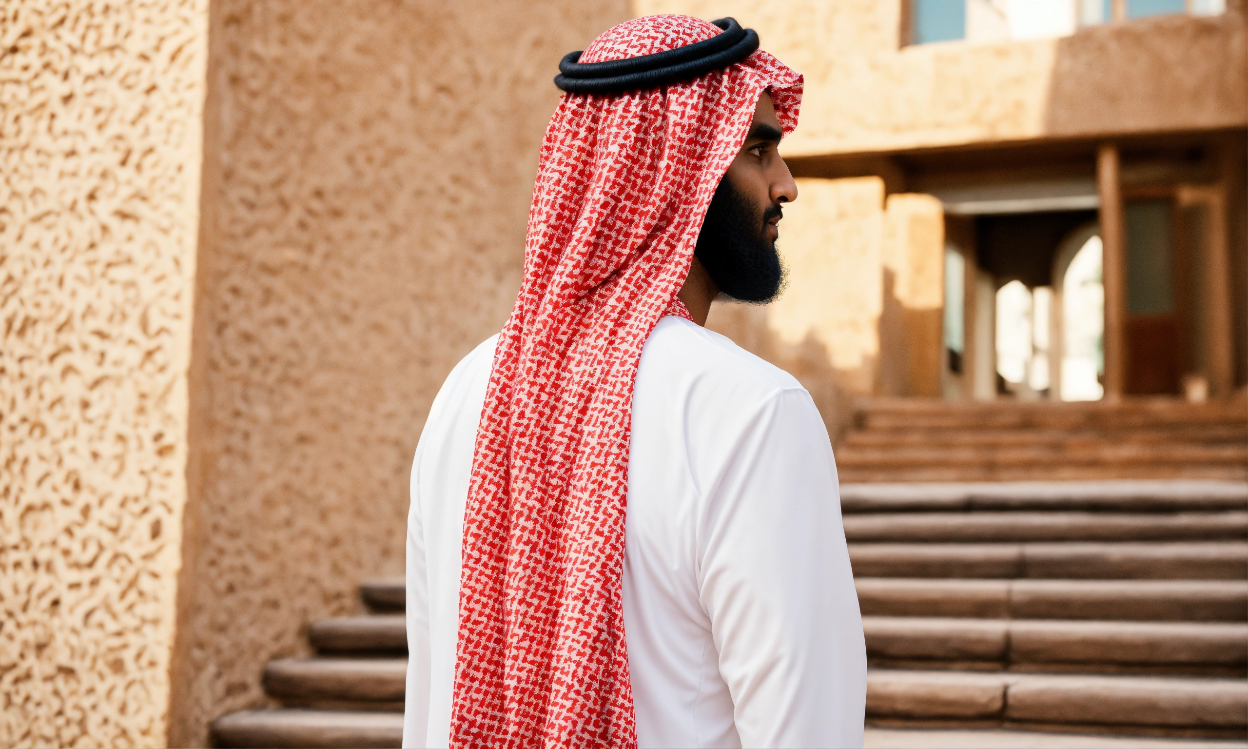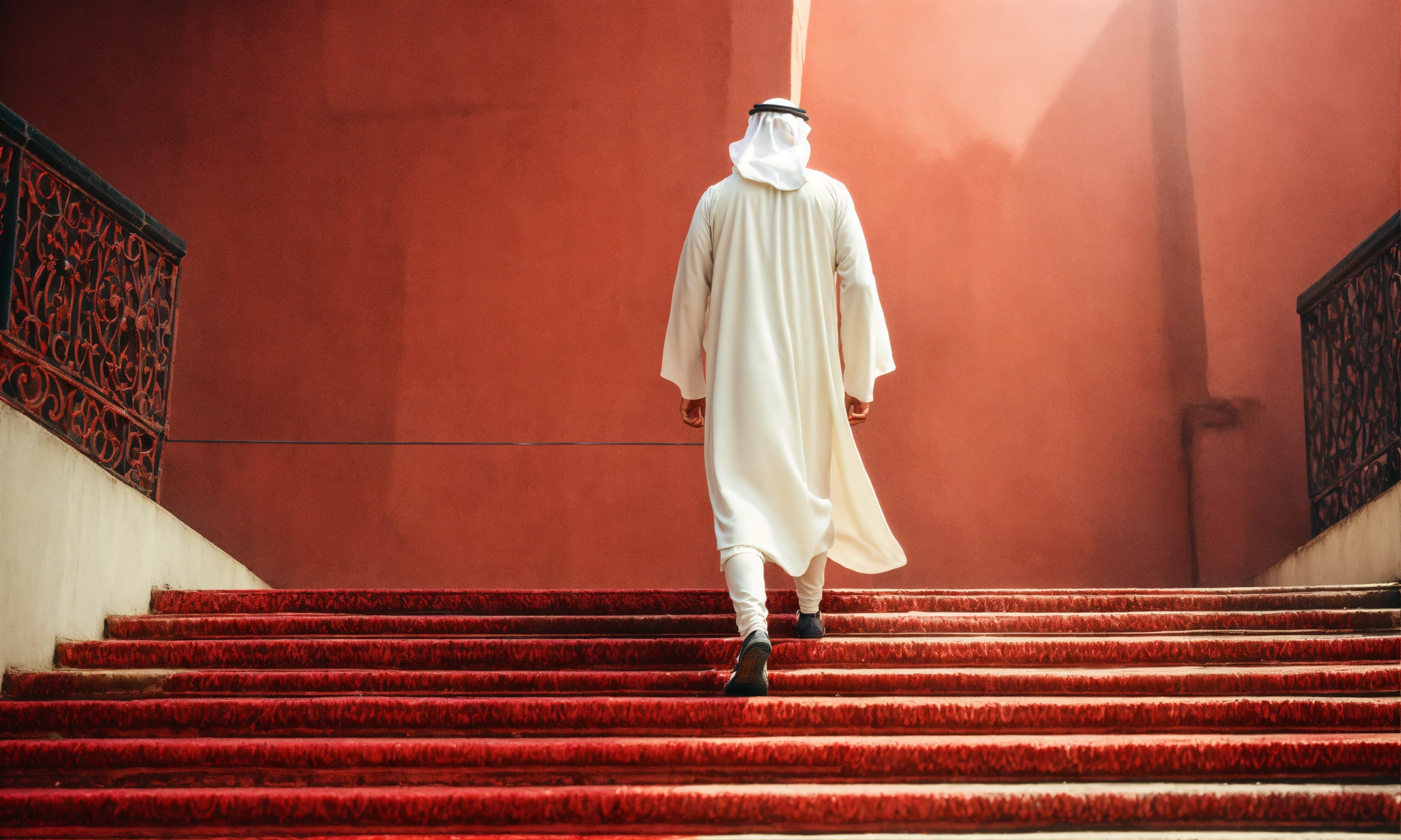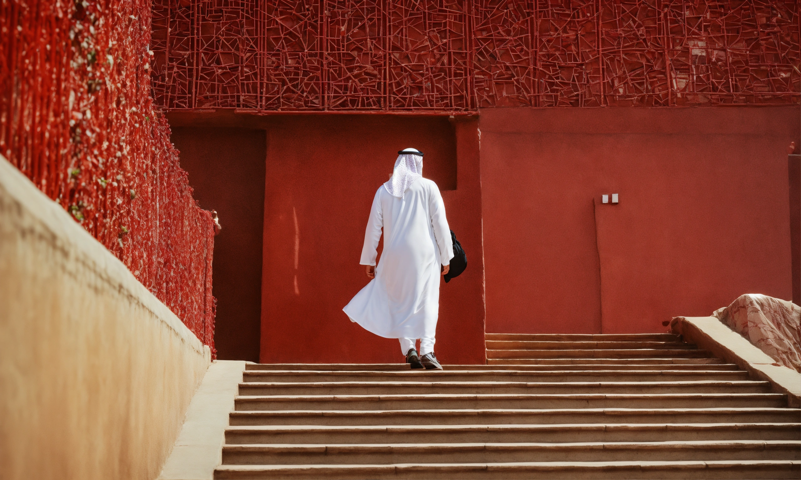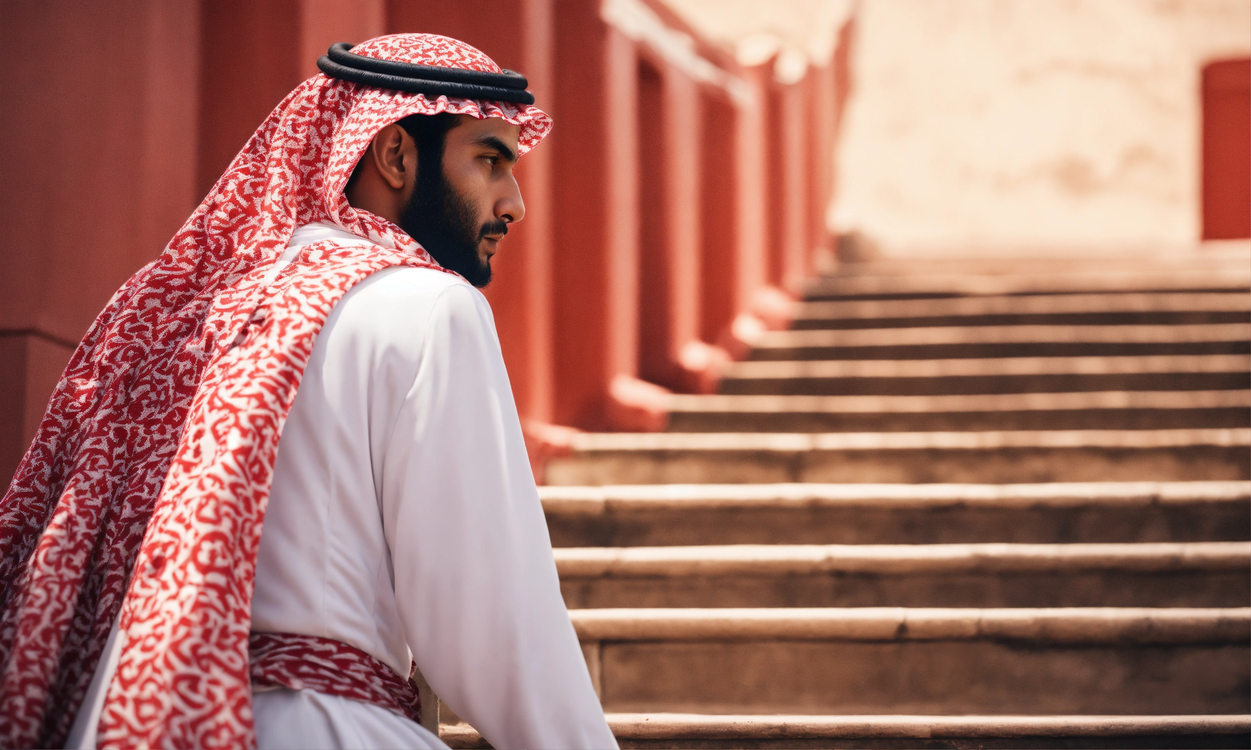 Saudi man climbing up steps, looking right, side-way, climbing up, white costume, saudi head cover, red pattern, close up, natural light, warm, photo-realistic, 8k, high definition