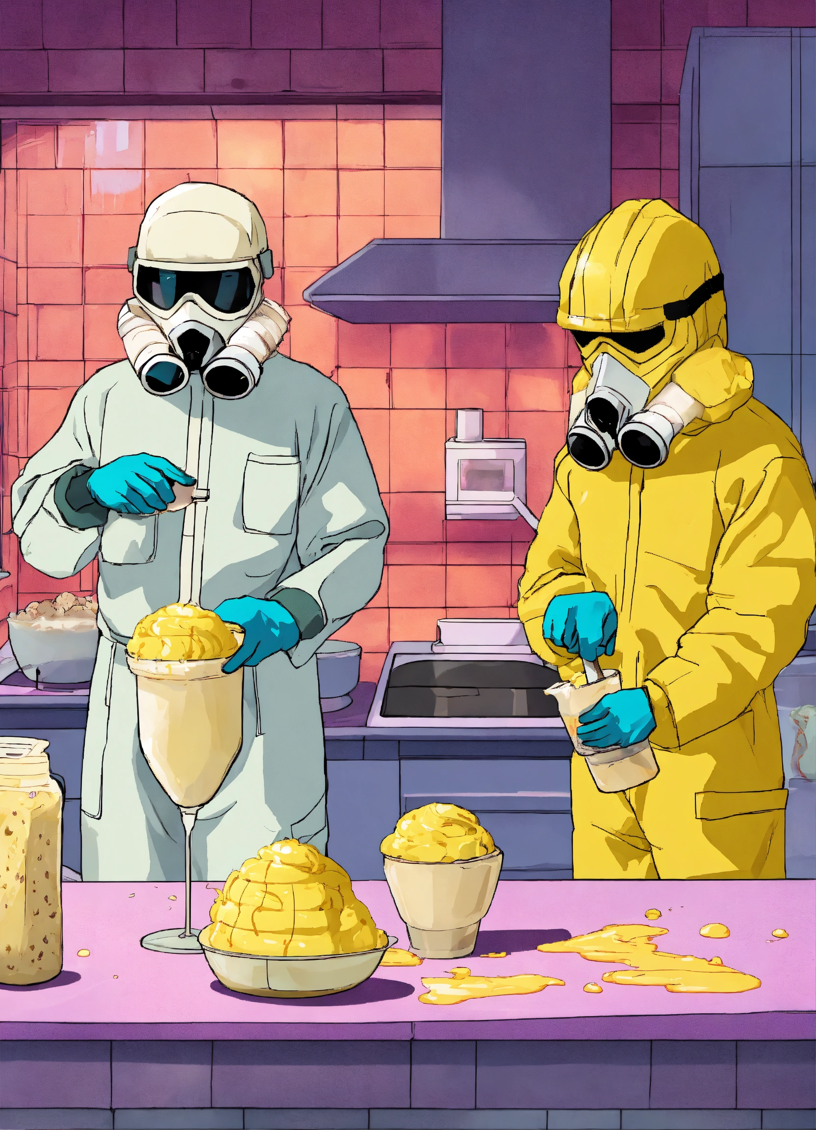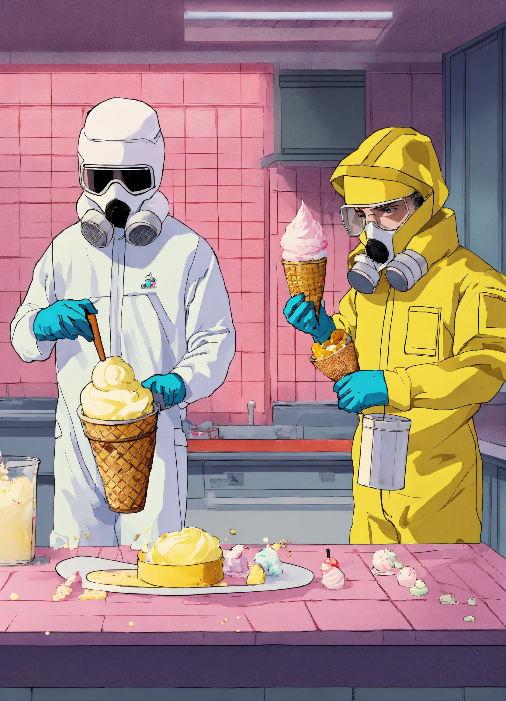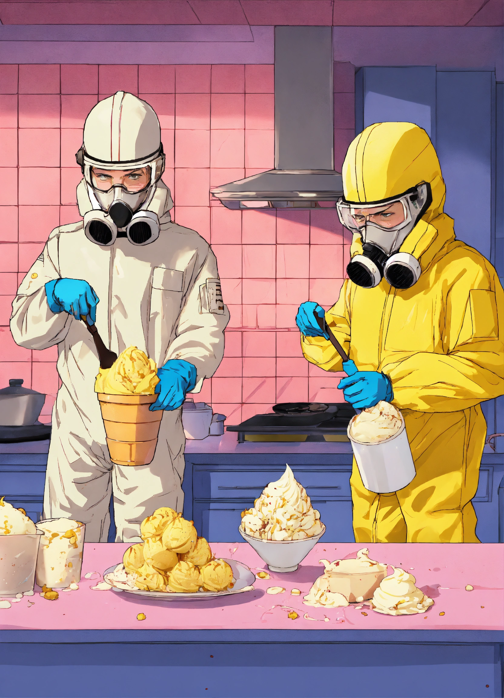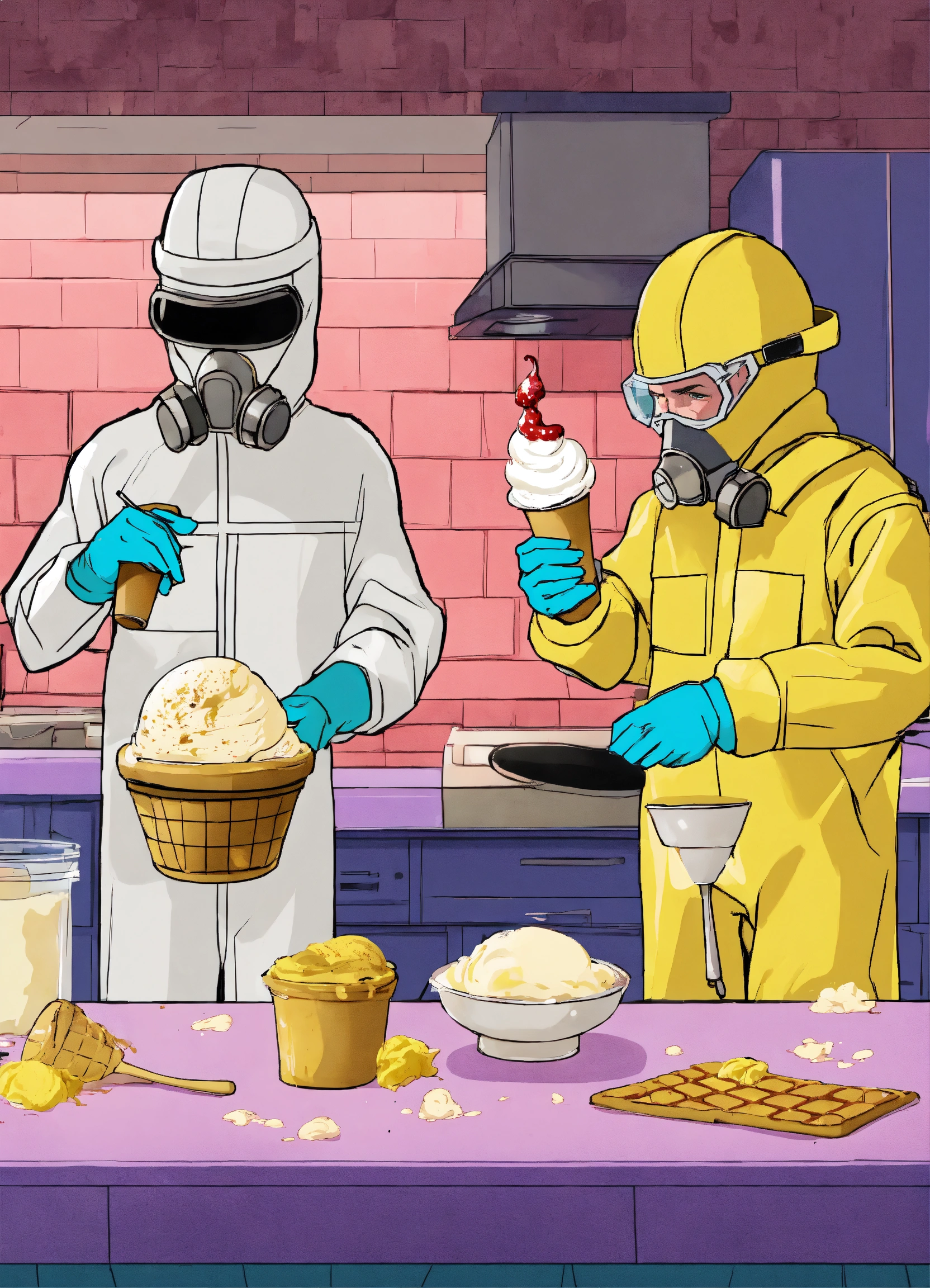 Jesse pinkman and walter white from breaking bad making ice cream. they're wearing hazmat suits. one is making ice cream, they other is holding a waffle cone ice cream cone. style animated