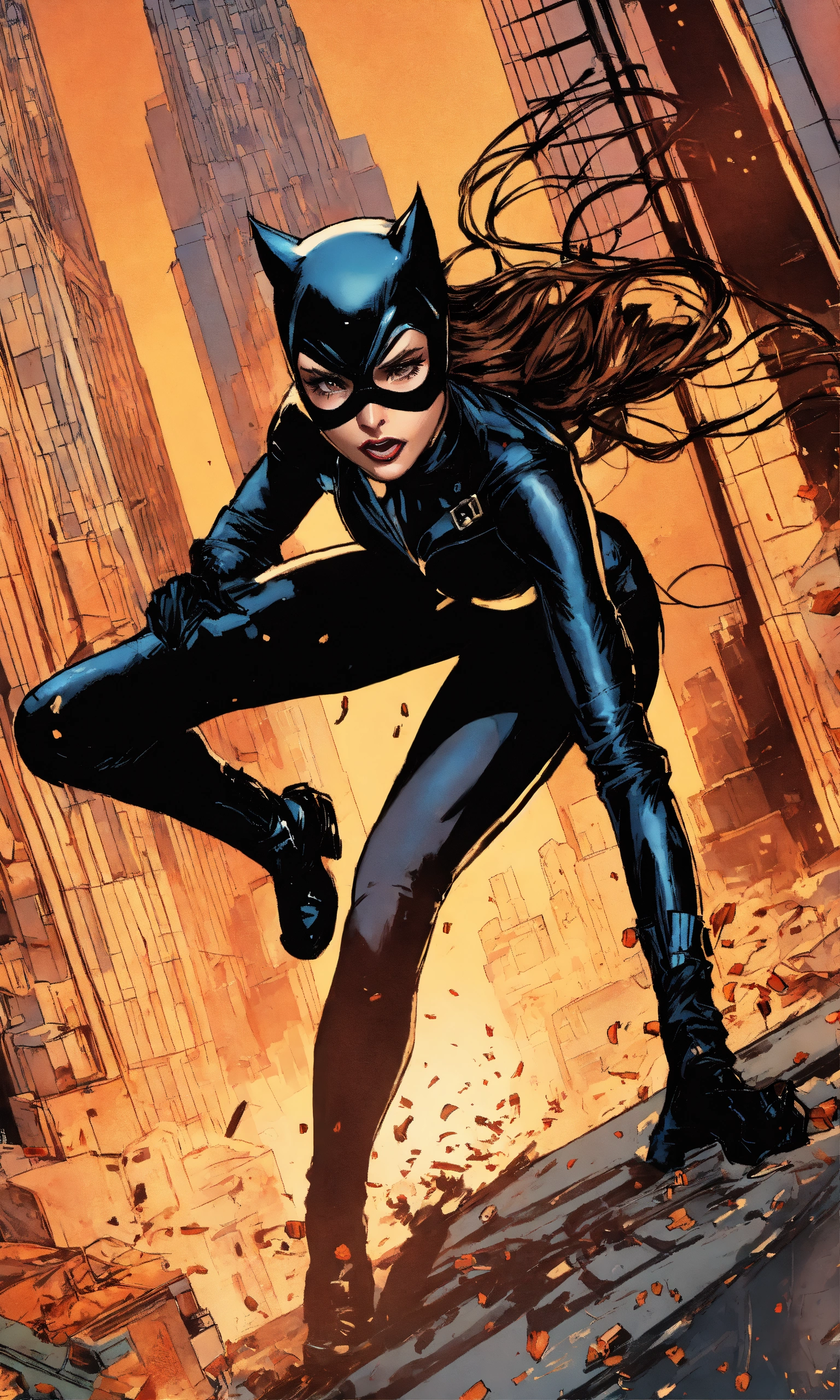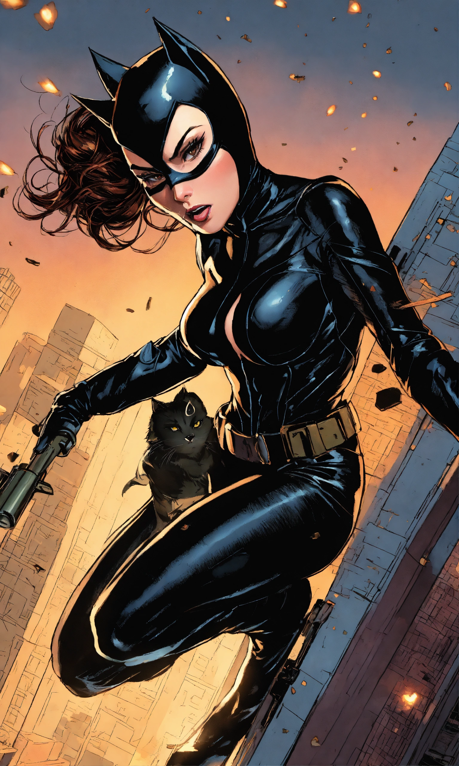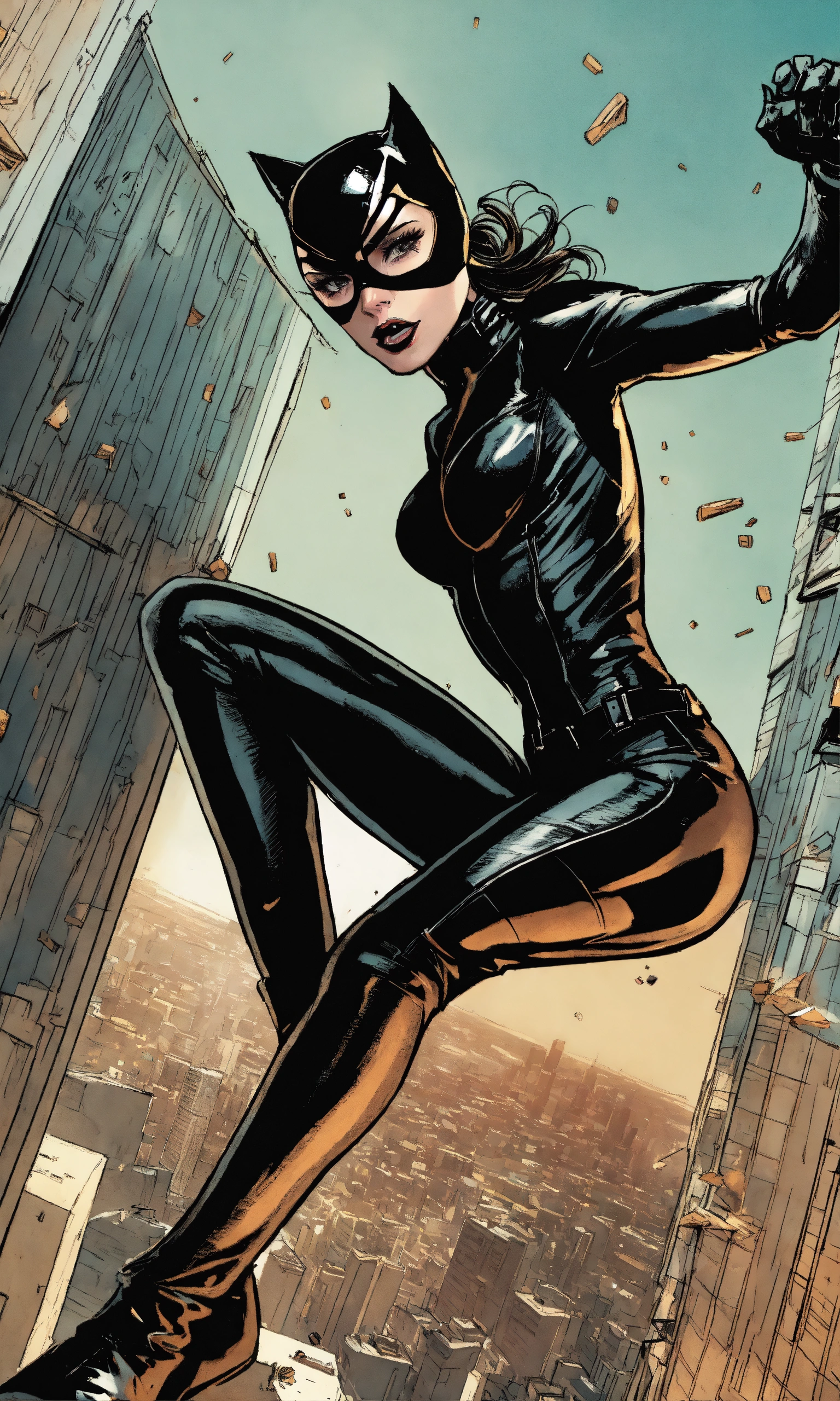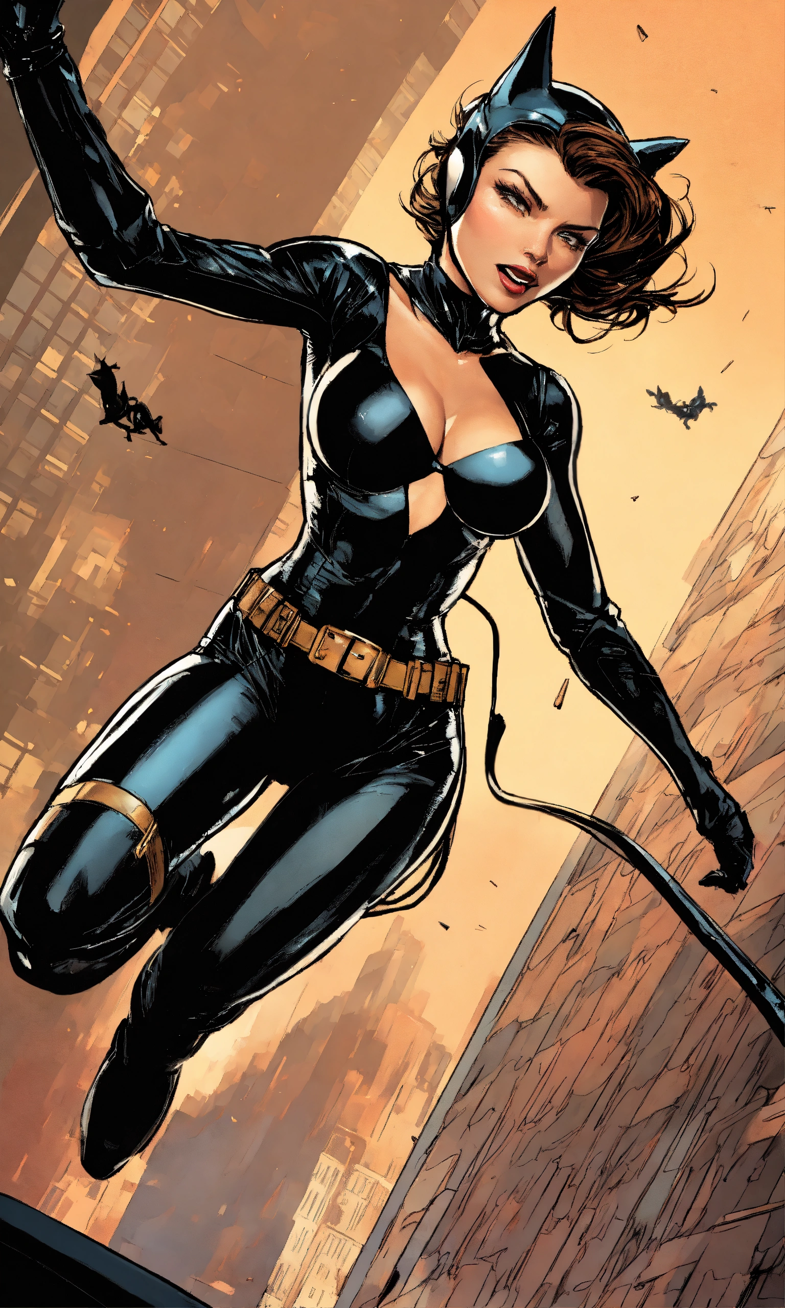 Catwoman, much emotion in face, (in action shot, dodging bullets), falling from skyscraper, stylish, beautiful, artistic