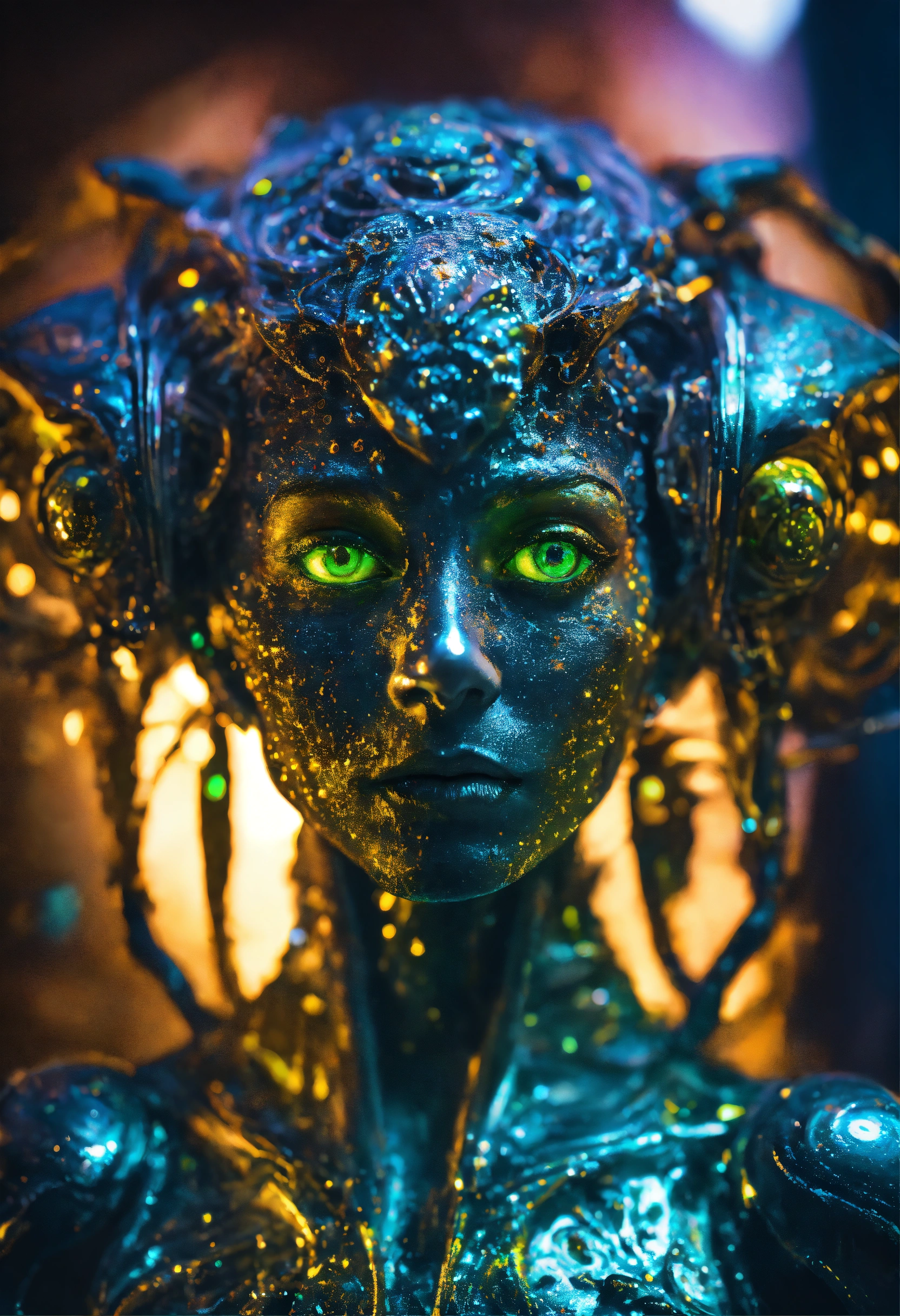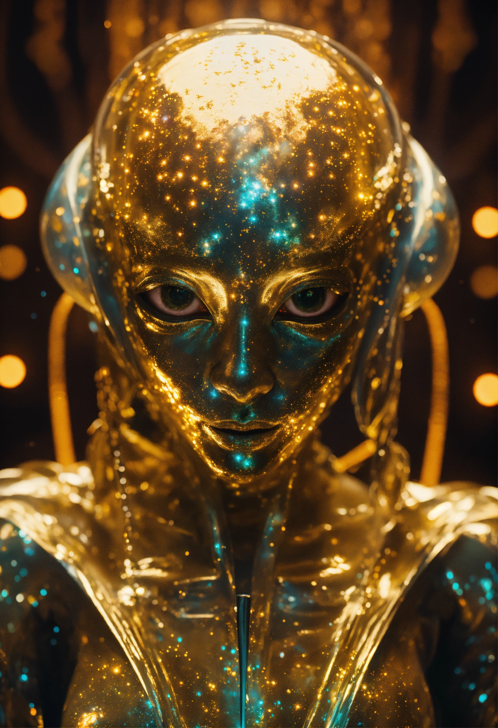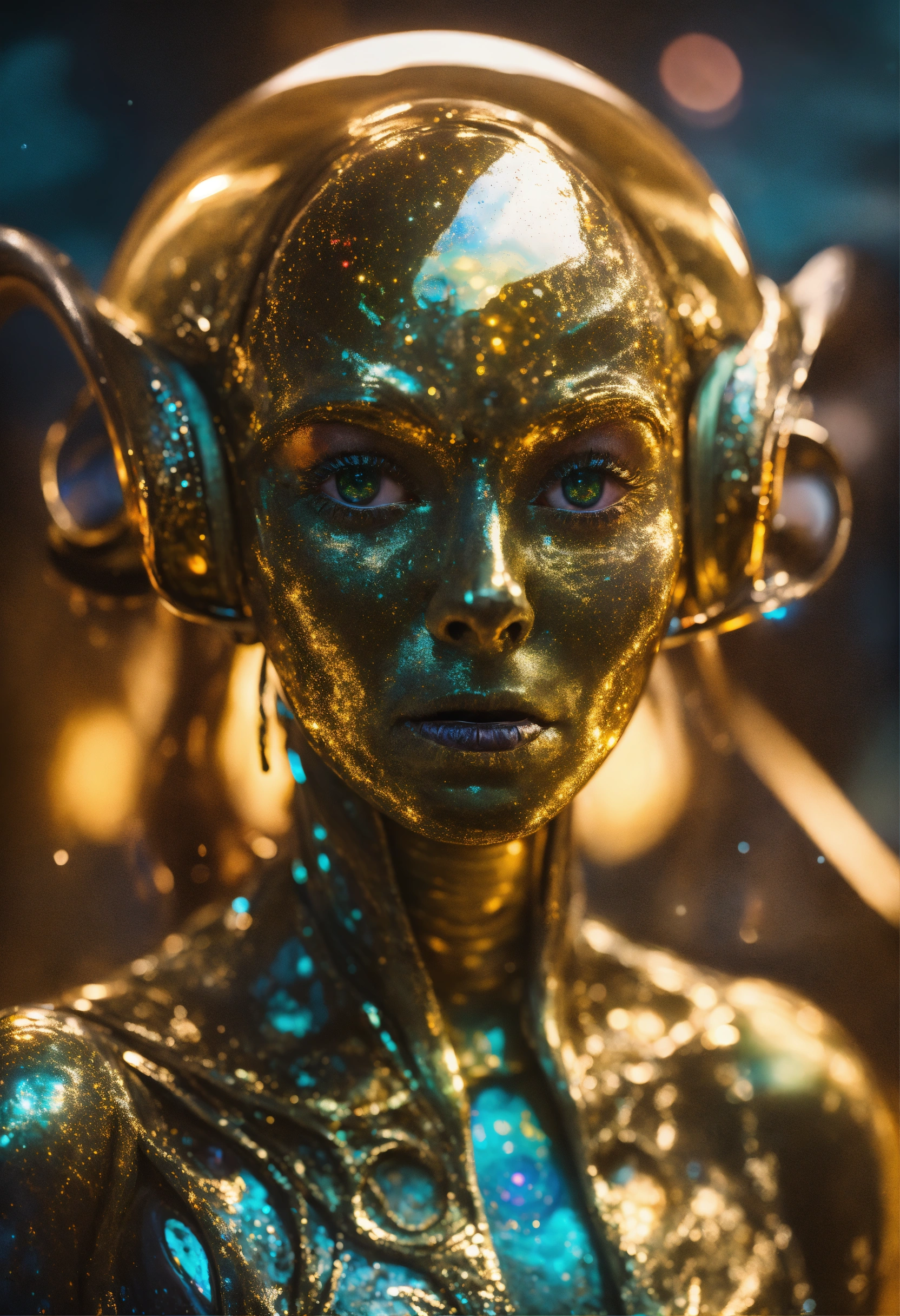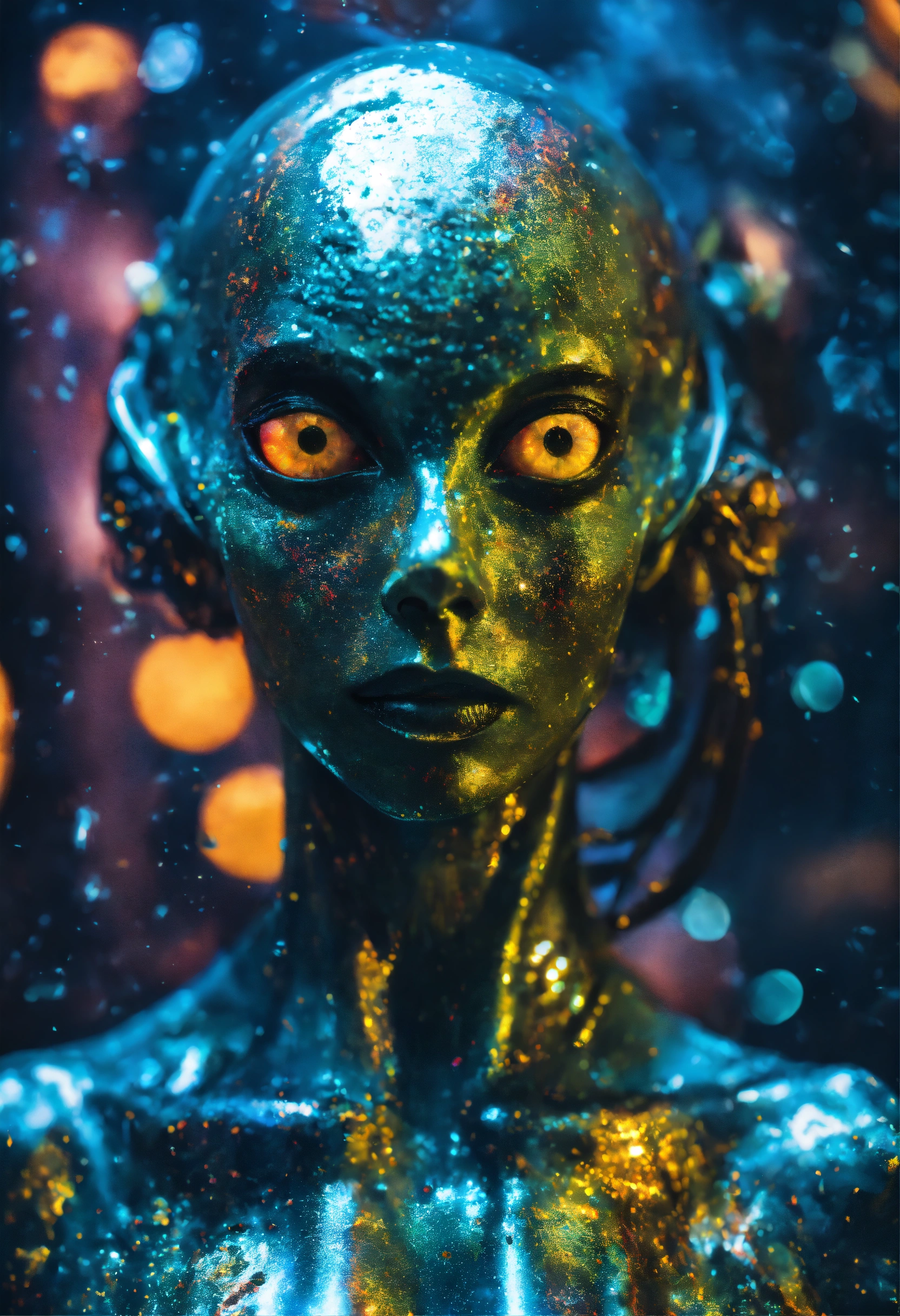 An alien dressed up like a human for halloween, glowing eyes filled with swirling galaxies, in the style of liquid metal, alphonse mucha, ray tracing, raw character, 32k uhd, schlieren photography, conceptual portraiture, wet - on - wet blending