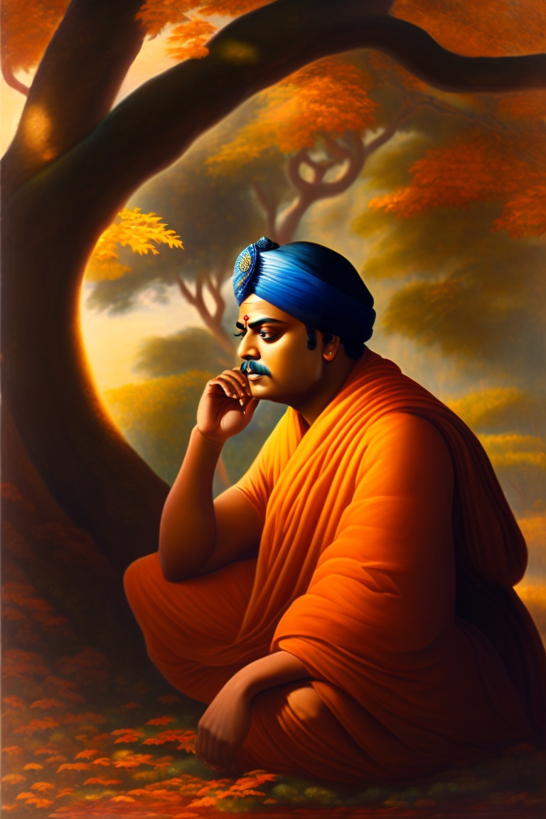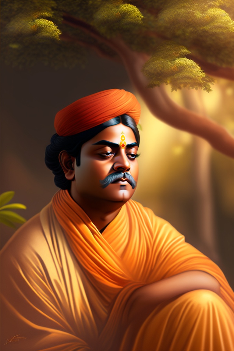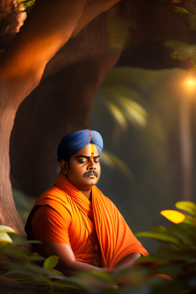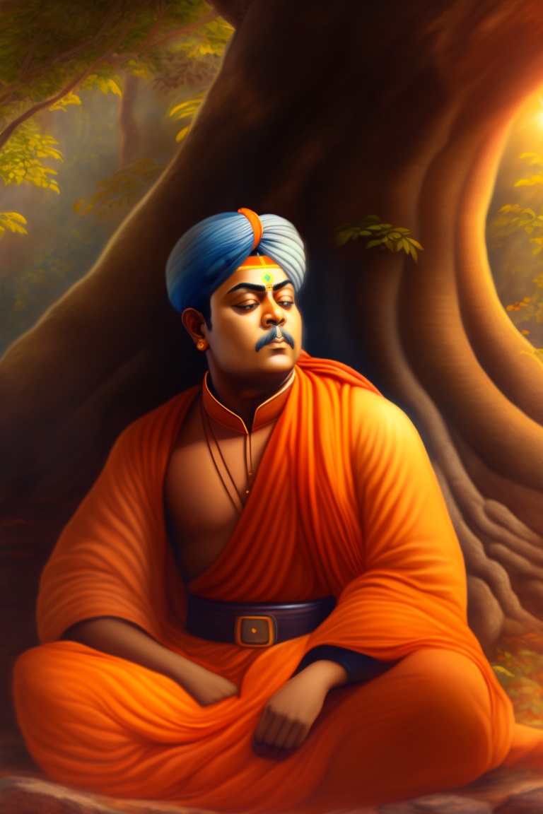 Swami vivekananda sitting under a banyan tree, engaged in deep meditation, as a ray of sunlight filters through the branches, illuminating his serene face.