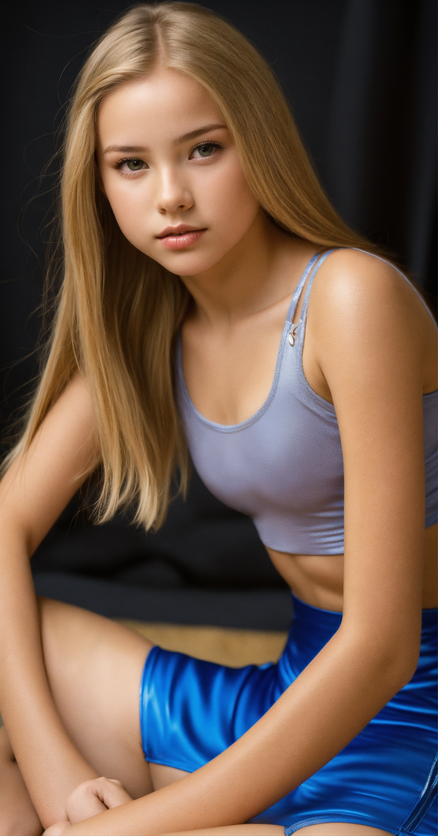 Very pretty blonde tween girl, very young looking, center parted hair, very long shiny hair, shiny very short tight tiny lycra shorts, small tiny bra top, midriff, olive skin, posing, small chested, petite, big lips, angelic face, full lips, cute, youthful, pretty, high resolution, natural lighting, studio, petite, playful, moody pose