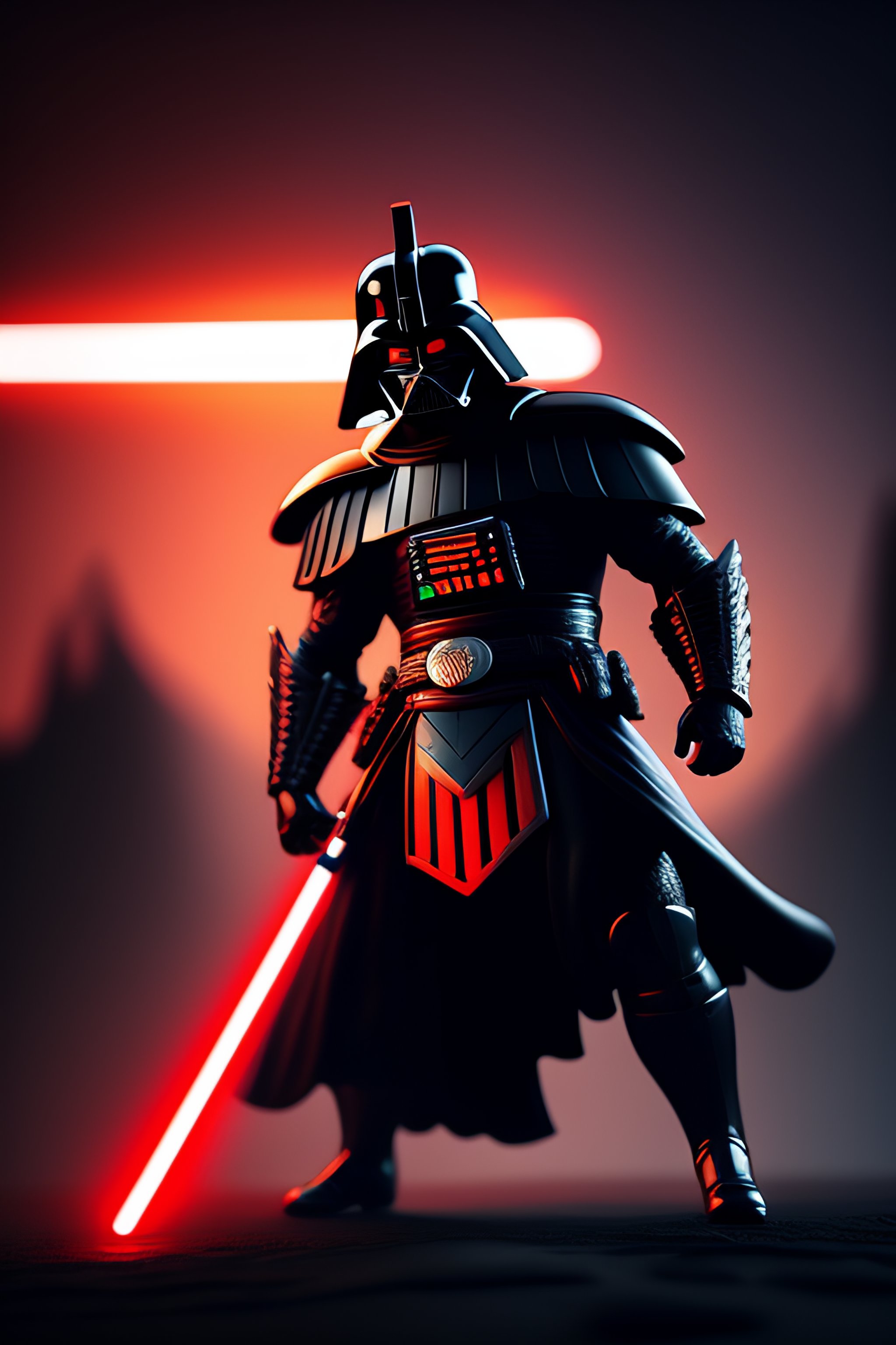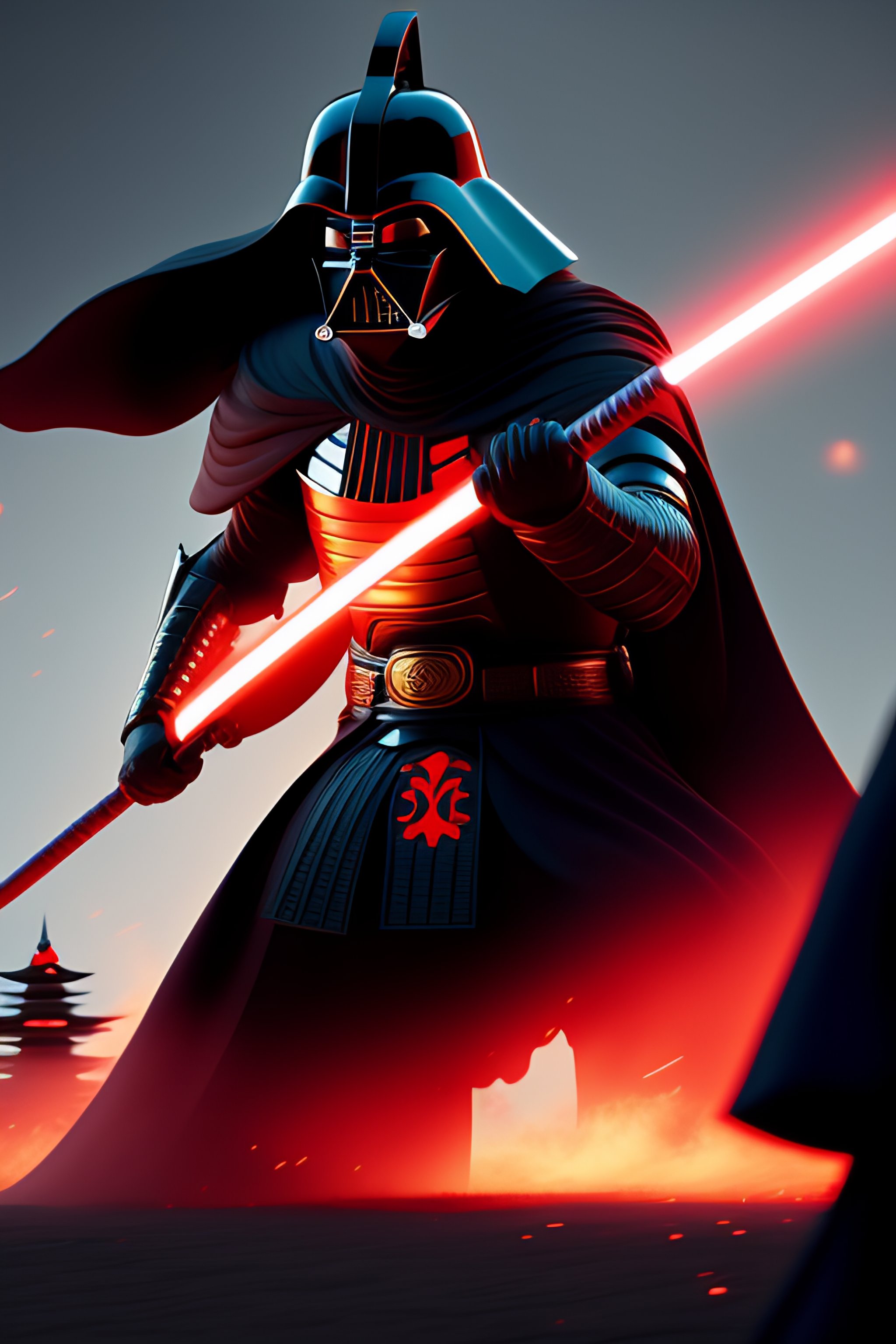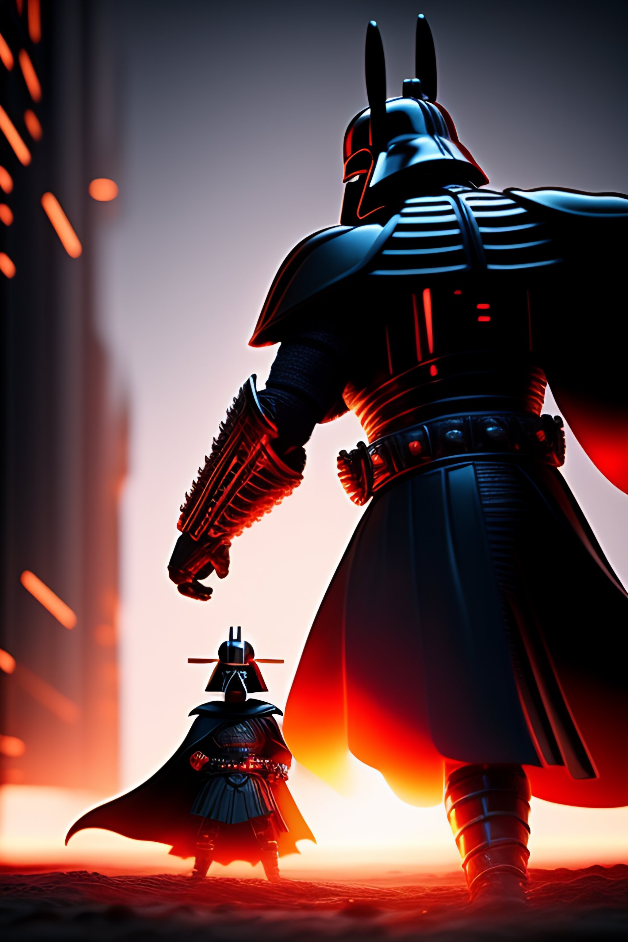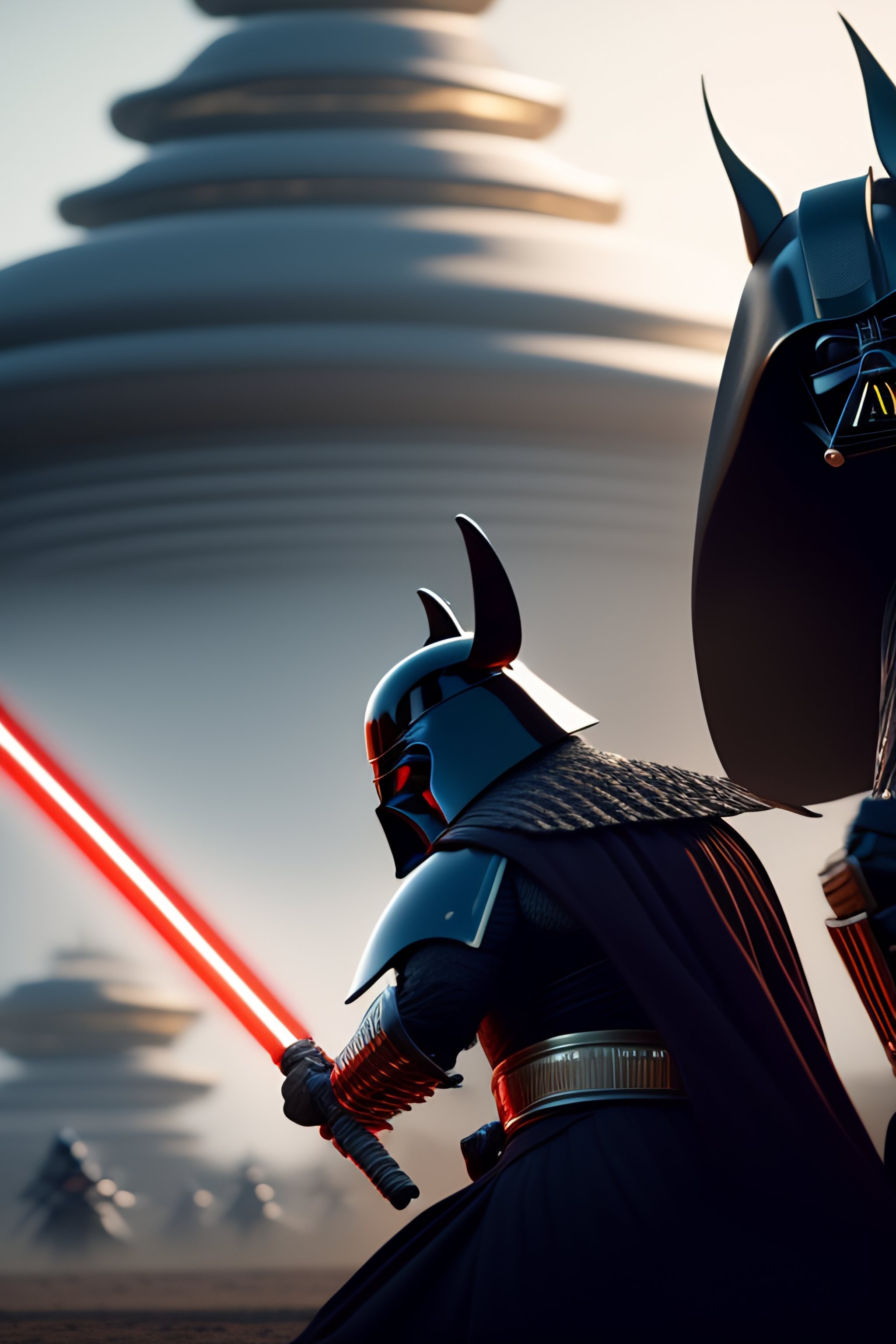 Samurai jack fighting darth vader, cinematic, establishing shot, fantasy, hyperrealism, volumetric light, octane render, photorealistic concept art, highly detailed, very intricate, 9:16
