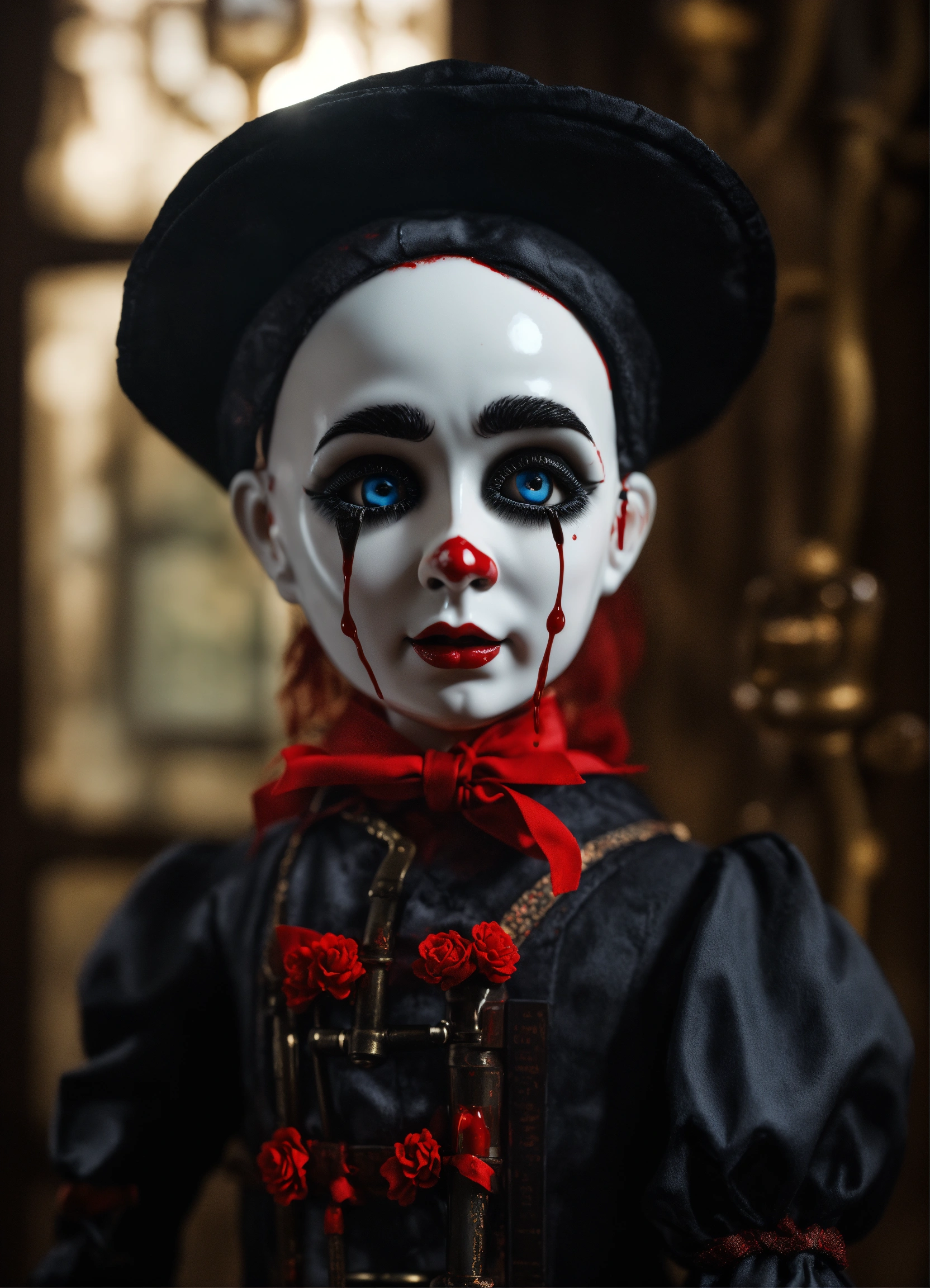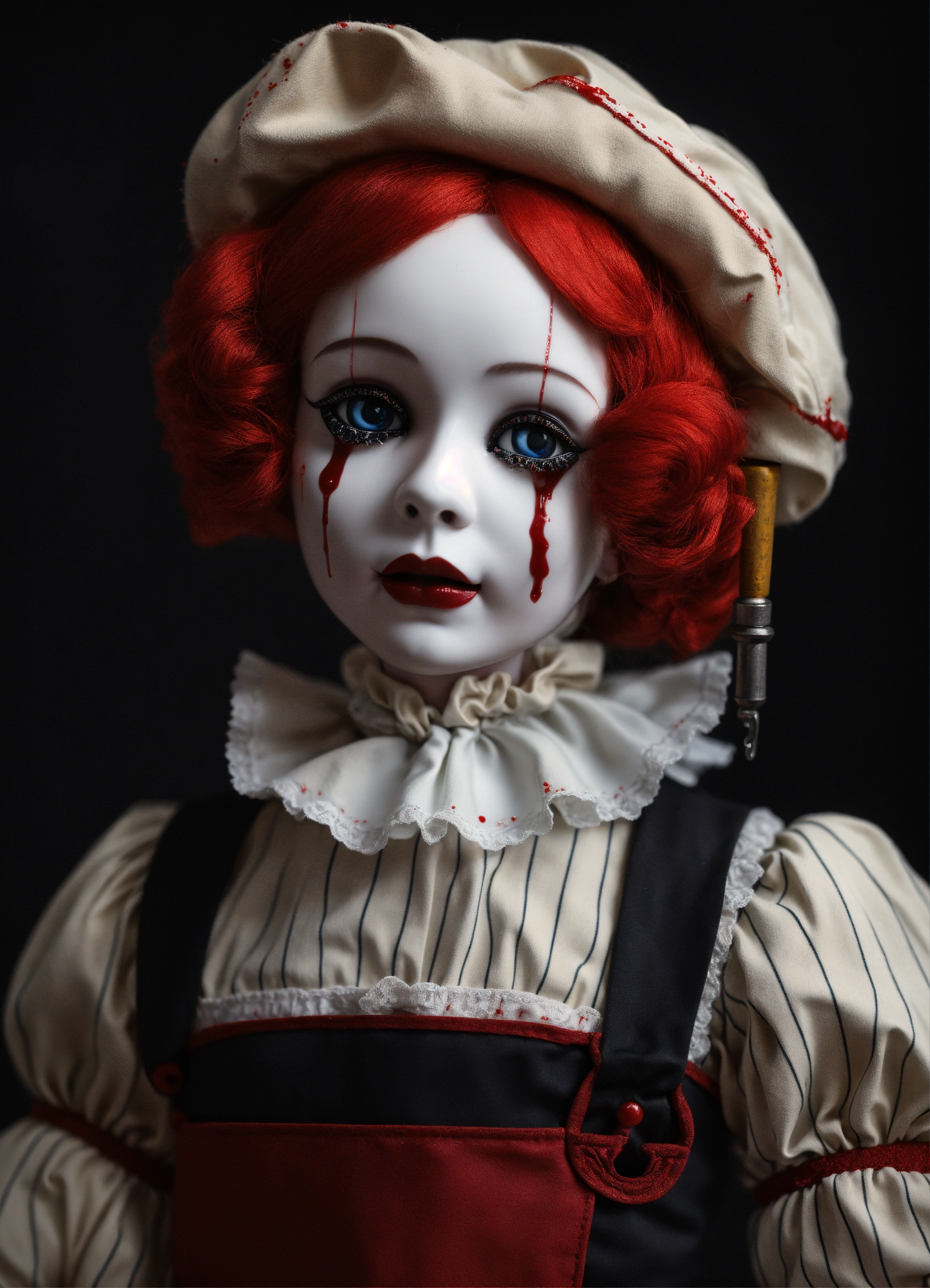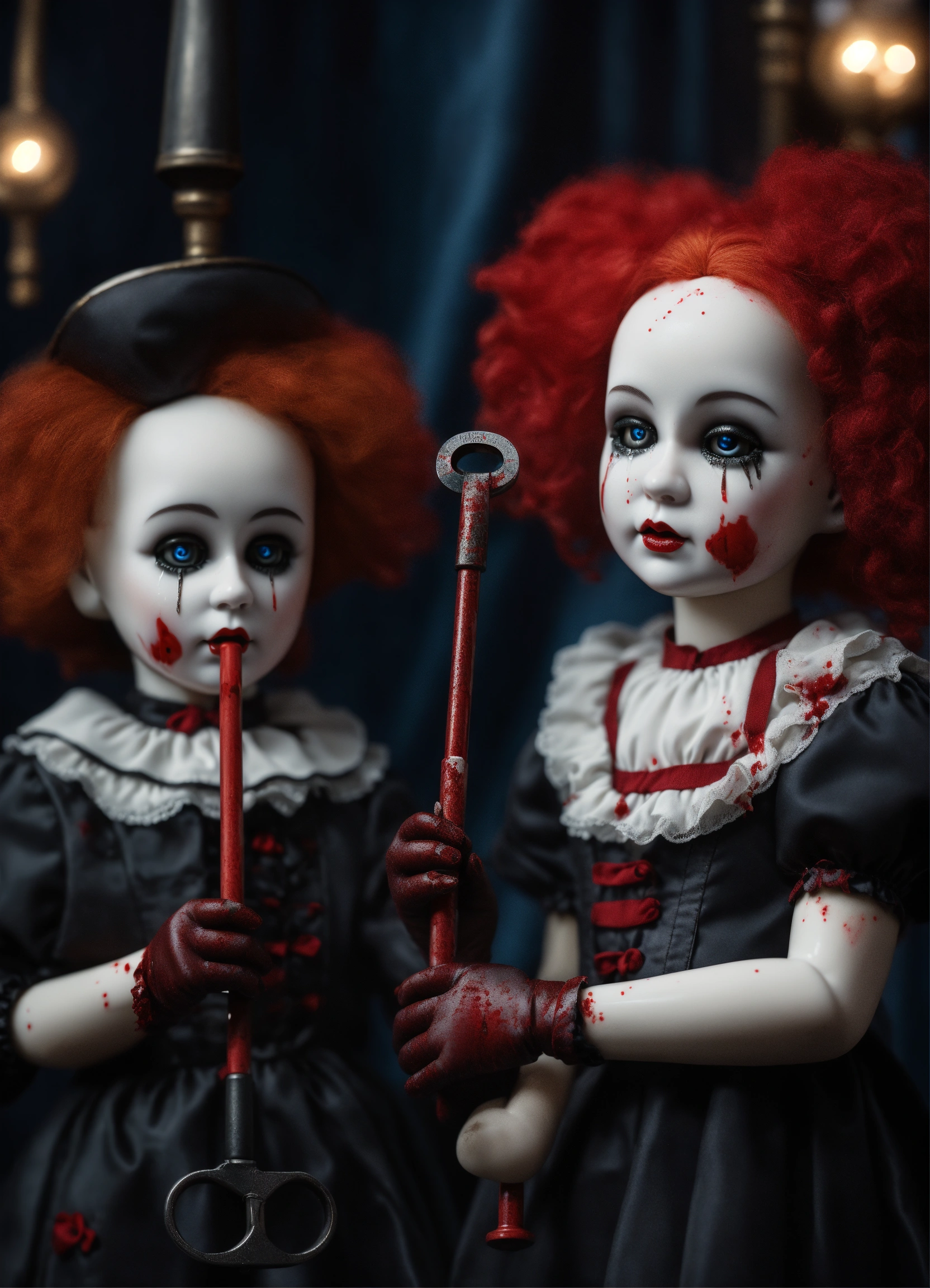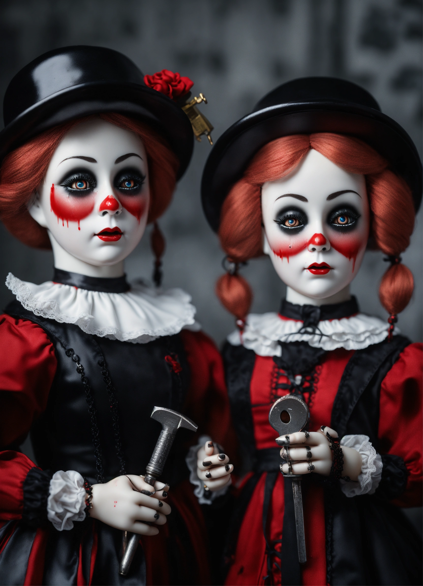 3d gothic porcelain dolls as mimes with tears of blood hyper realistic 8k holding a pipe wrench