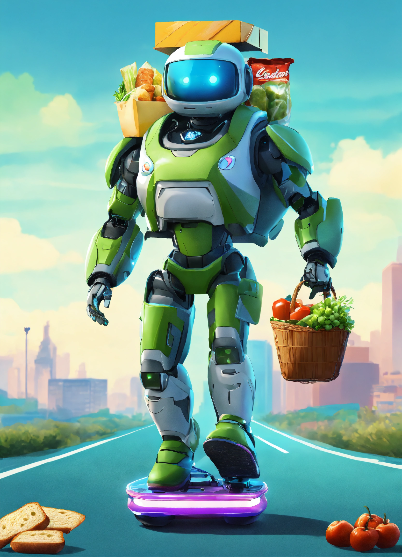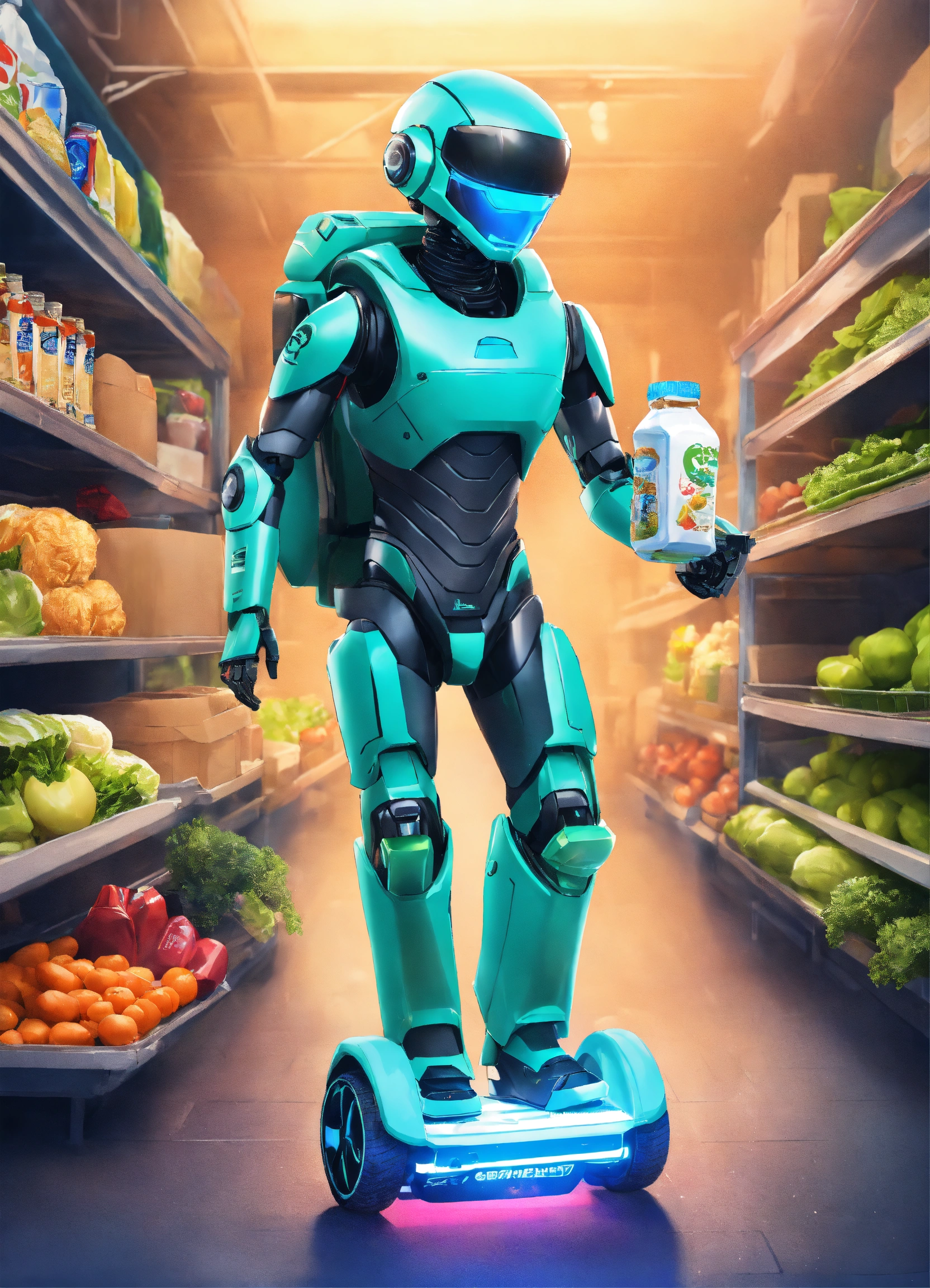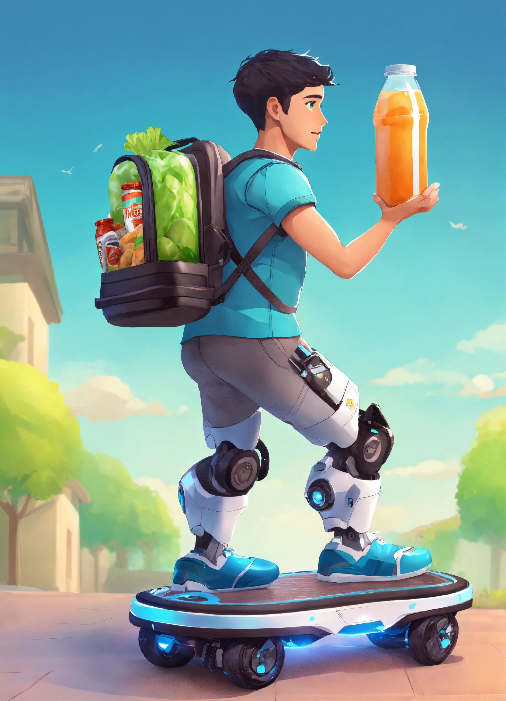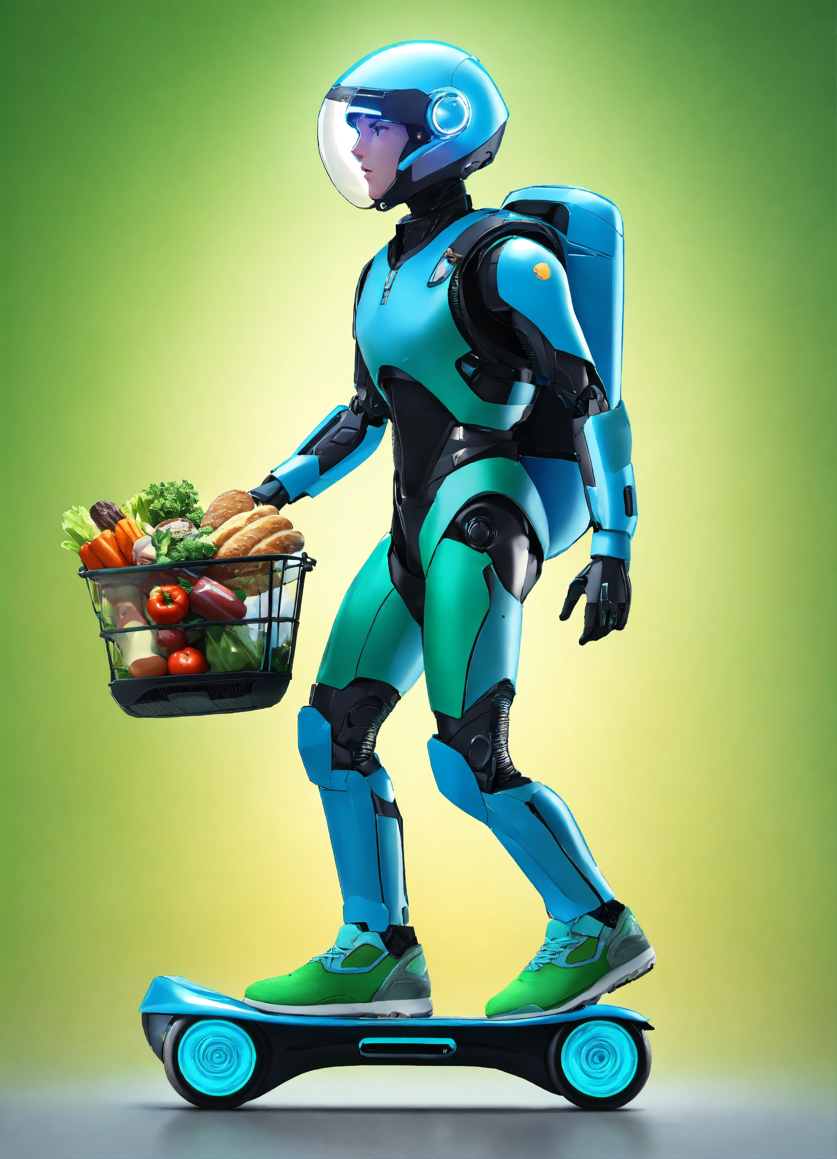 A passionate male robot on hoverboard, realistic man face, clear eyes, black hair, full appearance, delivering groceries, assorted milk bottle, bread pack, soft drink, and some assorted vegetables basket on hands. sports backpack. transparent background, the predominant design colors are gradients of blue and green. no background images, background should be gradients of blue and green