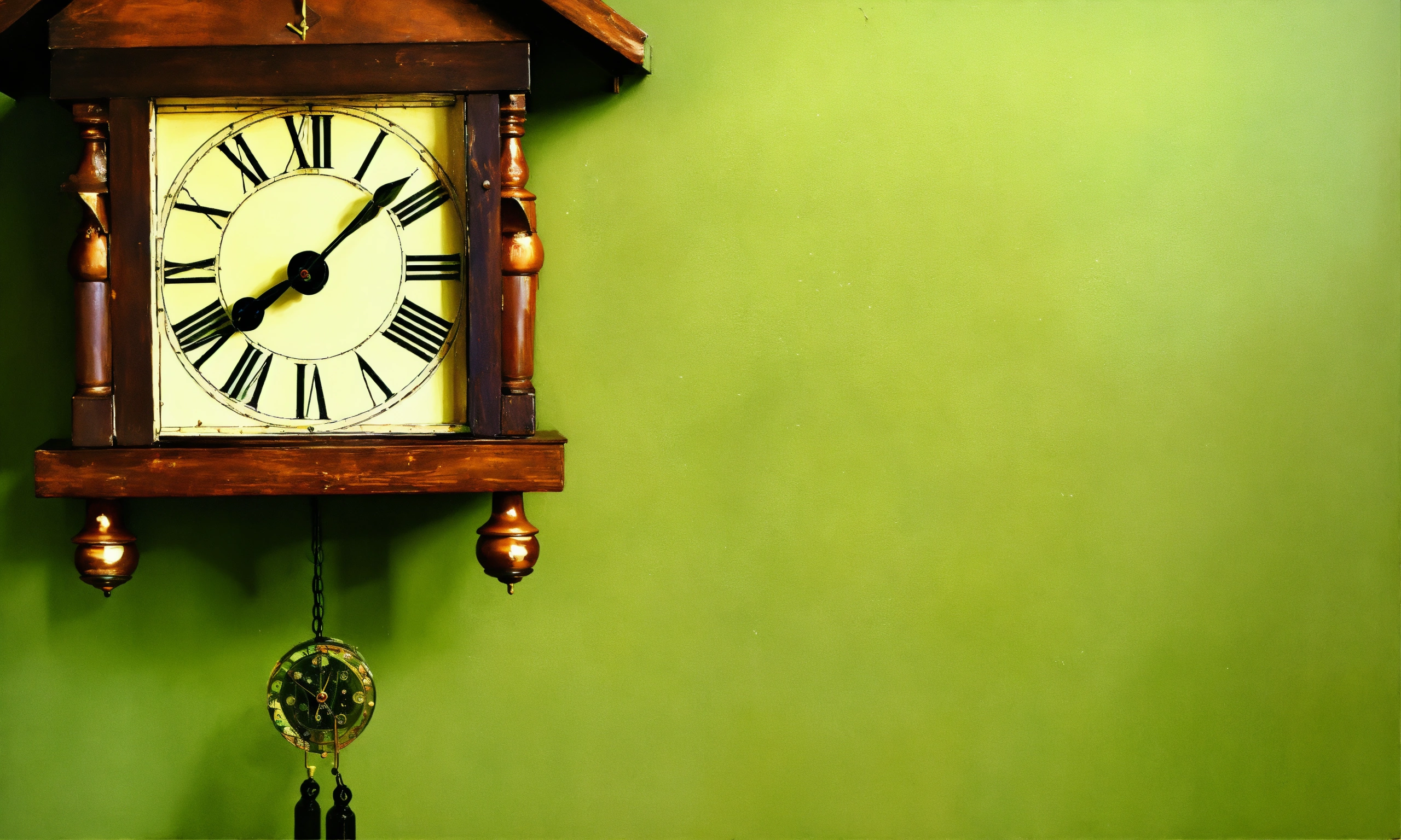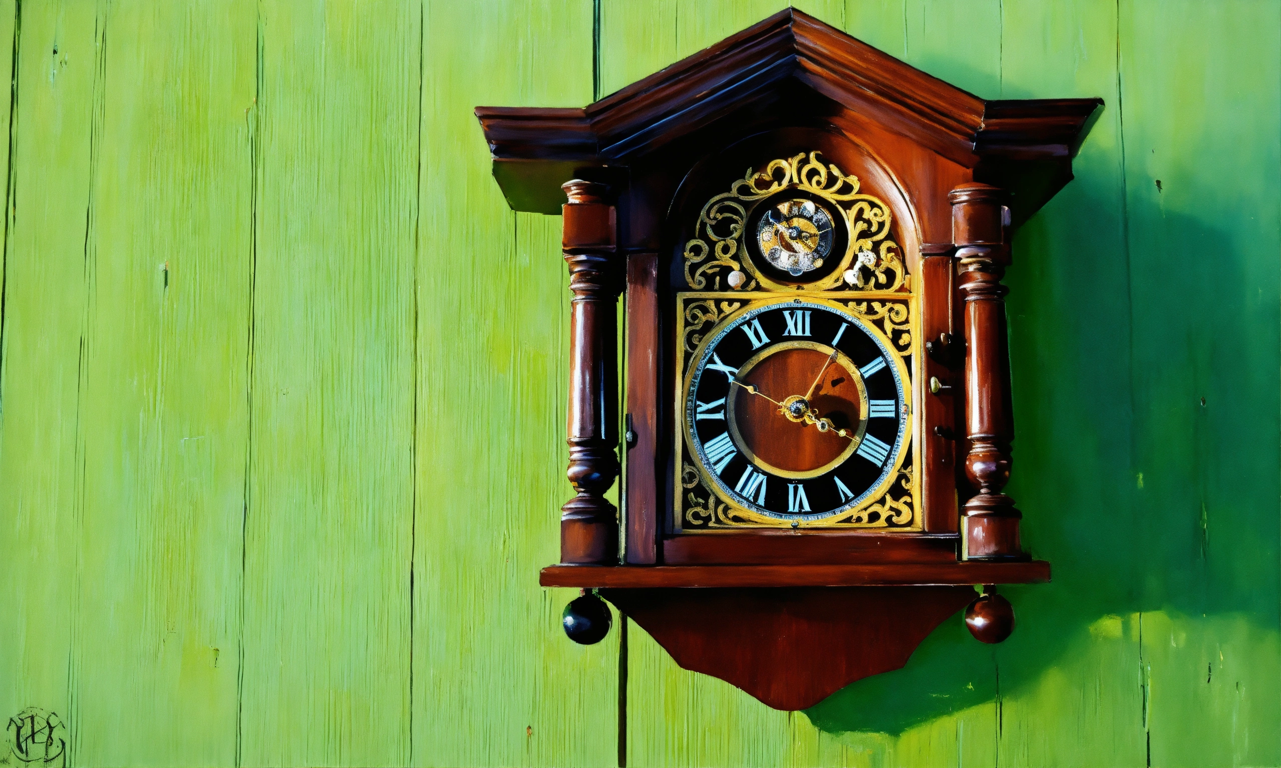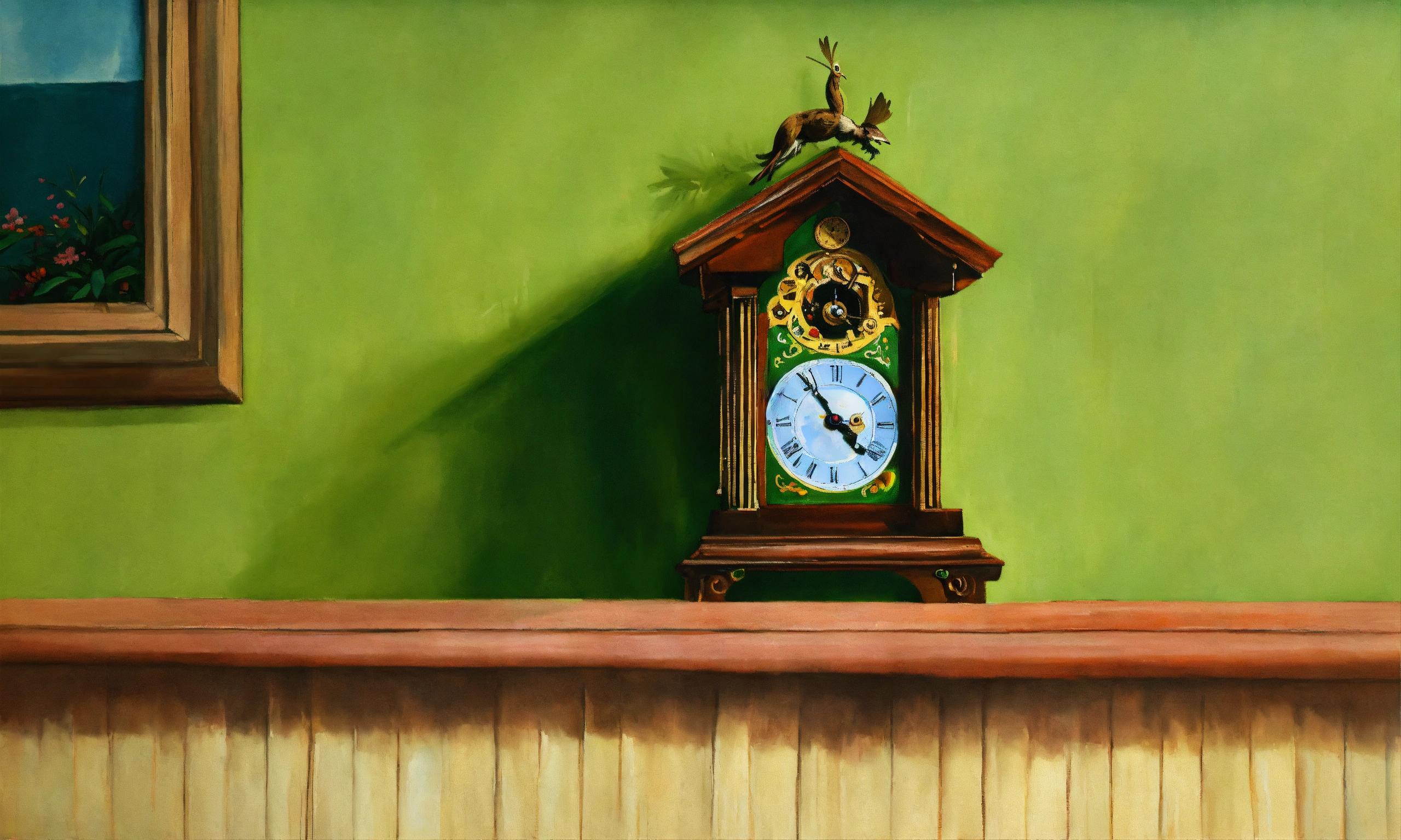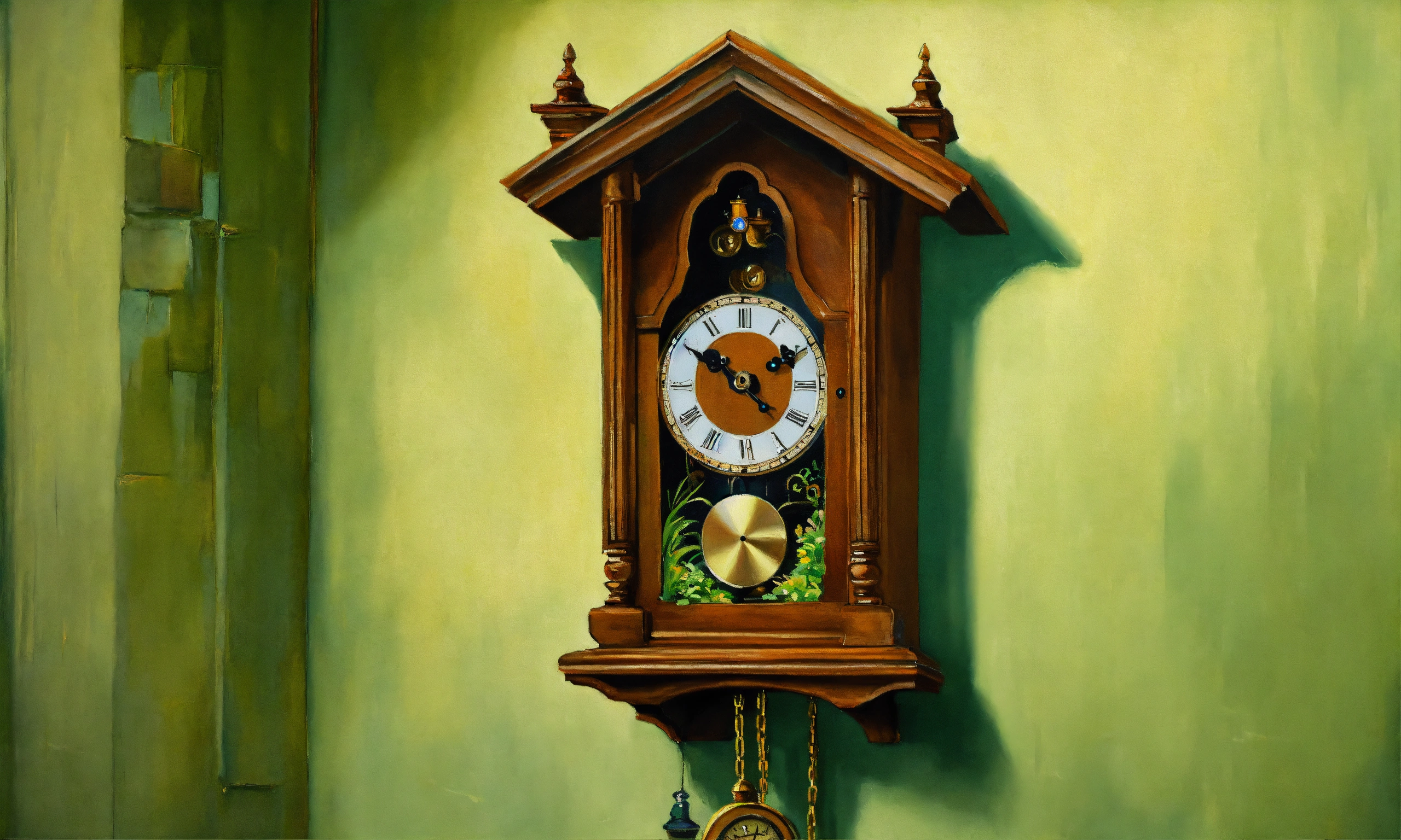 An oil painting of old cuckoo clock on a light green wall, the cuckoo has just come out to sing the hour