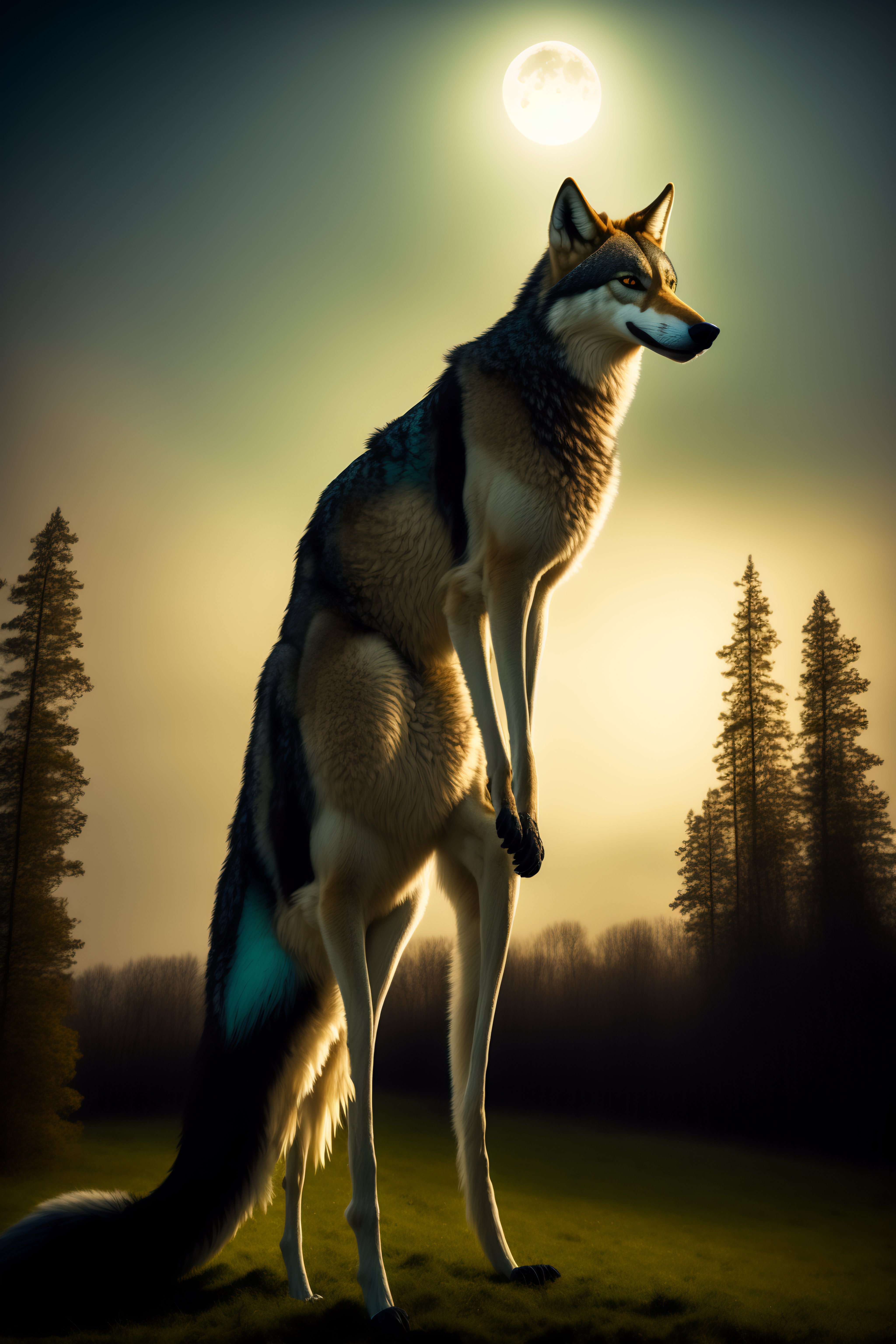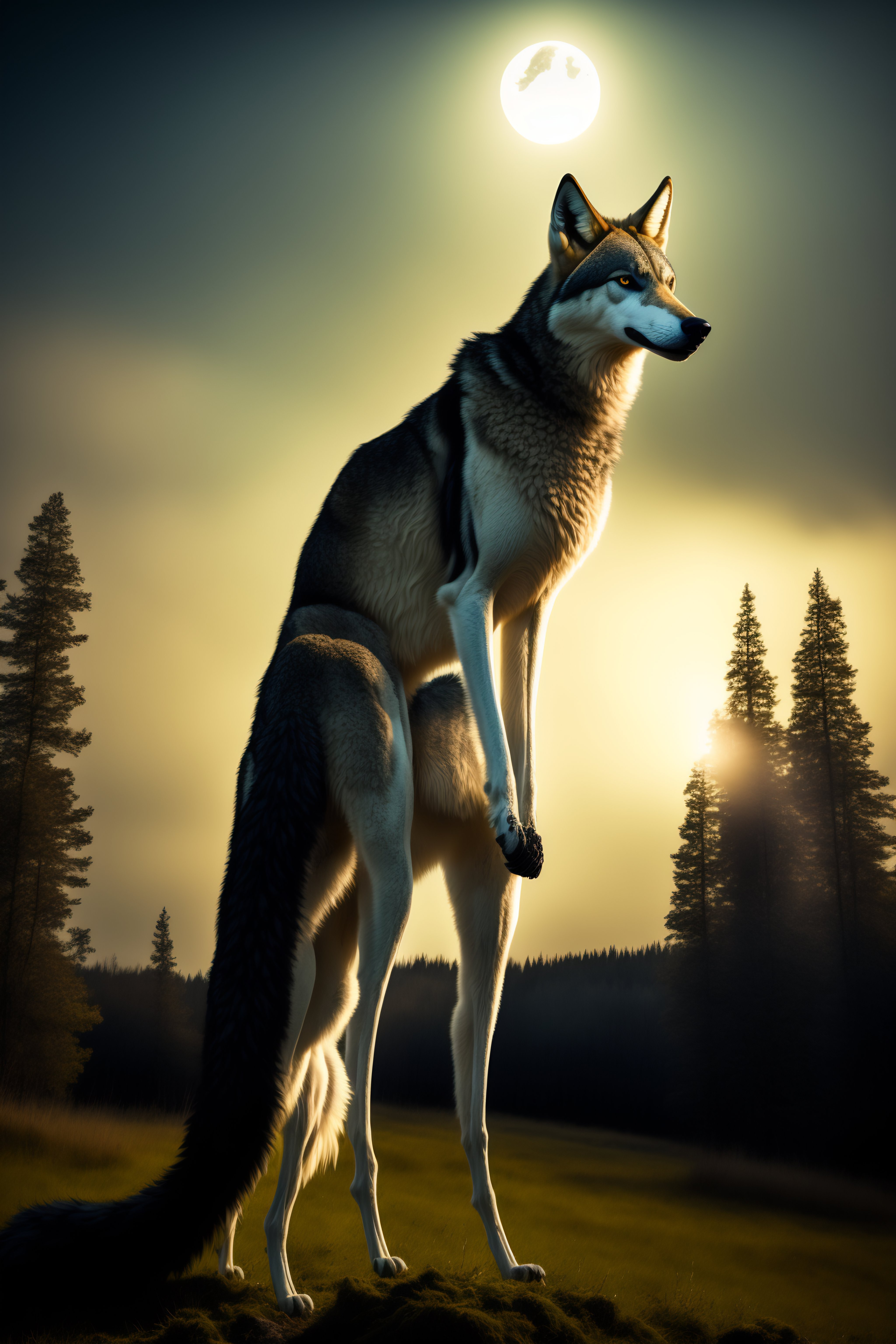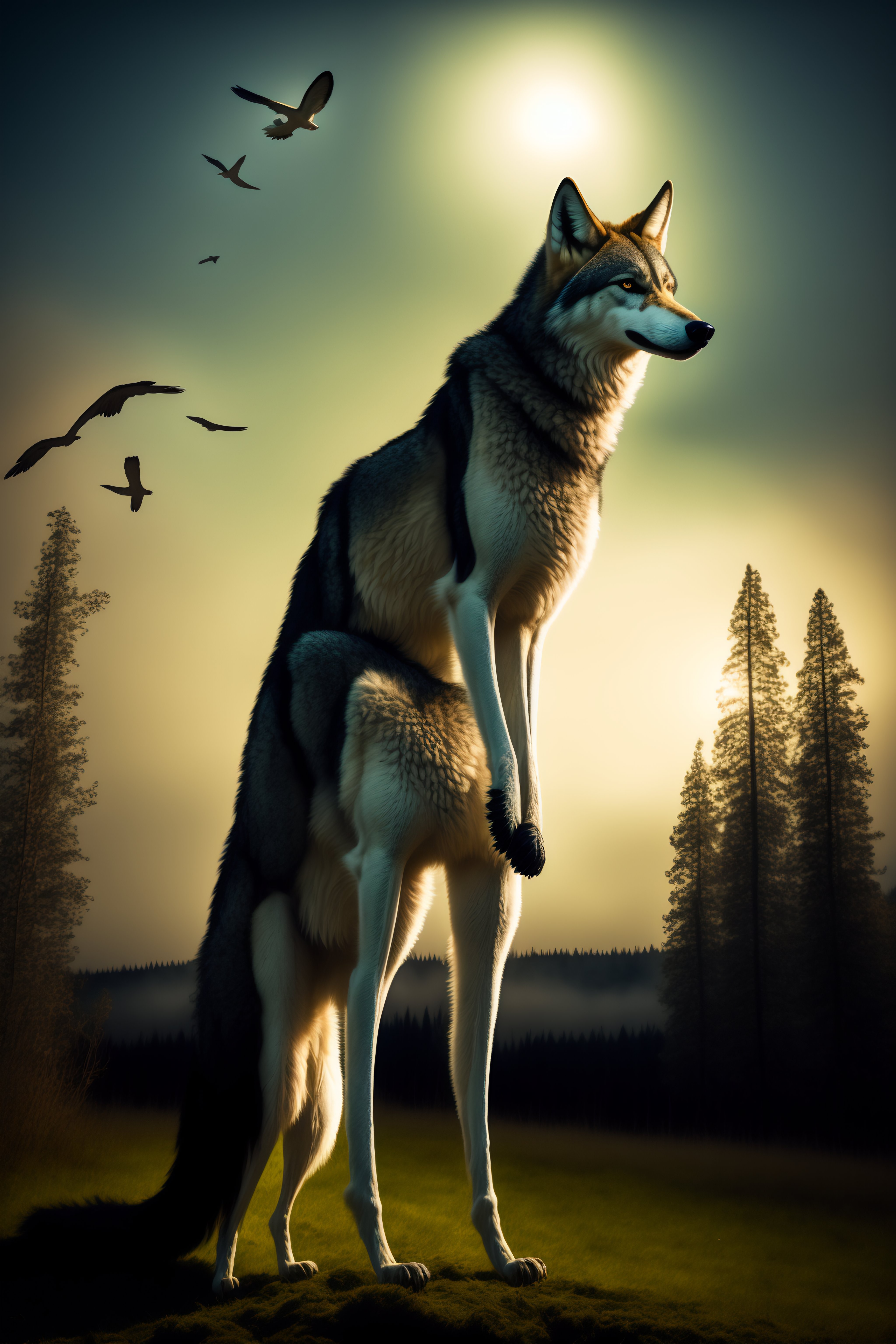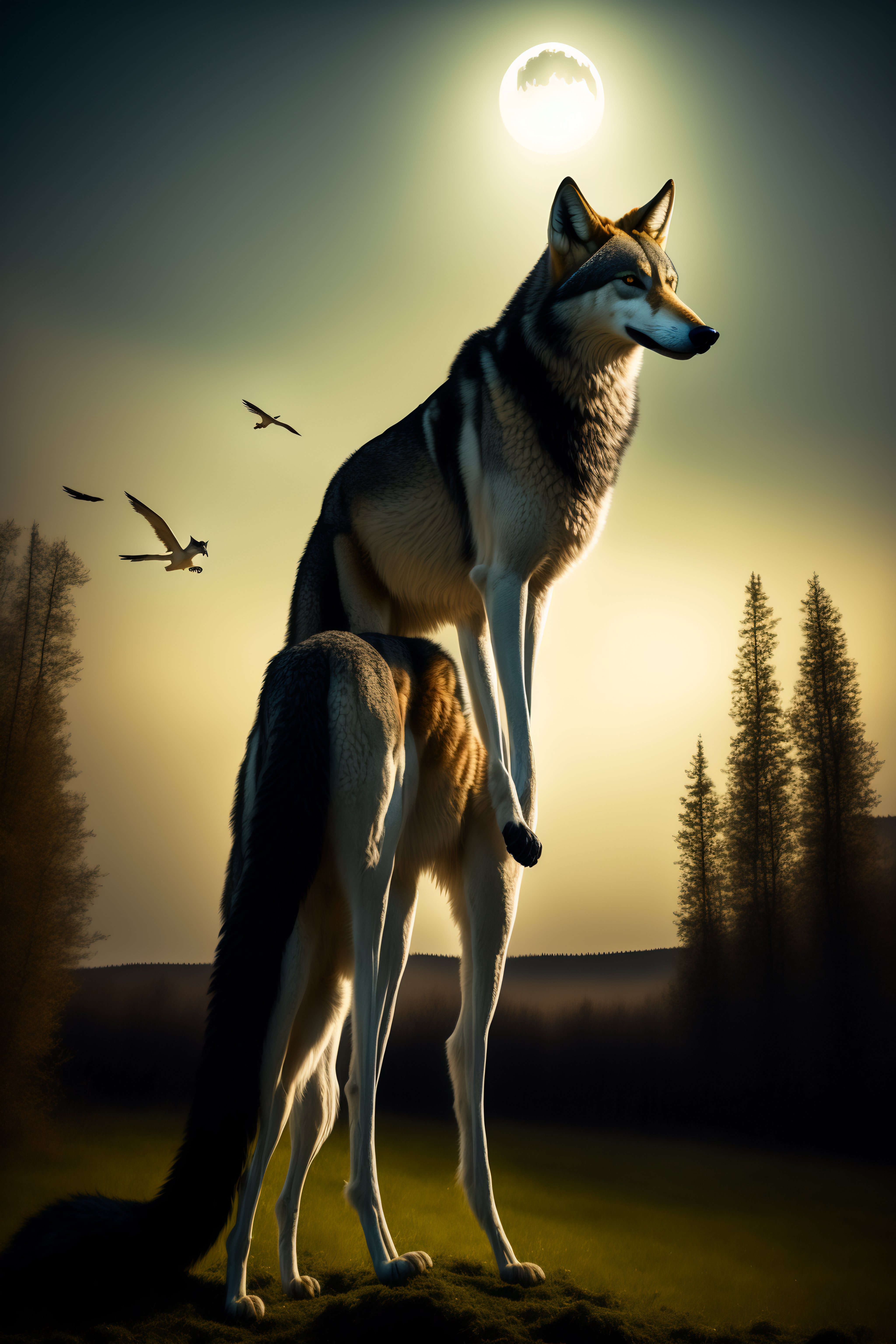 Extremely tall, very emaciated wolf falcon wolf falcon wolf hybrid wearing stilts, dirty feathers, alone and scared, struggling to walk, defeated, sunken green gold wolf eyes, very long tail, cinematic lighting, realistic, fantasy, macabre, backlit by atmospheric moonlight, dark ent dark trees behind her, motion blurred, slightly out of focus, skinny sublimity, alberto giacometti, watercolor of a sculpture, trail cam