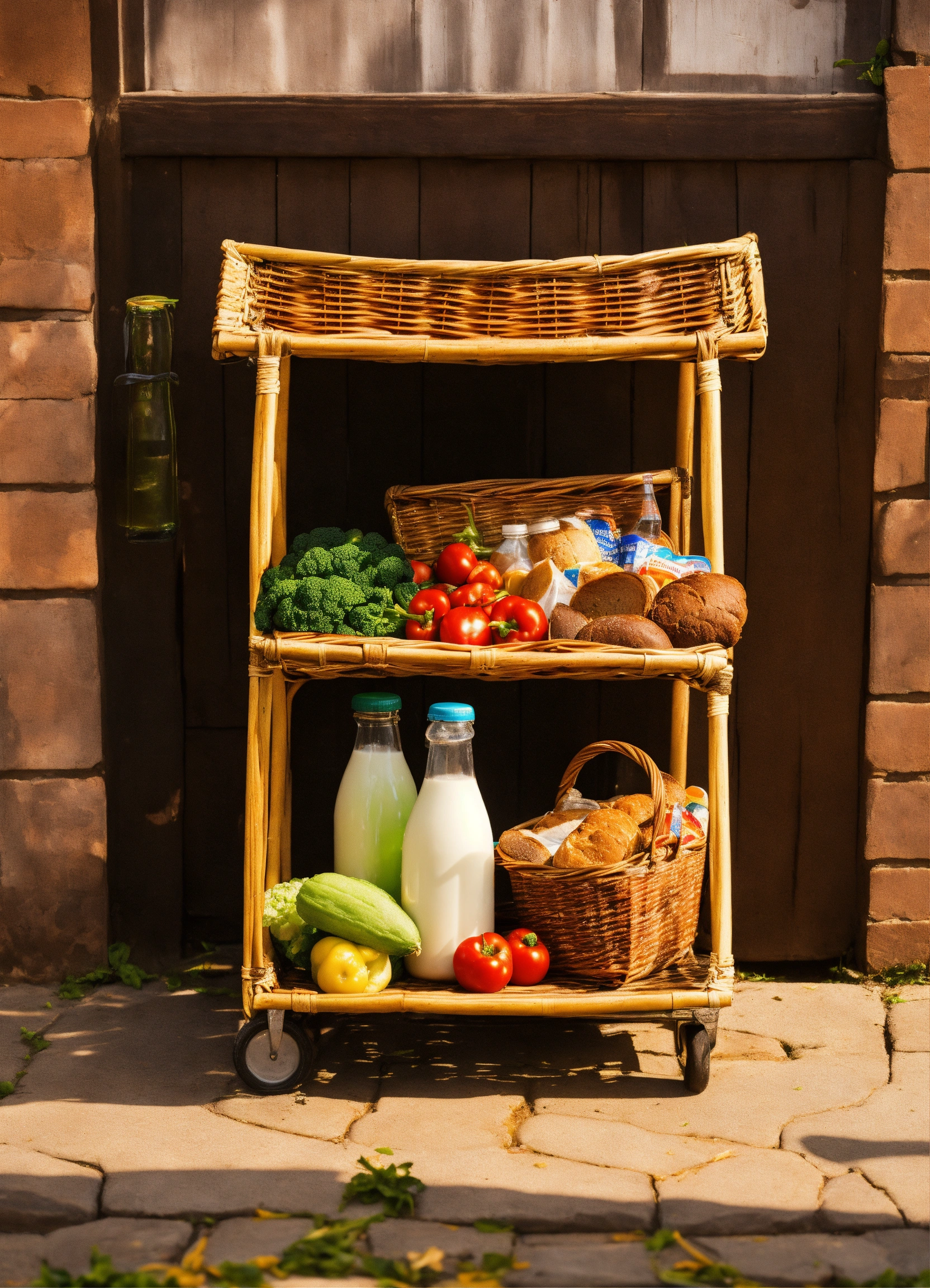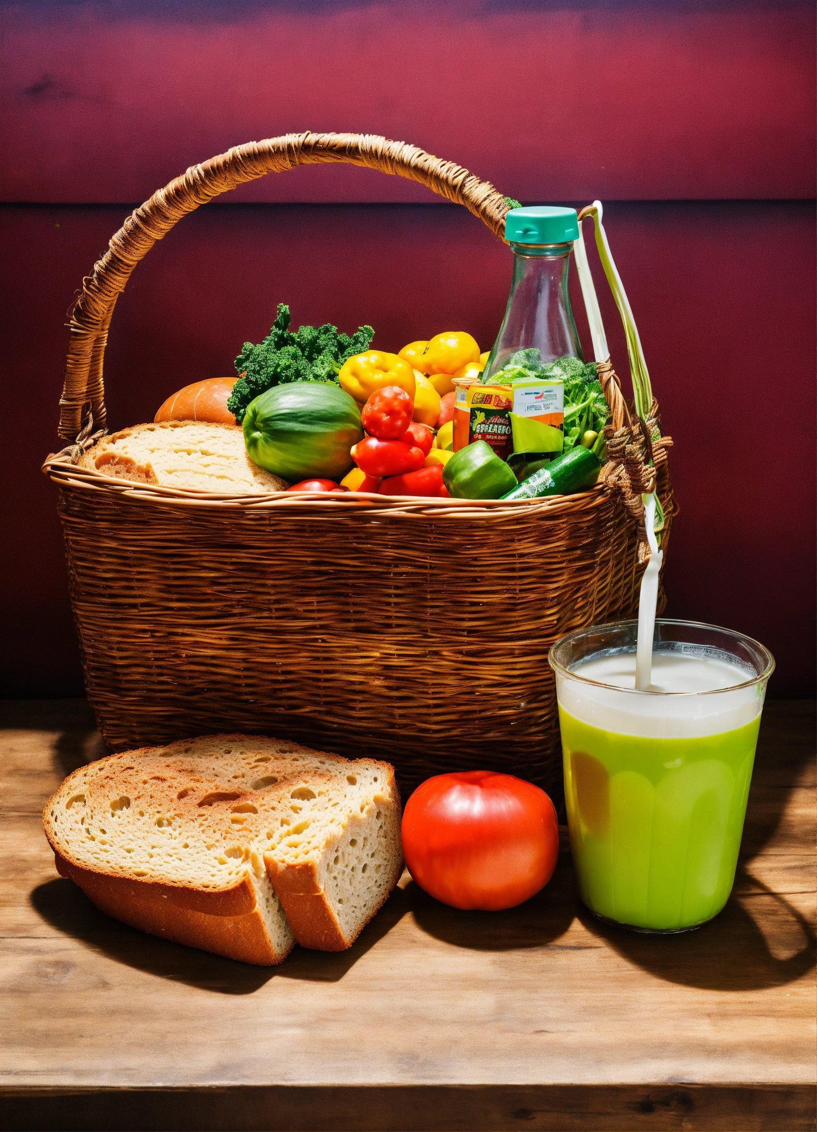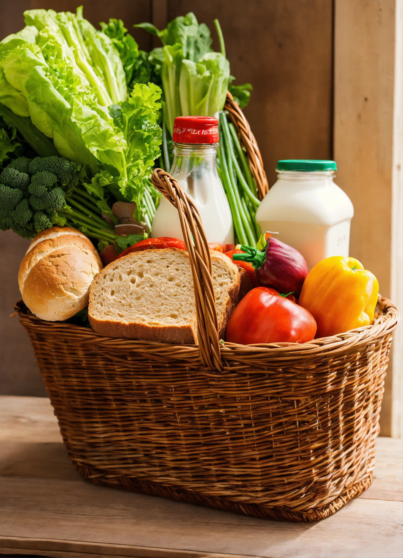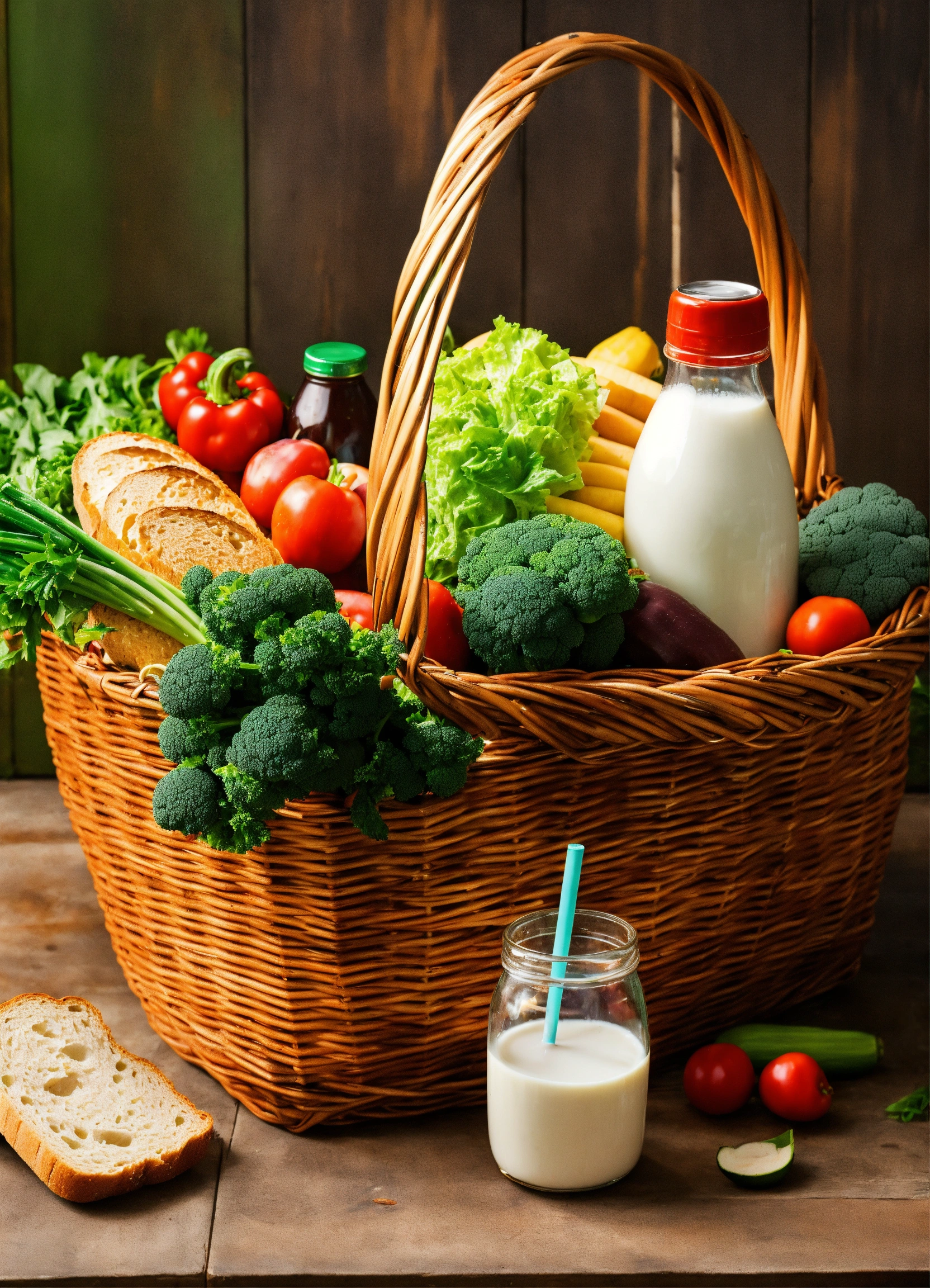 Groceries, assorted milk bottle, bread pack, soft drink, and some assorted vegetables basket. handle required to carry the basket. nothing outside of the basket