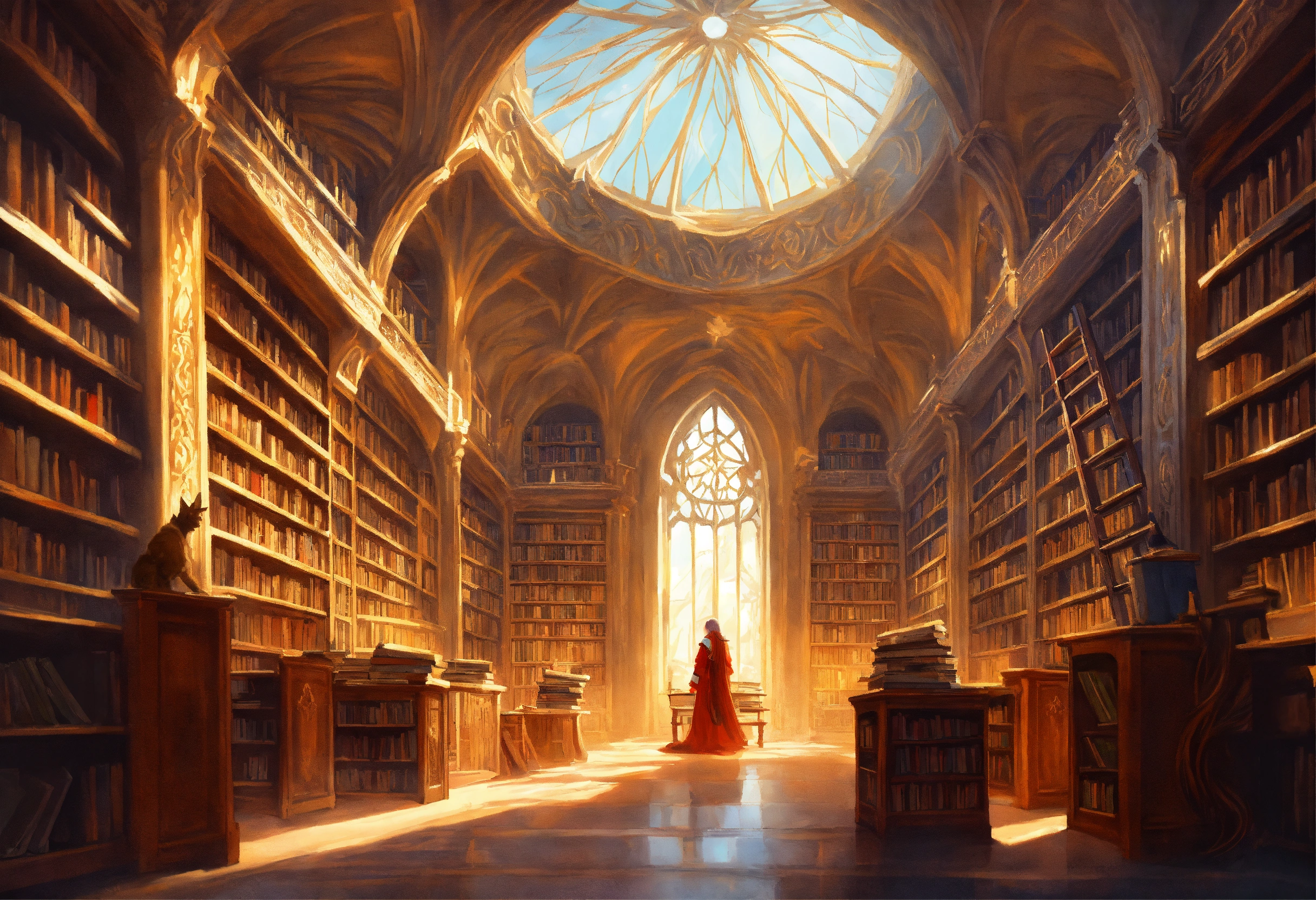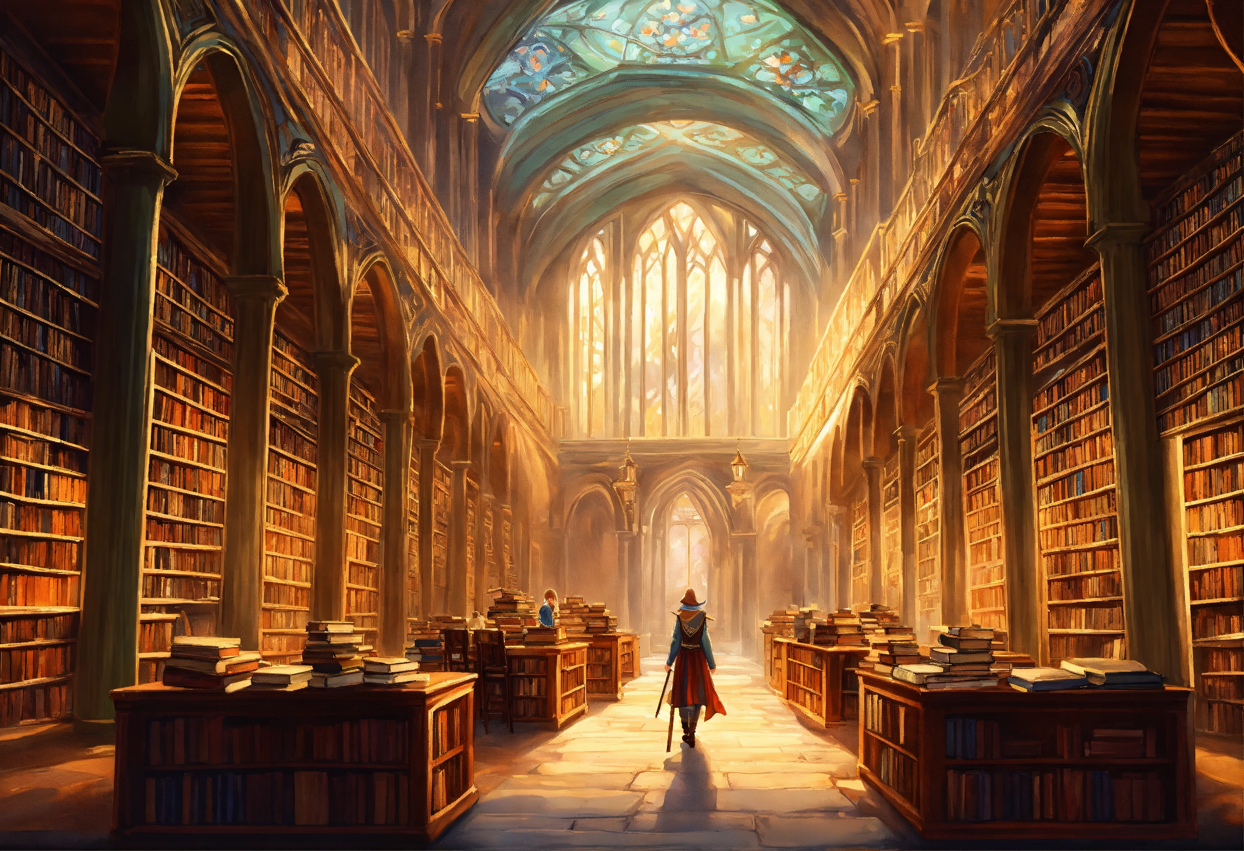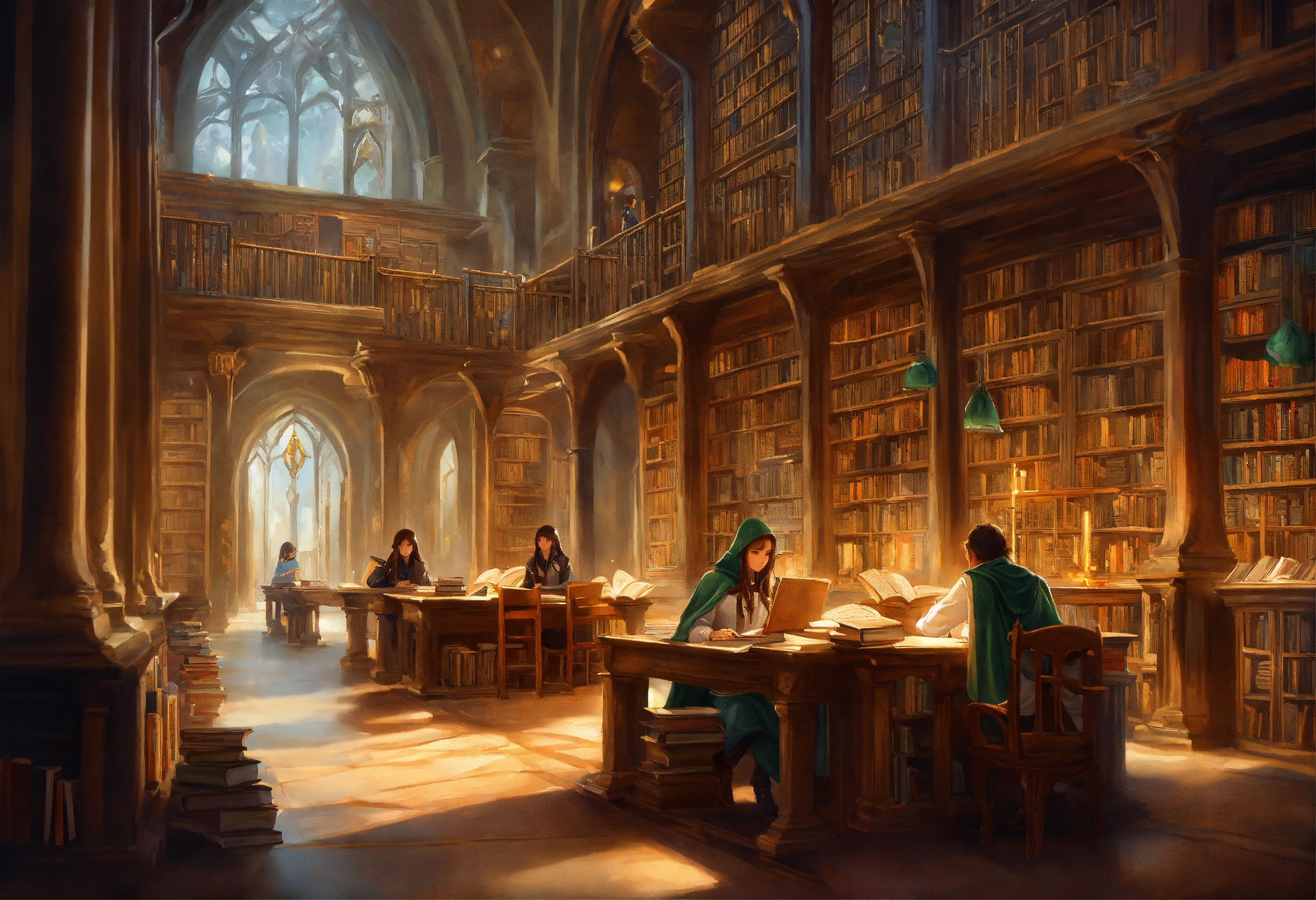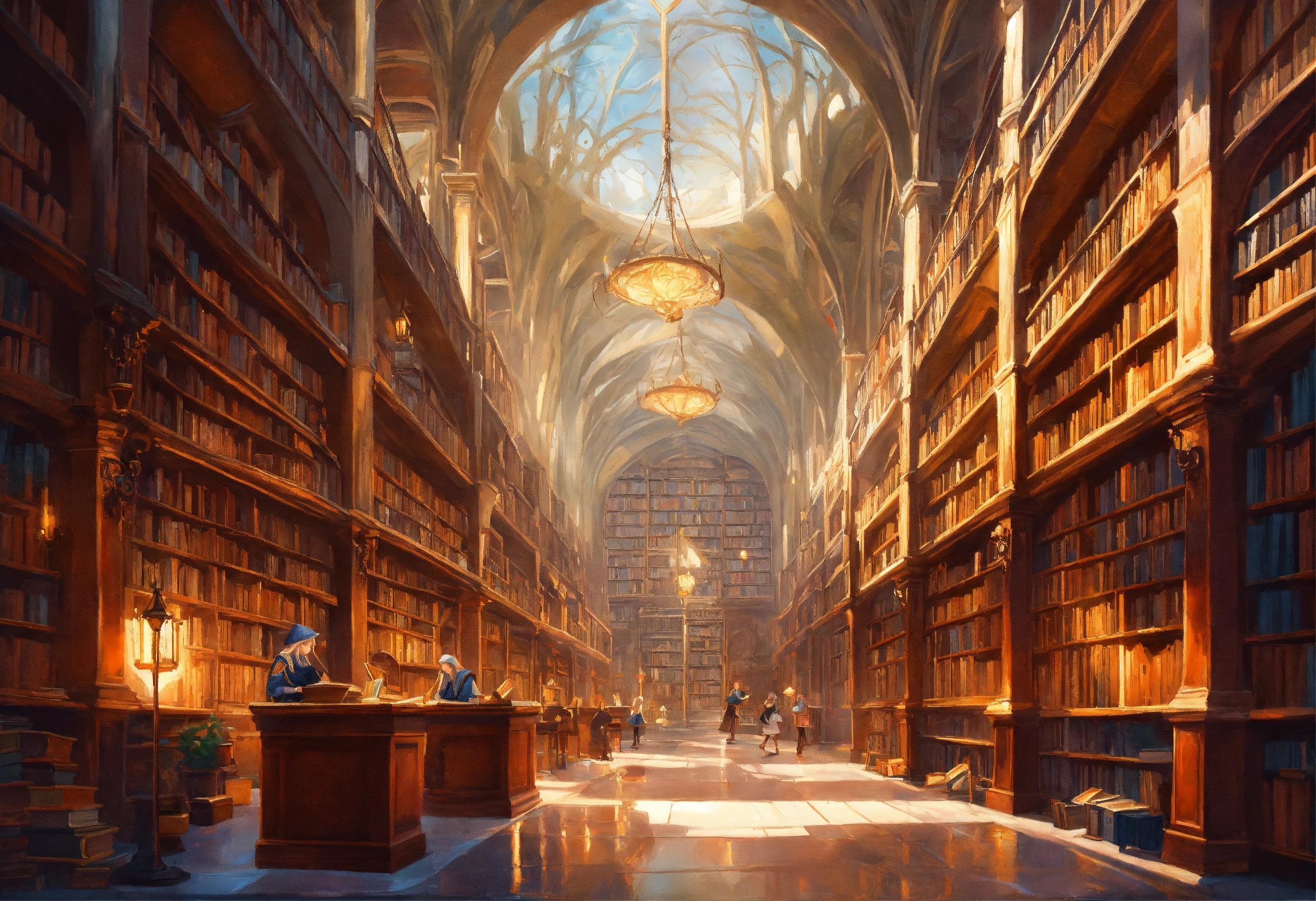 In a fantasy world, students elven are studing in a big library builded with a white stone. the infinity of books are stored in very high shelves. oil on canvas style