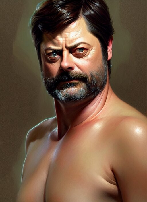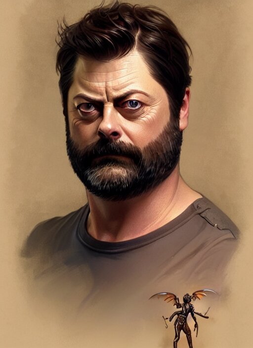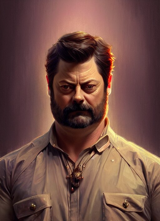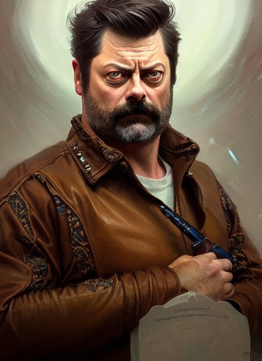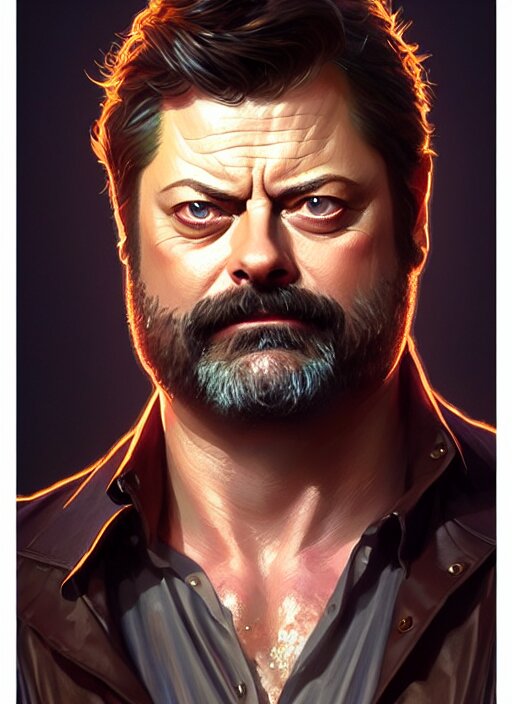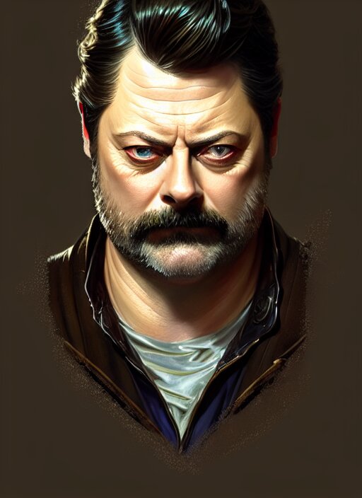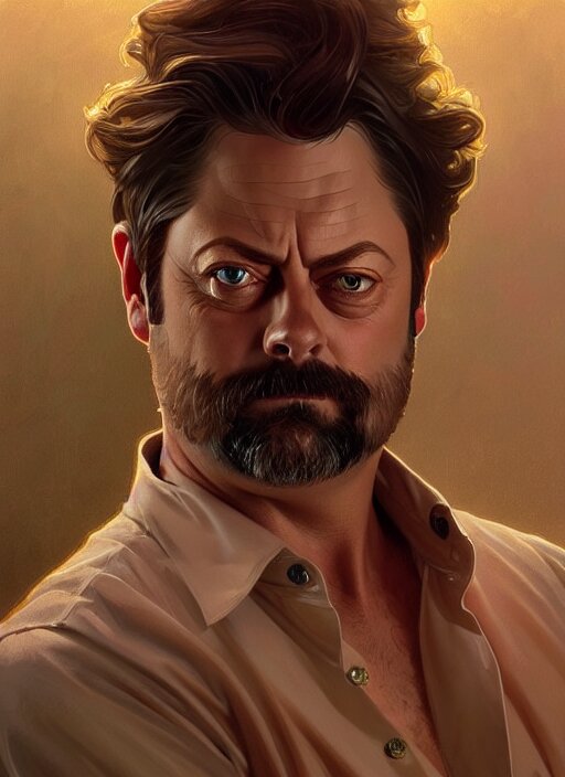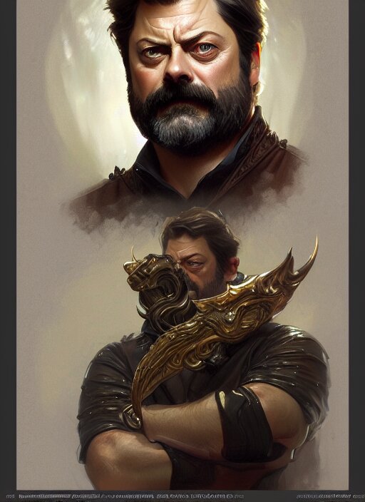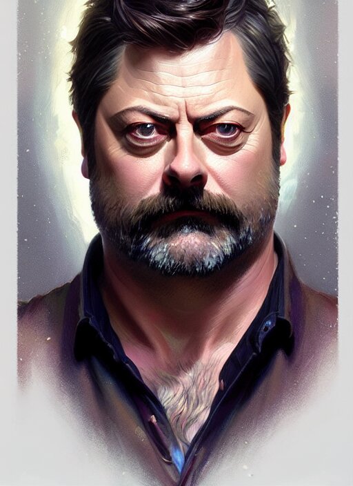 Portrait of nick offerman, d & d, wet, shiny, fantasy, intricate, elegant, highly detailed, digital painting, artstation, concept art, smooth, sharp focus, illustration, art by artgerm and greg rutkowski and alphonse mucha