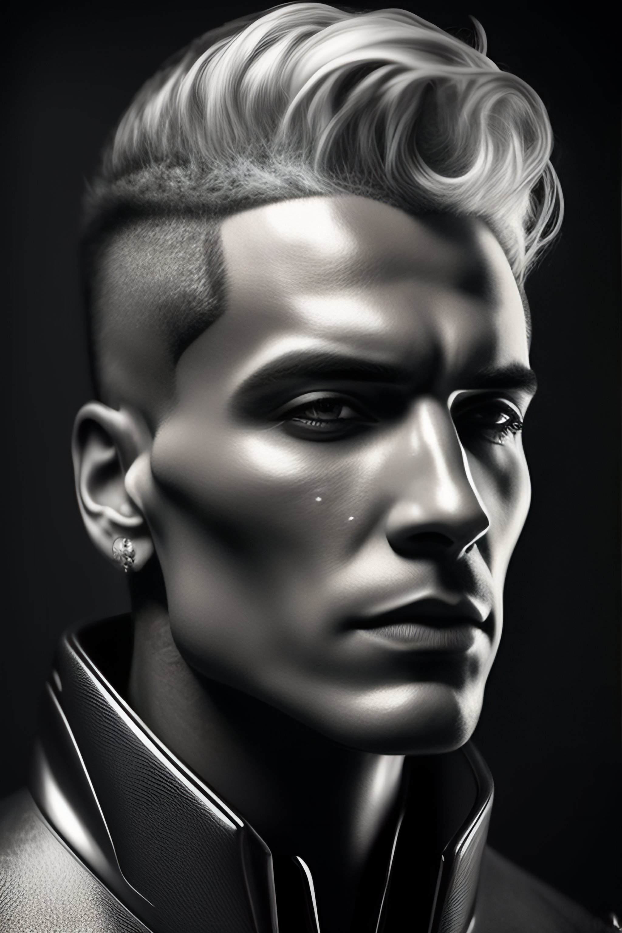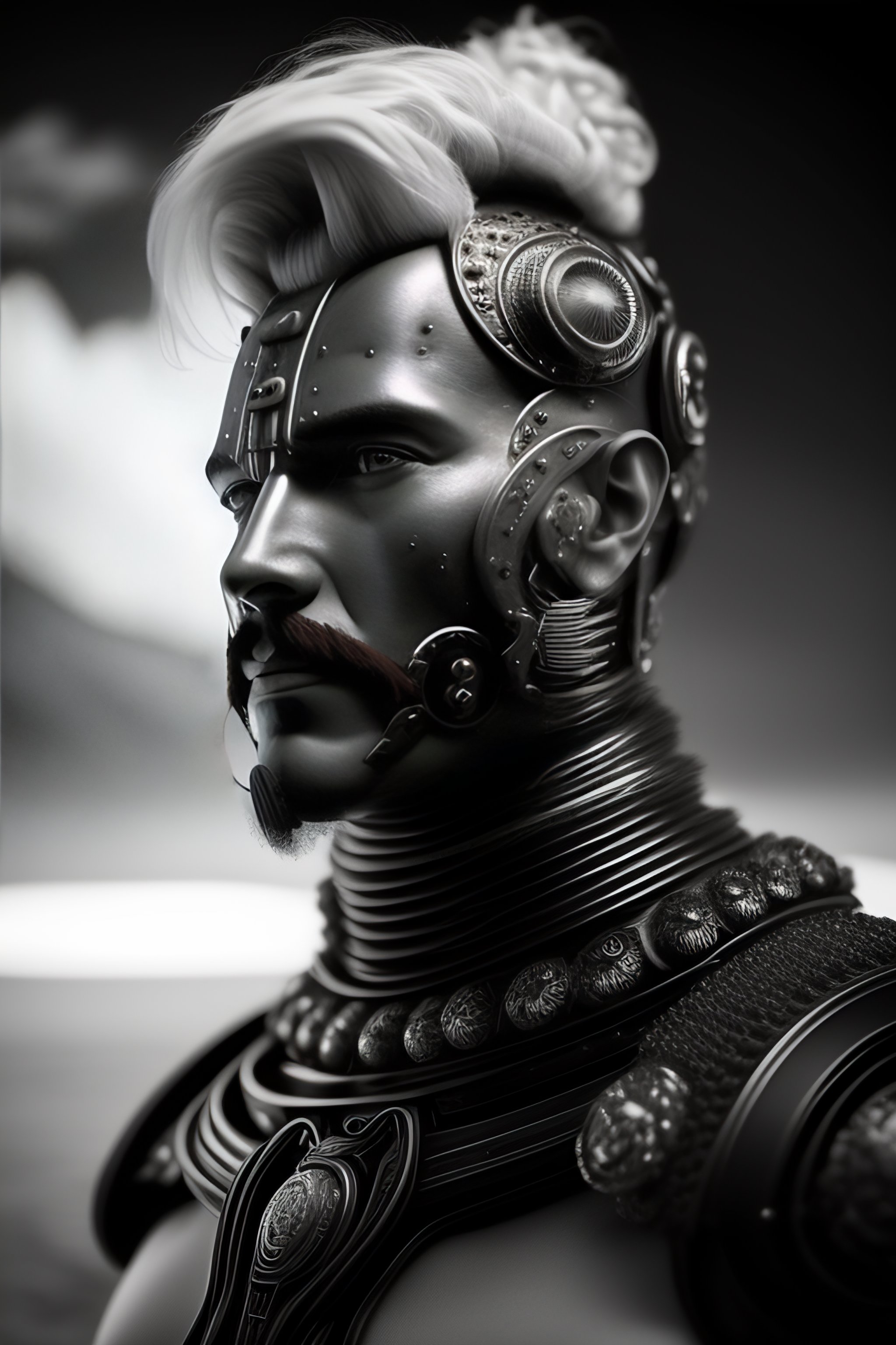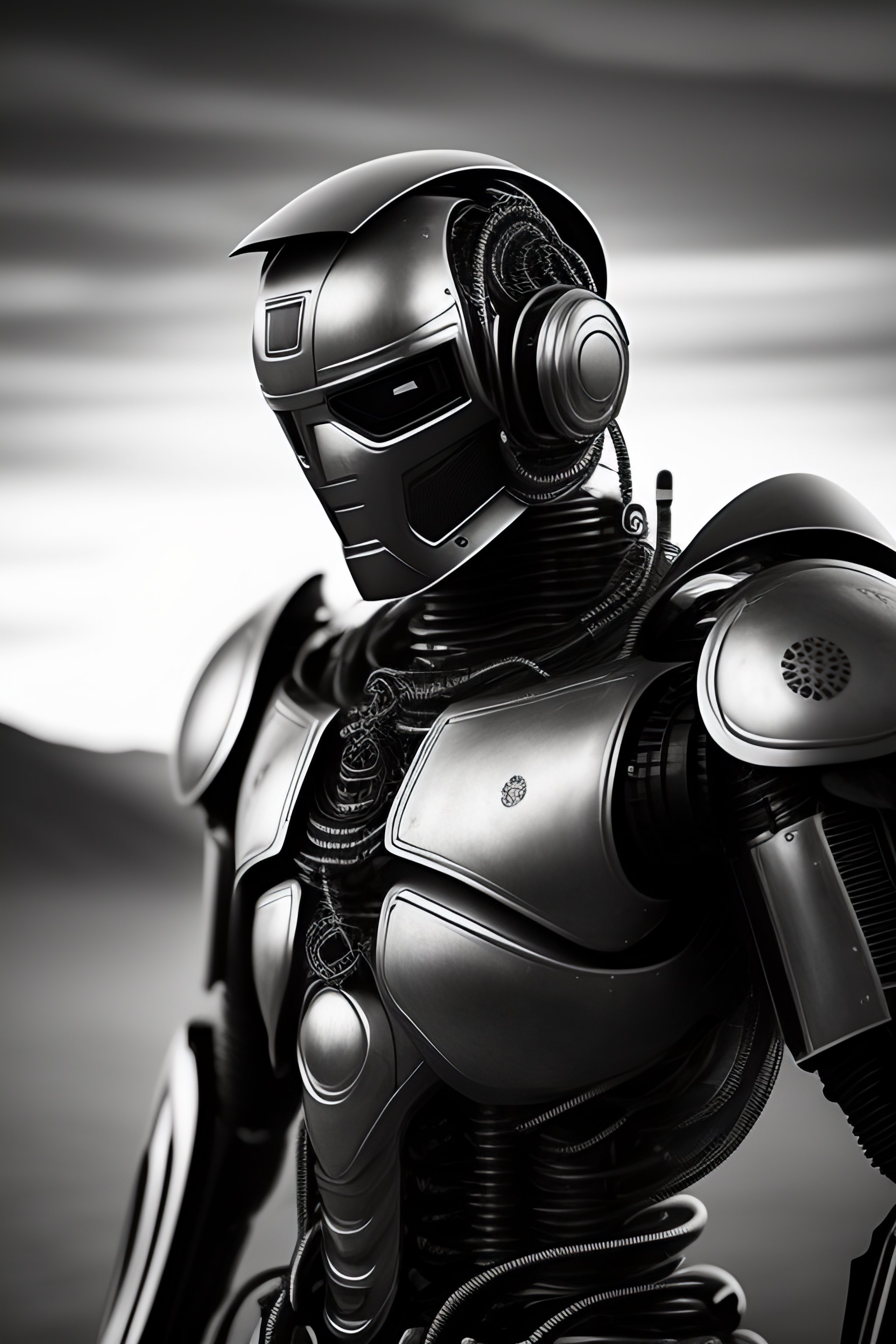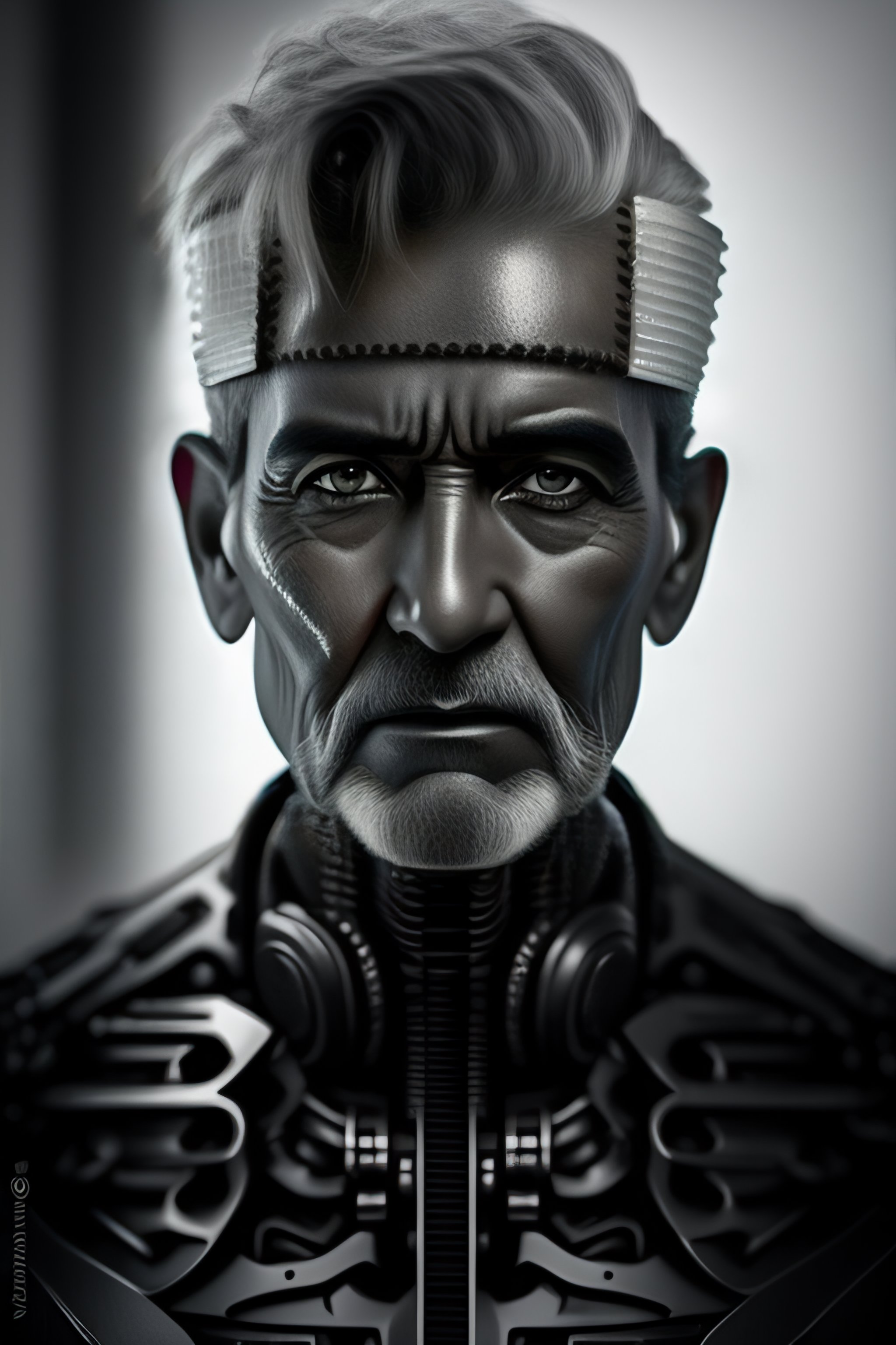 Robot metálico, con oxido y envejecido, cara de hombre viejo con arrugas, sin pelo, con detalles de tornillos, imagen en blanco y negro