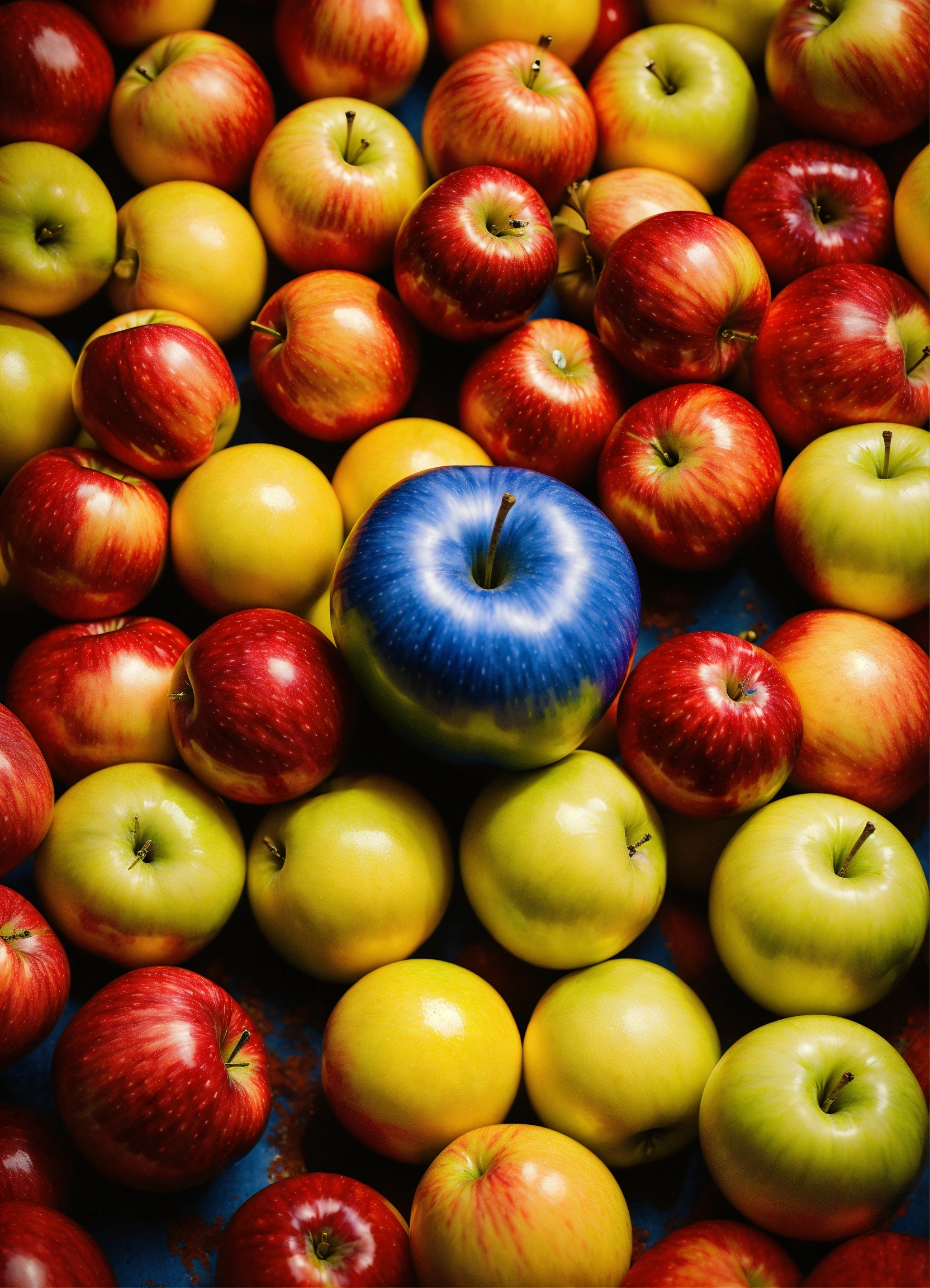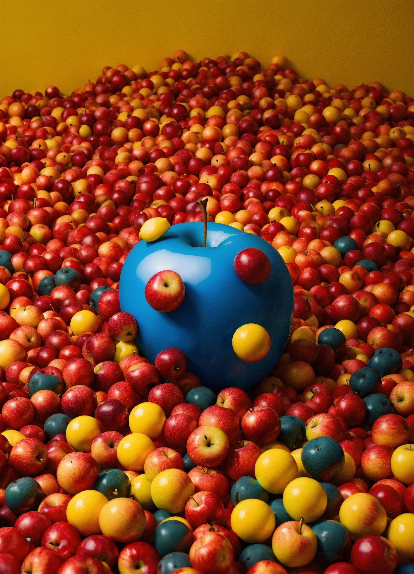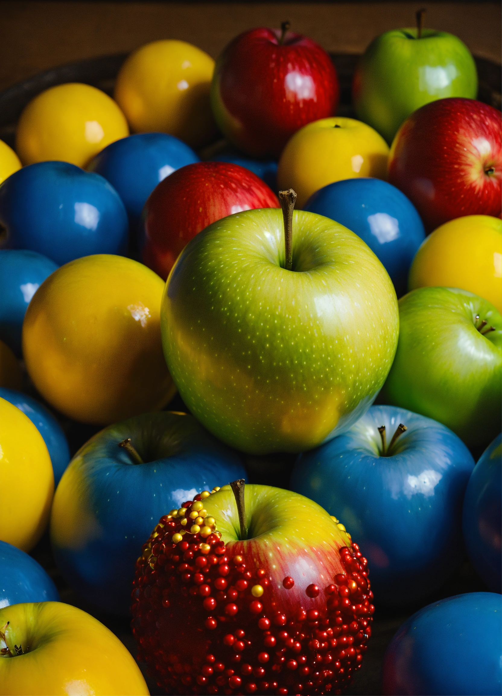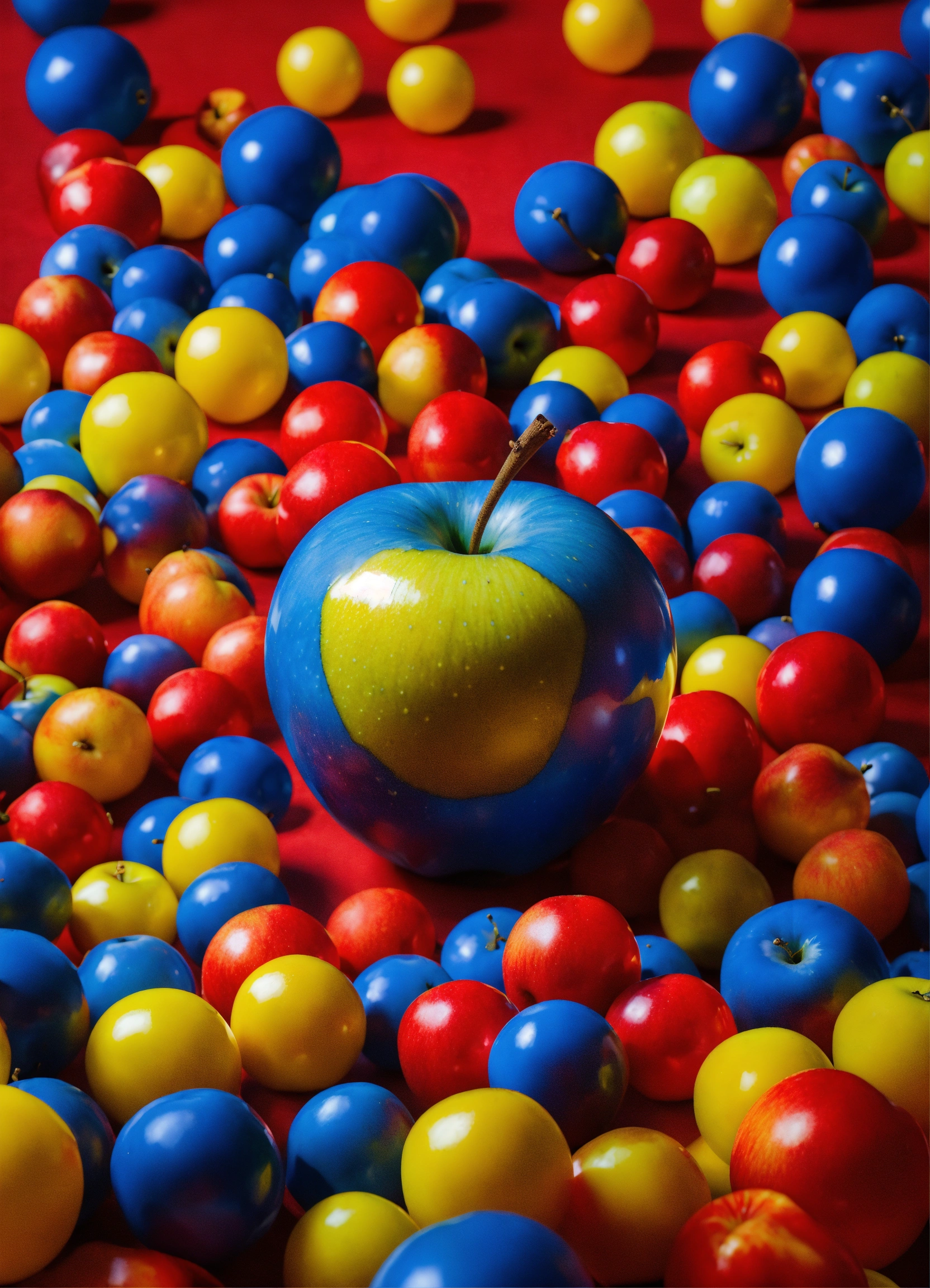 A blue apple in the centre of the shot with weird yellow and red balls inside