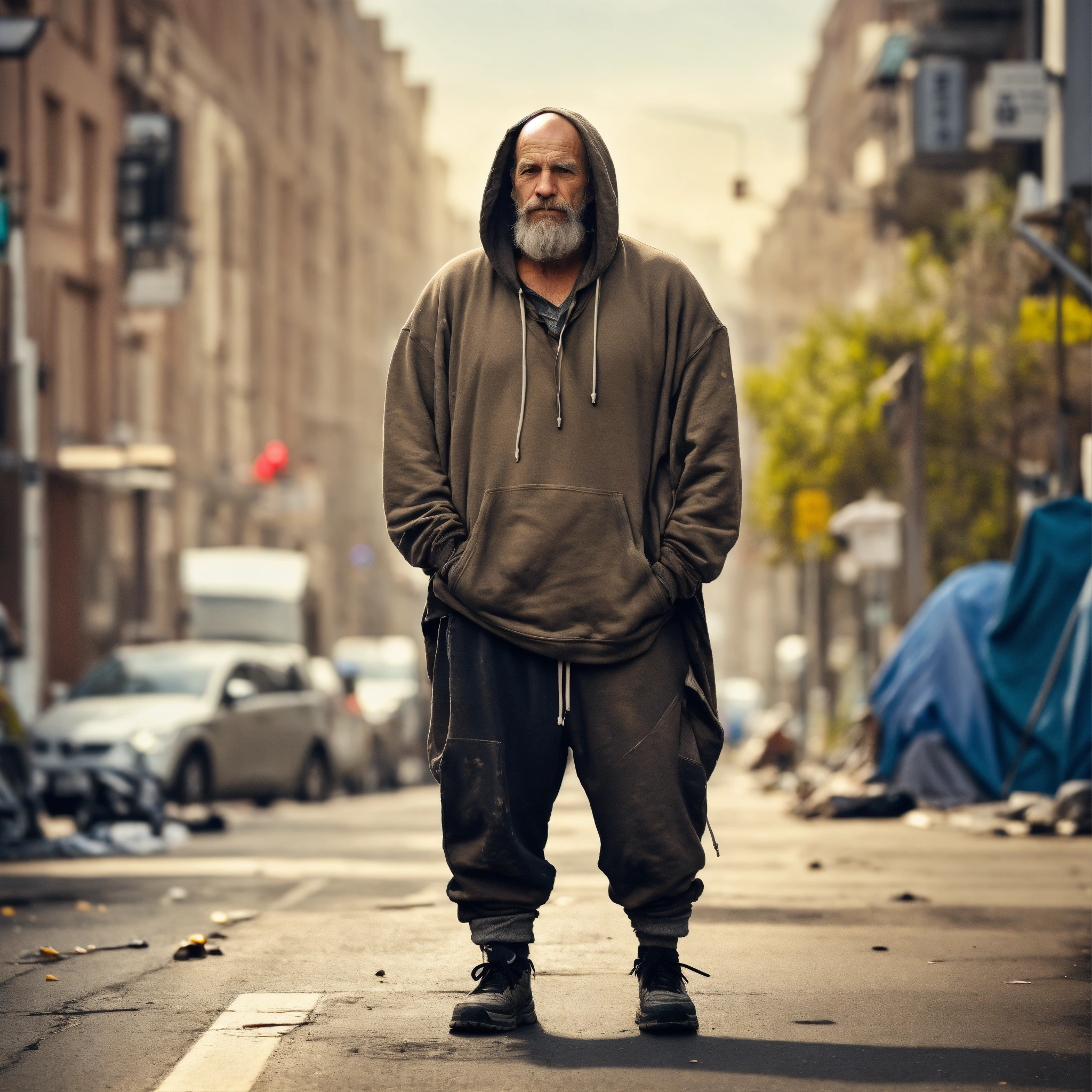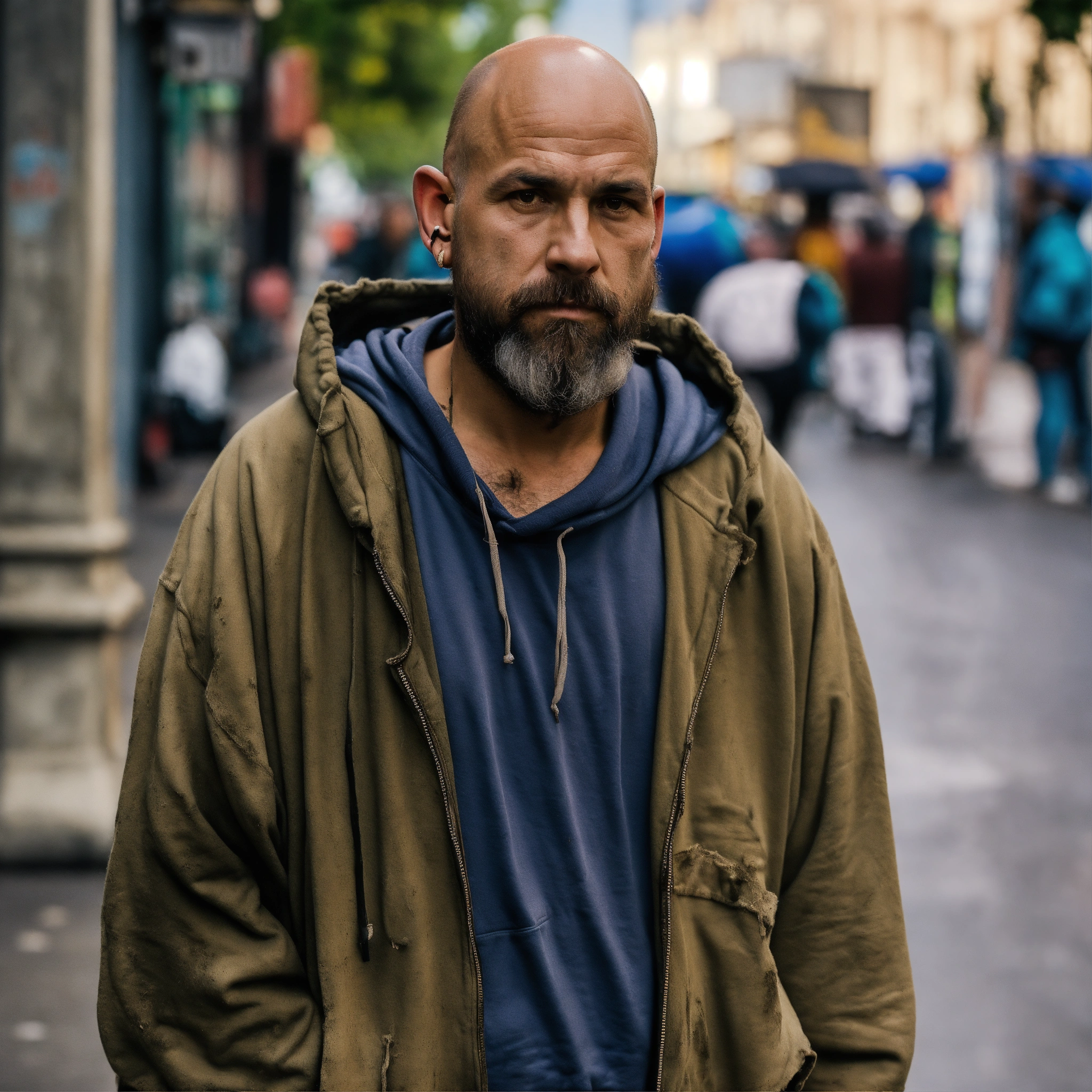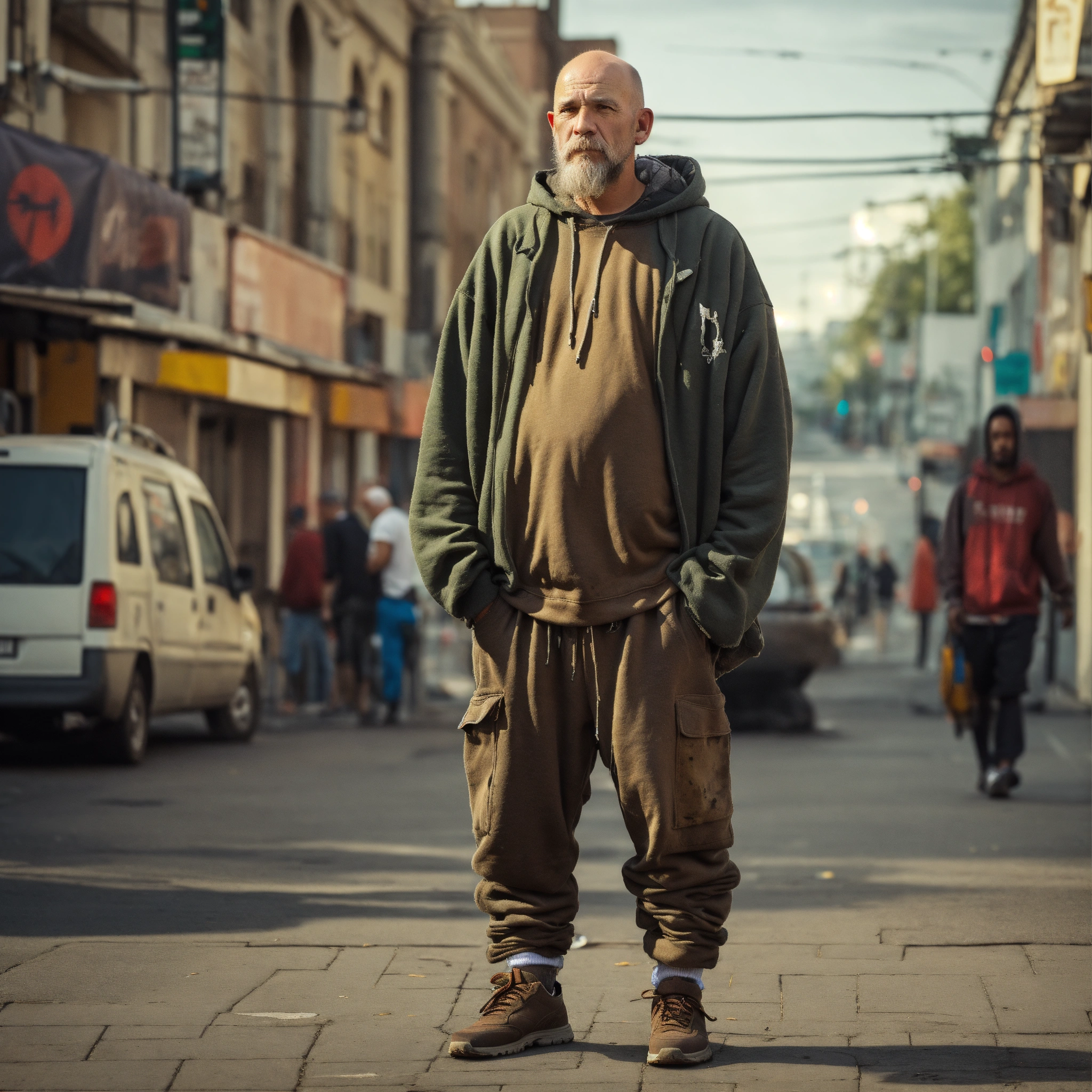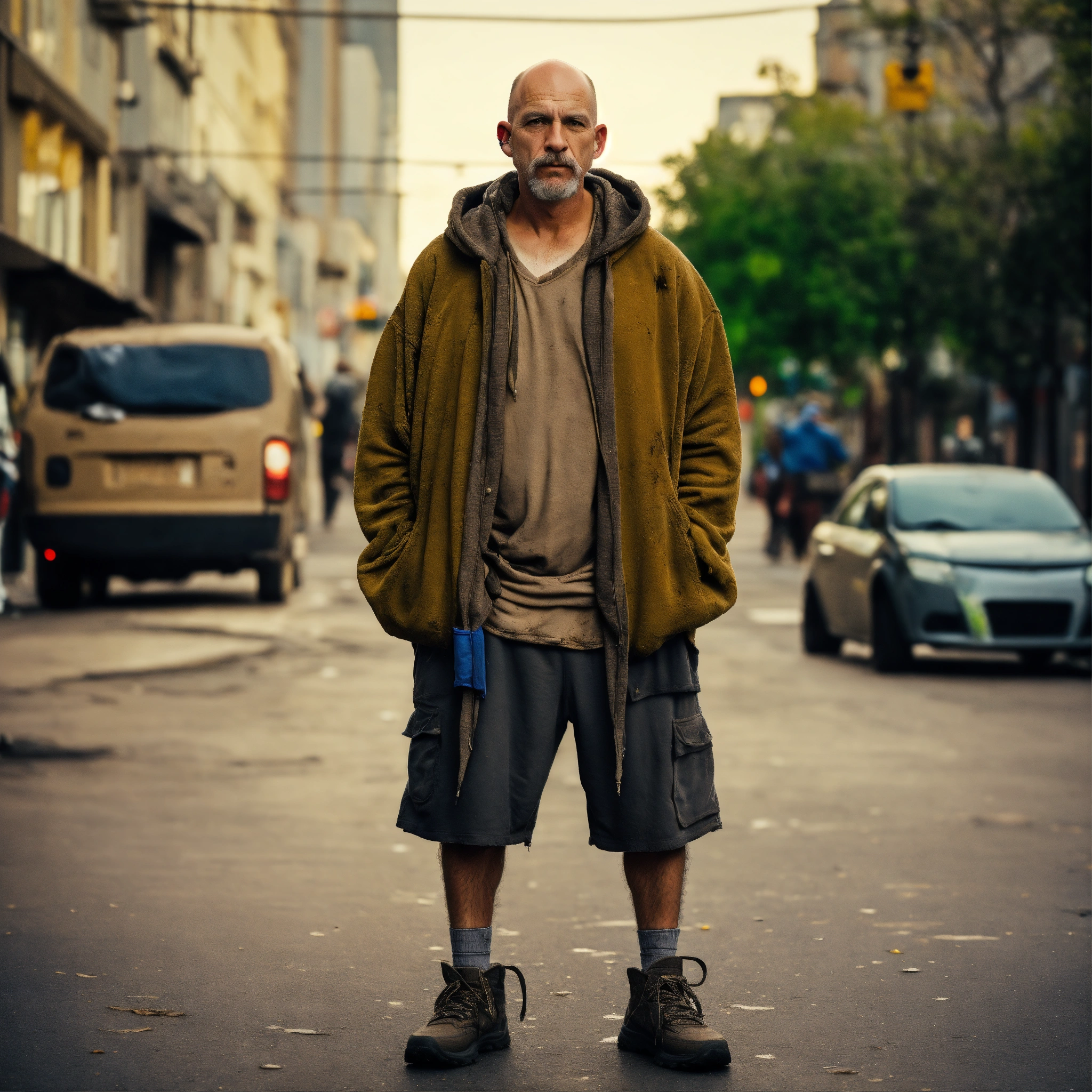 A huge bald homeless man, small goatee, large ears, wearing dirty shorts and a hoodie, standing in the street