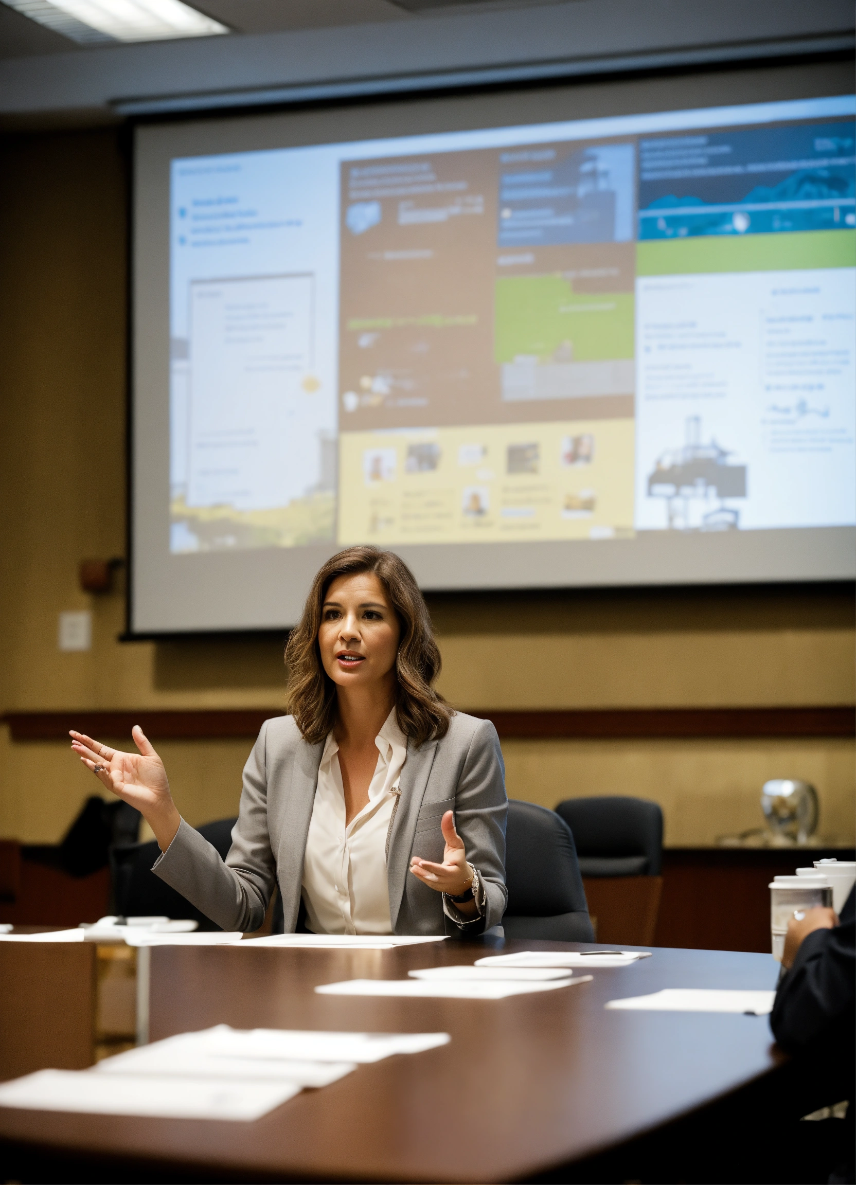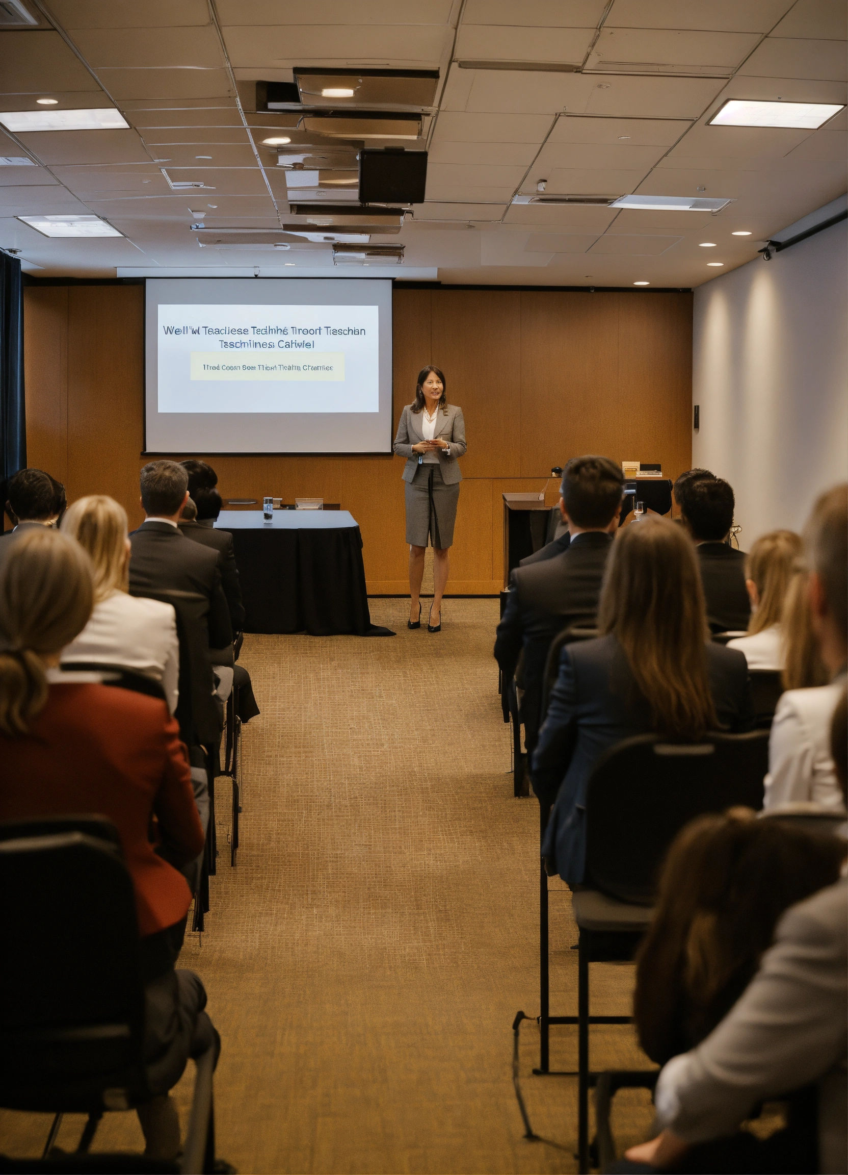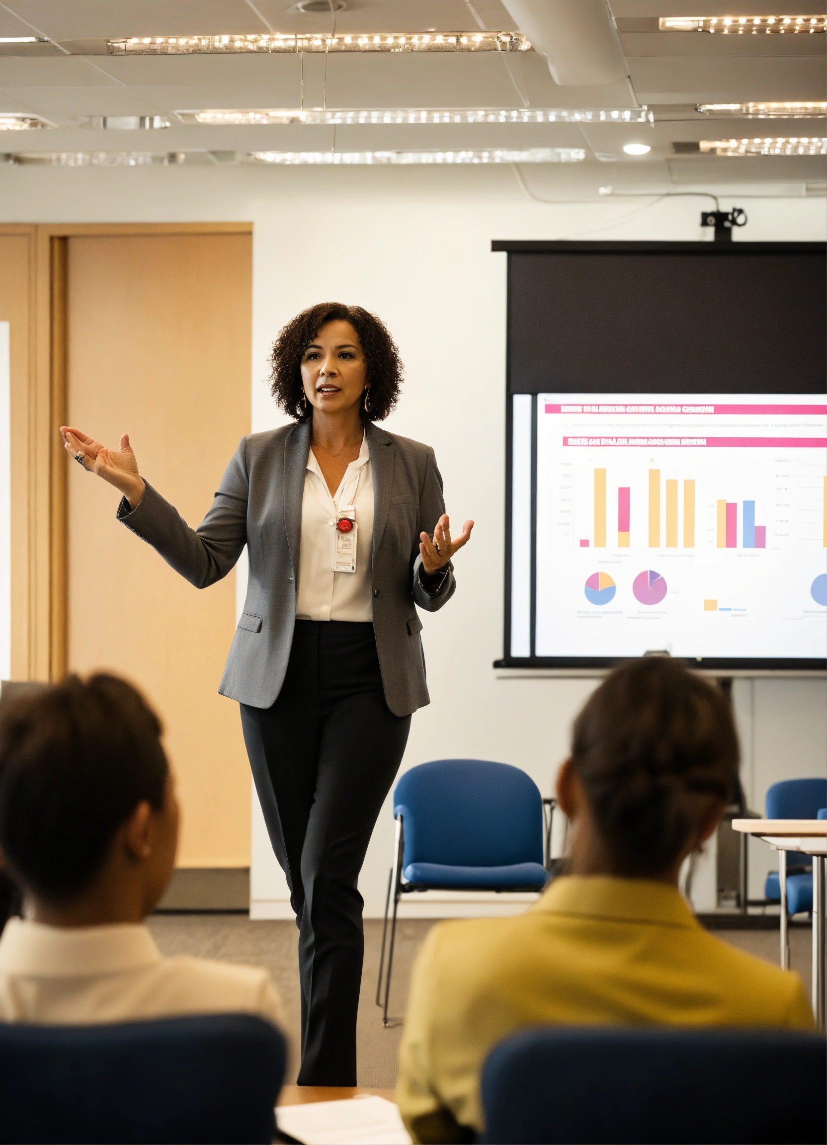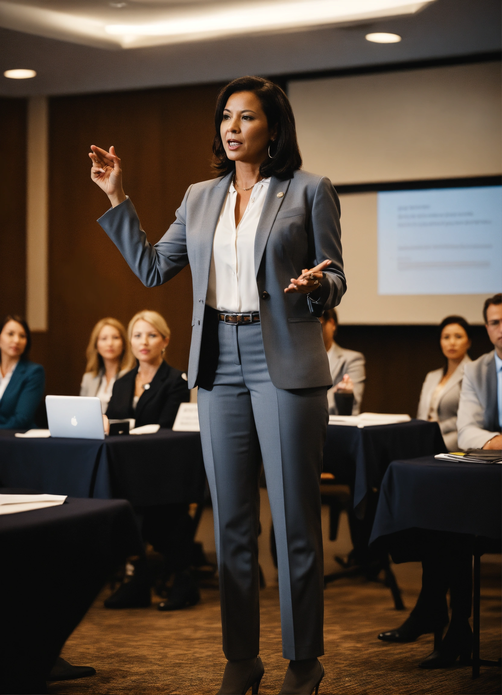 A career coach stands at the front of a well-lit training center, giving a presentation to an audience of 15 business professionals sitting at tables. the coach is in her late 40s with shoulder length hair, wearing a gray blazer, white blouse, and dark slacks. she gestures confidently with one hand raised as she discusses leadership techniques on a large screen behind her showing her presentation slides. the audience is dressed in business formal attire, listening attentively and taking notes. the room has floor to ceiling windows on one side showing a view of a training center. the image is perfectly focused and detailed, capturing the coach's engaging presenting style and the audience's interest.