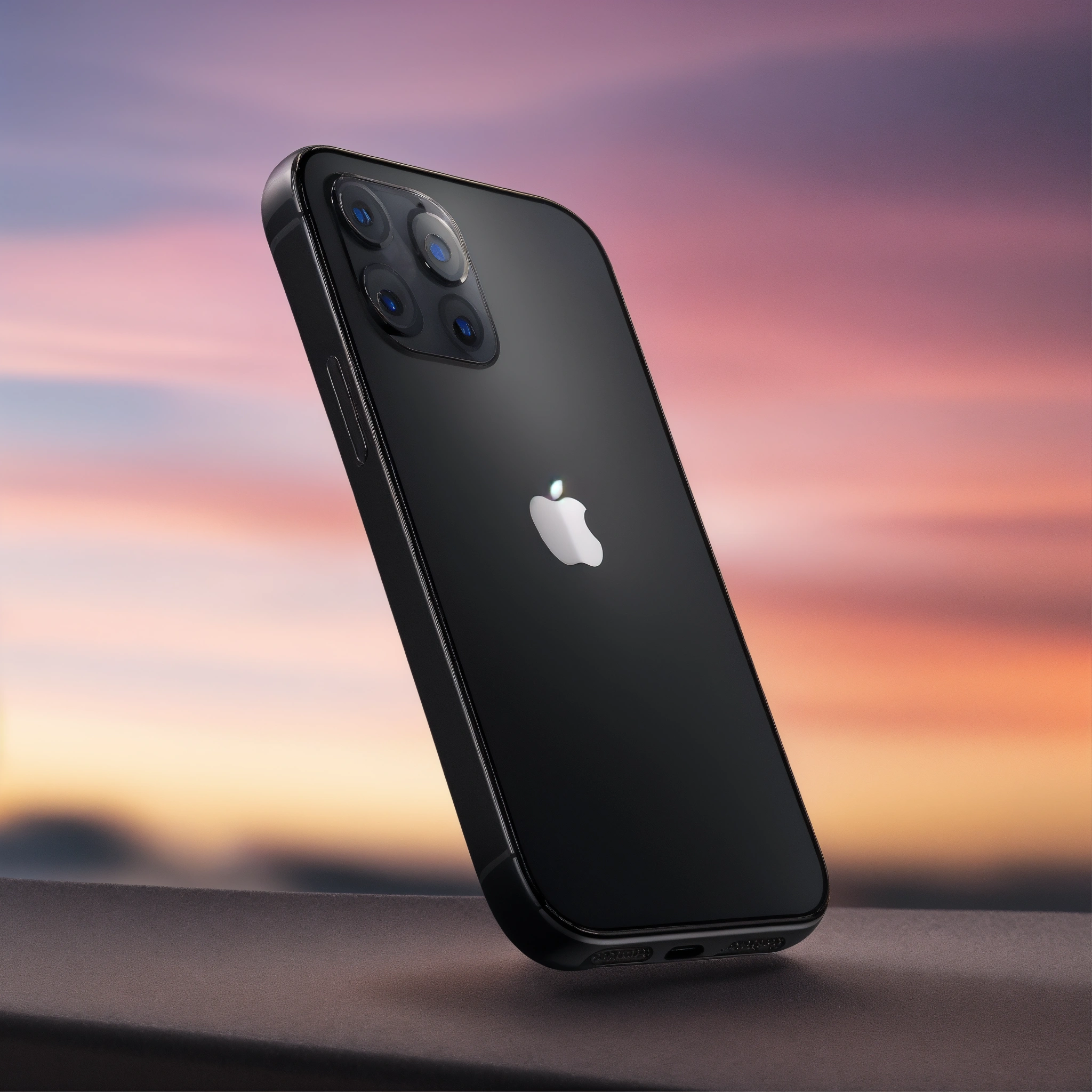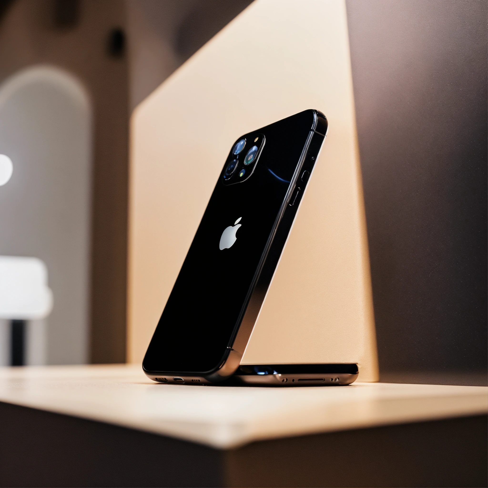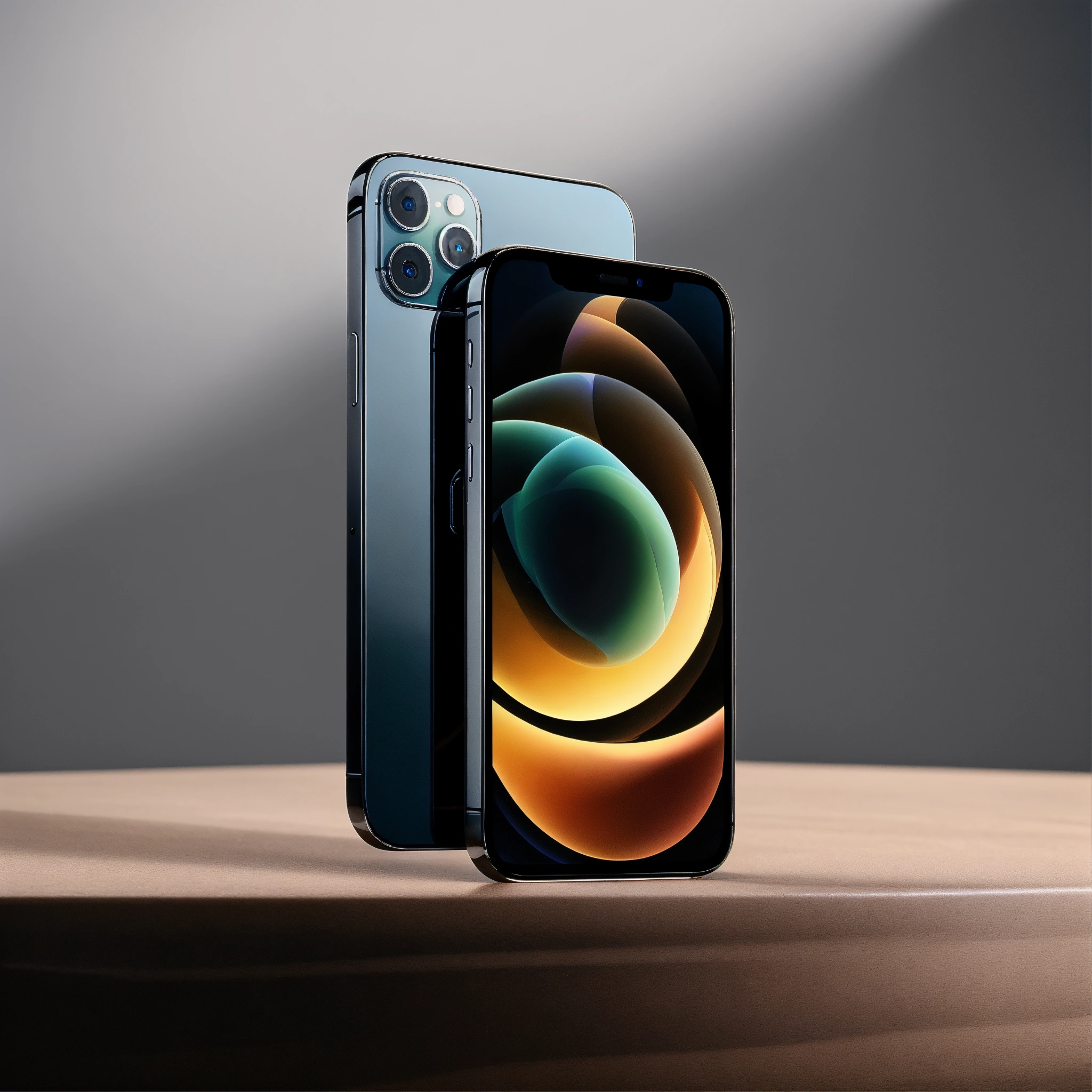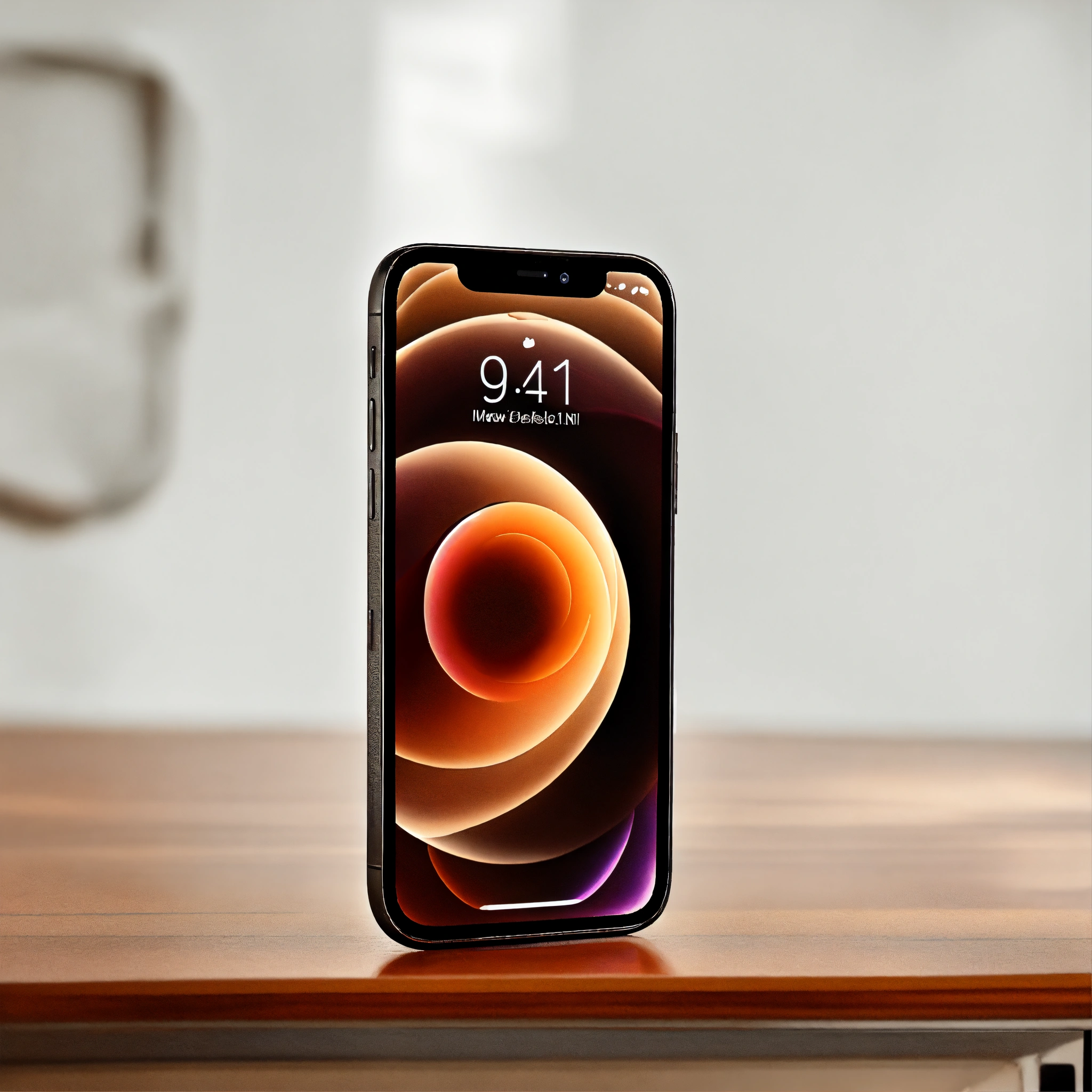 A photo of a new iphone 12, the phone is black and has a sleek design, the background is a white wall