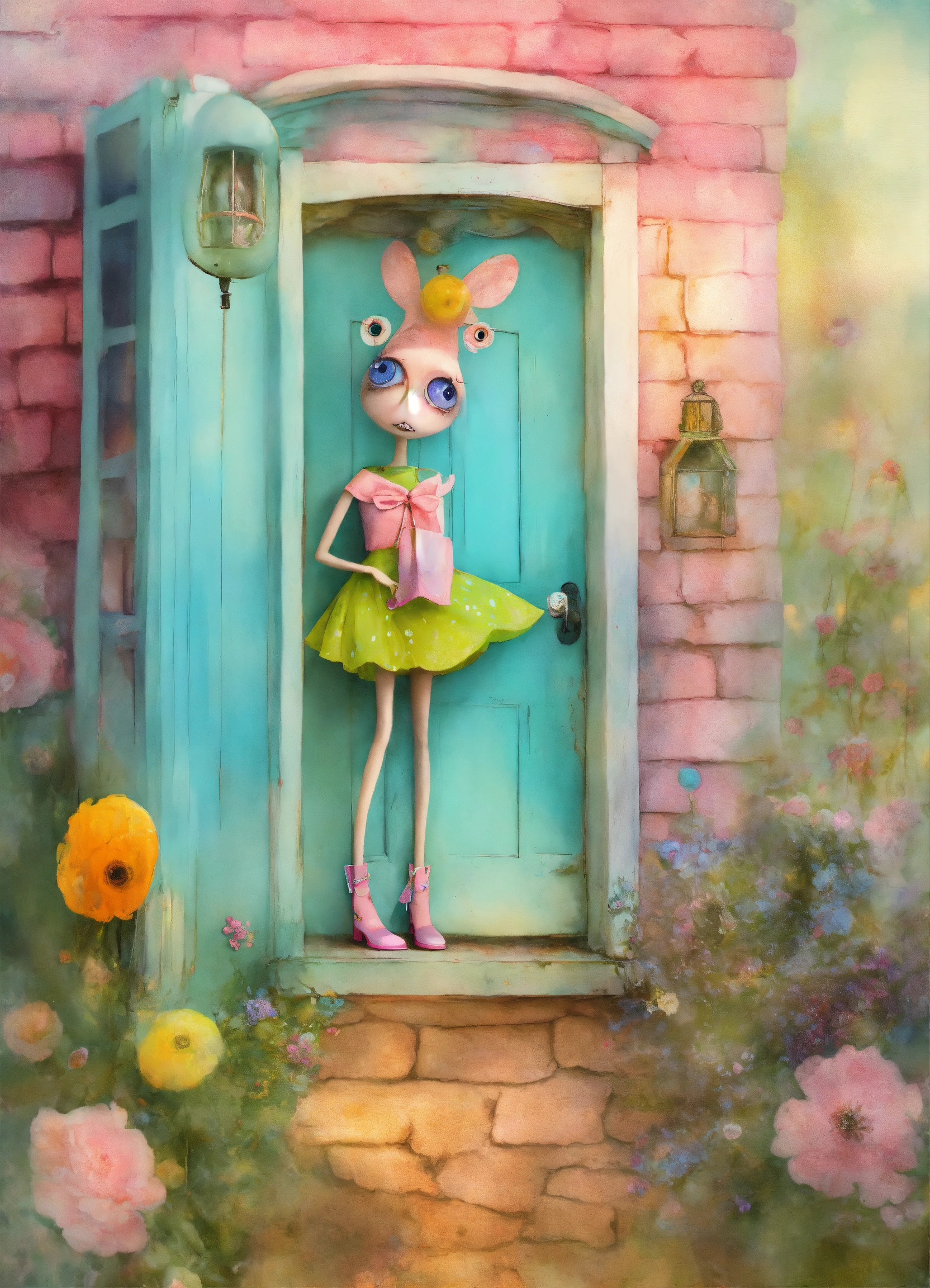 Shabby chic dreamy mist pastel junk journals whimsical cute quirky courage the cowardly dog style "fearless courage the cowardly dog" with big eyes in odd clothings, tamara laporte style, swirling magical fairytale abstract art style